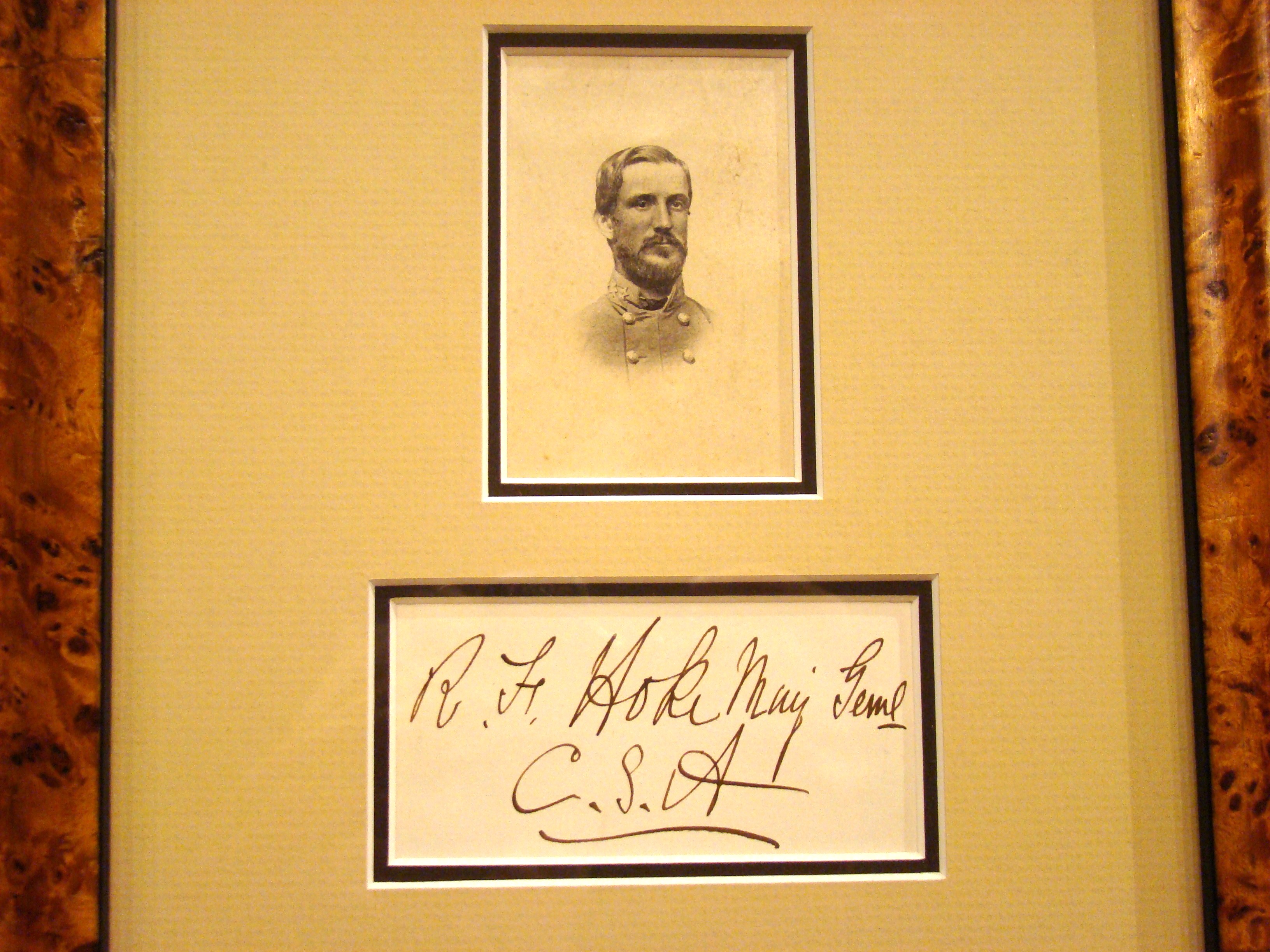 High quality display piece featuring Major Gen. Robert Frederick Hoke, commander of the famous North Carolina Brigade consisting of the 6th, 21st, and 57th NC Vol. Infantry Regts. and the 1st NC. Inf. Battalion Sharpshooters. These units saw hot action in almost all the the major battles of Gen. Robert E. Lee’s Army of Northern VA. Hoke had various other assignments and served with distinction throughout the war. Hoke was also successful after the Civil War. The condition of his brown ink signature and CDV are excellent. Both are archivally framed and matted with UV protective glass. This piece would display perfectly with the 6th NC belt buckle listed above. See this Wikipedia article for detailed information on Hoke’s Confederate service and life: https://en.wikipedia.org/wiki/Robert_Hoke