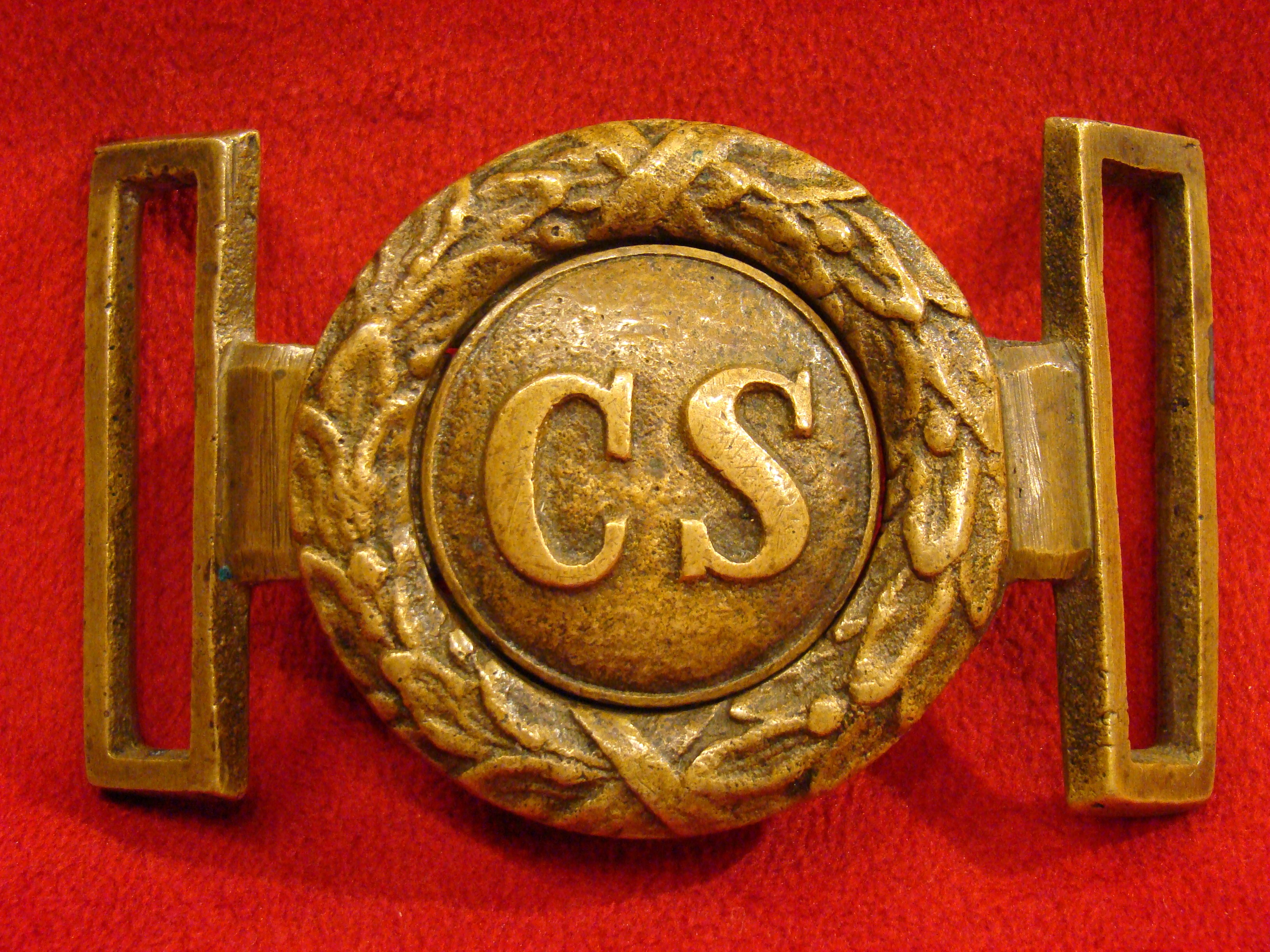 Rare Confederate General Service CS Tongue and Wreath Accoutrement Belt Buckle with rounded belt loops and concentric ringed wreath. The CS marked tongue is soldered on to the belt bar. These rounded loop belt rigs were almost certainly produced in New Orleans. Some variants feature a star in the center and may have been sold to Mississippi and Texas officers. The other well known type features the Great Seal of the State of Louisiana. Condition of the belt is excellent. No missing leather but does show minor cracks and wear. This type may have a cotton web core. The stitching on the wreath loop appears to have been re-done at some point in time. Original brass belt adjuster present. This is a top-of-the line Confederate Officer’s Belt.