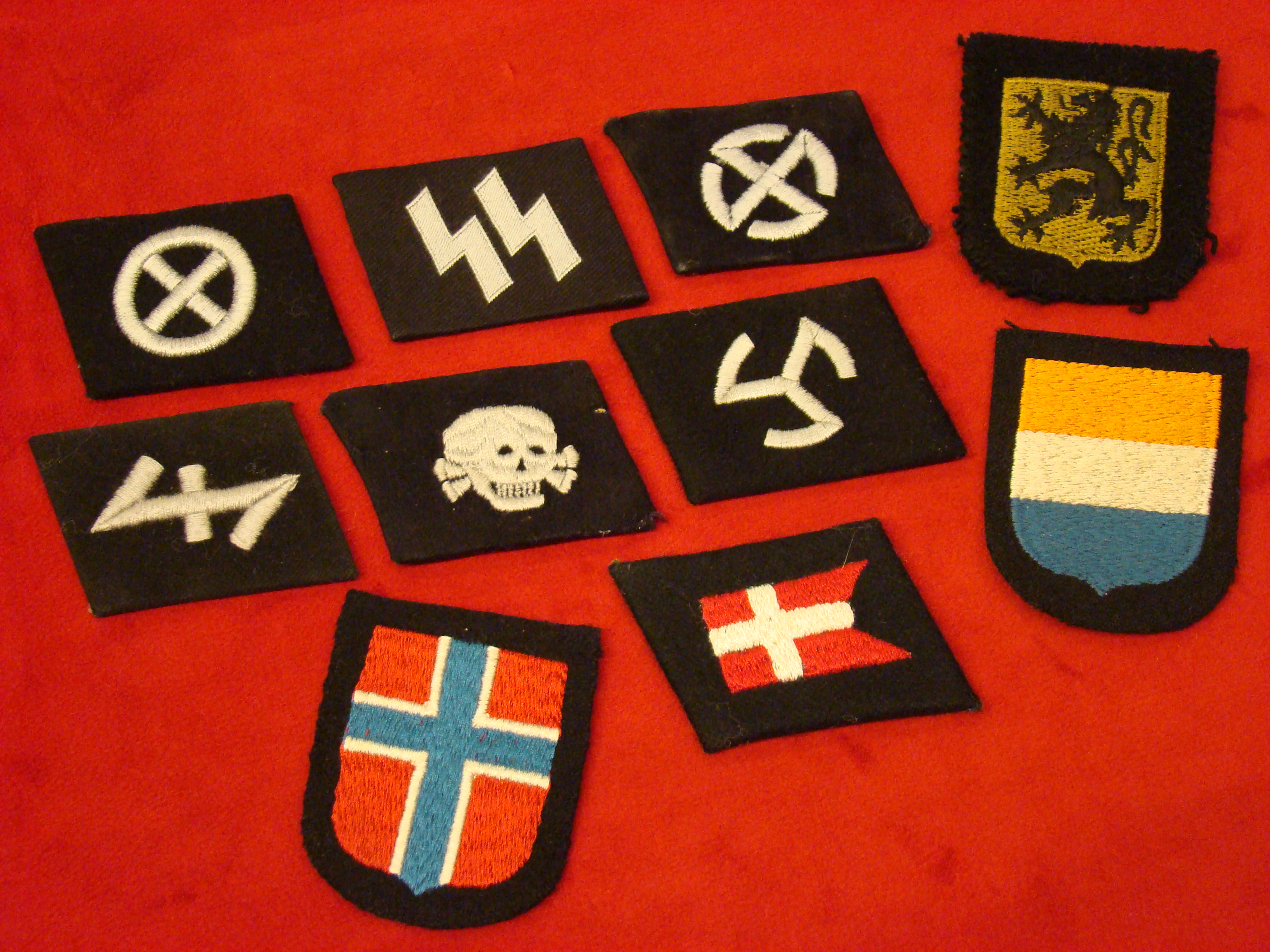 High quality, and authentic patches including SS, Flemish Rampant Lion, Danish, Totenkopf, Nederland Wolf Angle, Nordland Sun Wheel, Norwegian, Langemark, French and Dutch. Consignor refuses to sell separately.