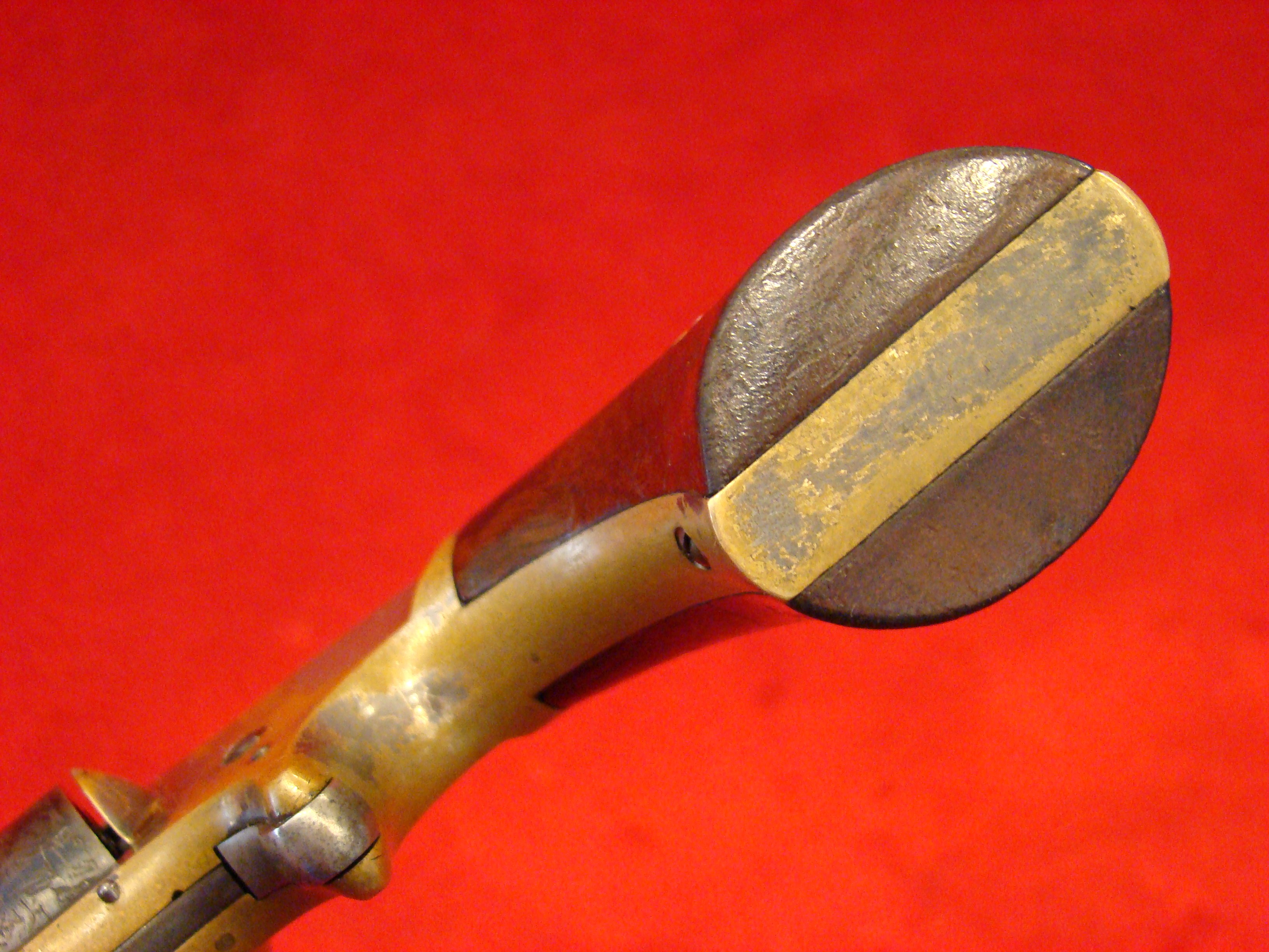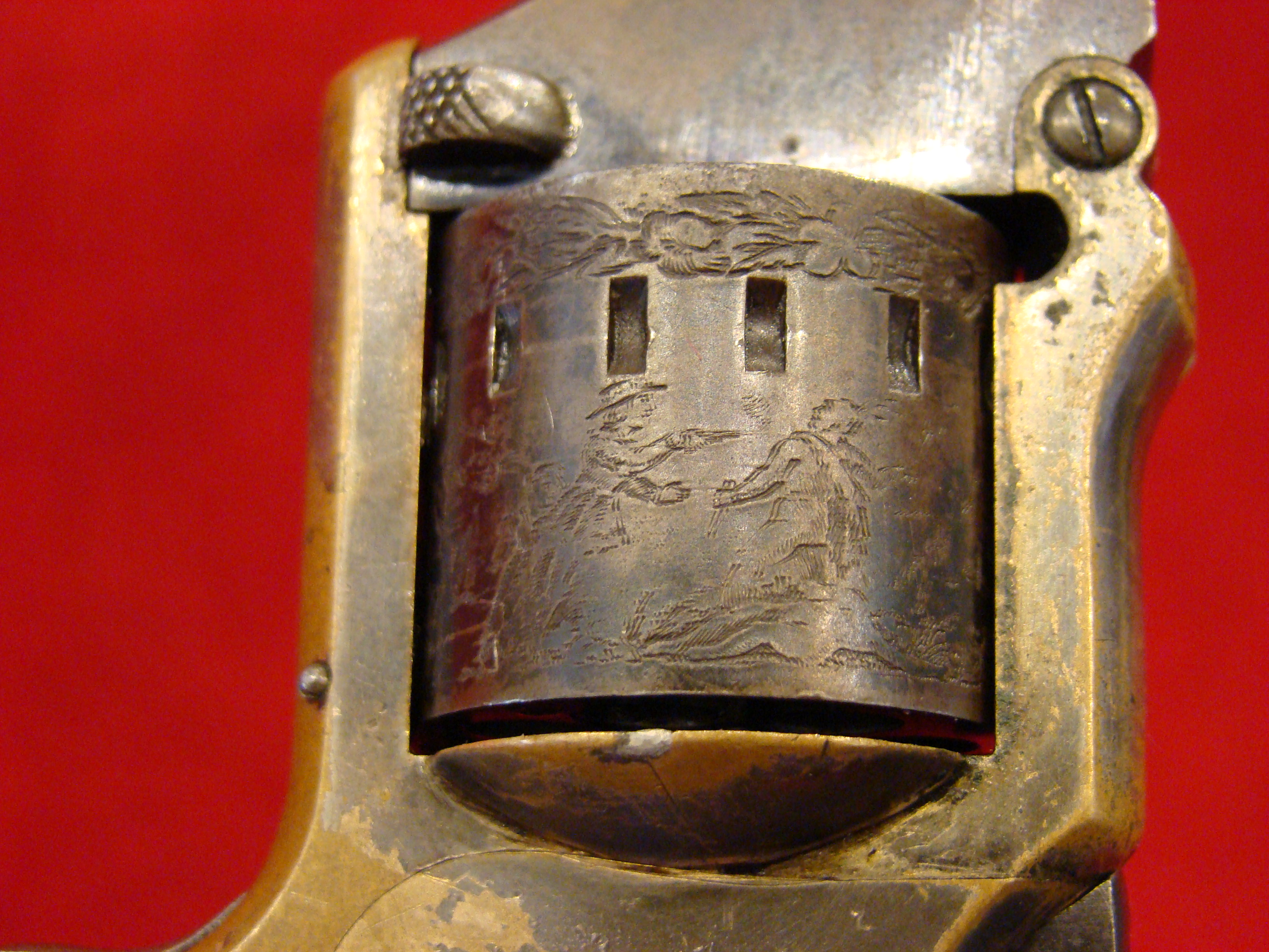 High quality revolver with remnants of silver plating on the brass frame and factory blue finish on barrel and cylinder. A close copy of the Smith and Wesson Type I. Note all matching serial # 2234 which tells us that it was made in 1860 (First year of production). Very crisp cylinder scene of pioneers fighting indians. Barrel is clearly marked “