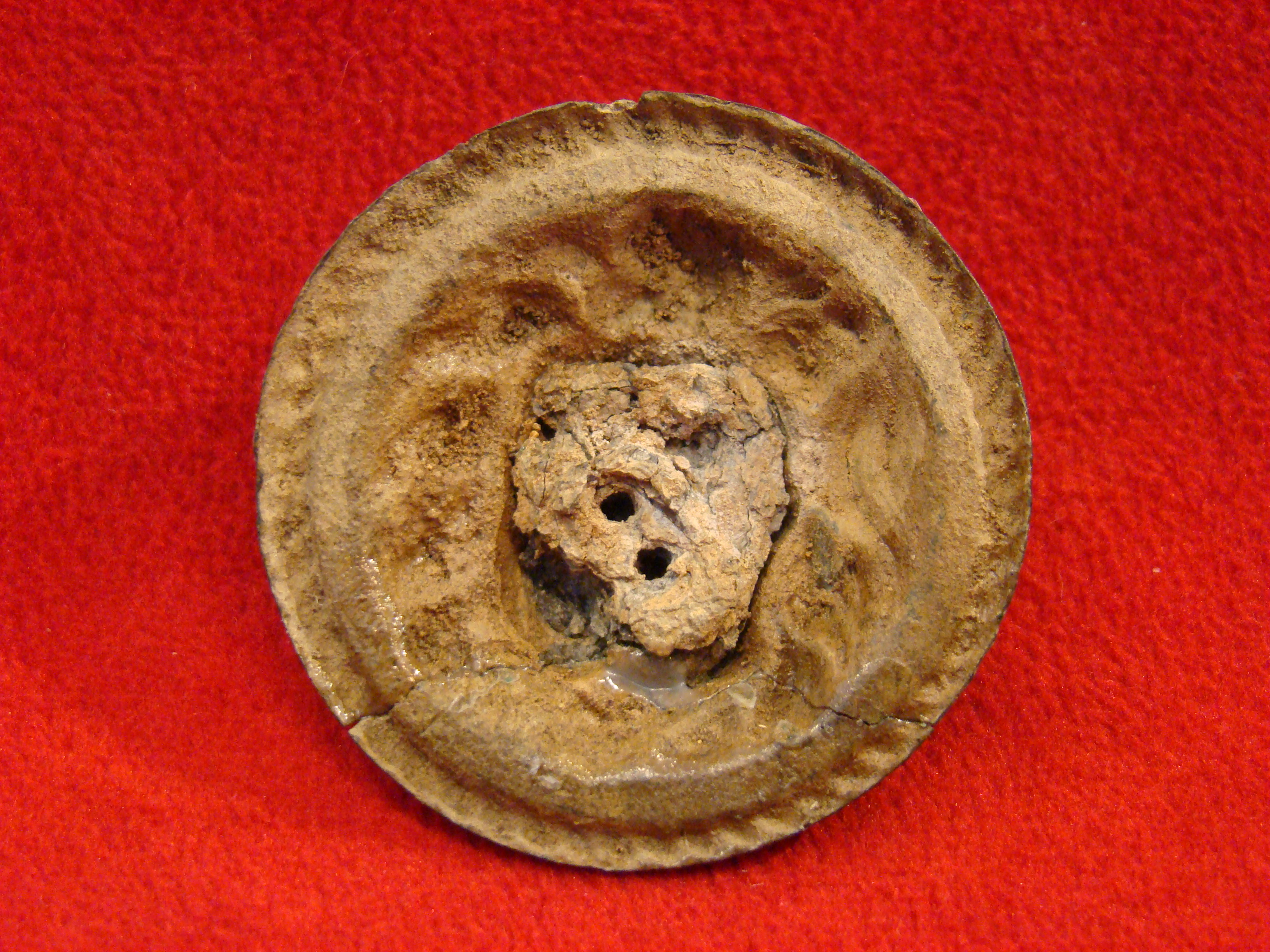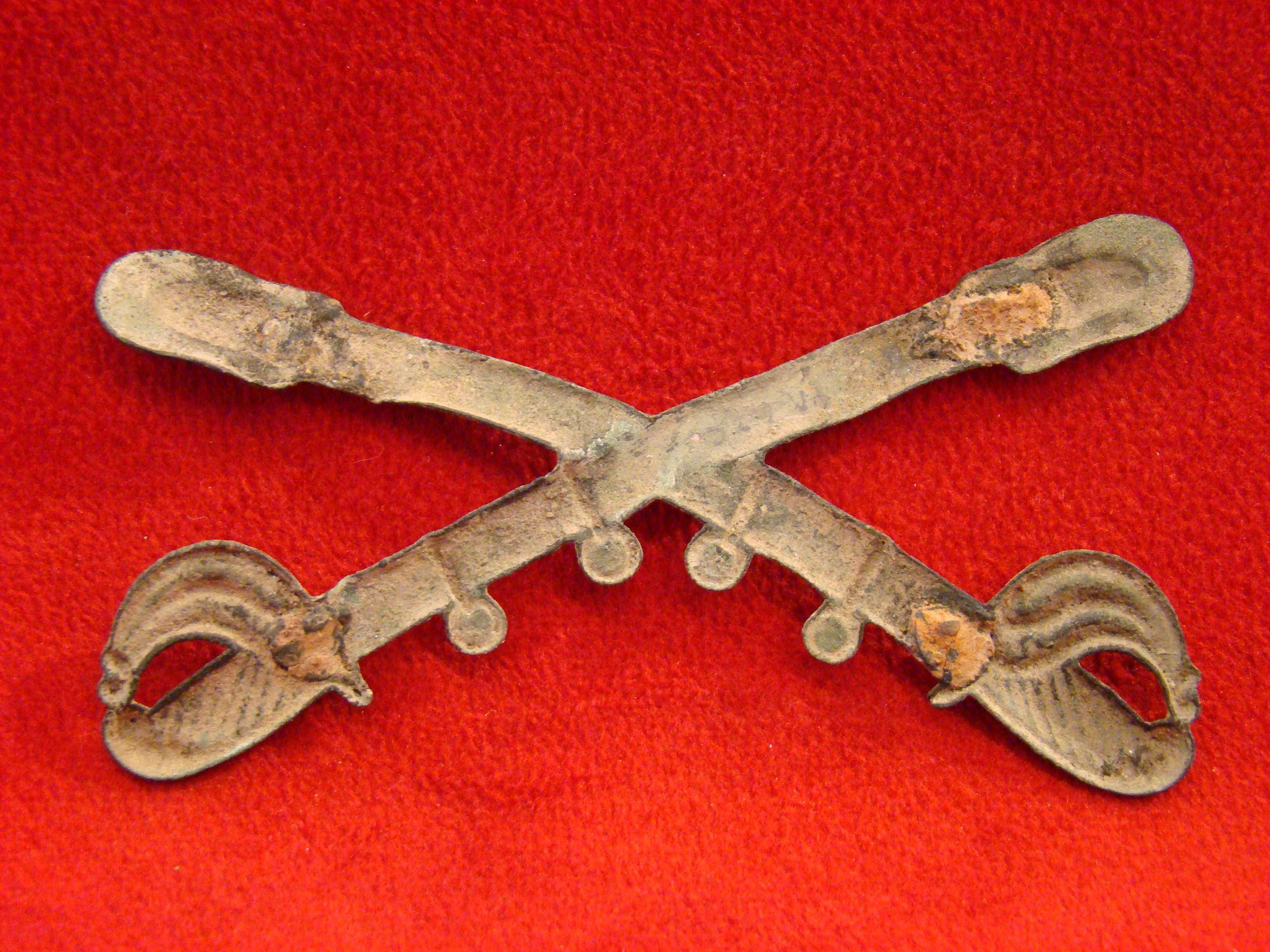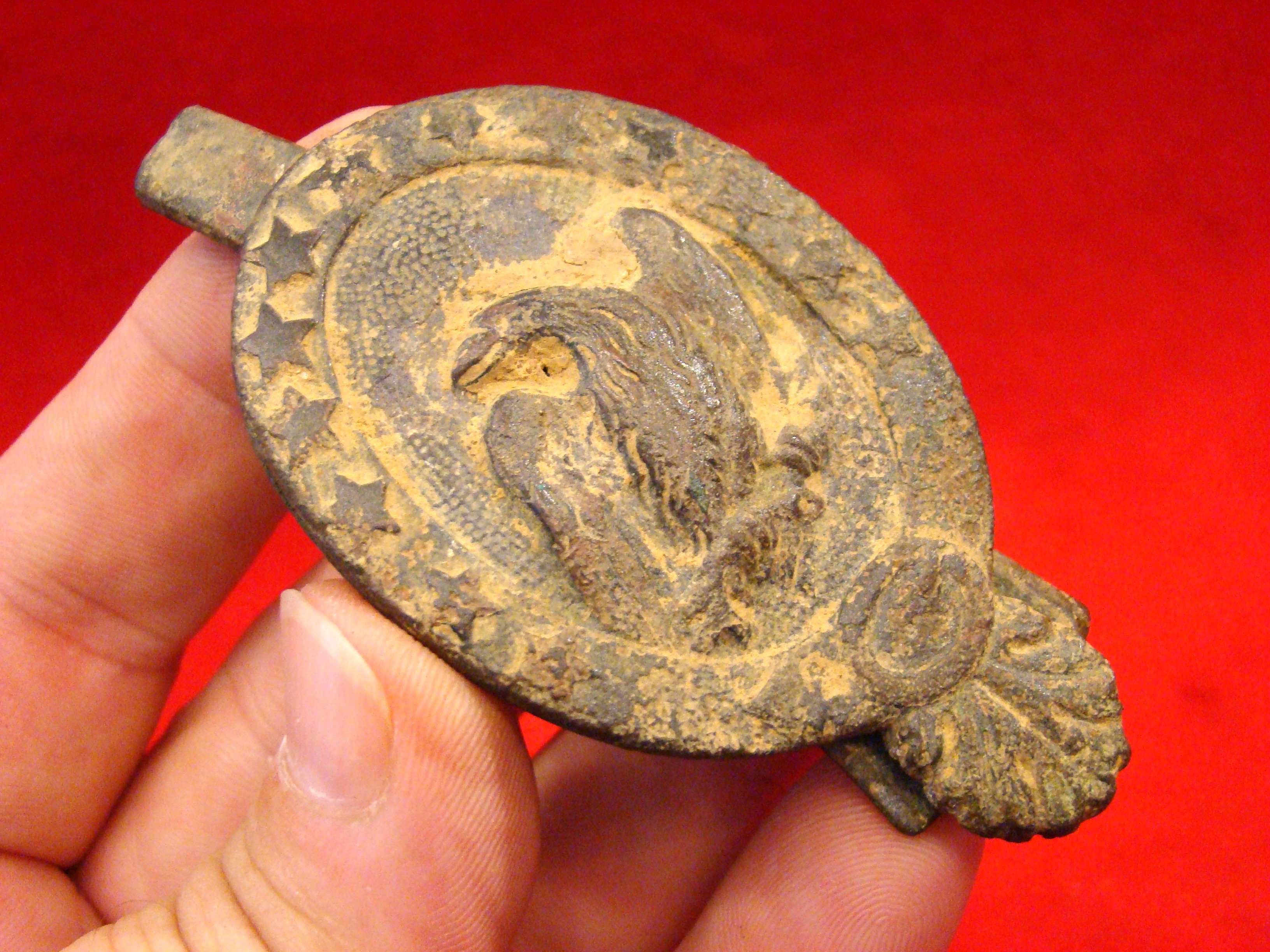 Very scarce insignia that adorned the chest strap of an officer’s horse harness. This one has a pronounced outward curvature. Full lead. Minor chatter along the rim but no repairs. Hooks rusted away. Found near Ringgold GA. by Charlie Poteet. SOLD
