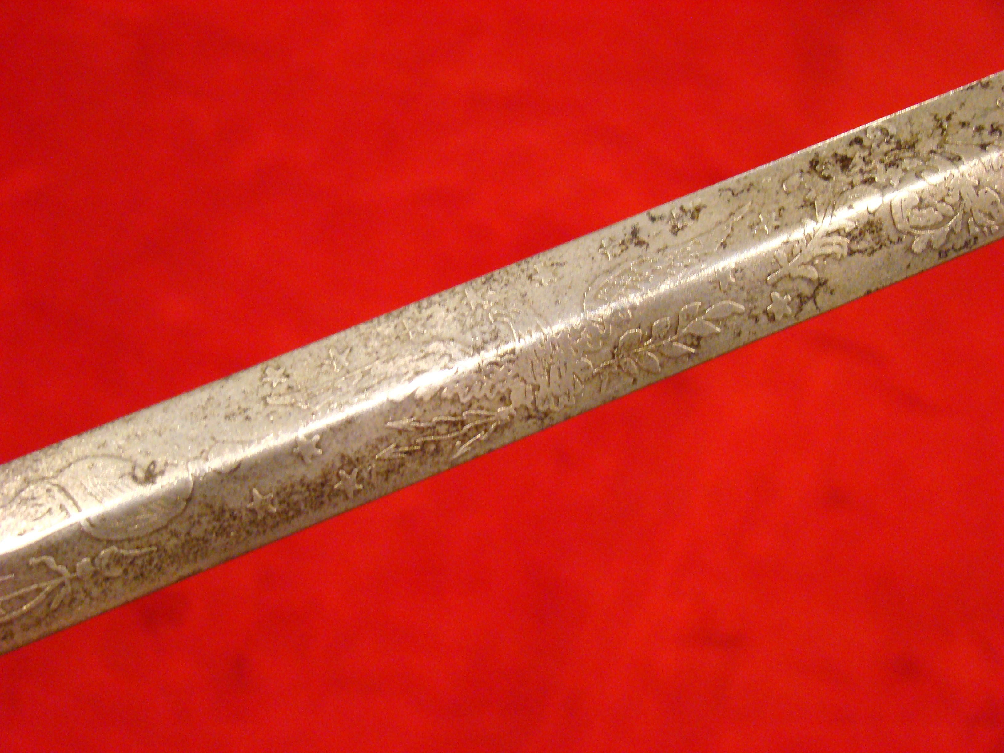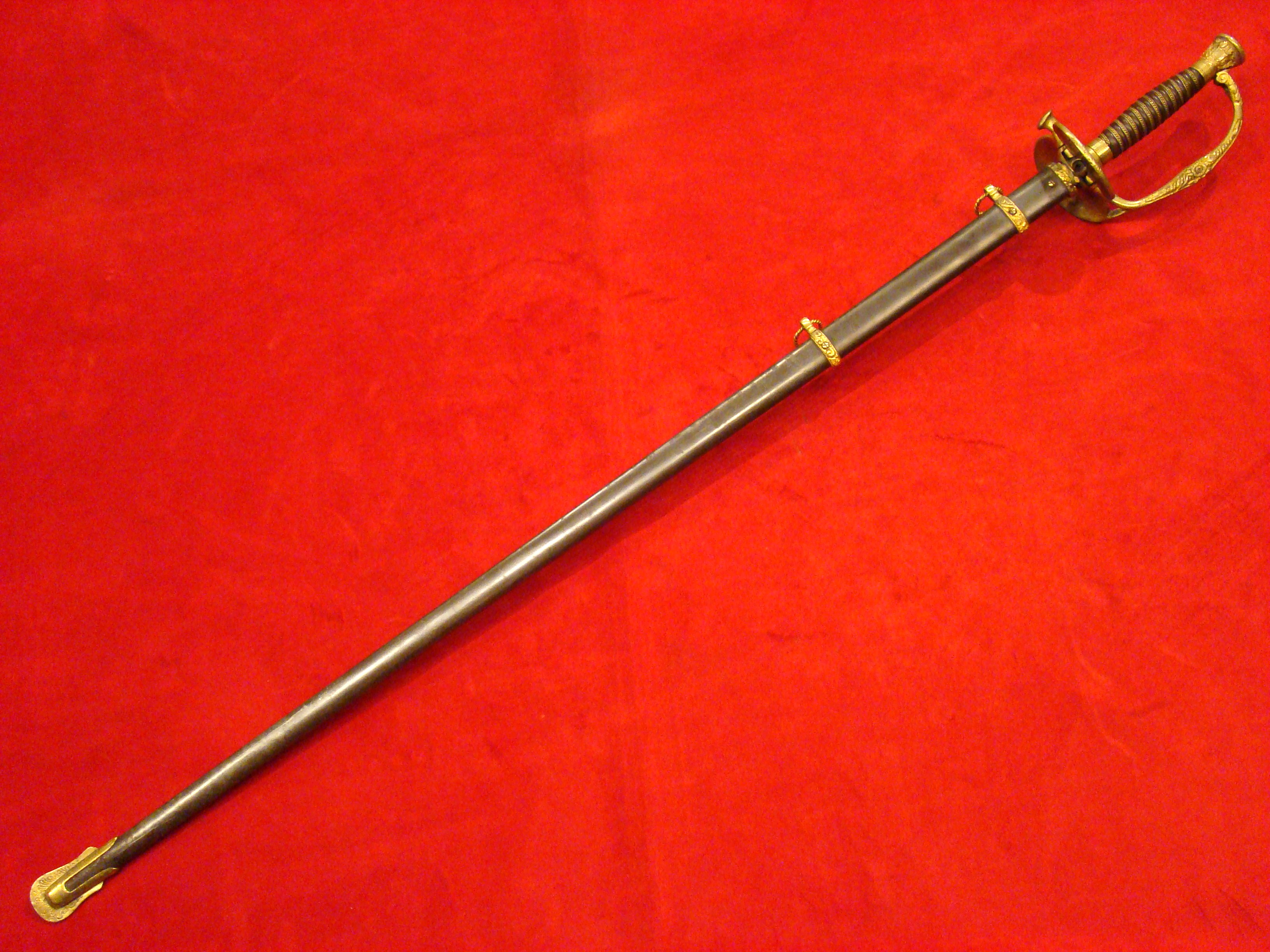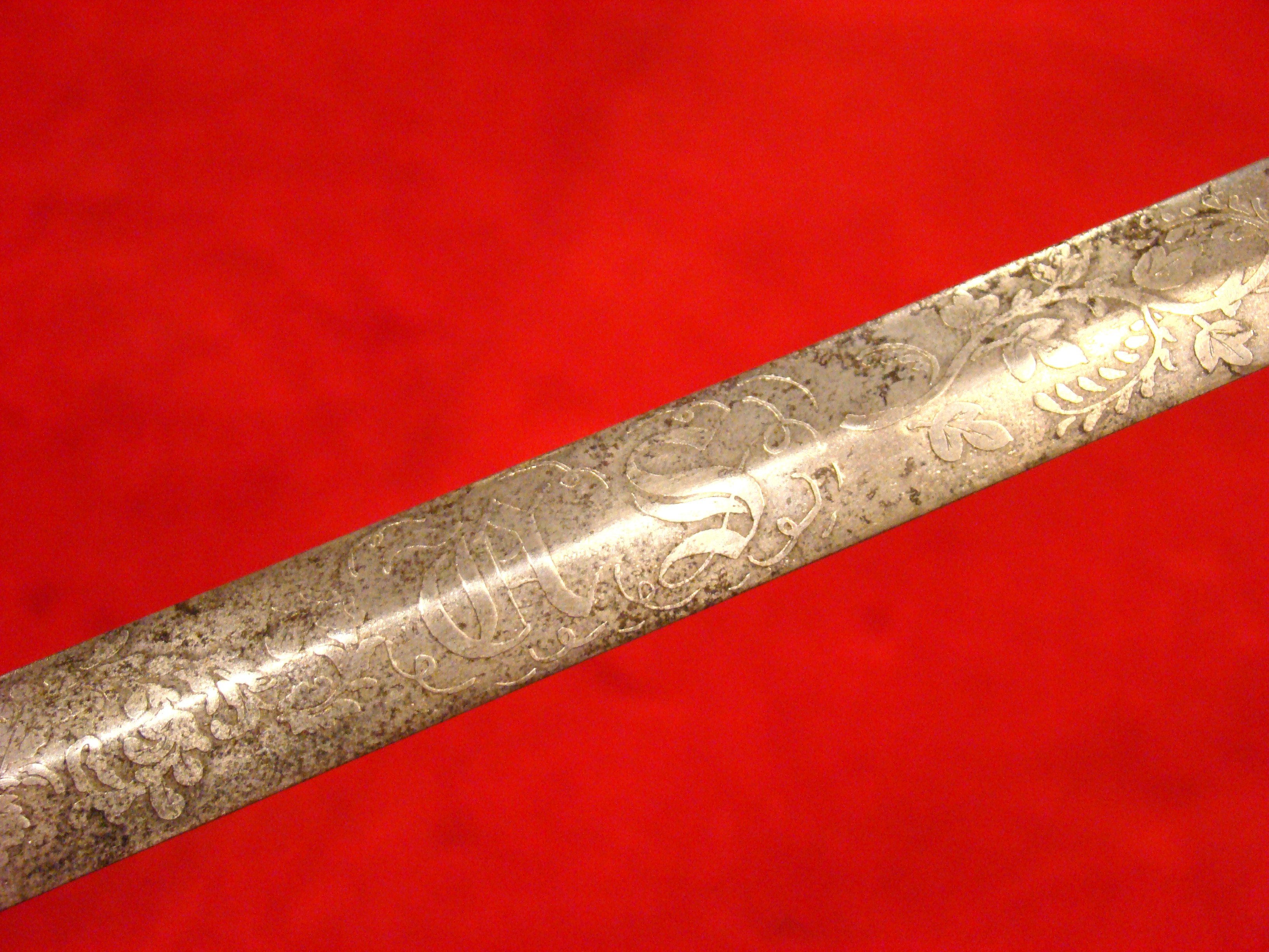 Totally untouched. Unusual design with small “US” letters in the highly decorated brass guard. Original patent leather grip and braided wire wrap is in excellent condition. Leather throat washer intact. German imported blade is lavishly etched with floral designs, “E PLURIBIUS UNUM” motto, and “US”. Semi-bright with areas of mild oxidation, particularly towards the tip. Fortunately, it has been left uncleaned. No nicks or sharpening. Leather scabbard is in very good condition. Brass mounts and drag have a deep mustard colored patina that matches the guard. Leather is smooth and supple.  $995.00