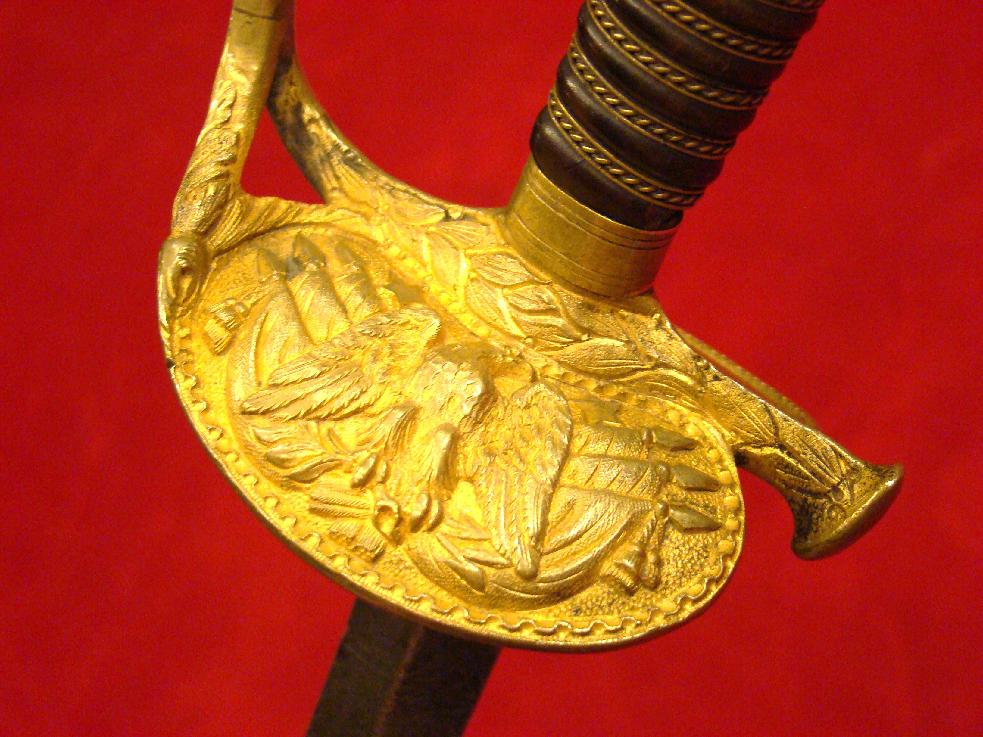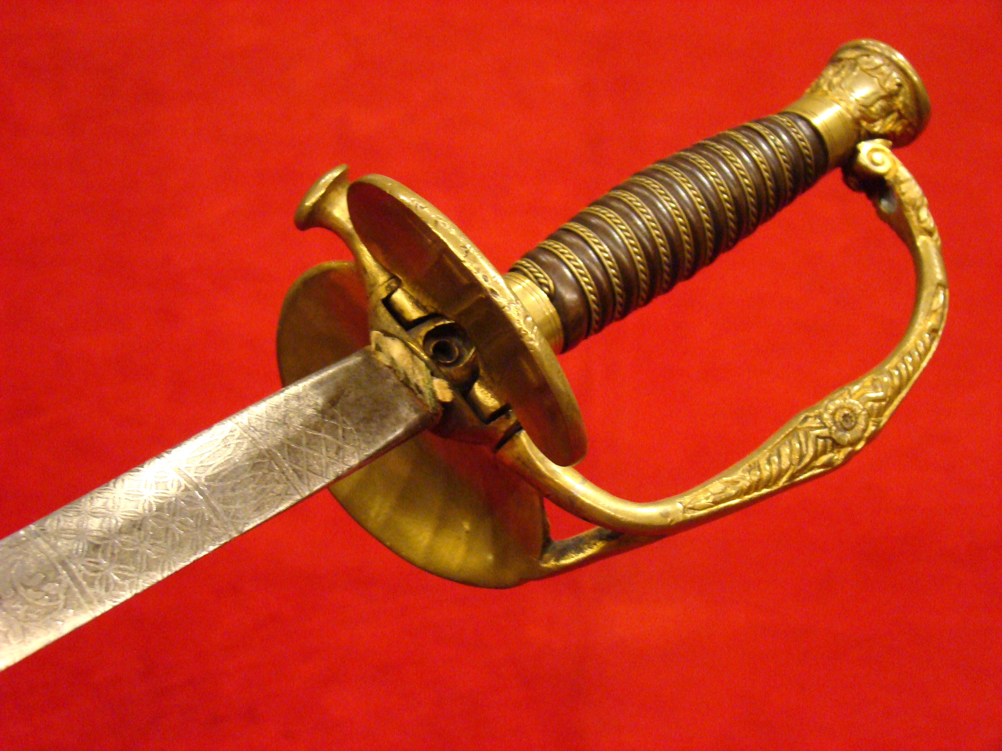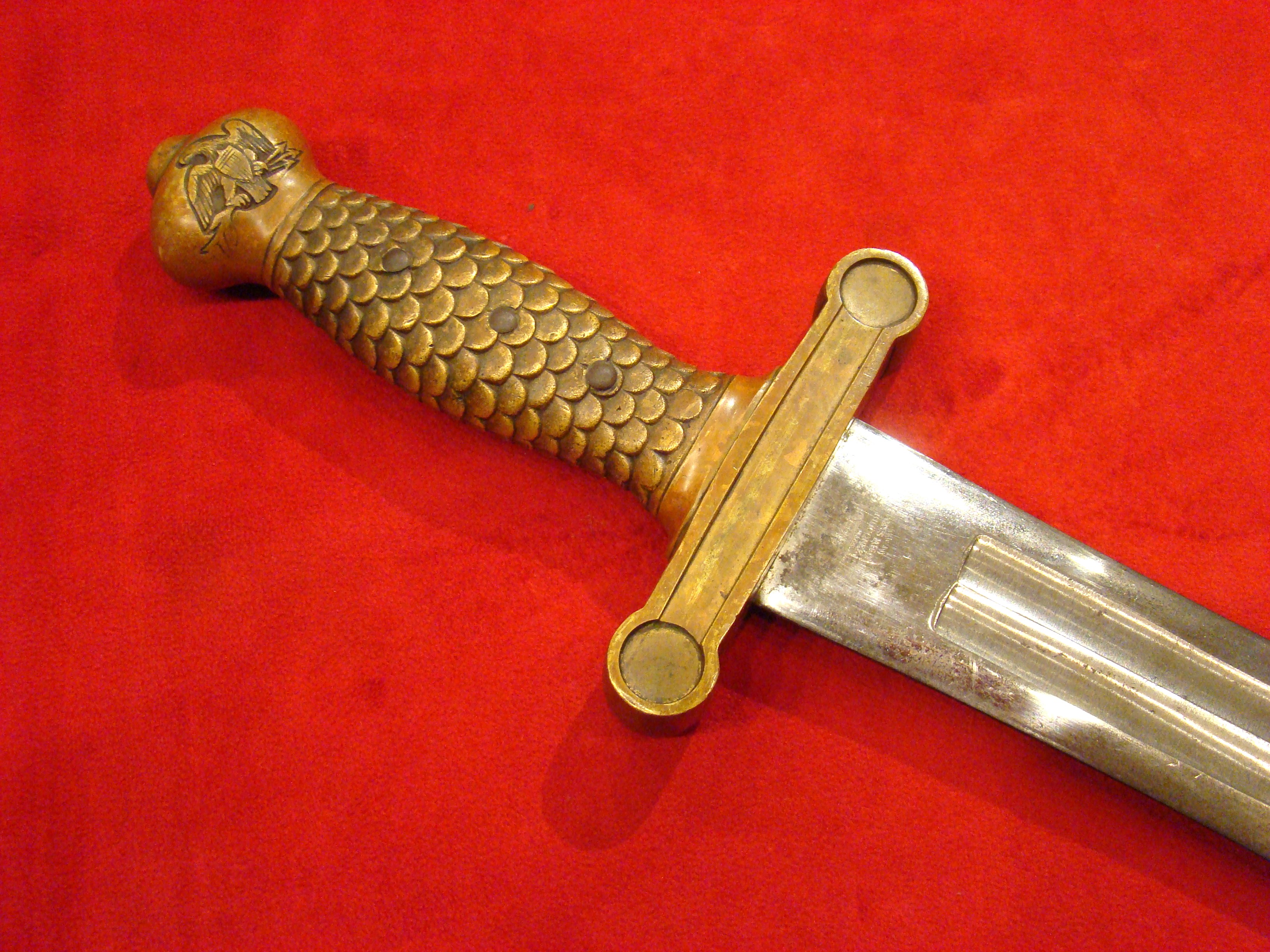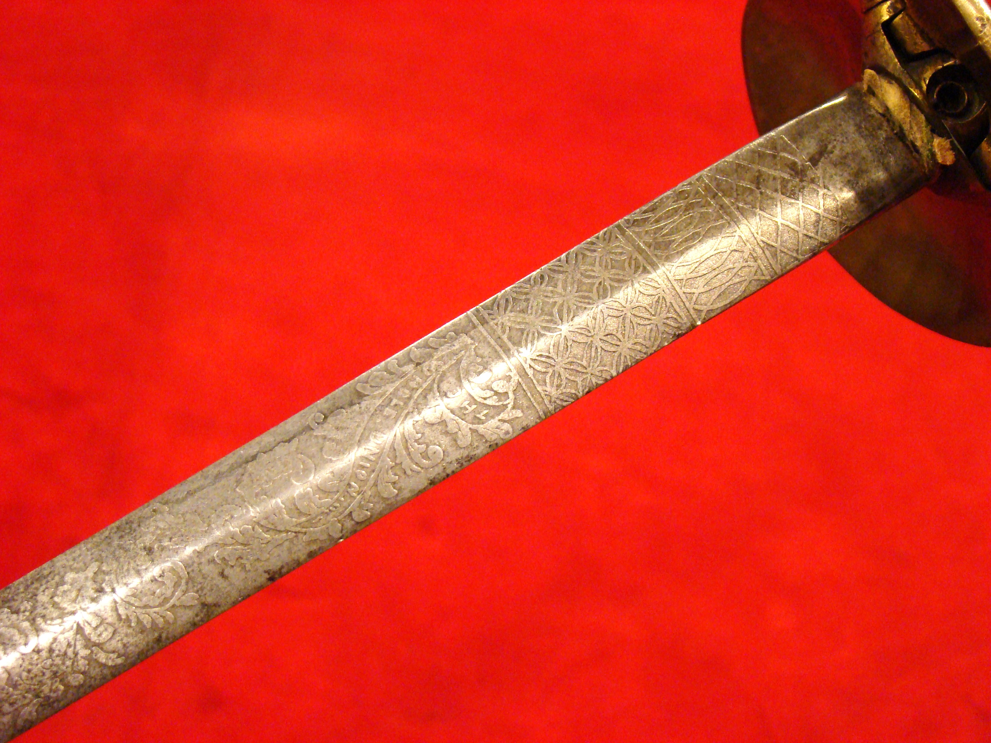 Totally untouched. Unusual design with small “US” letters in the highly decorated brass guard. Original patent leather grip and braided wire wrap is in excellent condition. Leather throat washer intact. German imported blade is lavishly etched with floral designs, “E PLURIBIUS UNUM” motto, and “US”. Semi-bright with areas of mild oxidation, particularly towards the tip. Fortunately, it has been left uncleaned. No nicks or sharpening. Leather scabbard is in very good condition. Brass mounts and drag have a deep mustard colored patina that matches the guard. Leather is smooth and supple.  $995.00