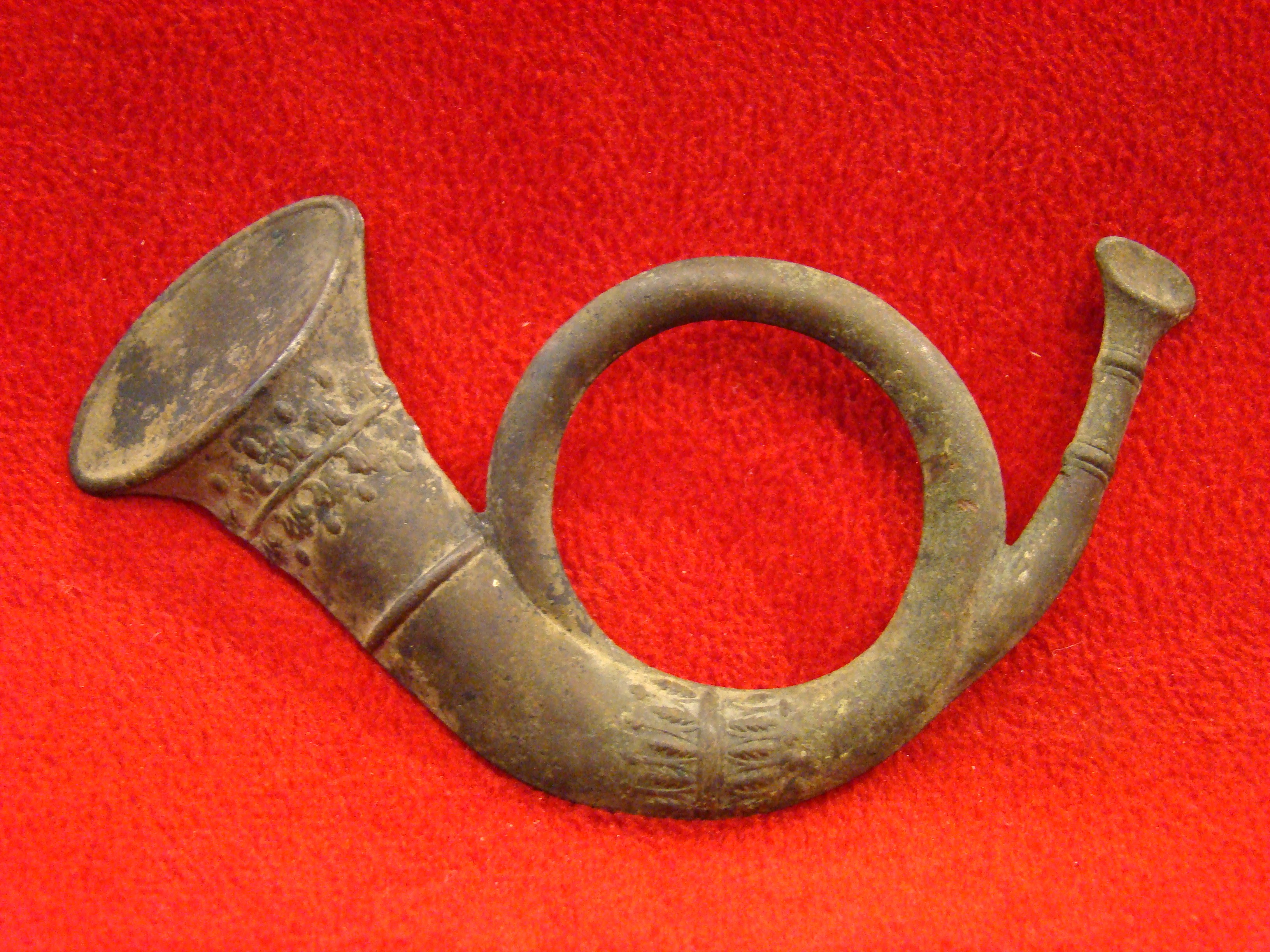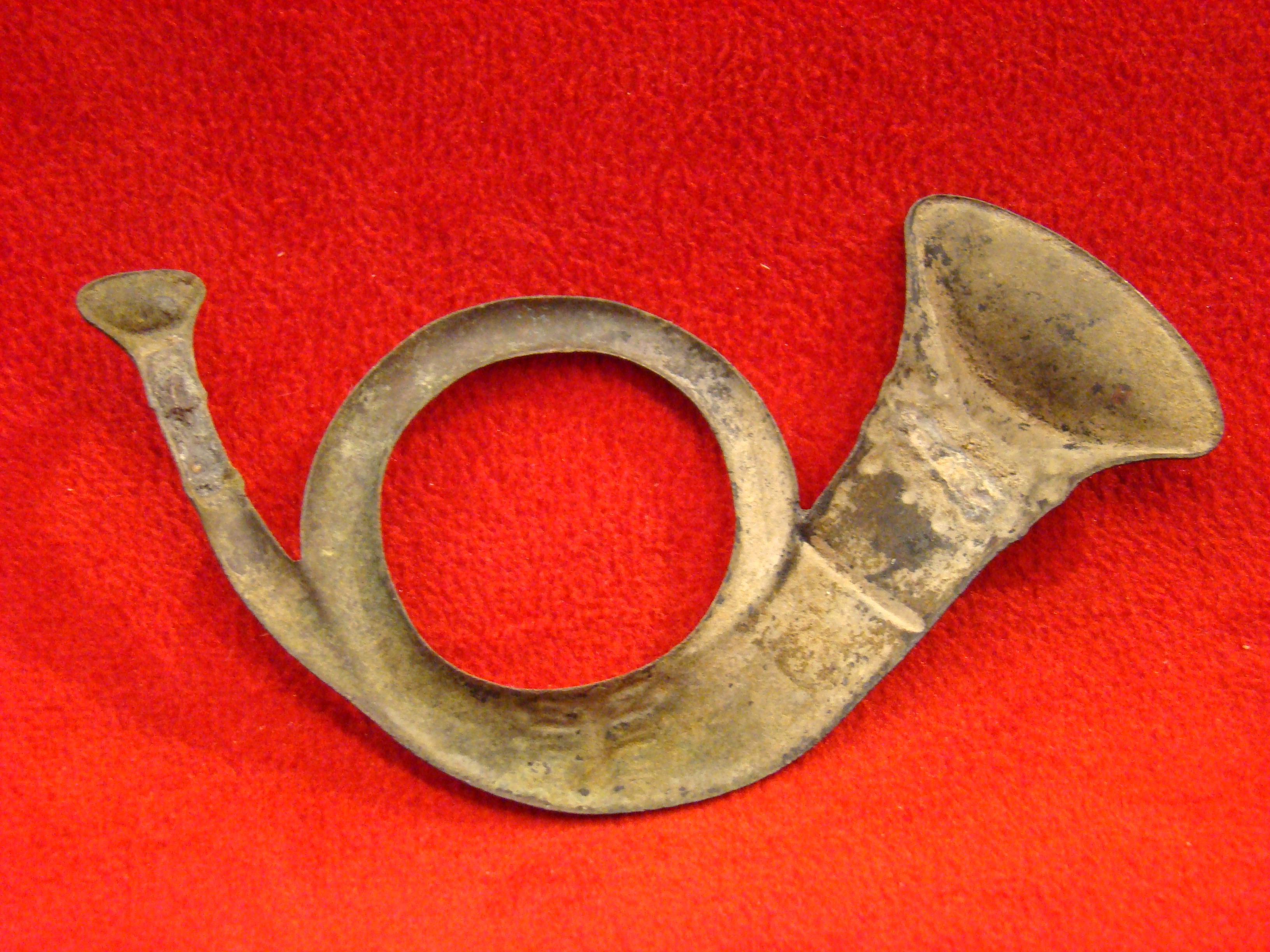 Flawless stamped brass Infantry Horn with no repairs or bends. Attachment loops are missing. These delicate insignia are difficult to find in this condition.  $225.00