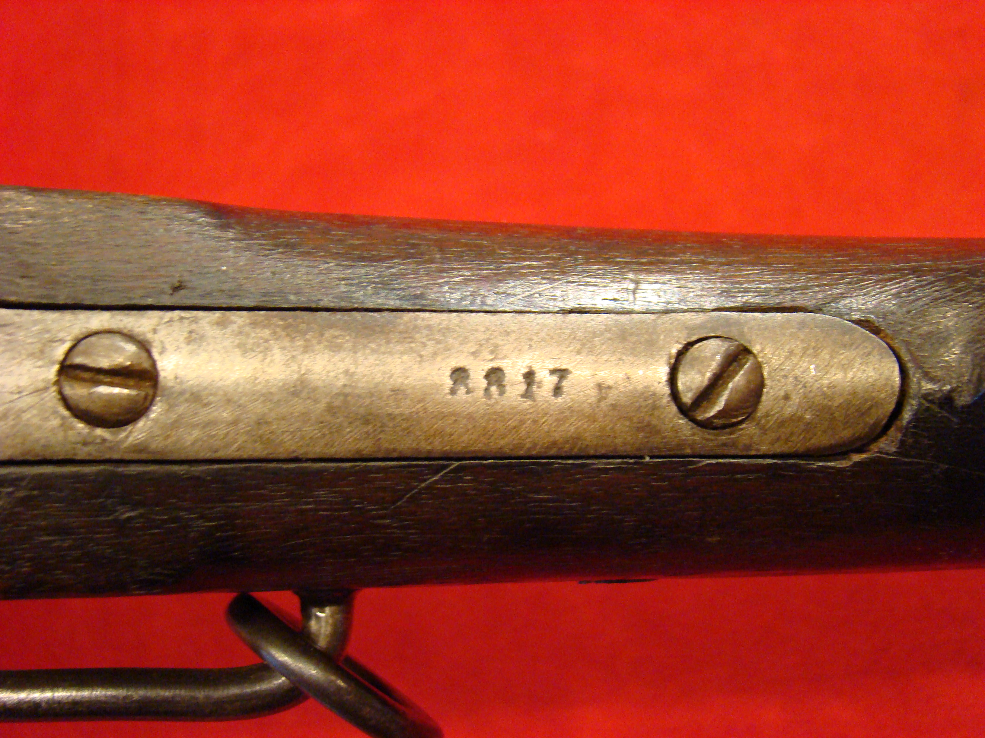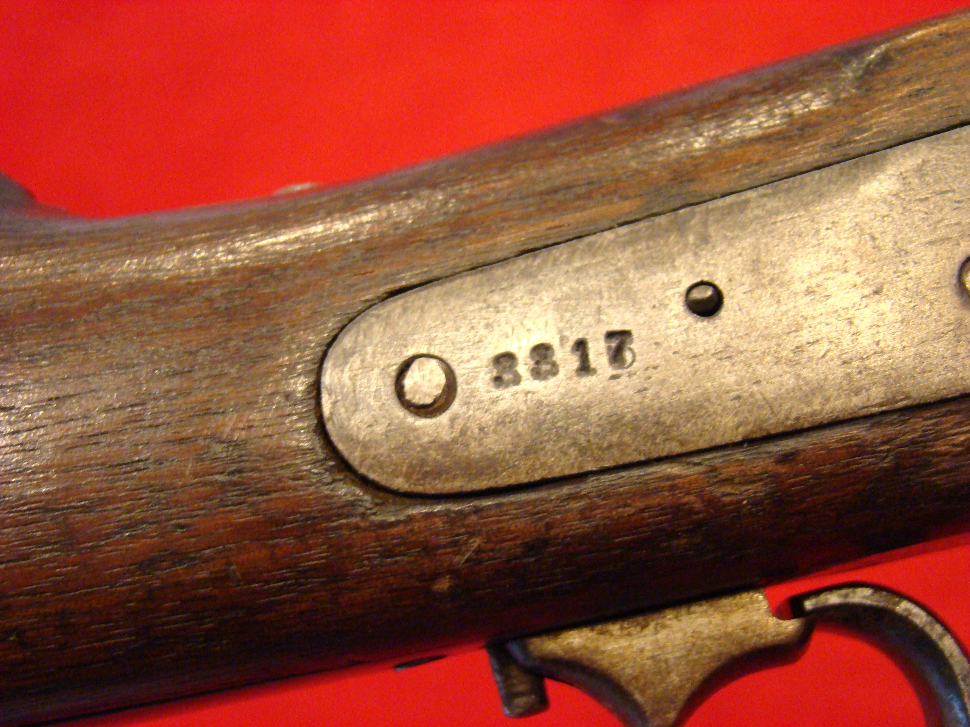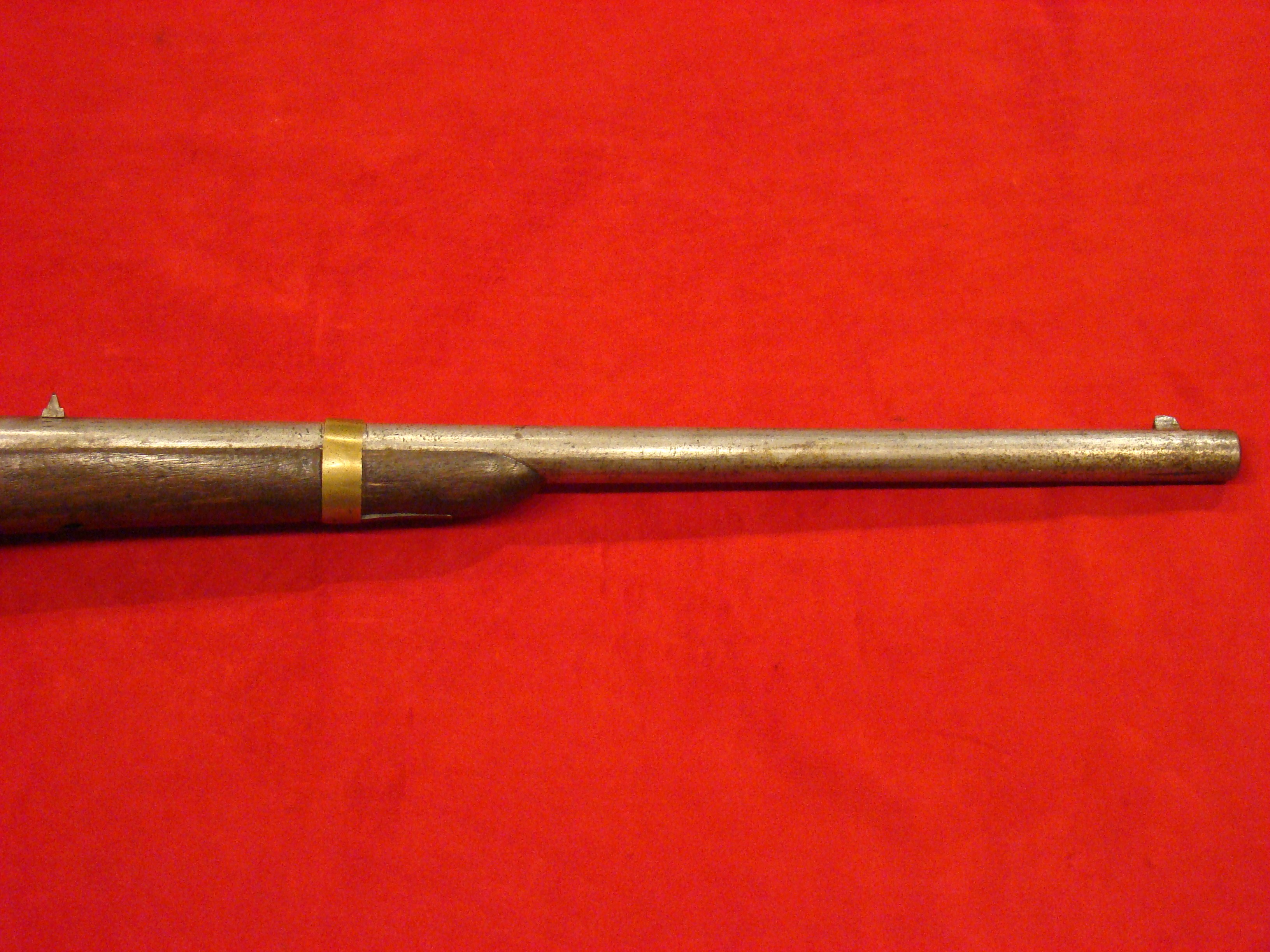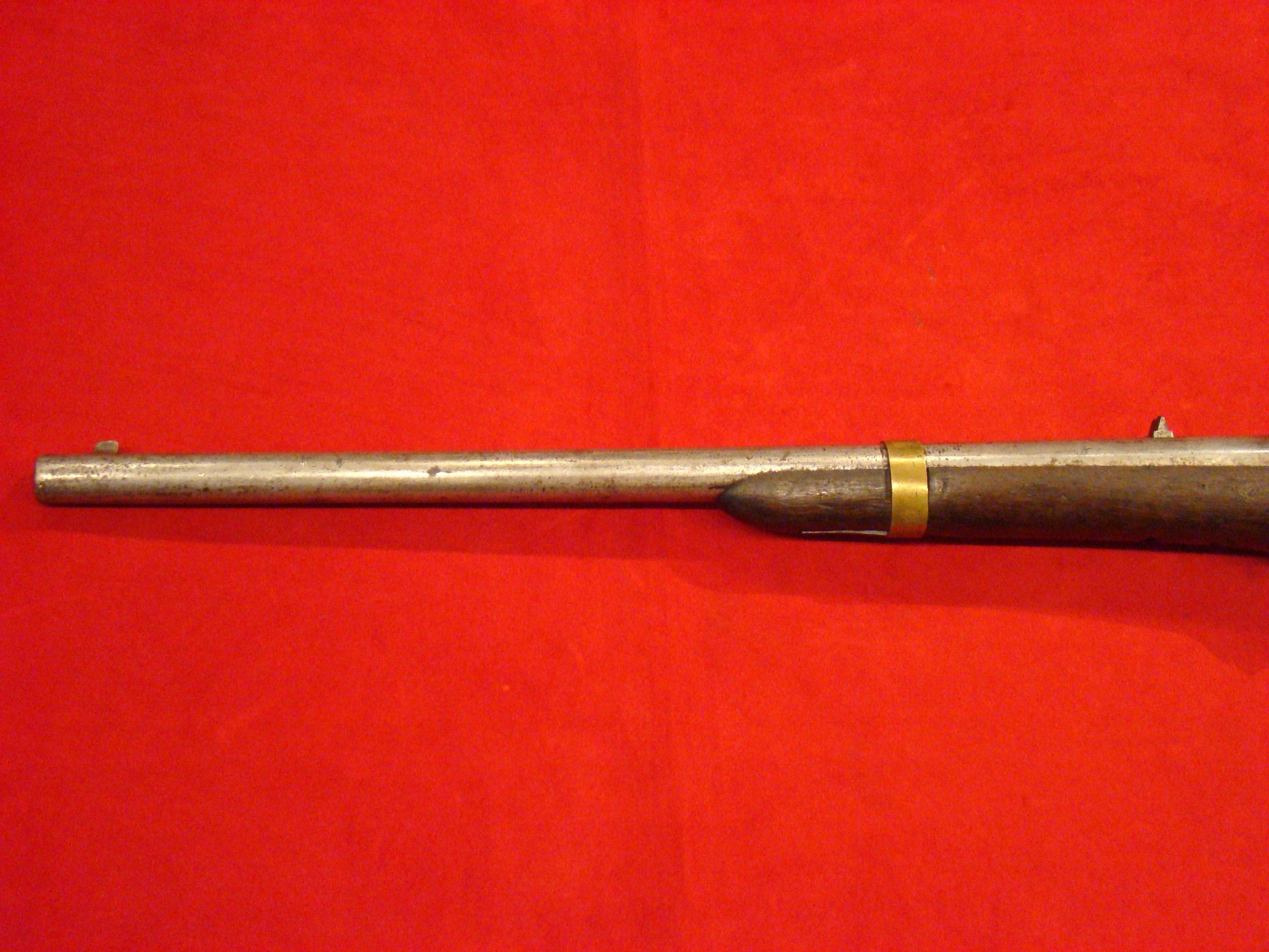 Scarce Confederate Carbine with all matching serial # 3317 on lock plate, breech tang, underside of the barrel. The first contract for copies of the M-1859 Sharps Carbine were produced by and marked “S.C. Robinson” of Richmond. This carbine is the second incarnation produced by the Confederate Government in Richmond. Both are quite rare. Condition: Gun metal surfaces are generally smooth with a graying patina and some scattered areas of light oxidation. Lock and trigger mechanism is tight and works properly. Breech block and lever action is a little loose from hard campaigning. You can see where the block has frozen during combat, and the trooper has banged on it. Standard block sight present on barrel. The lever pin may possibly be a replacement. Note small hole in the loading channel, definitely a manufacturing flaw. Brass butt plate and barrel band original and correct. Adjacent to this is a visible but weak “RICHMOND VA” barrel address. Bore is very strong but shows some combat wear. Stock is good overall with some minor issues. All concerning the forestock, mainly the sliver of wood missing at the junction of the barrel to the breech on one side. Underneath the forestock there is a screw missing. There is also a small crack emanating from where the forestock meets the breech. Overall, a good example at a good price. $9500.00