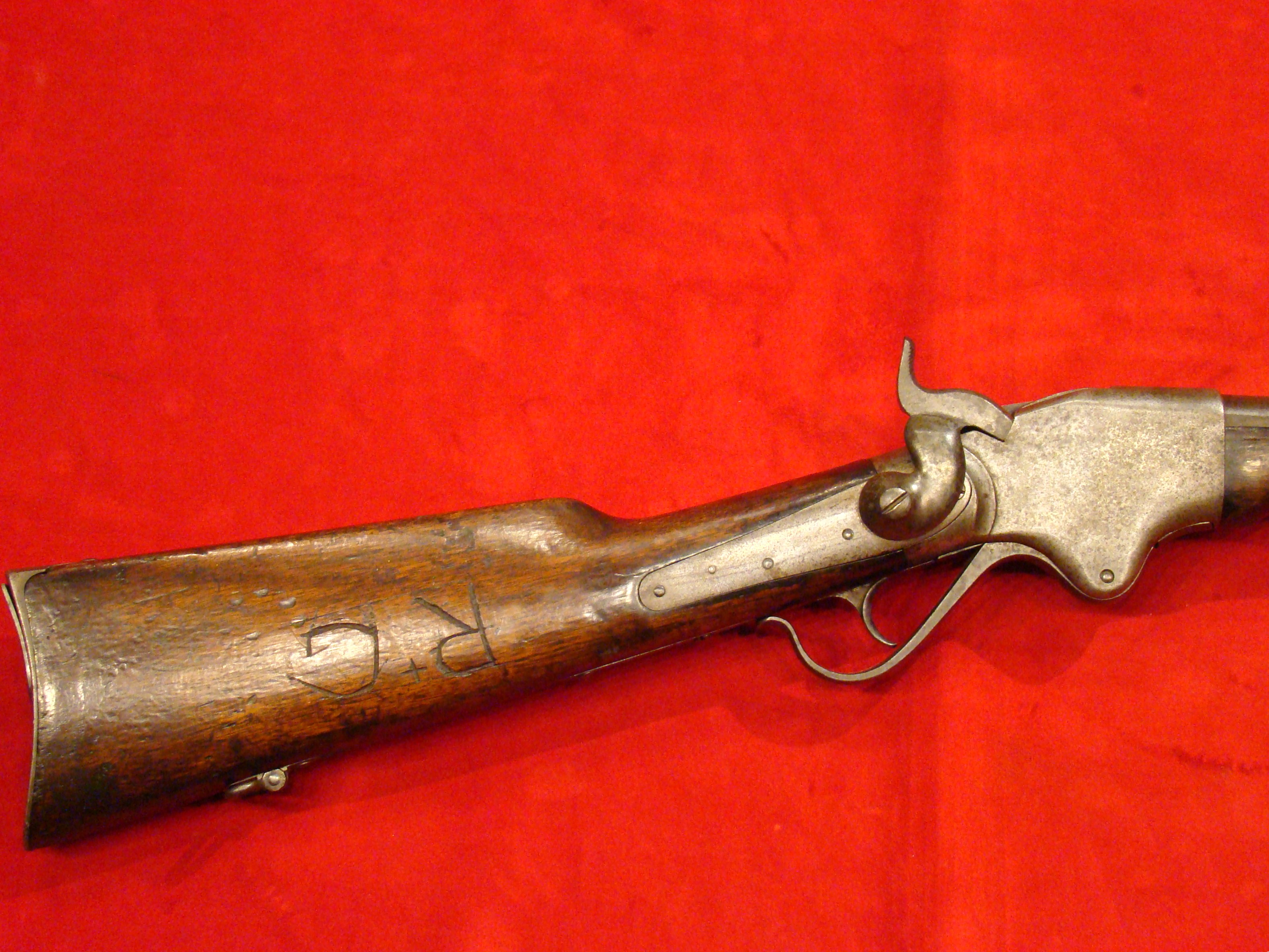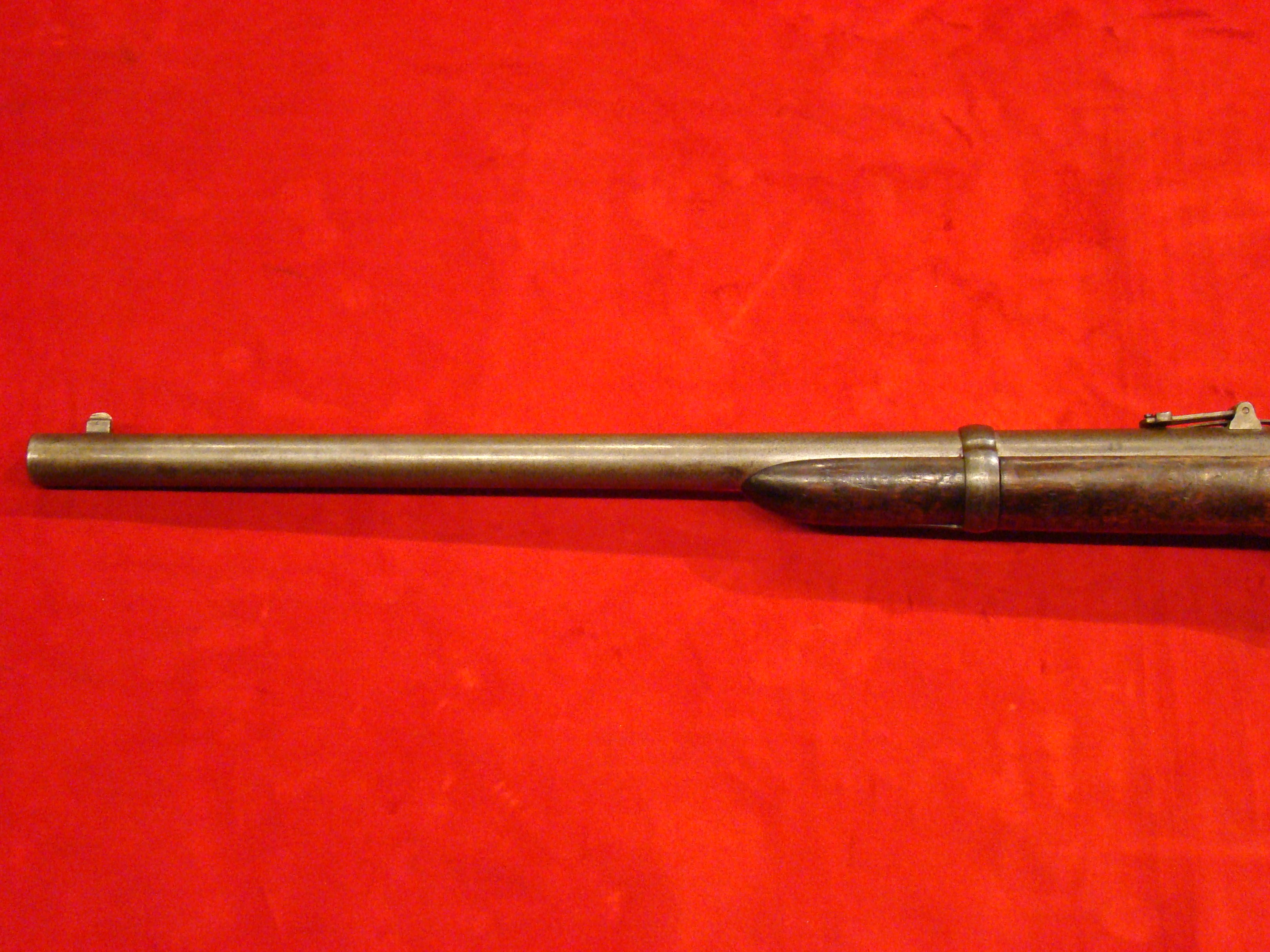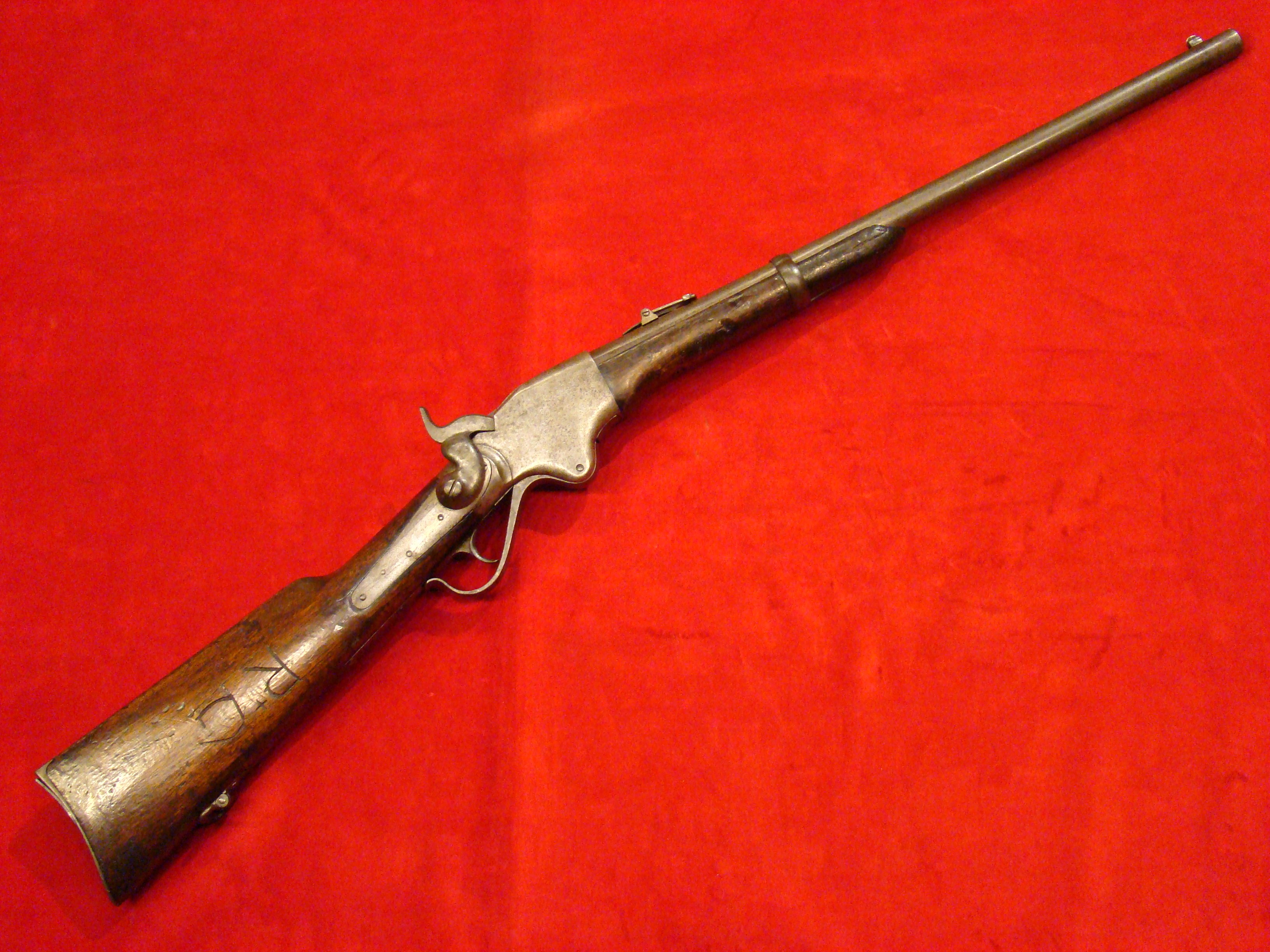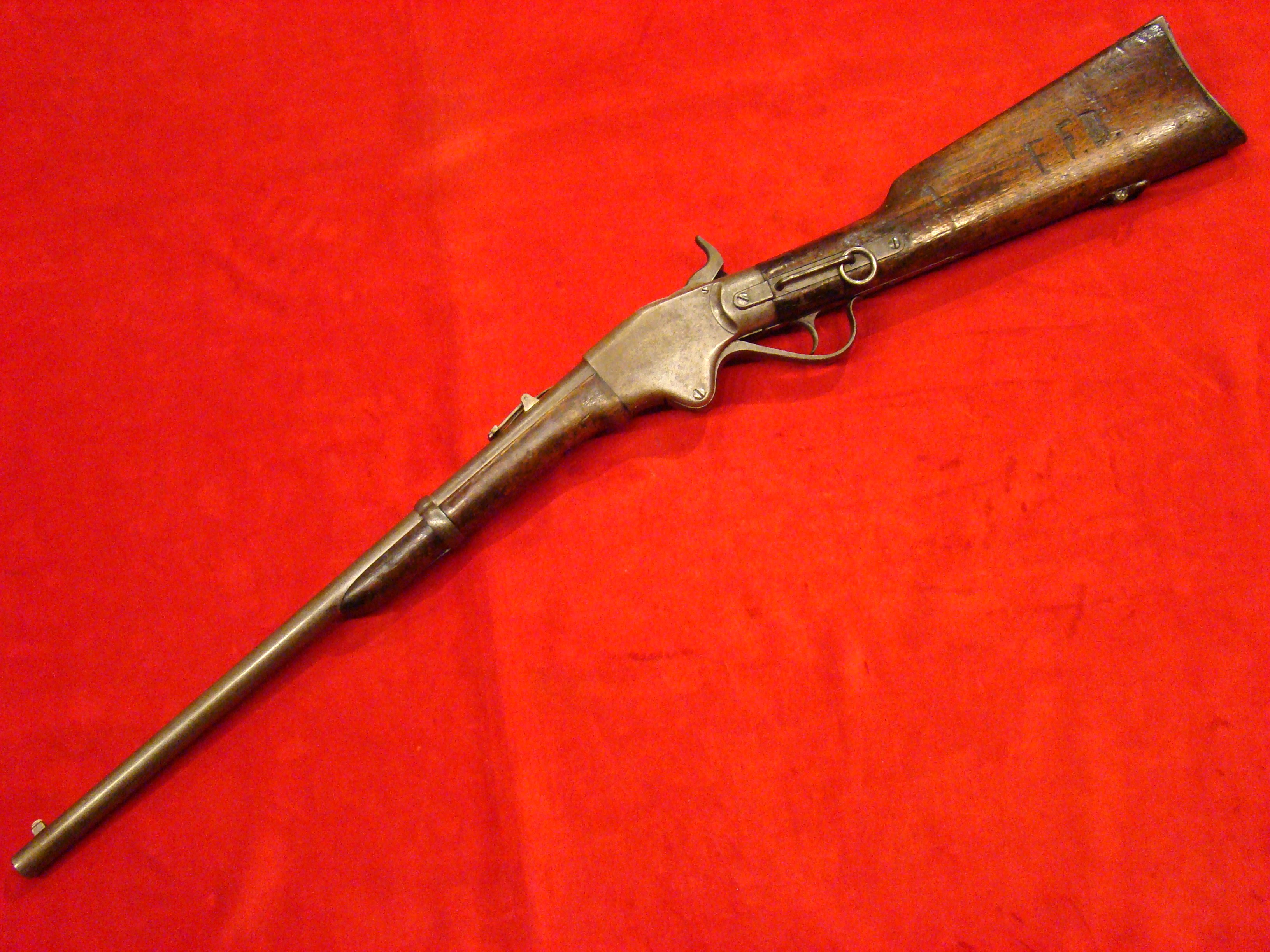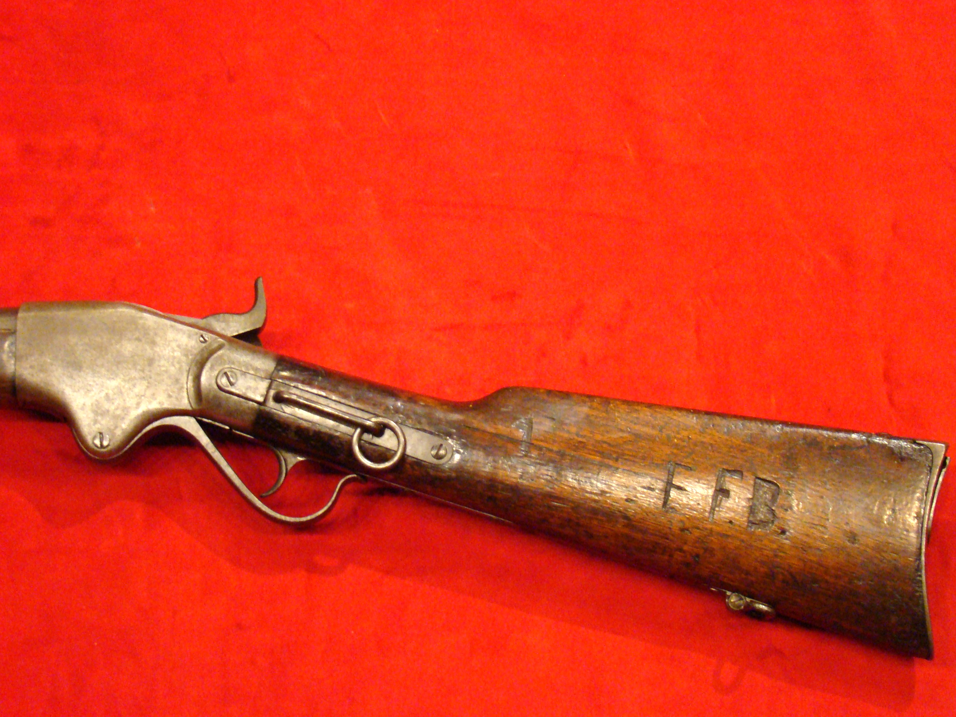 A very good example of a wartime used Spencer Repeating Carbine. Serial # 28380. Barrel and frame surfaces are clean and smooth with an untouched, graying patina. 1860 Spencer Patent Address is visible above the breech. Lever action, trigger and cocking mechanism functions properly. Long range flip sight present. Bore shows combat wear but is well defined. Stock exhibits wear and dings consistent with campaigning in the saddle. There are two sets of initials carved into the butt-stock. One side has “F.F.B.” and the other has “R+C”. This gun has been for years in the collection of the Late Dennis Urban who was a chairman of the Knoxville TN. Civil War Roundtable chapter. He was convinced that this gun was carried by Pvt. Frederick Brenner of Co. B, 22nd Pennsylvania Vol. Cavalry Regt. There is a folder of research including copies of Brenner’s service records, his discharge, and a regimental history of the 22nd PA. Cavalry Regt.  $2495.00