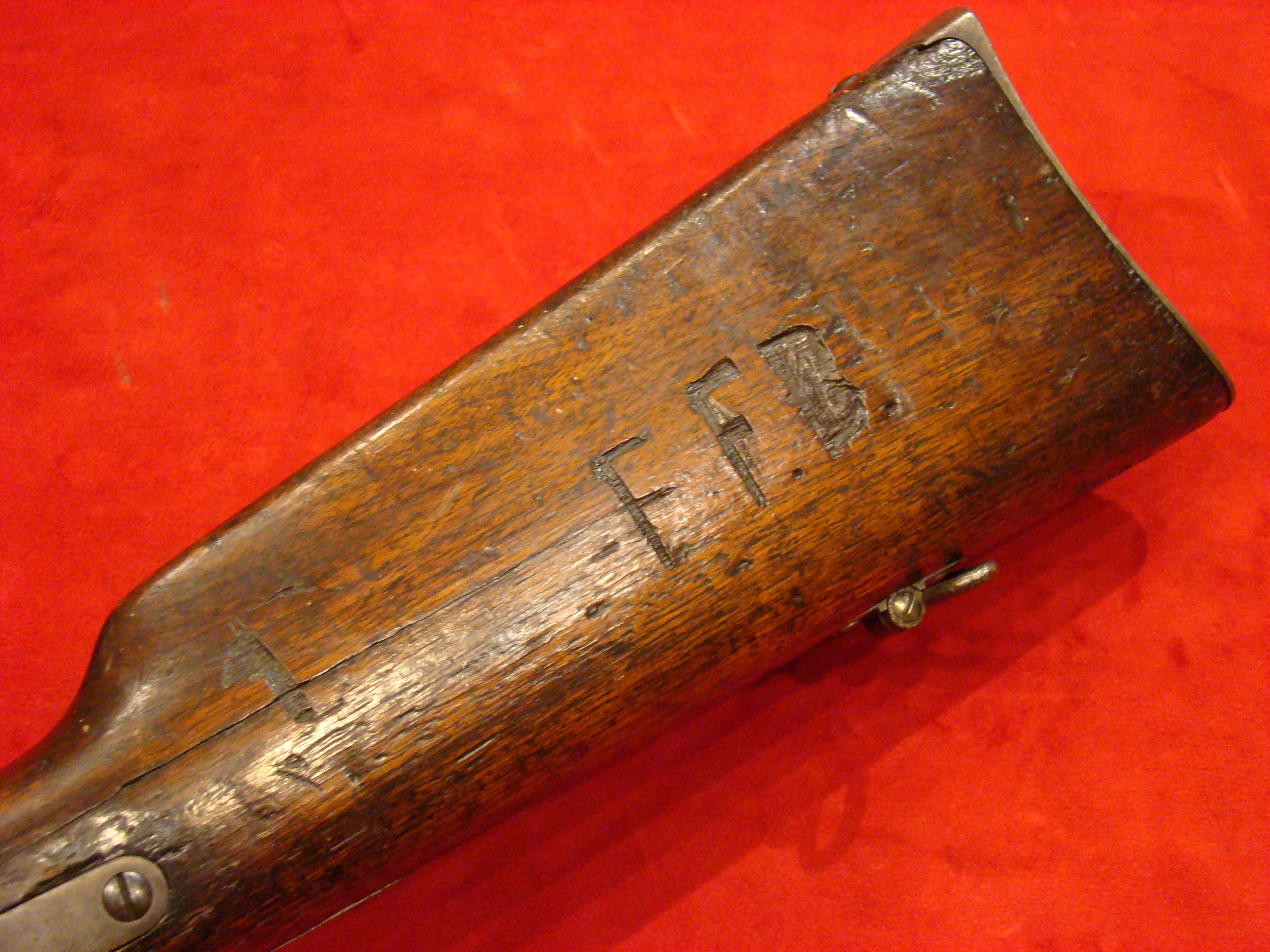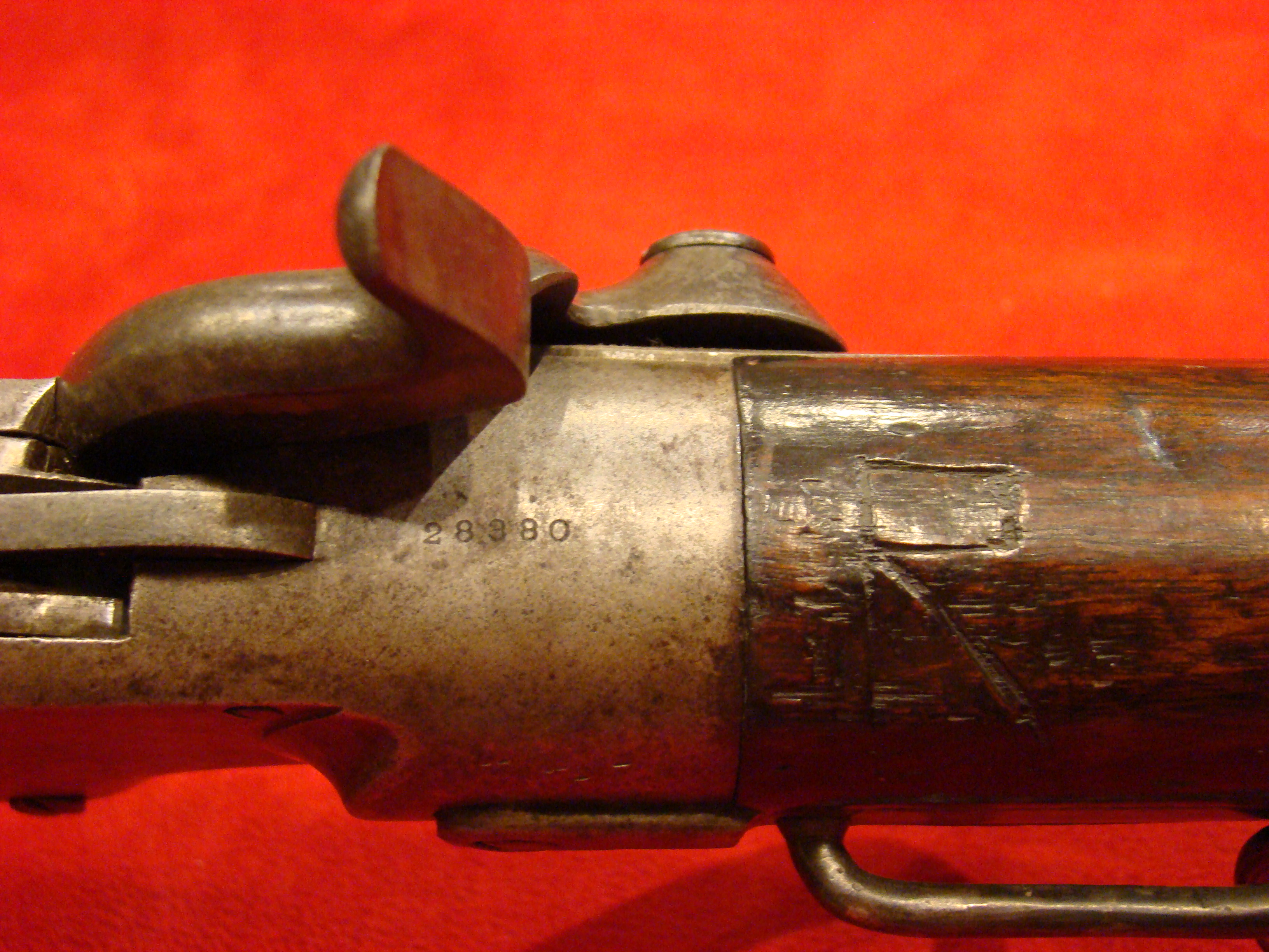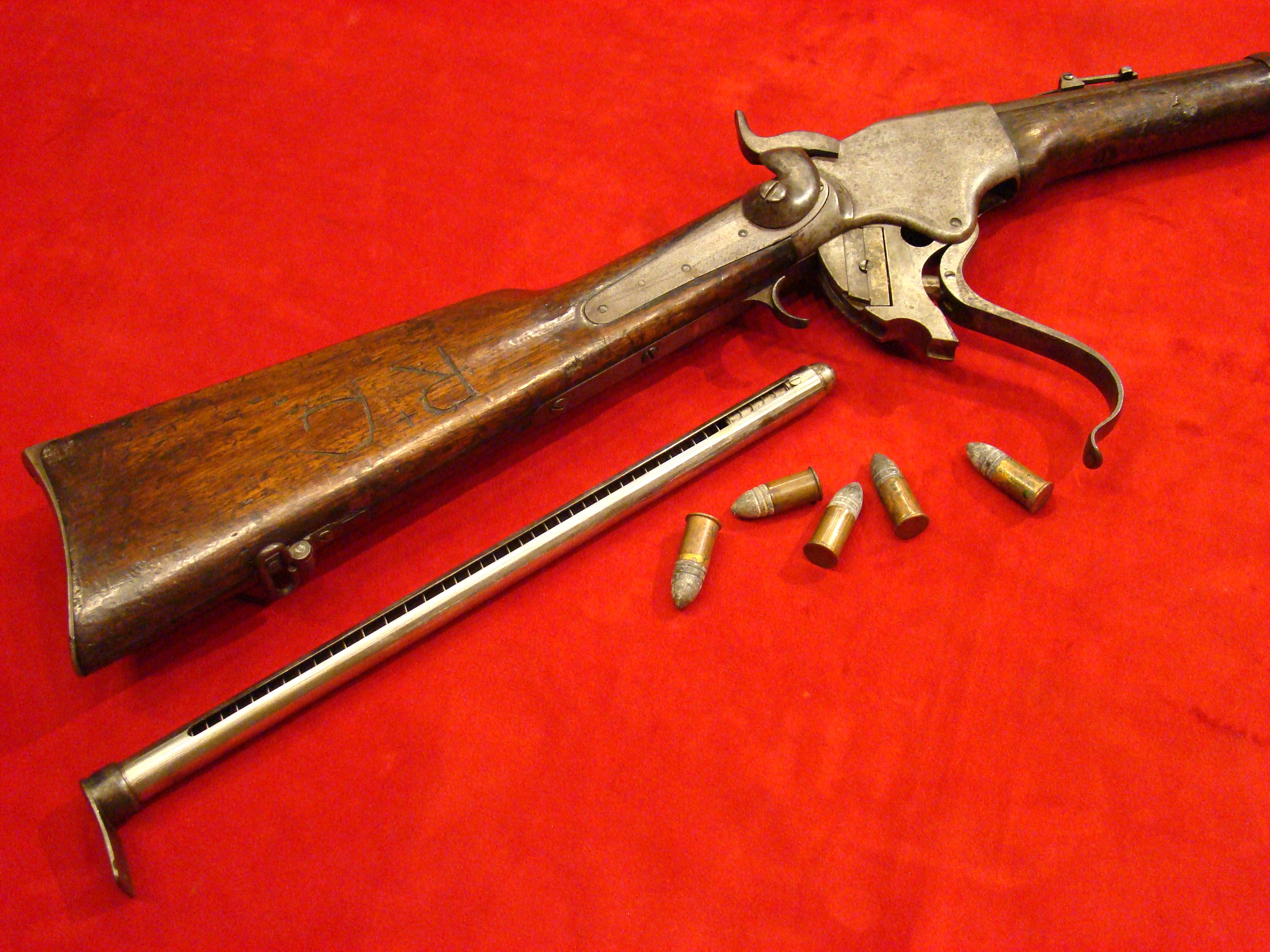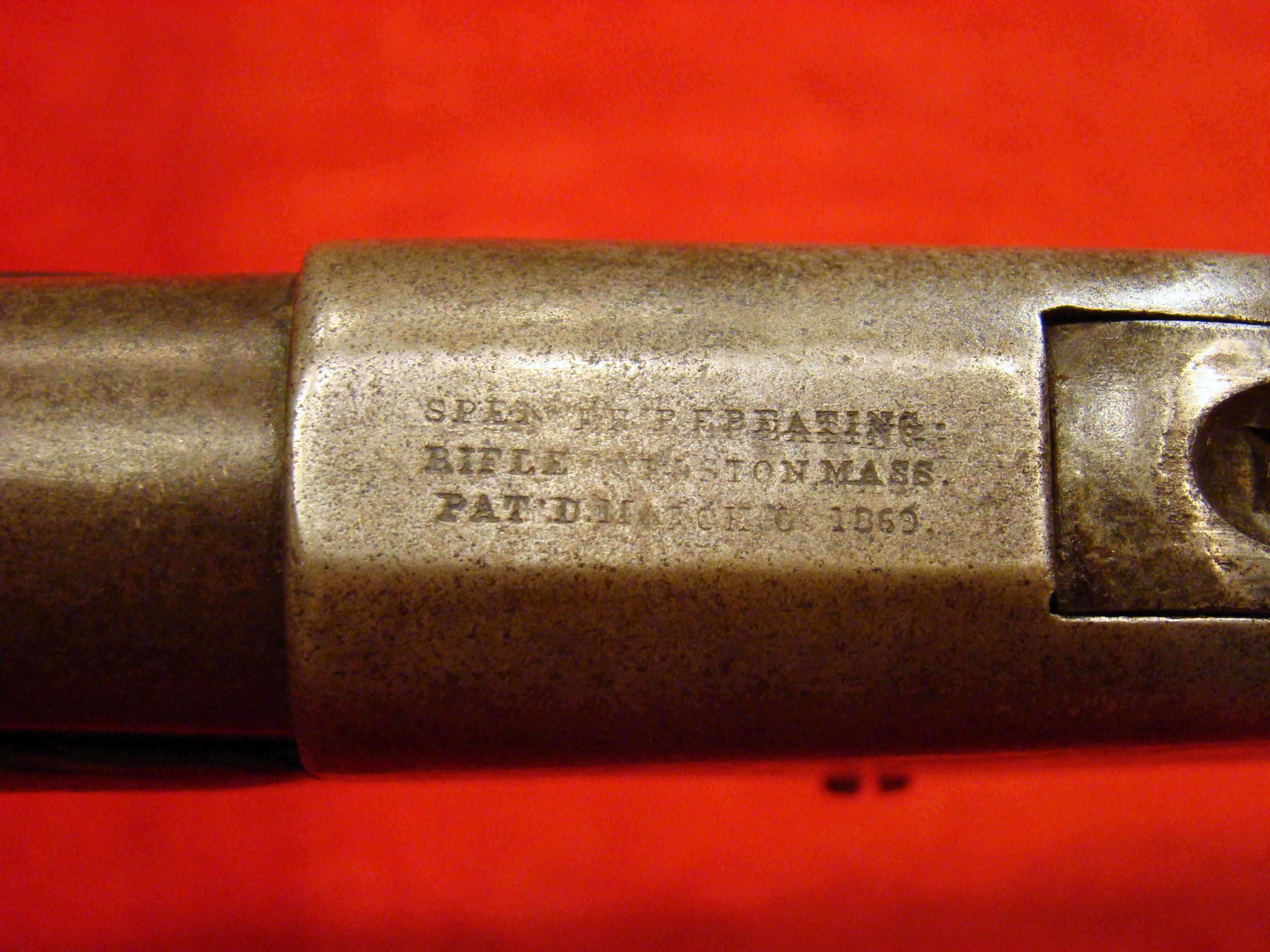 A very good example of a wartime used Spencer Repeating Carbine. Serial # 28380. Barrel and frame surfaces are clean and smooth with an untouched, graying patina. 1860 Spencer Patent Address is visible above the breech. Lever action, trigger and cocking mechanism functions properly. Long range flip sight present. Bore shows combat wear but is well defined. Stock exhibits wear and dings consistent with campaigning in the saddle. There are two sets of initials carved into the butt-stock. One side has “F.F.B.” and the other has “R+C”. This gun has been for years in the collection of the Late Dennis Urban who was a chairman of the Knoxville TN. Civil War Roundtable chapter. He was convinced that this gun was carried by Pvt. Frederick Brenner of Co. B, 22nd Pennsylvania Vol. Cavalry Regt. There is a folder of research including copies of Brenner’s service records, his discharge, and a regimental history of the 22nd PA. Cavalry Regt.  $2495.00
