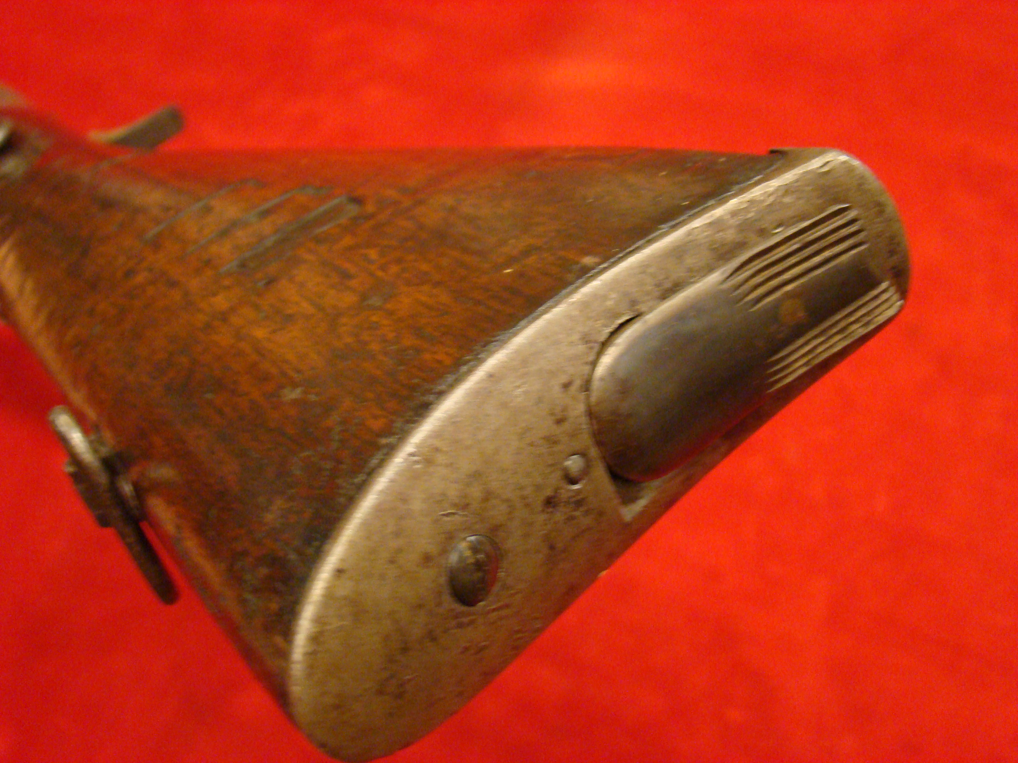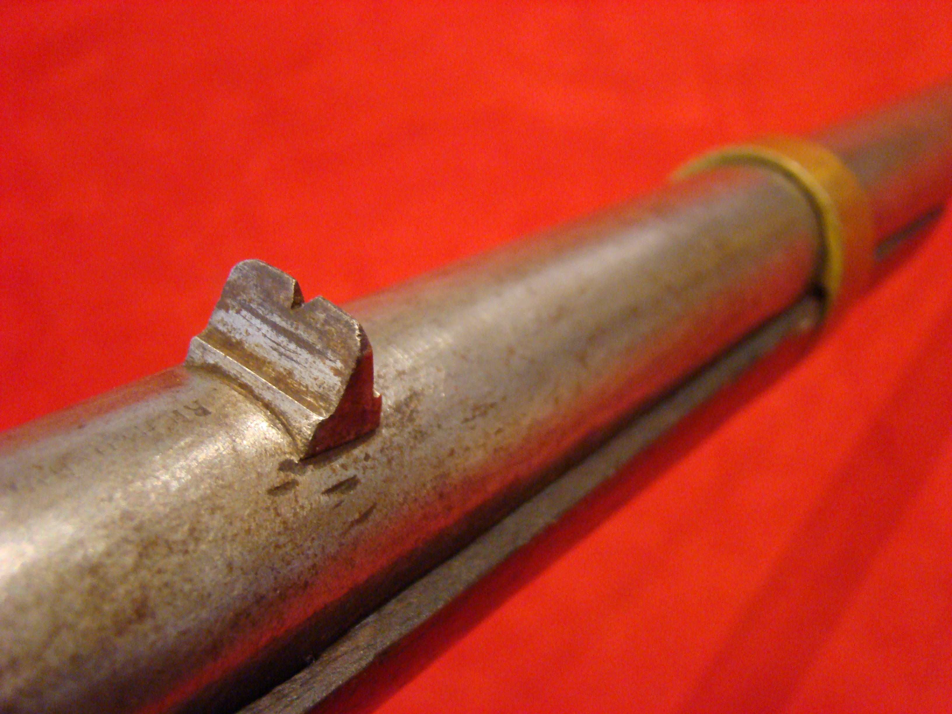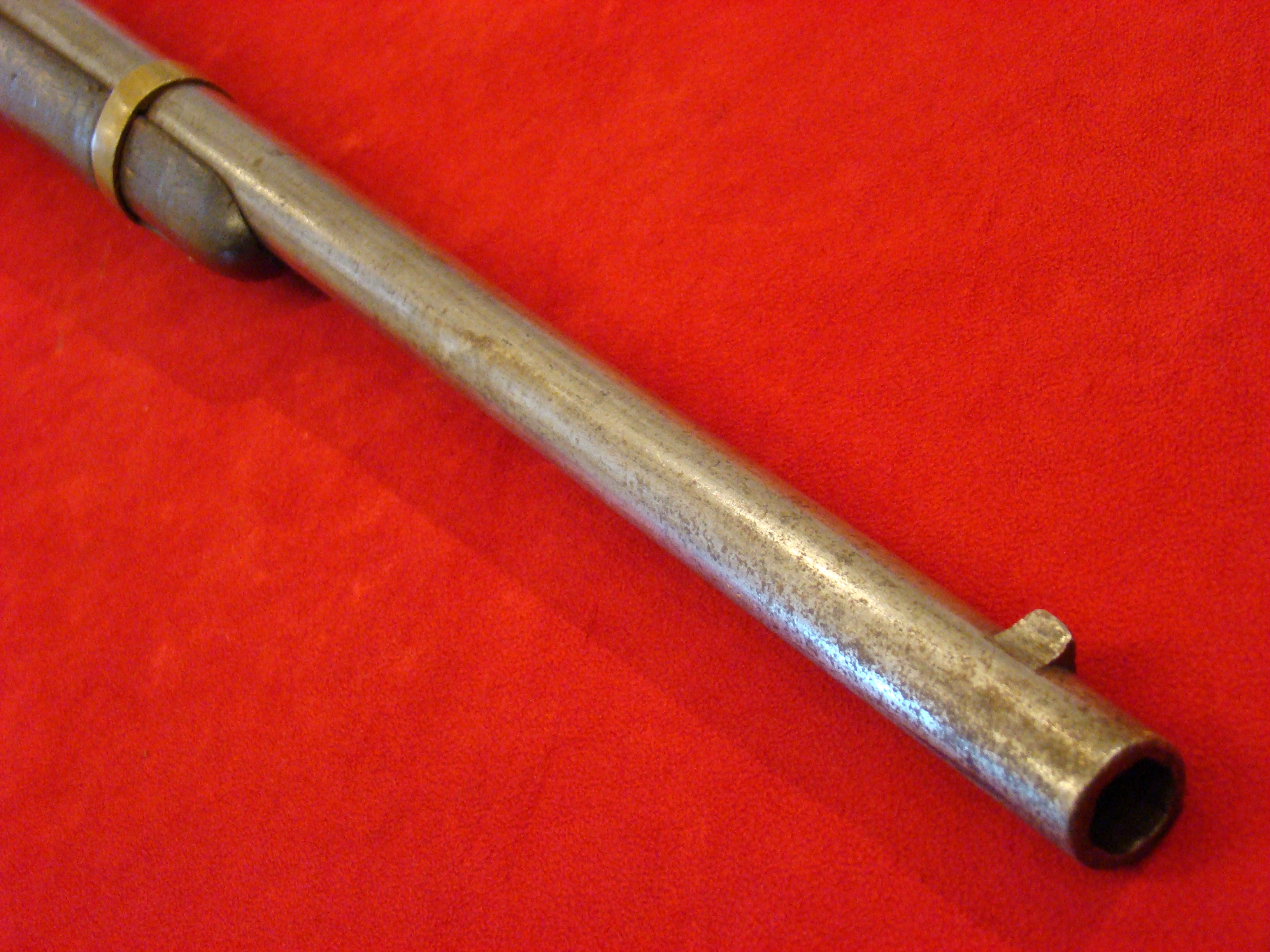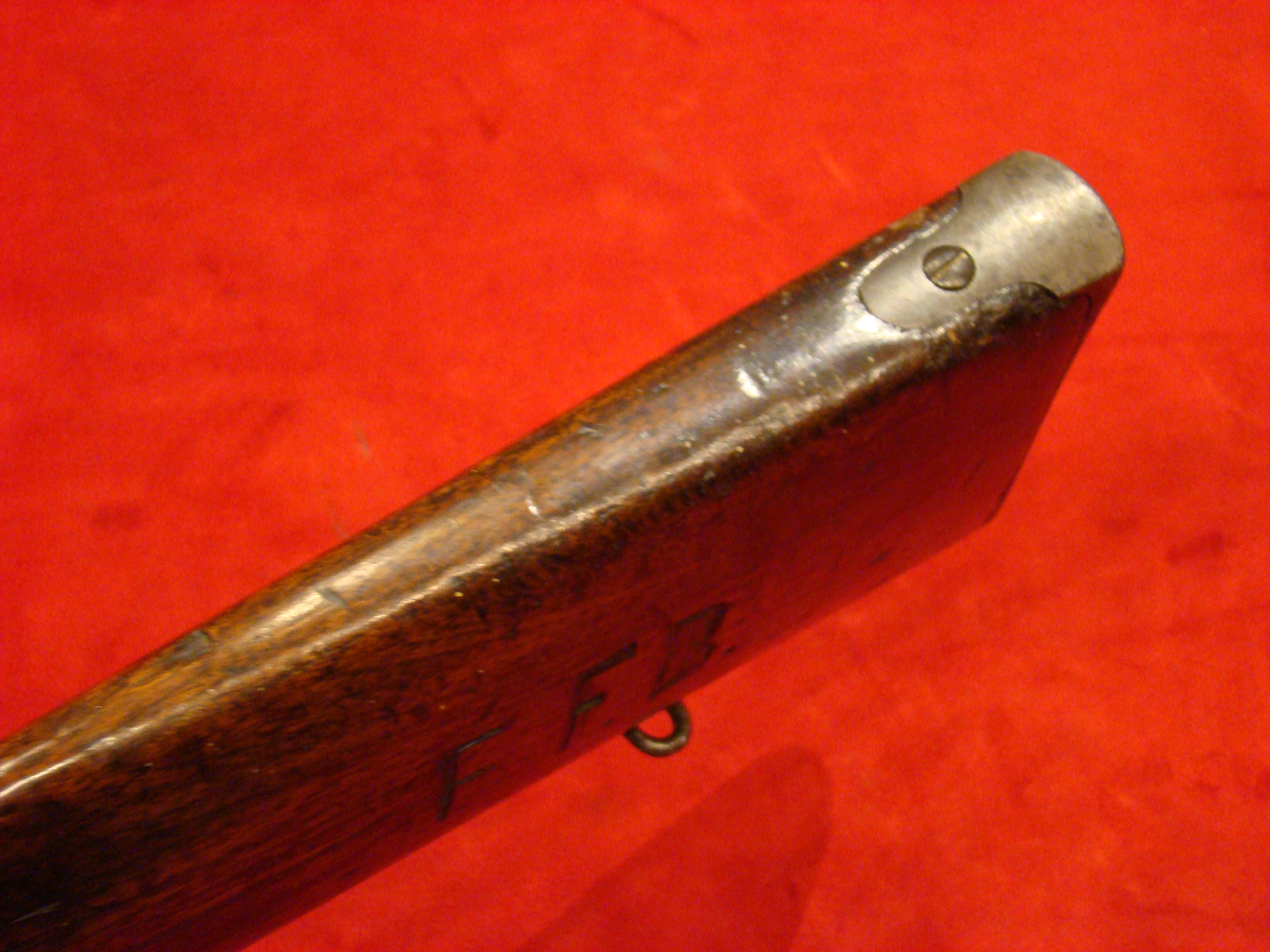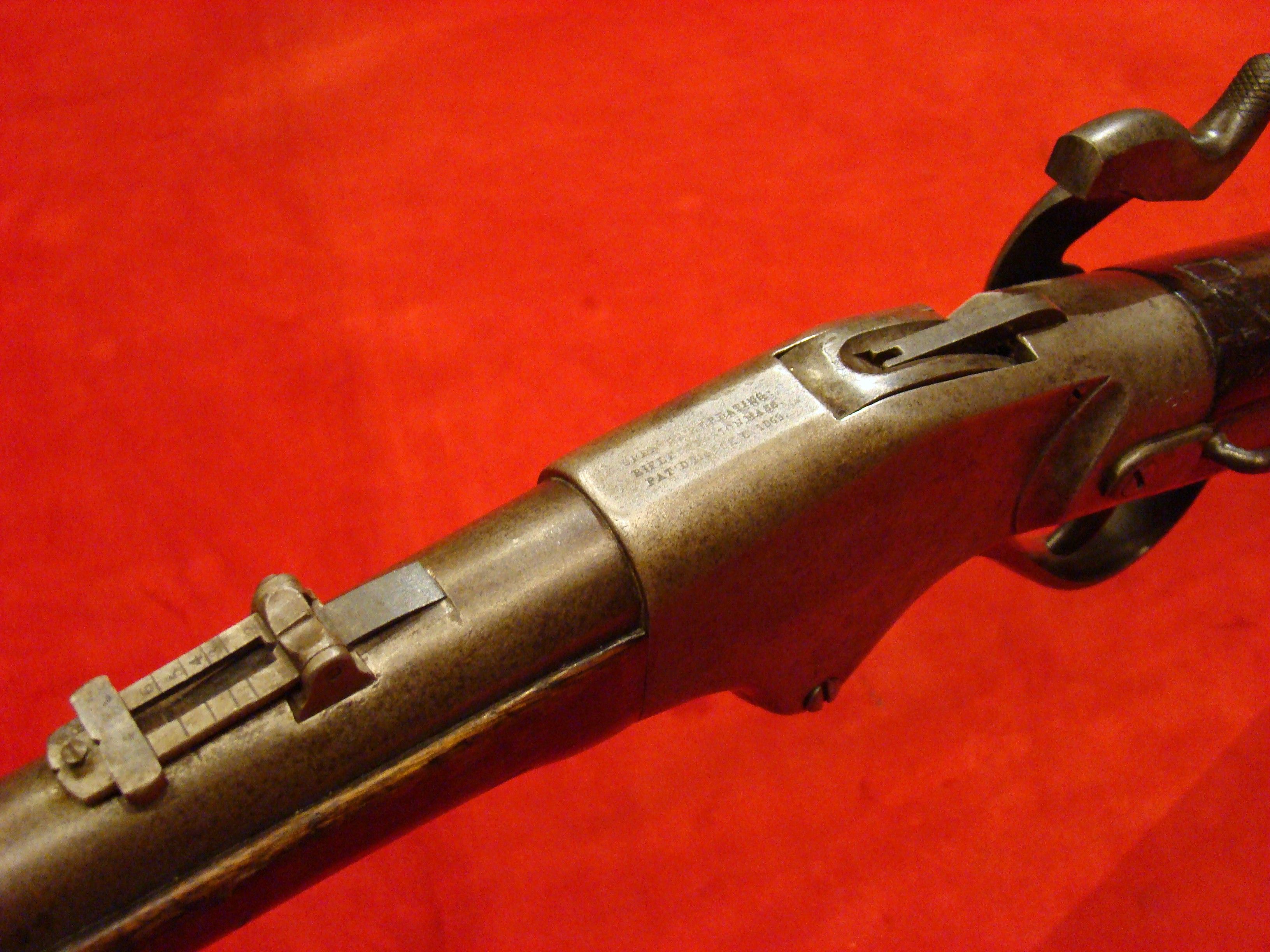 A very good example of a wartime used Spencer Repeating Carbine. Serial # 28380. Barrel and frame surfaces are clean and smooth with an untouched, graying patina. 1860 Spencer Patent Address is visible above the breech. Lever action, trigger and cocking mechanism functions properly. Long range flip sight present. Bore shows combat wear but is well defined. Stock exhibits wear and dings consistent with campaigning in the saddle. There are two sets of initials carved into the butt-stock. One side has “F.F.B.” and the other has “R+C”. This gun has been for years in the collection of the Late Dennis Urban who was a chairman of the Knoxville TN. Civil War Roundtable chapter. He was convinced that this gun was carried by Pvt. Frederick Brenner of Co. B, 22nd Pennsylvania Vol. Cavalry Regt. There is a folder of research including copies of Brenner’s service records, his discharge, and a regimental history of the 22nd PA. Cavalry Regt.  $2495.00