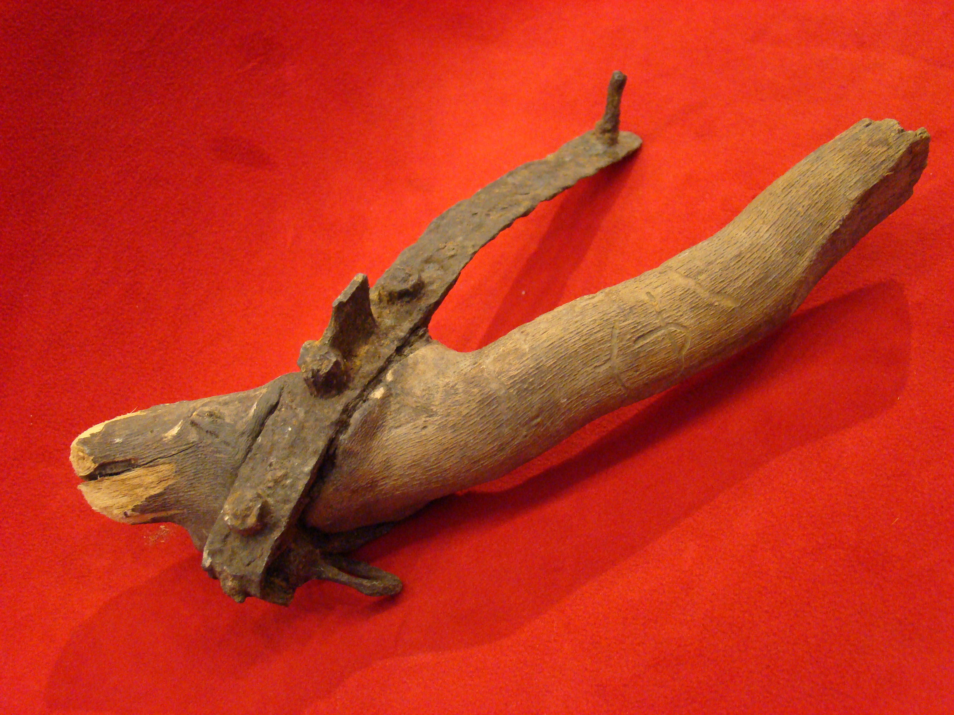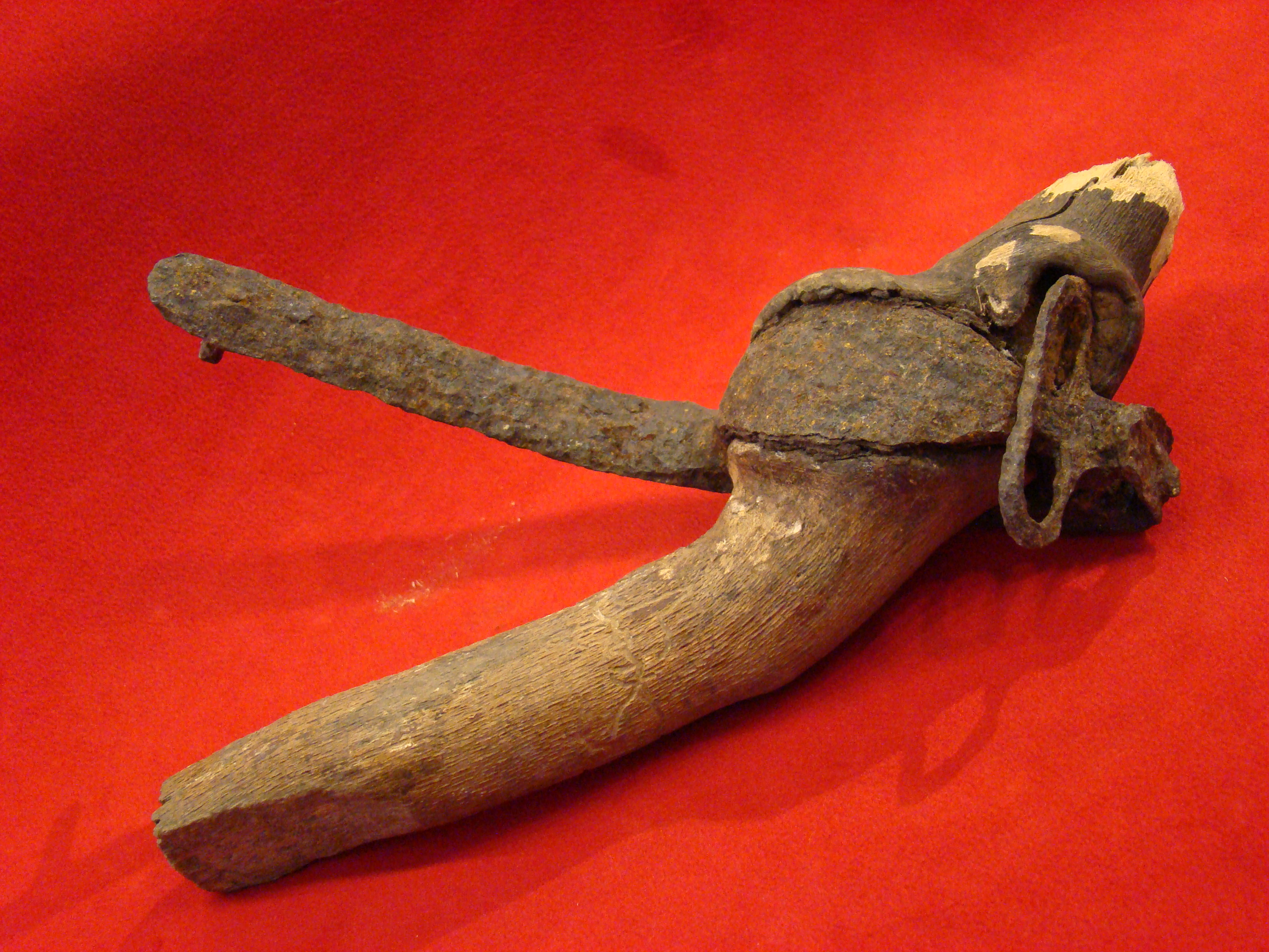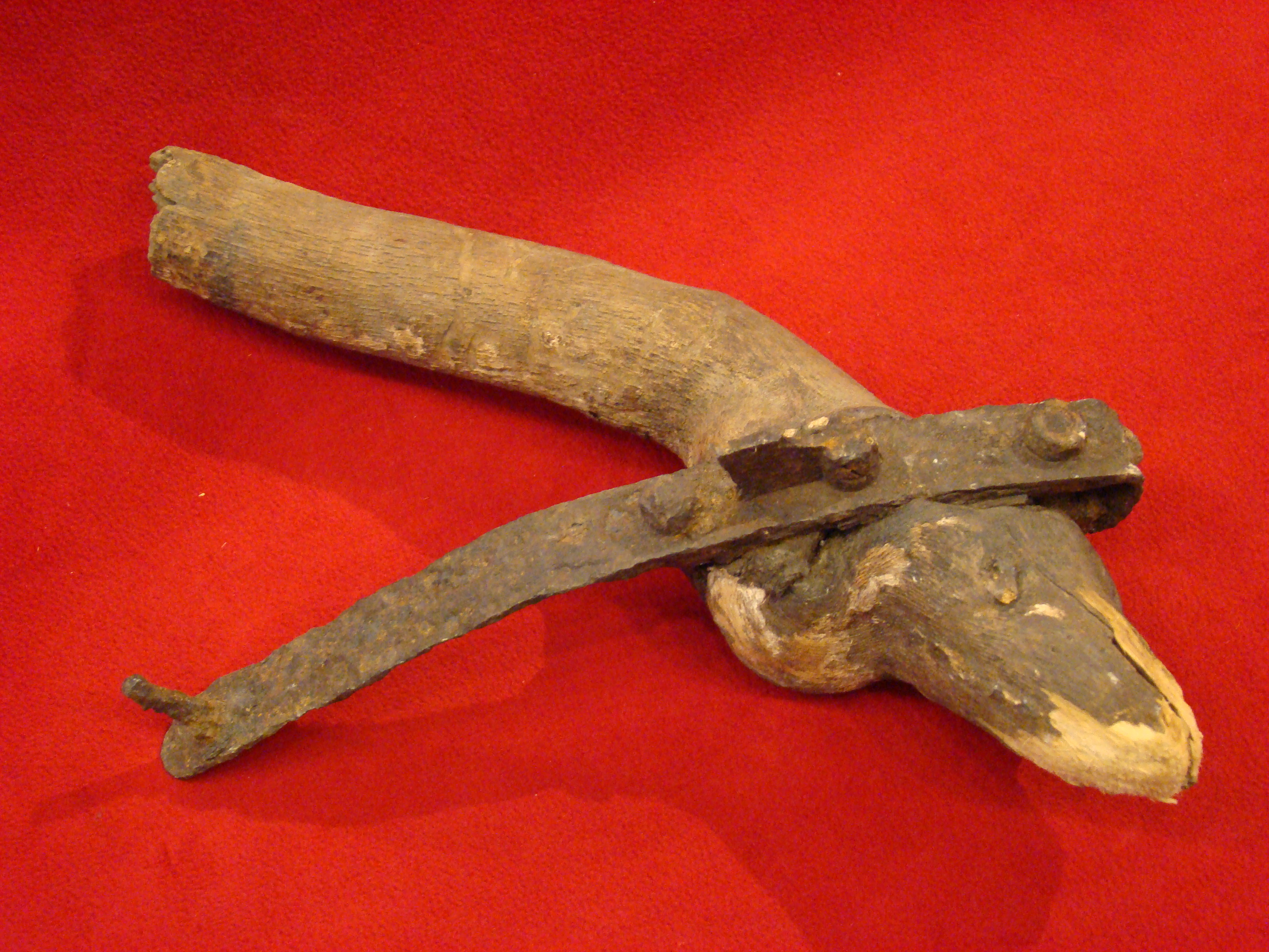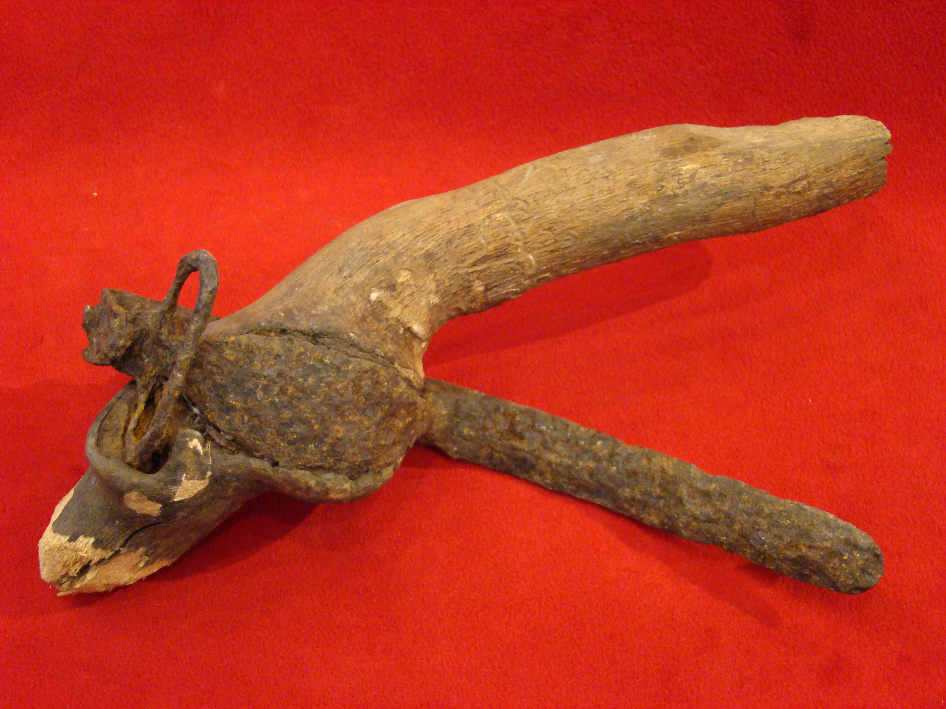 If your wedding anniversary is nigh, you might want to consider presenting this token of affection to your spouse to set the tone of the planned festivities. Unlike the cheesy reproductions and fakes, this set is legit and early, probably ca. 1870-1900. Note wrought iron shackle and “US” marked chain. Functional Indian Wars era padlock with key also included. $795.00 HOLD W.B.