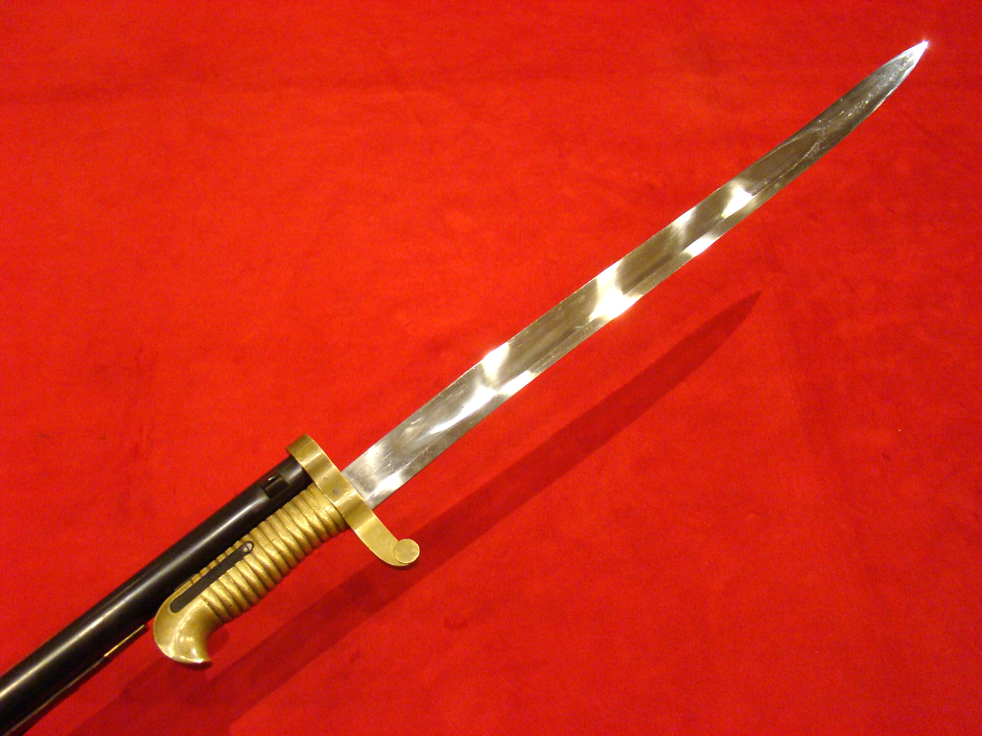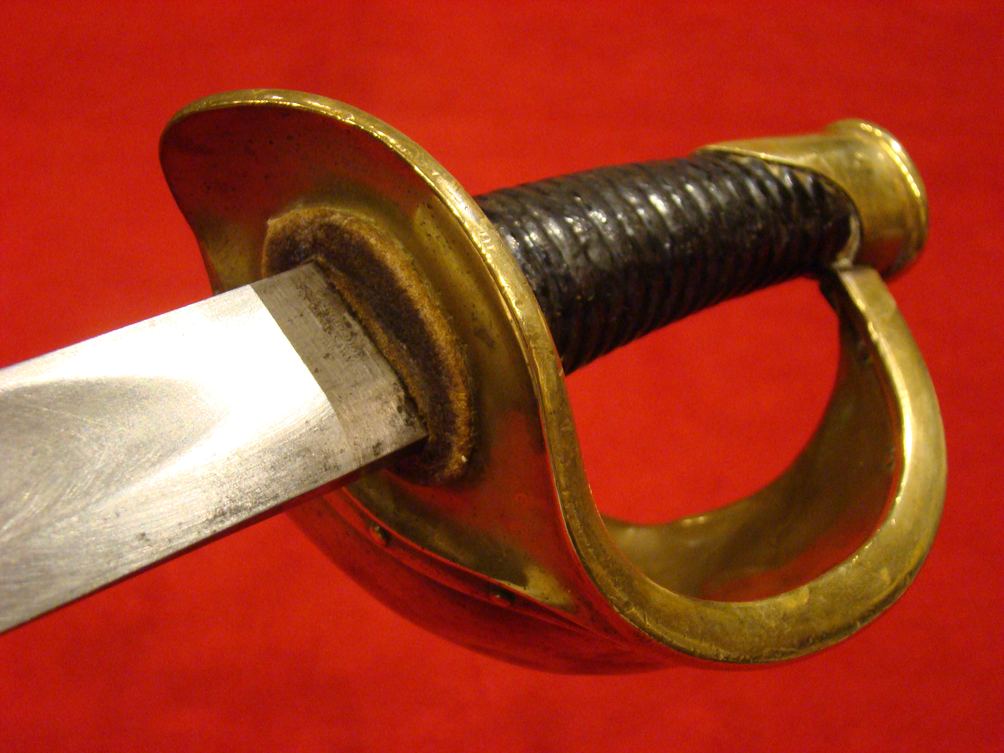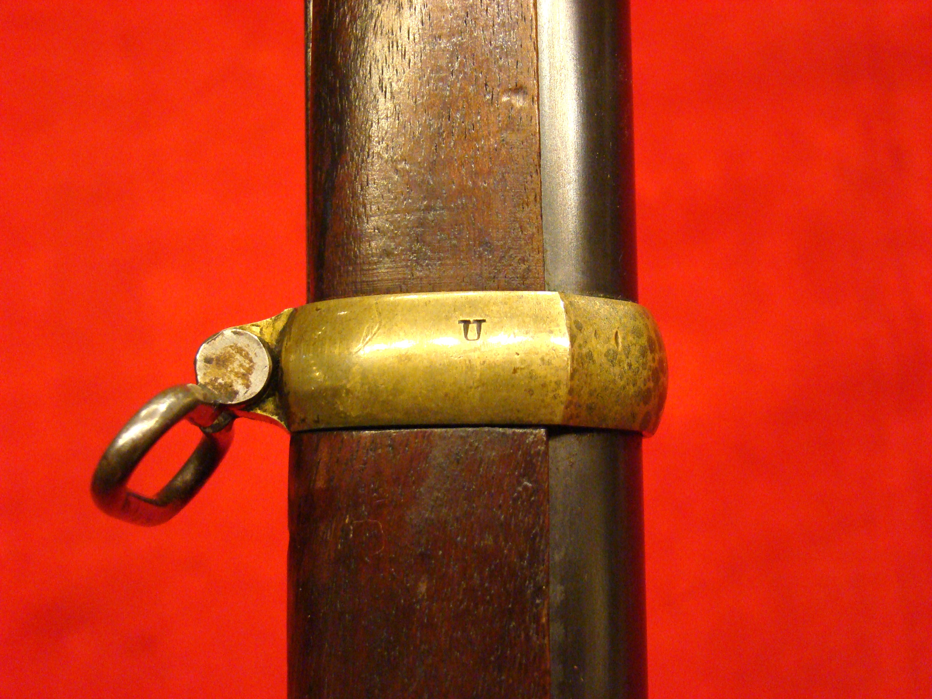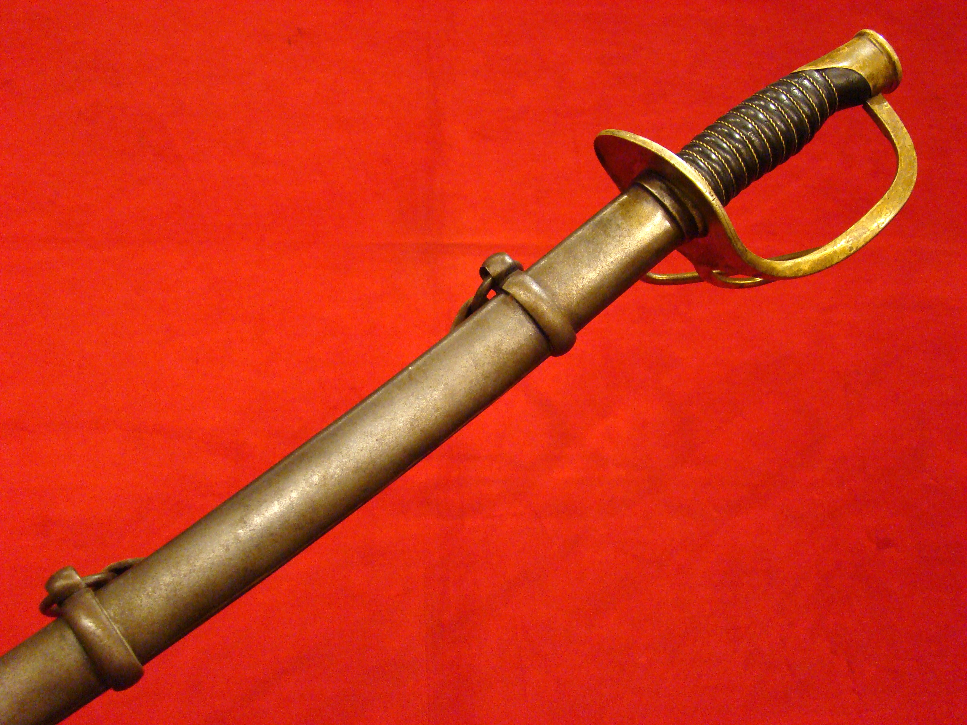 Top of the line Roby contract cavalry saber. Original leather grip and wire wrap is immaculate. There is an original Civil War period leather portepee attached to the guard. Blade is factory bright with clear “C. ROBY/W. CHELMSFORD MASS.” address on the ricasso. Other side is marked “U.S.” over “1864” with inspector’s initials “A.D.K.”. Steel scabbard is dent free with a smooth dark patina. US Cavalry commander George Armstrong Custer carried one of these.