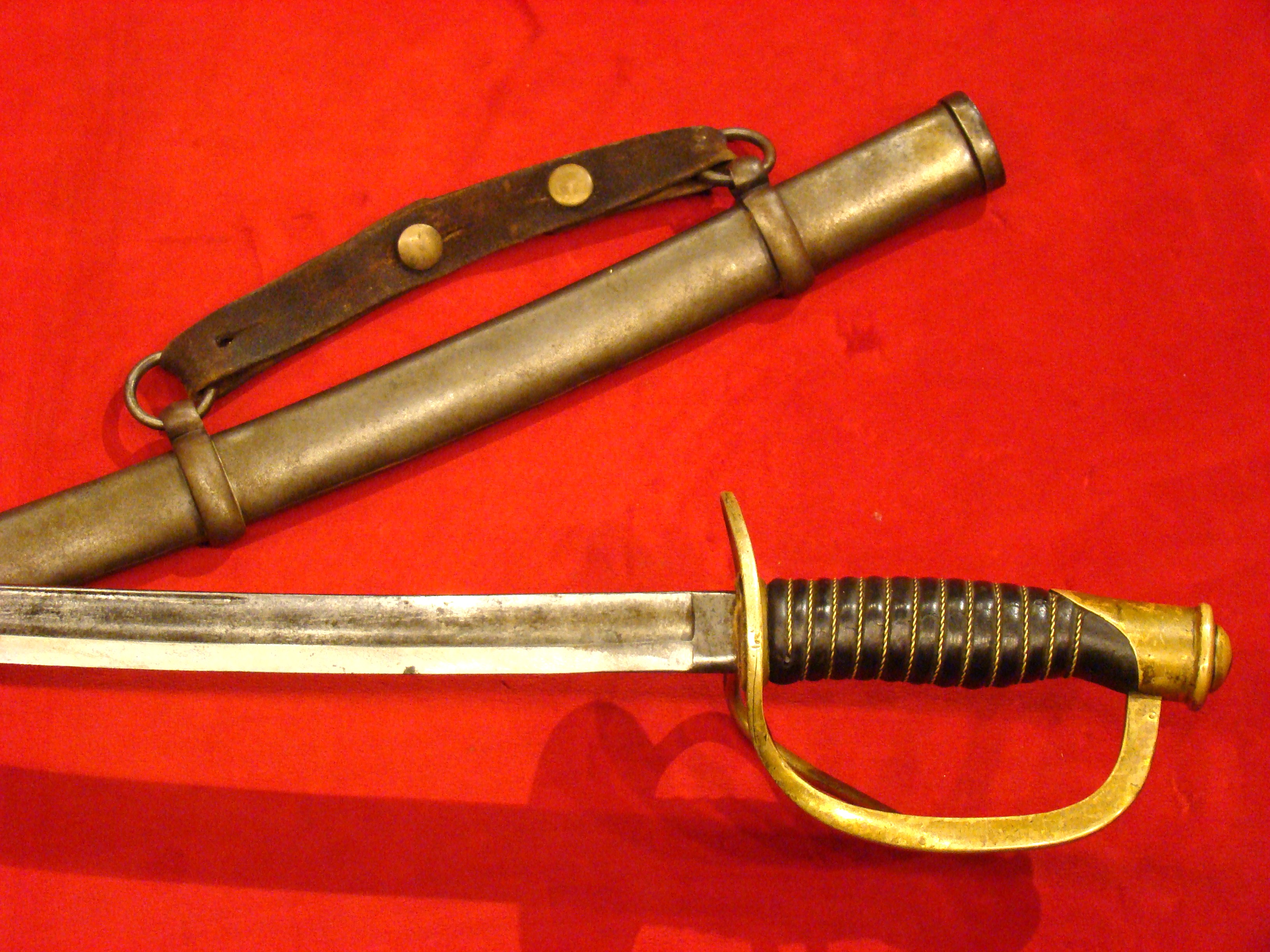 Scarce sword in its original Leech and Rigdon scabbard. Wooden grip retains more than half of its original black paint. Braided wire wrap intact. Blade is graying with some wear to the tip. Brass guard has a deep, untouched patina. Scabbard in really good condition though missing the middle mount and the drag. Reasonably priced Confederate Steel.