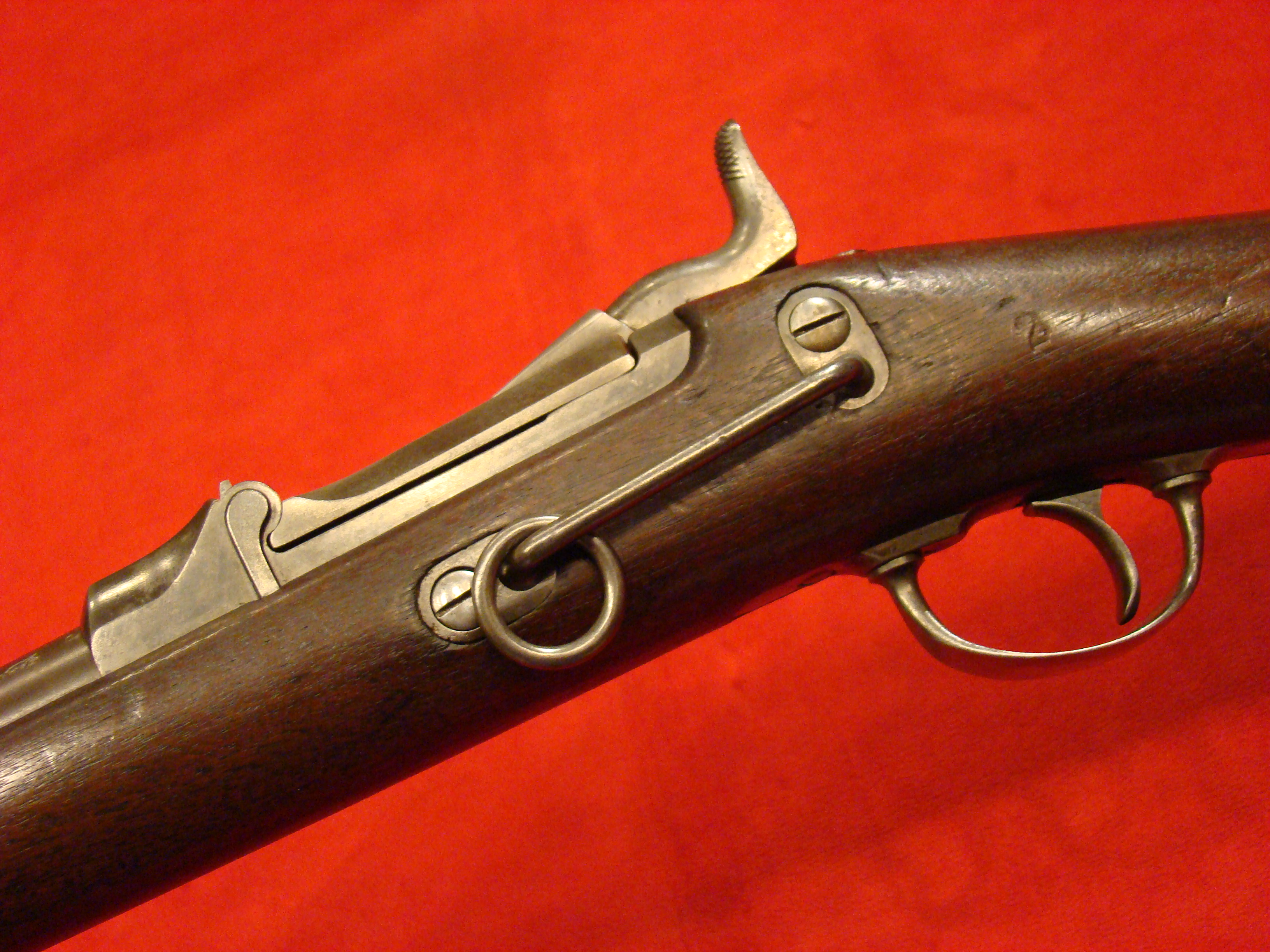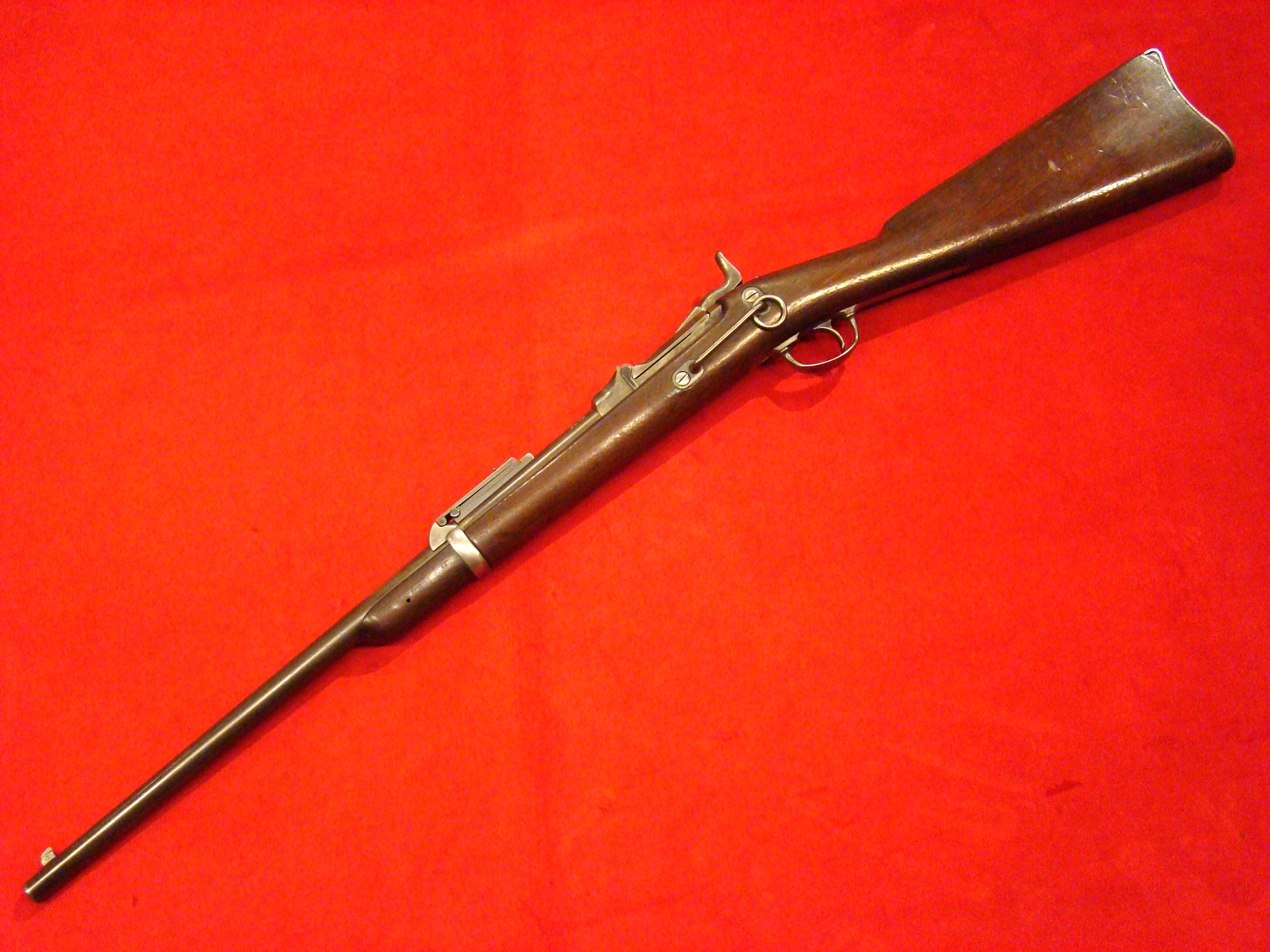 Scarce carbine. Early production serial # 6603. This carbine utilized a sliding breech that accomodated a rimfire cartridge. Metal surfaces are smooth with no pitting and remnants of factory finish on the barrel. Long range sight present. Bore is clean with well defined rifling. Carbine sling loop present but ring is missing. Trigger, cocking and breech mechanism works correctly. Stock is very nice, no cracks or repairs. Small chip on one side where stock meets the breech. Wood to metal fit is excellent. These carbines were issued by the 9th New York Cavalry Regt. and used with good effect at Gettysburg. They were also carried by the 11th New York Cavalry as well as other units.