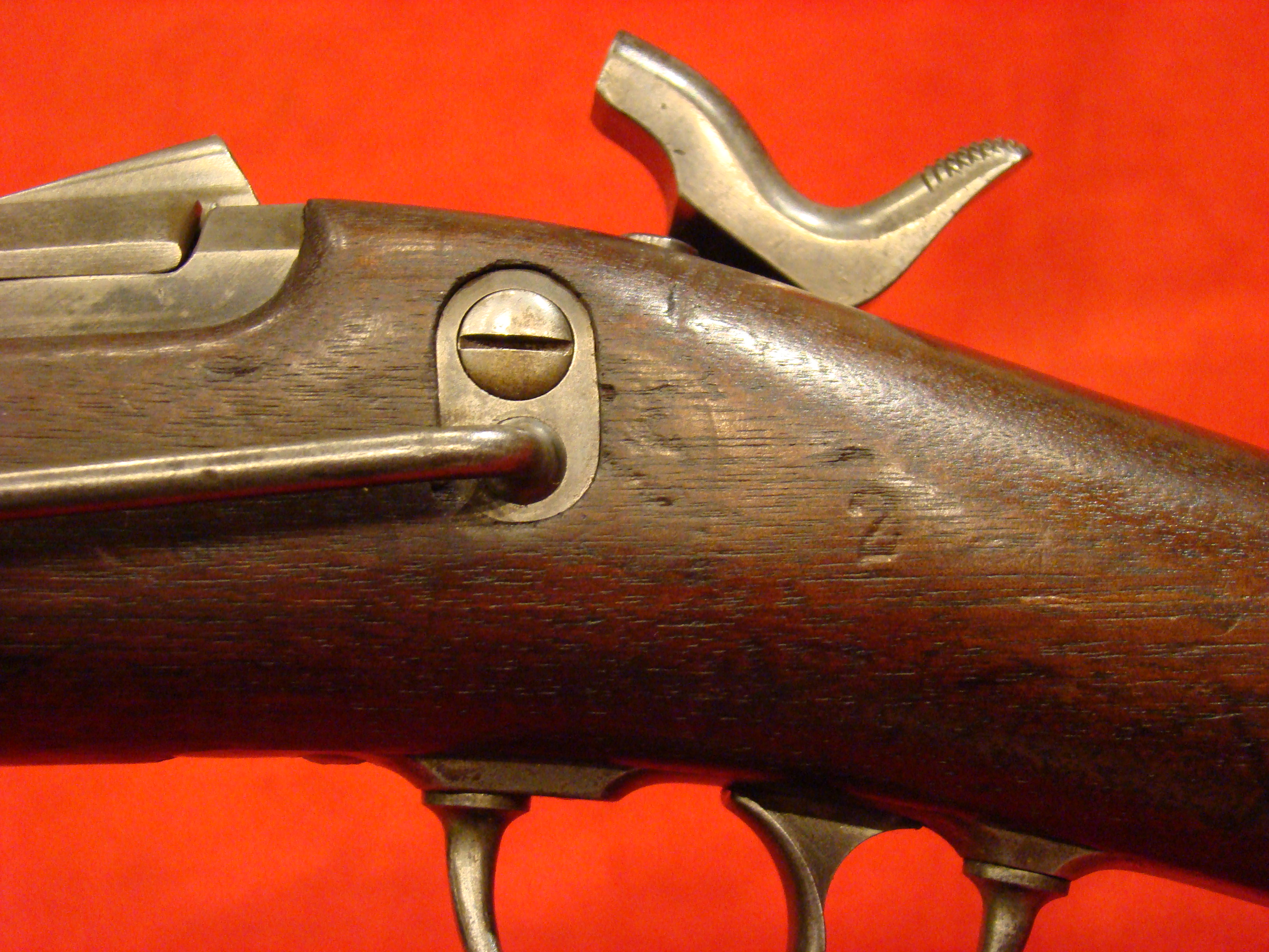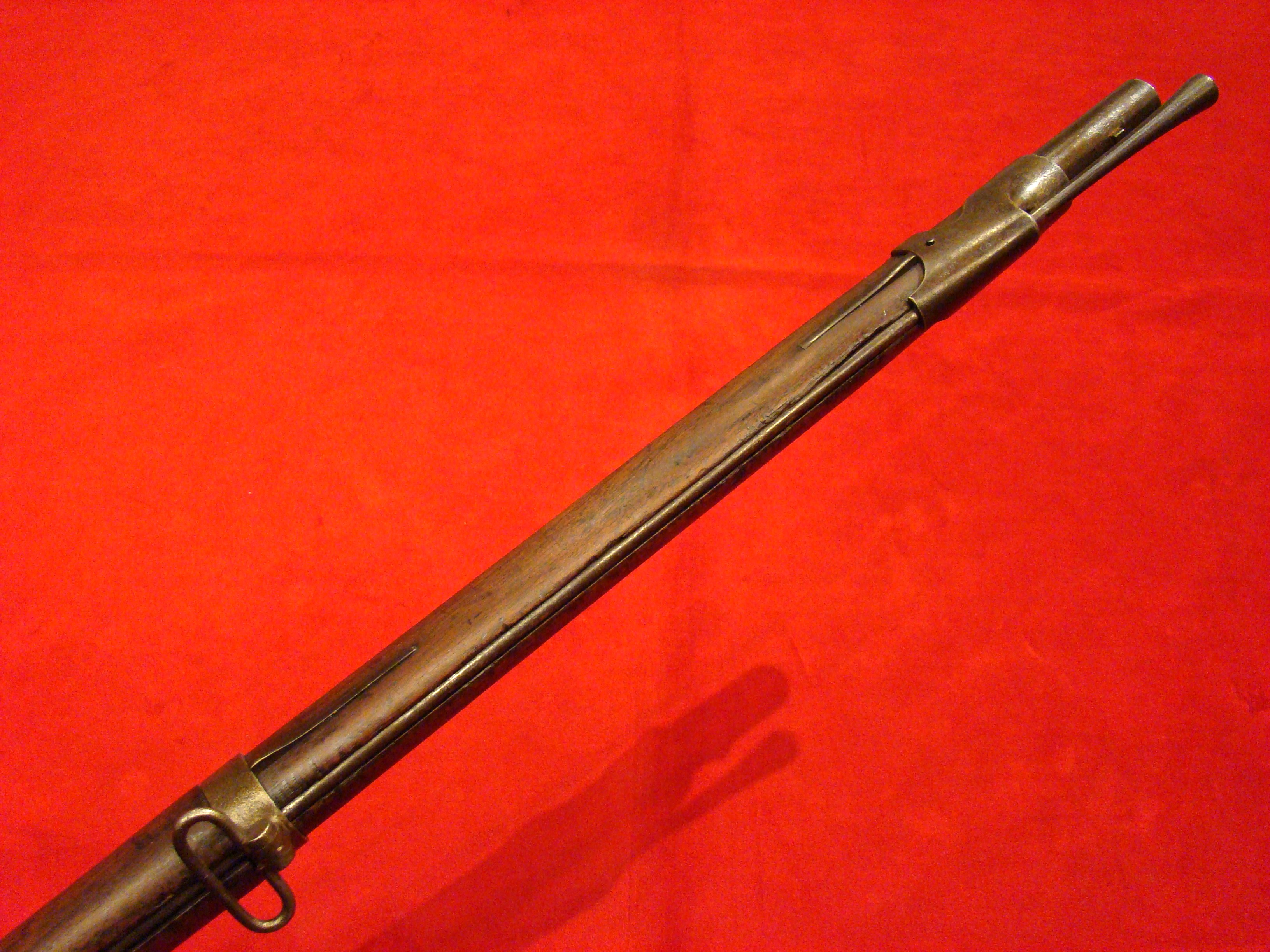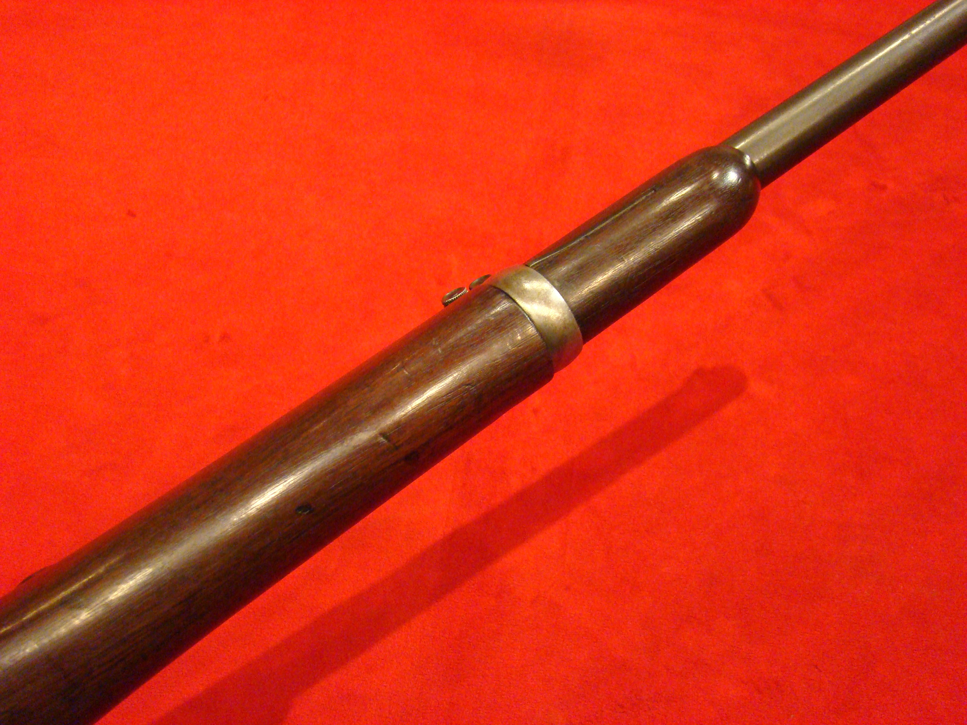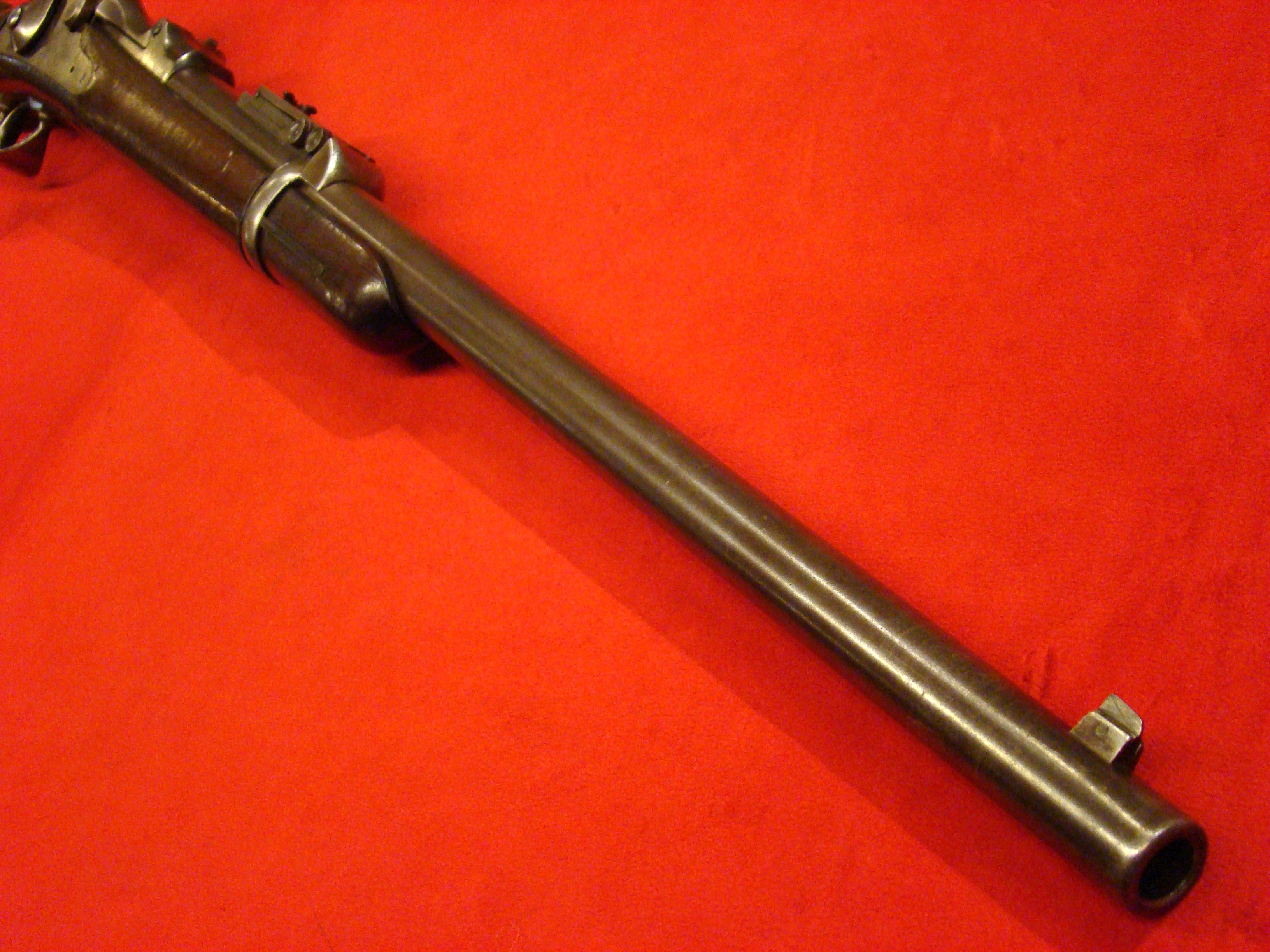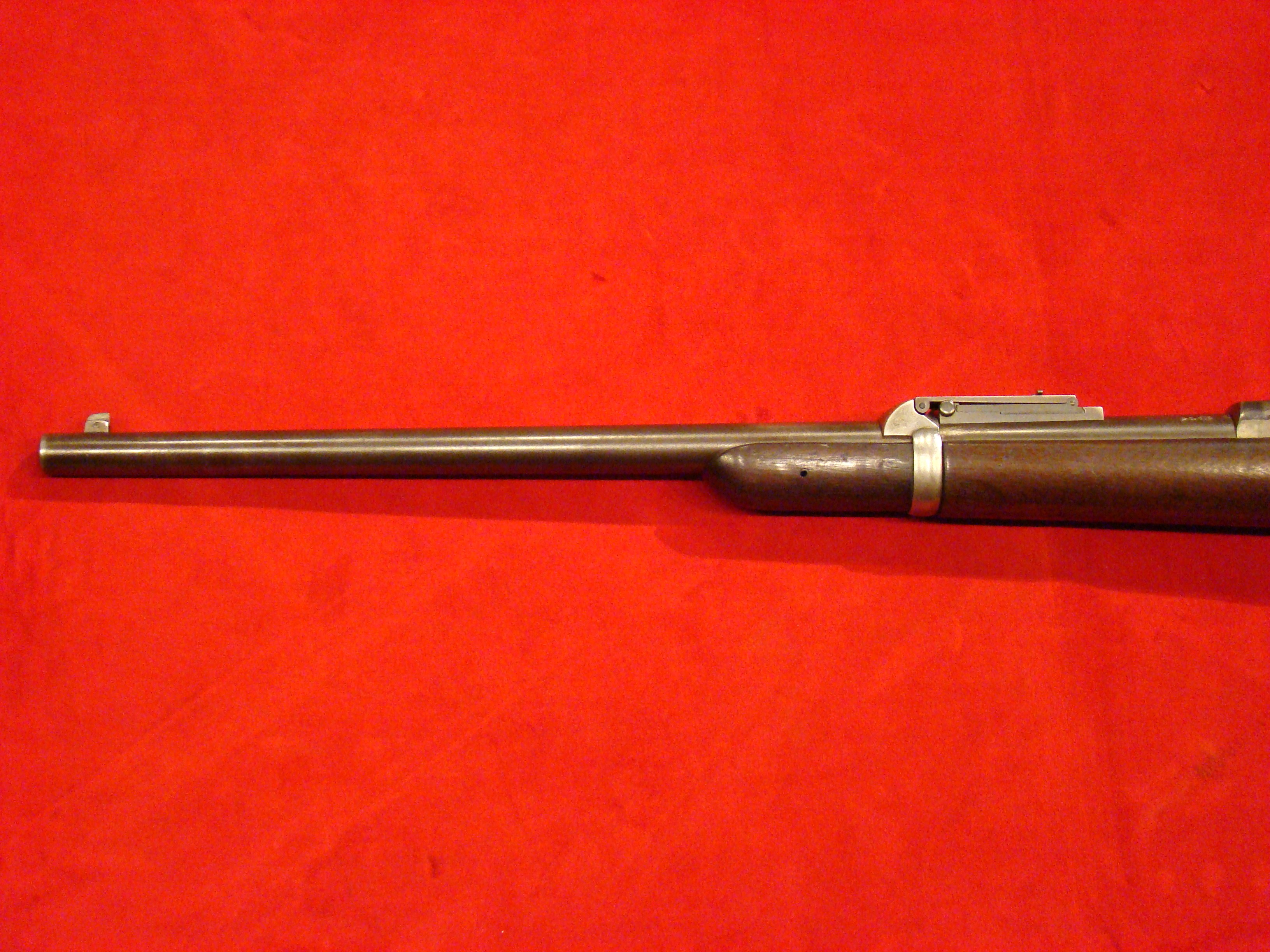 Great example. Serial # 11949. This carbine utilized a sliding breech that accomodated a rimfire cartridge. Smooth metal surfaces with a dark graying patina. Intact leather sleeve on the barrel. Long range sight present. Bore is dirty with well defined rifling. Stock shows combat wear but generally very good with missing wood repairs. Sling loop missing. $1850.00