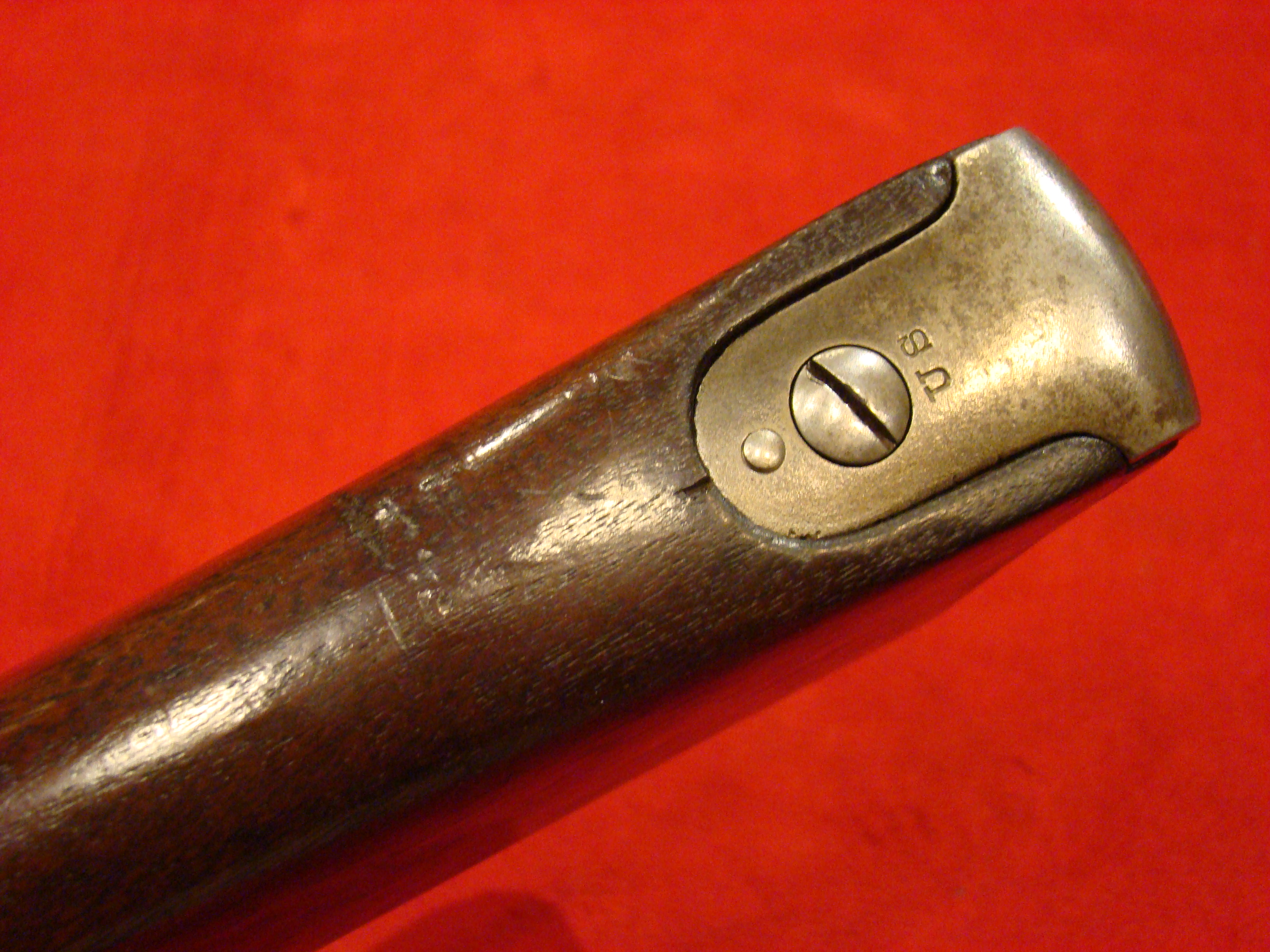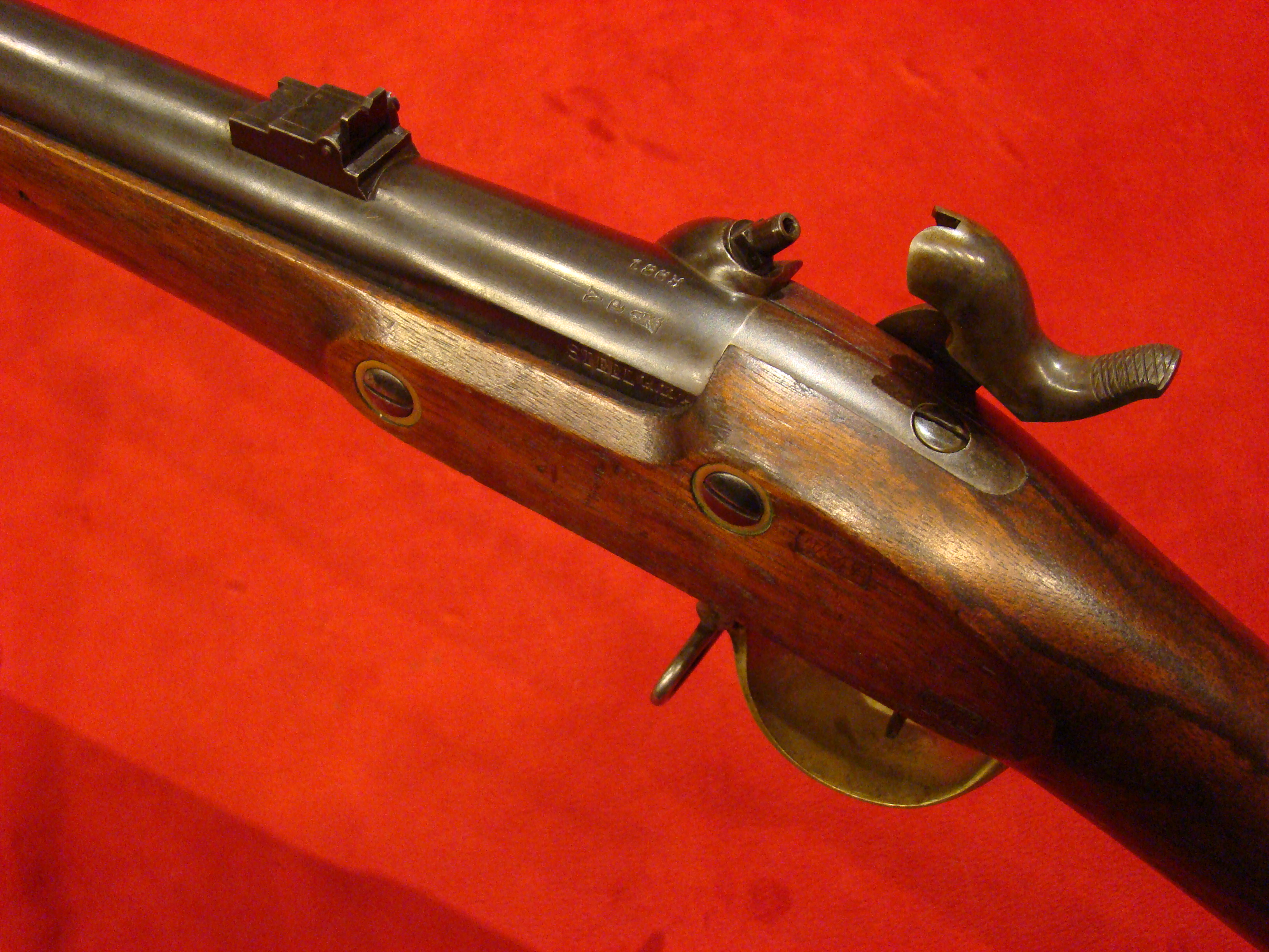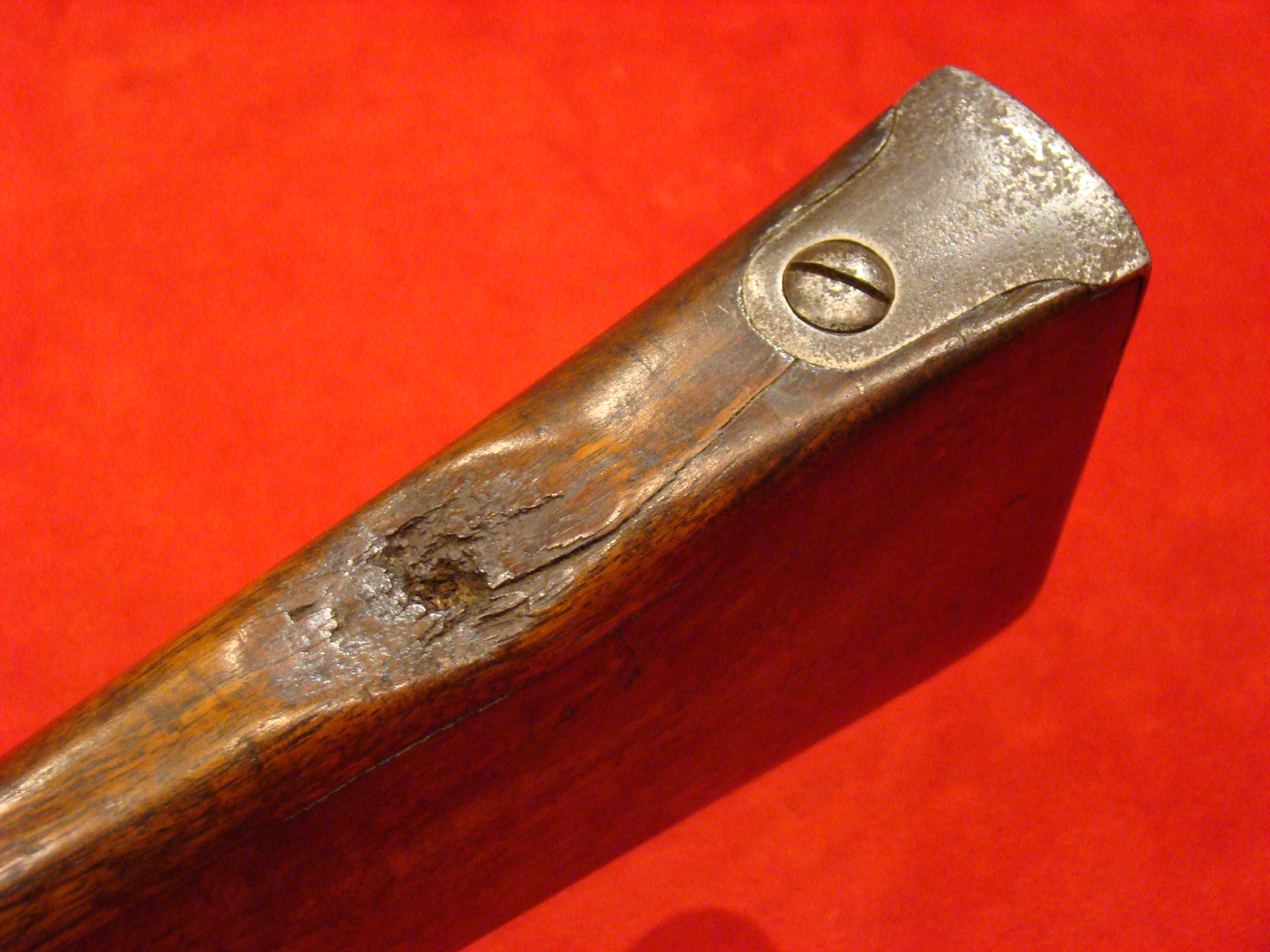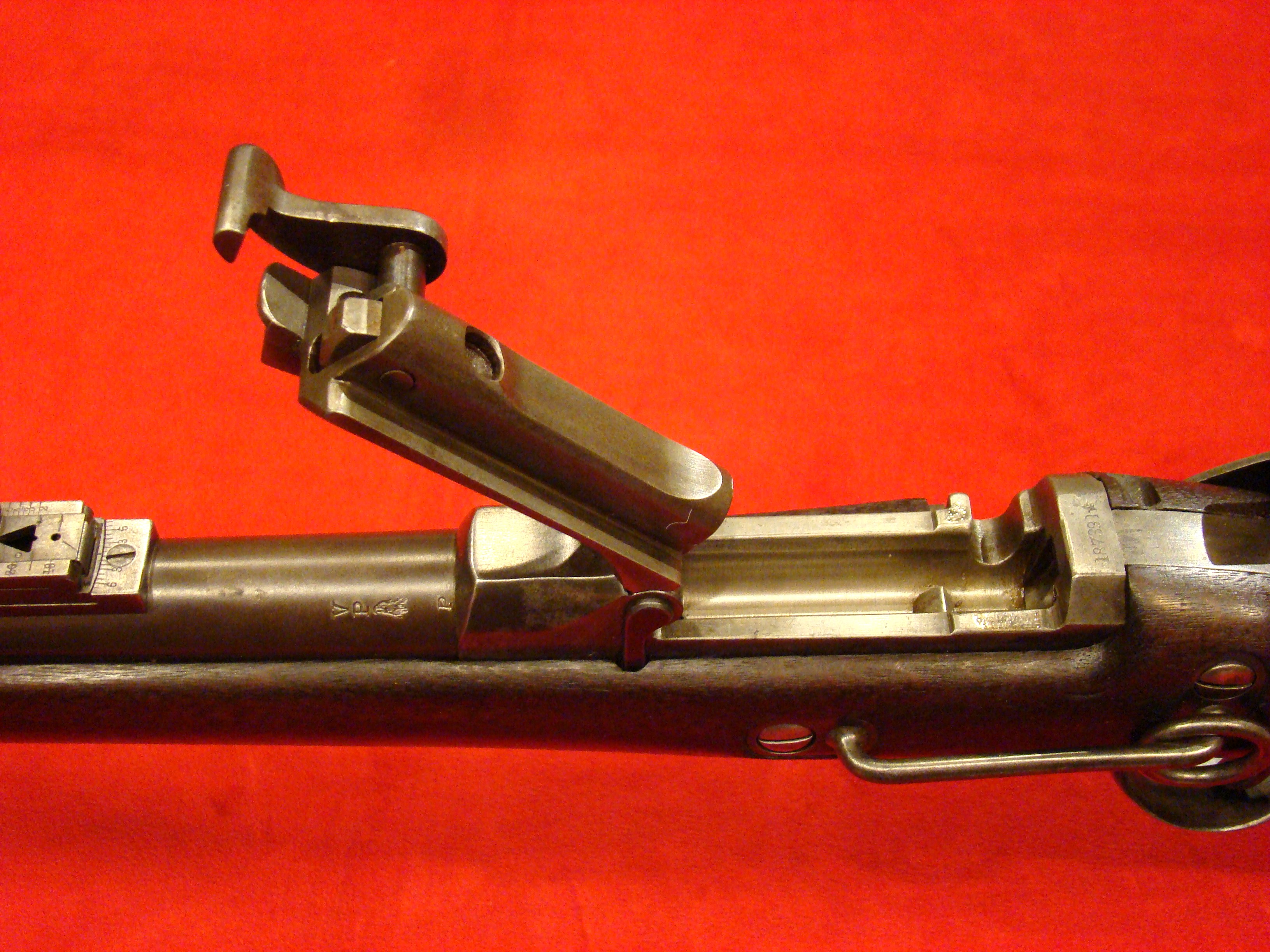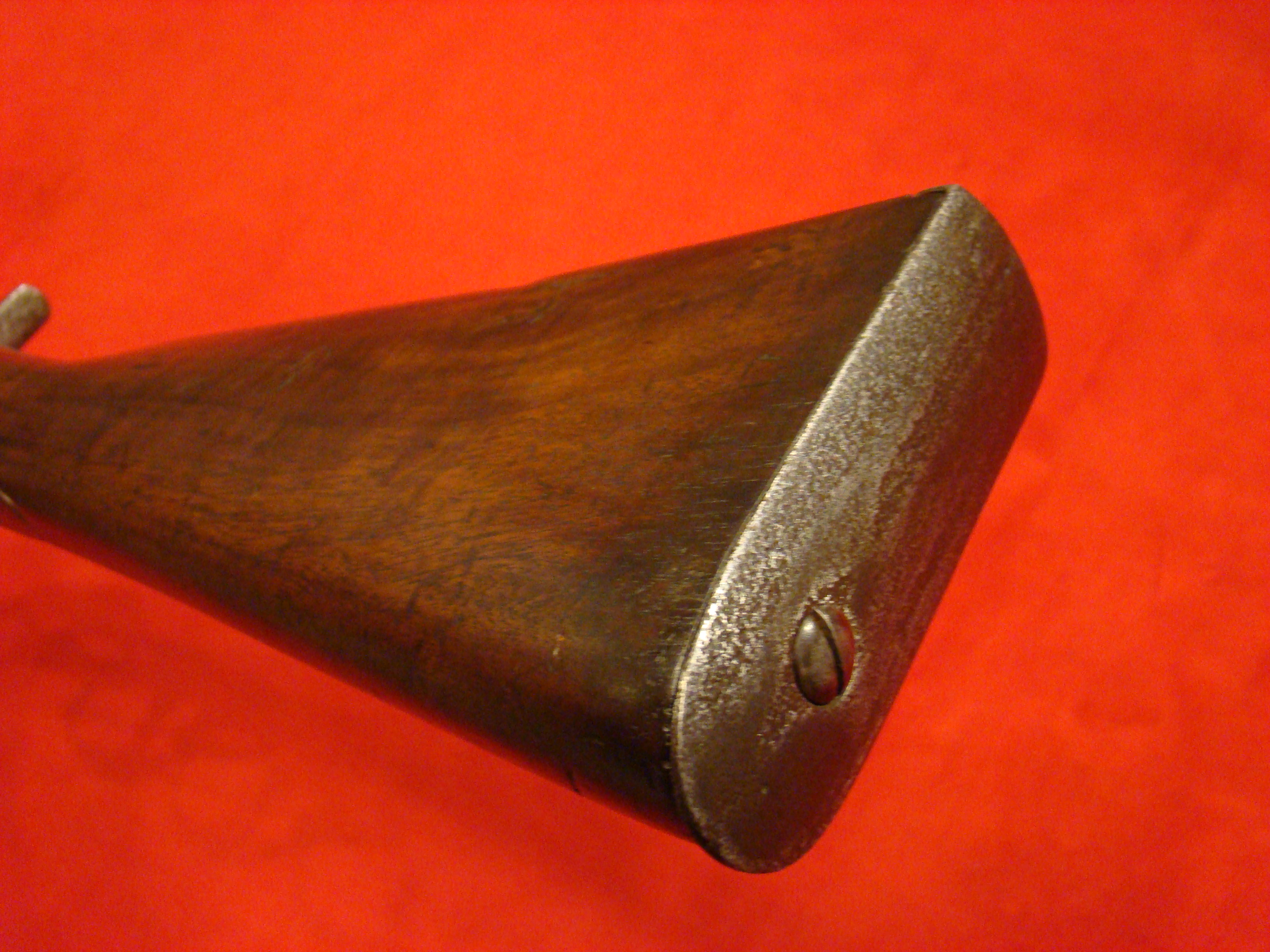 Great example. Serial # 11949. This carbine utilized a sliding breech that accomodated a rimfire cartridge. Smooth metal surfaces with a dark graying patina. Intact leather sleeve on the barrel. Long range sight present. Bore is dirty with well defined rifling. Stock shows combat wear but generally very good with missing wood repairs. Sling loop missing. $1850.00