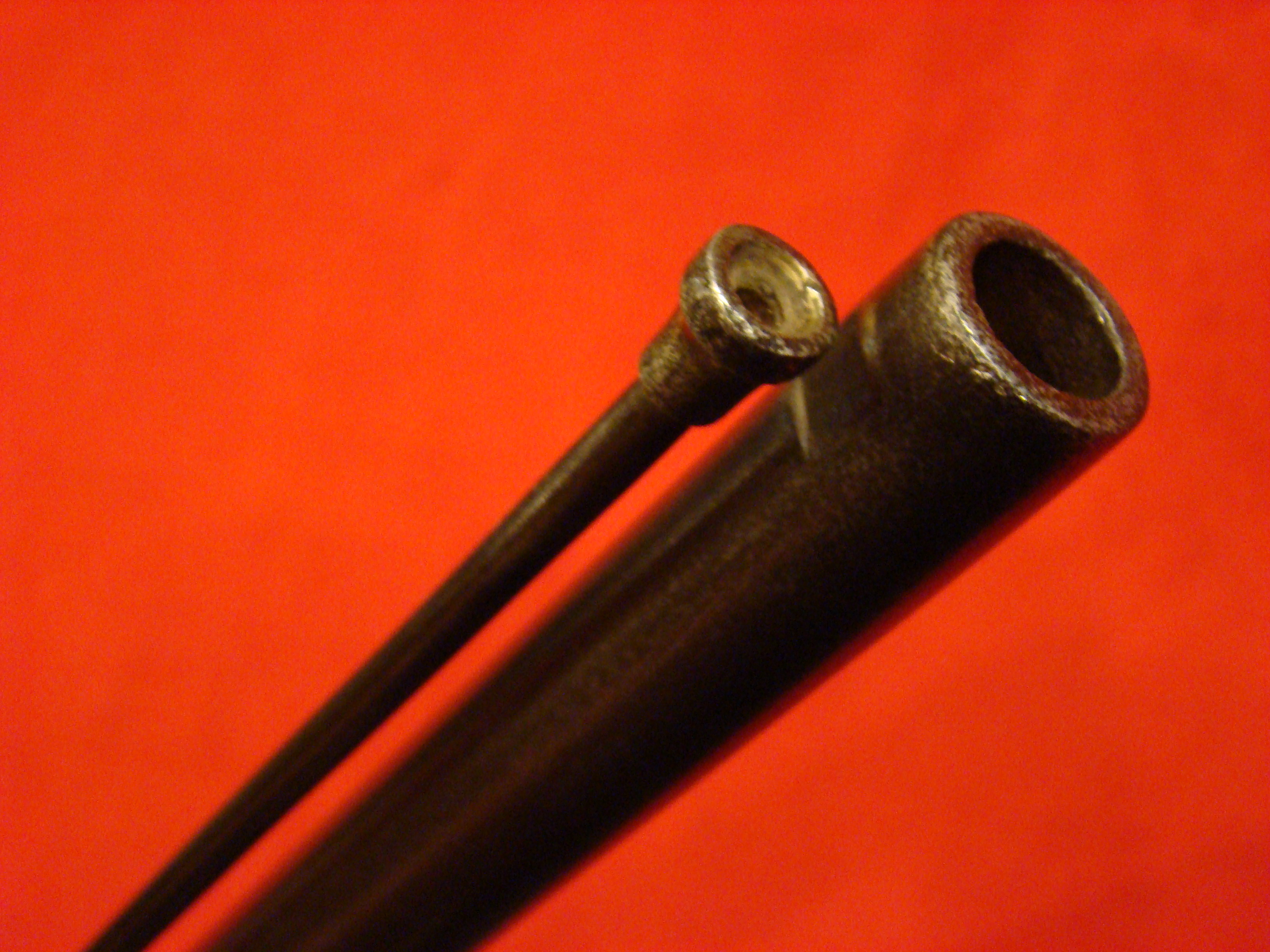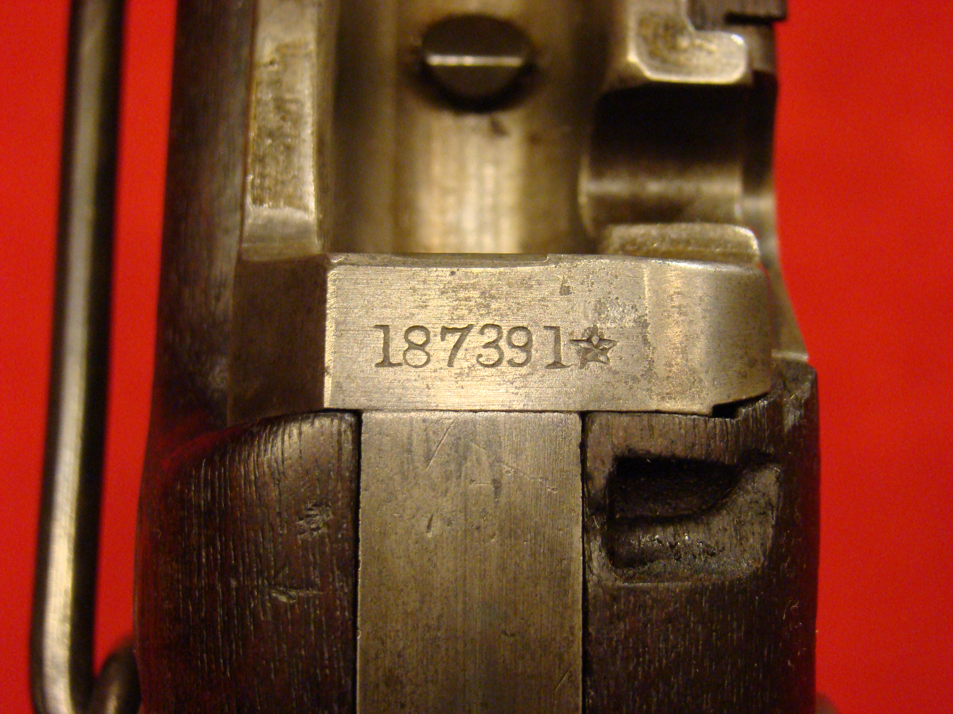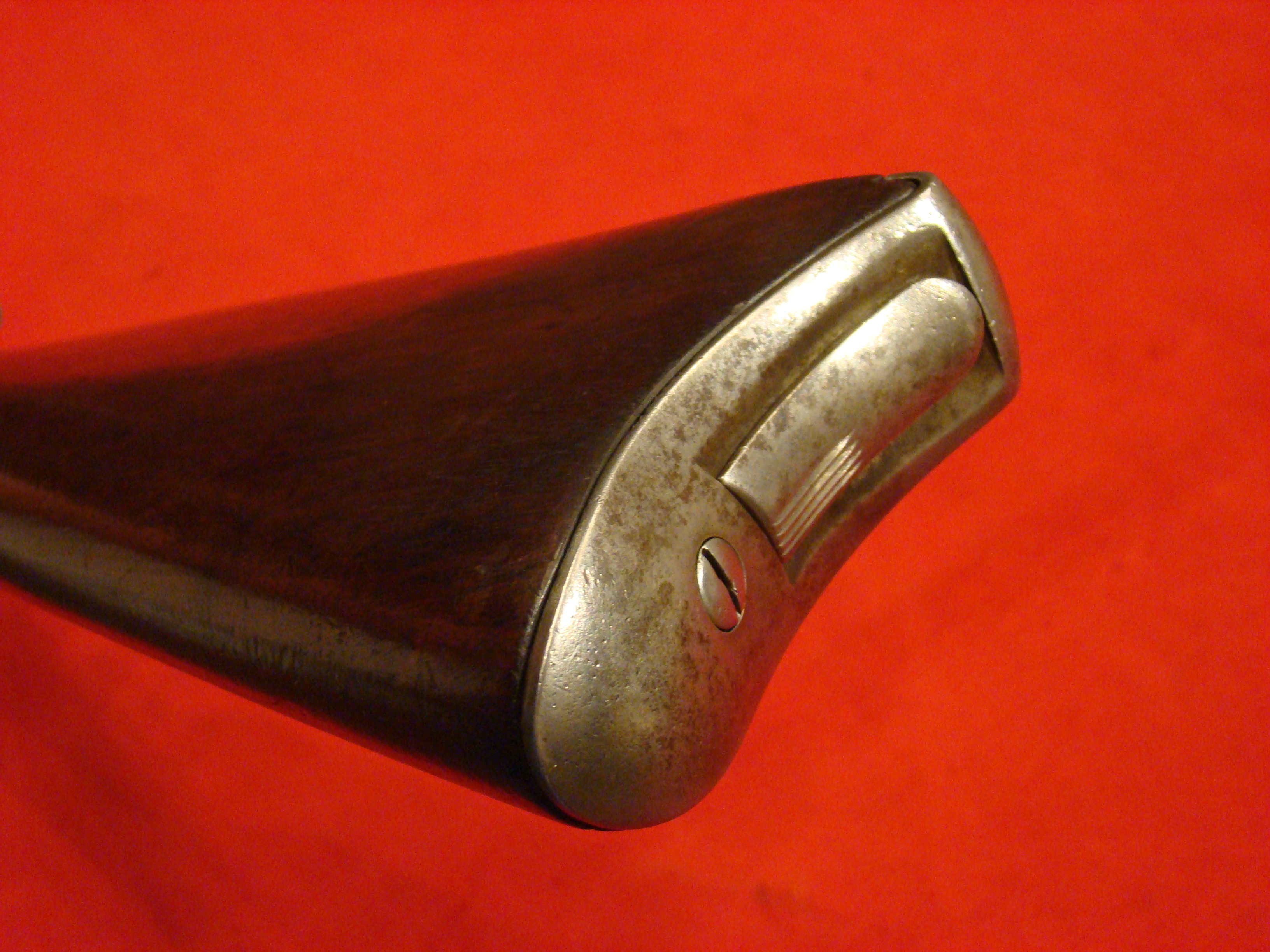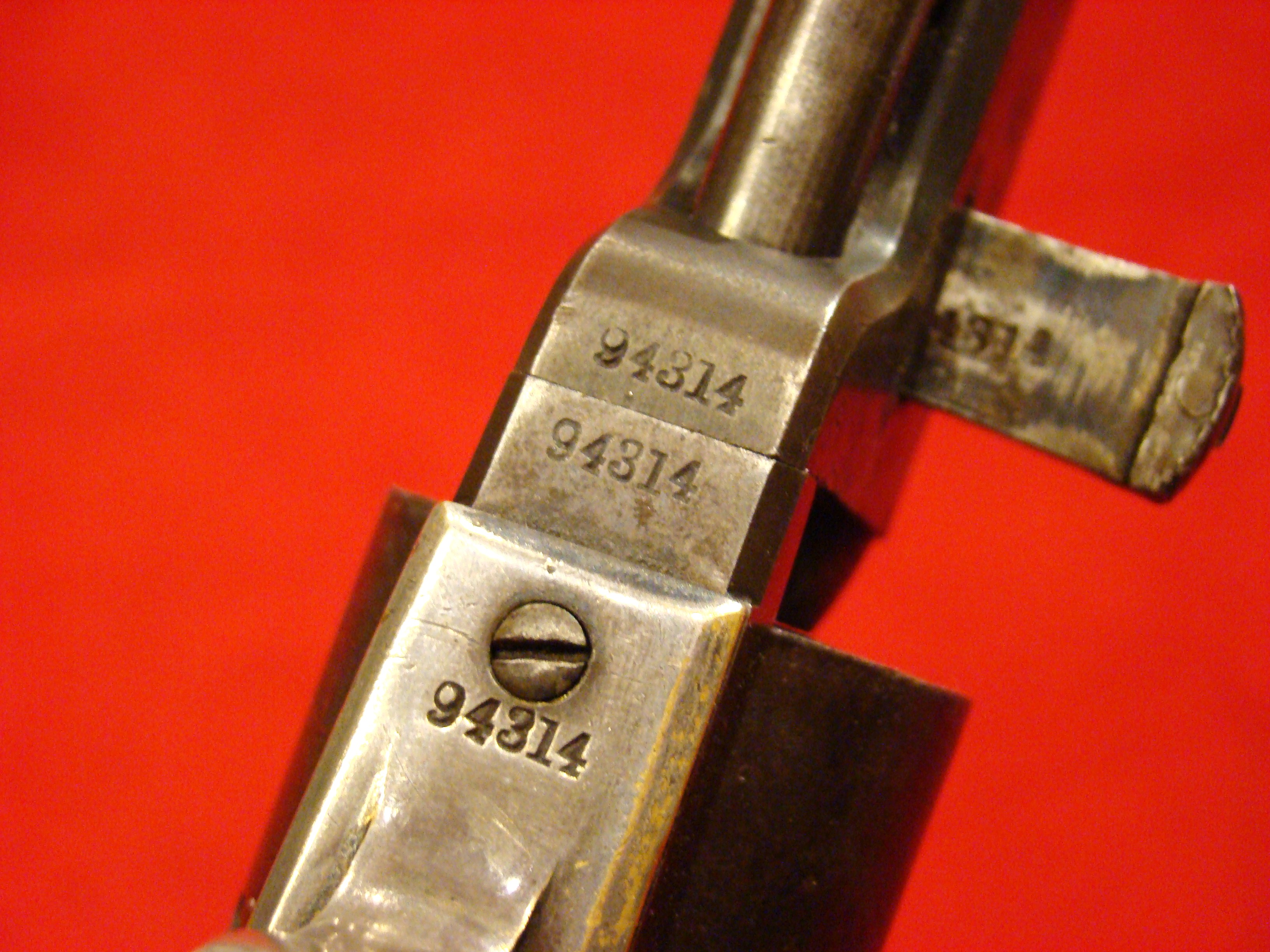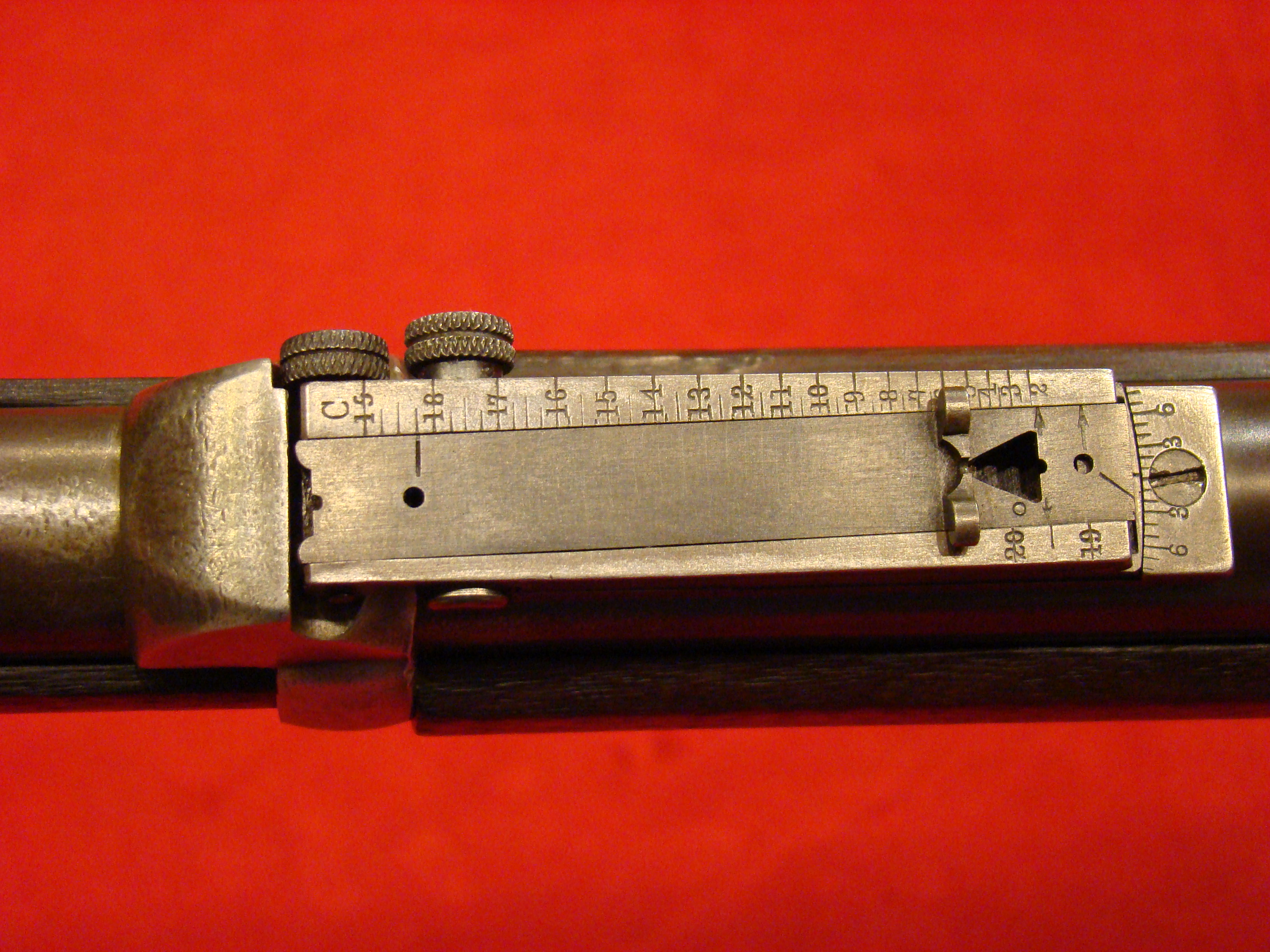 Great example. Serial # 11949. This carbine utilized a sliding breech that accomodated a rimfire cartridge. Smooth metal surfaces with a dark graying patina. Intact leather sleeve on the barrel. Long range sight present. Bore is dirty with well defined rifling. Stock shows combat wear but generally very good with missing wood repairs. Sling loop missing. $1850.00