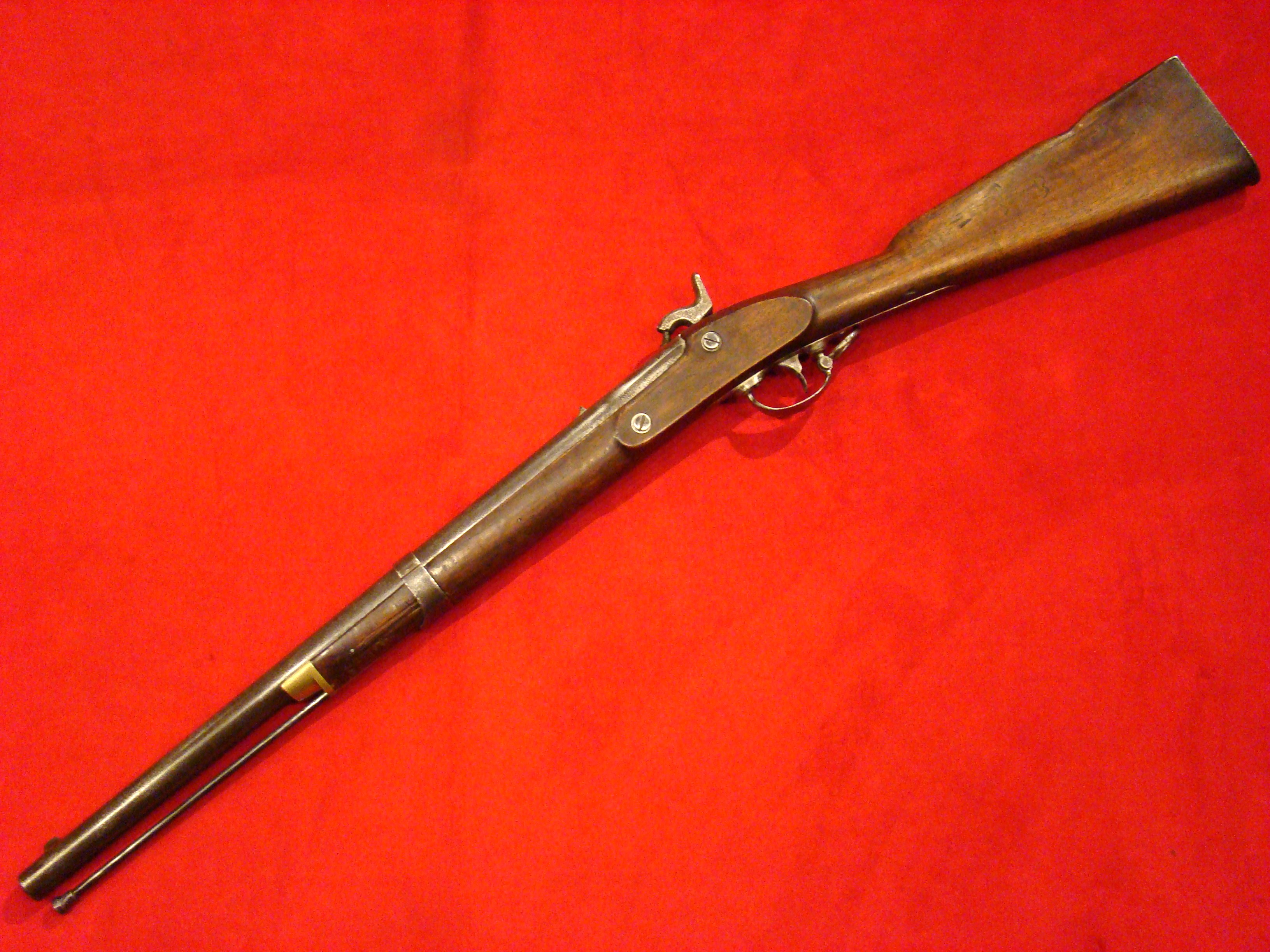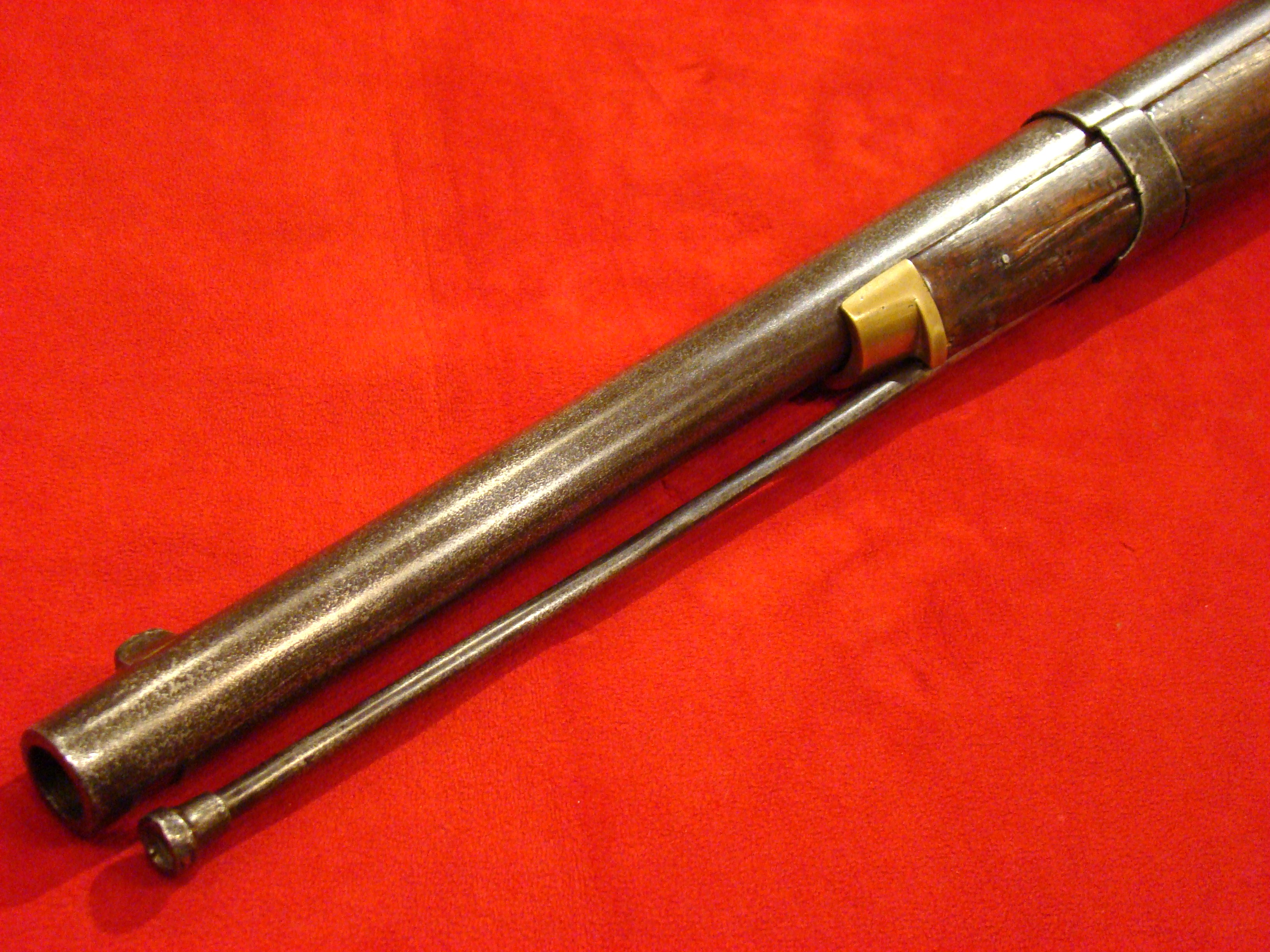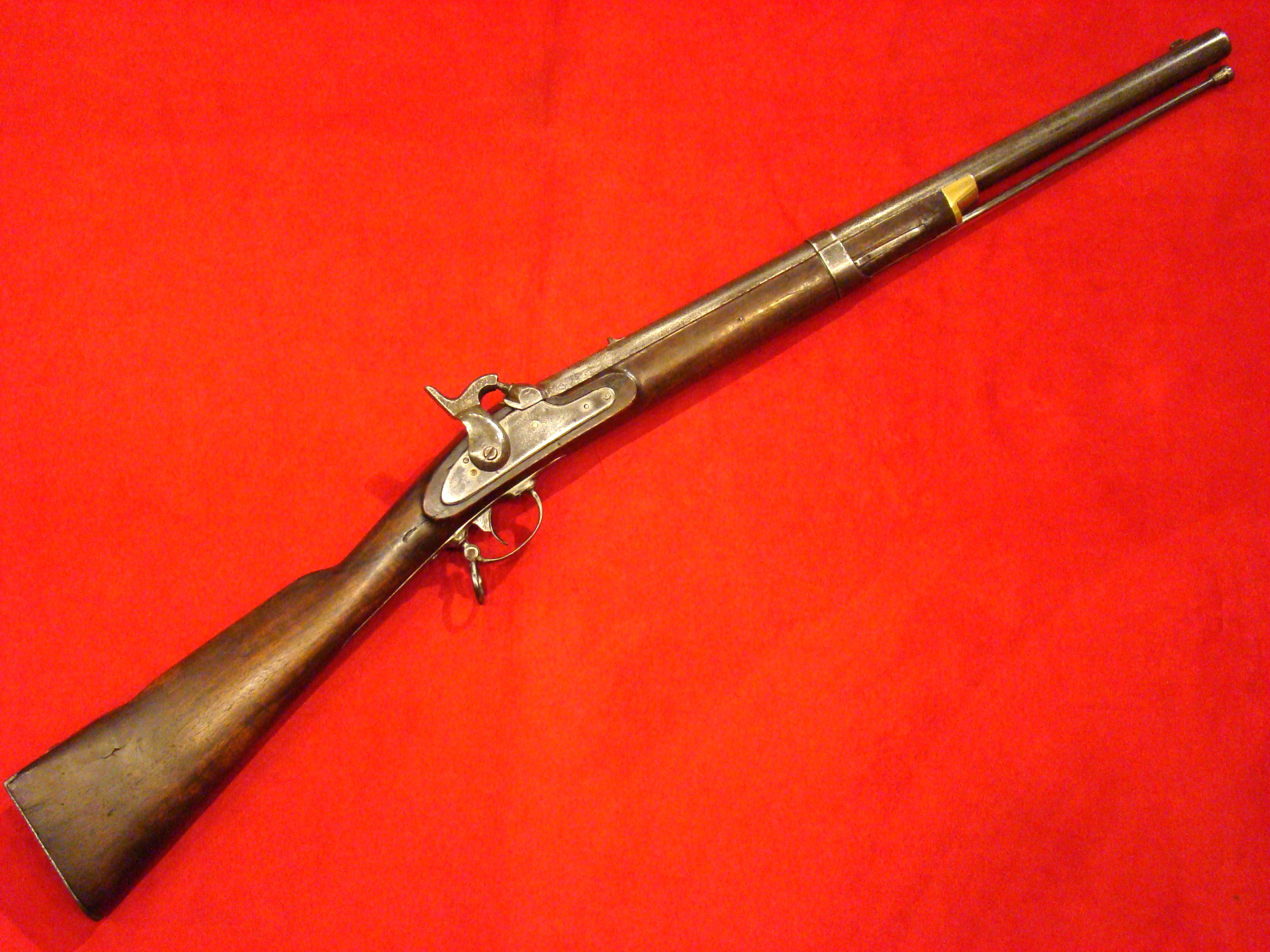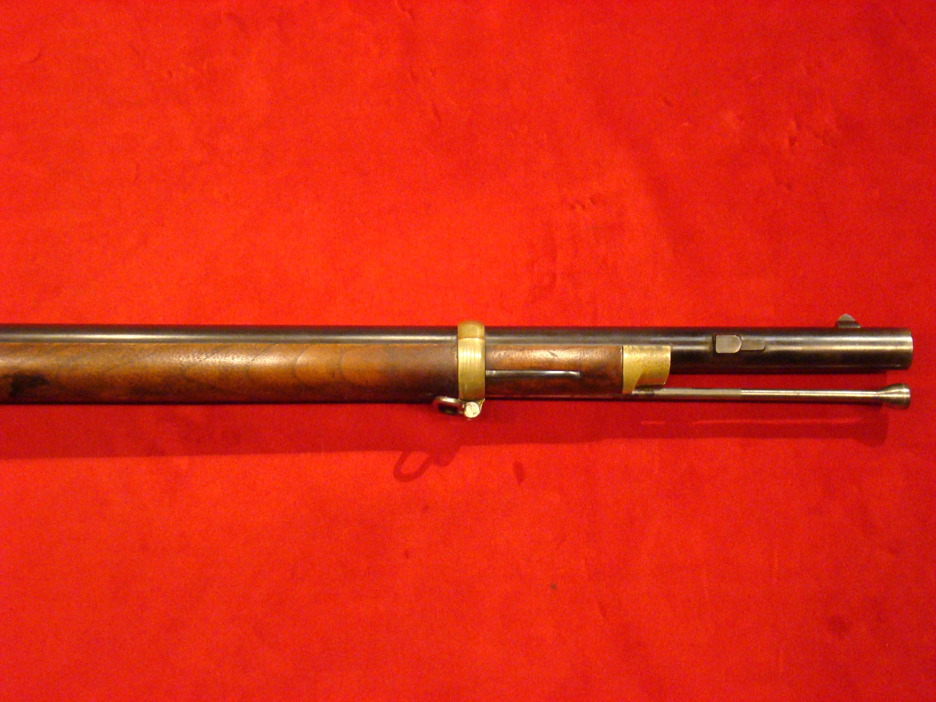 Very good condition. Also known as the “Kammer Karabiner”. These carbines were purchased by US and Confederate agents early in the war. The Confederacy produced large caliber ammunition for these guns, but mainly used buckshot. Untouched patina on all metal surfaces. Lock is marked with production date 852 (1852) and functions properly. Bore has 12 groove rifling and needs cleaning. Rear and front sights present. Stock is excellent with no cracks, repairs, or missing wood. There is a hole in the fore-stock to accommodate a ramrod.