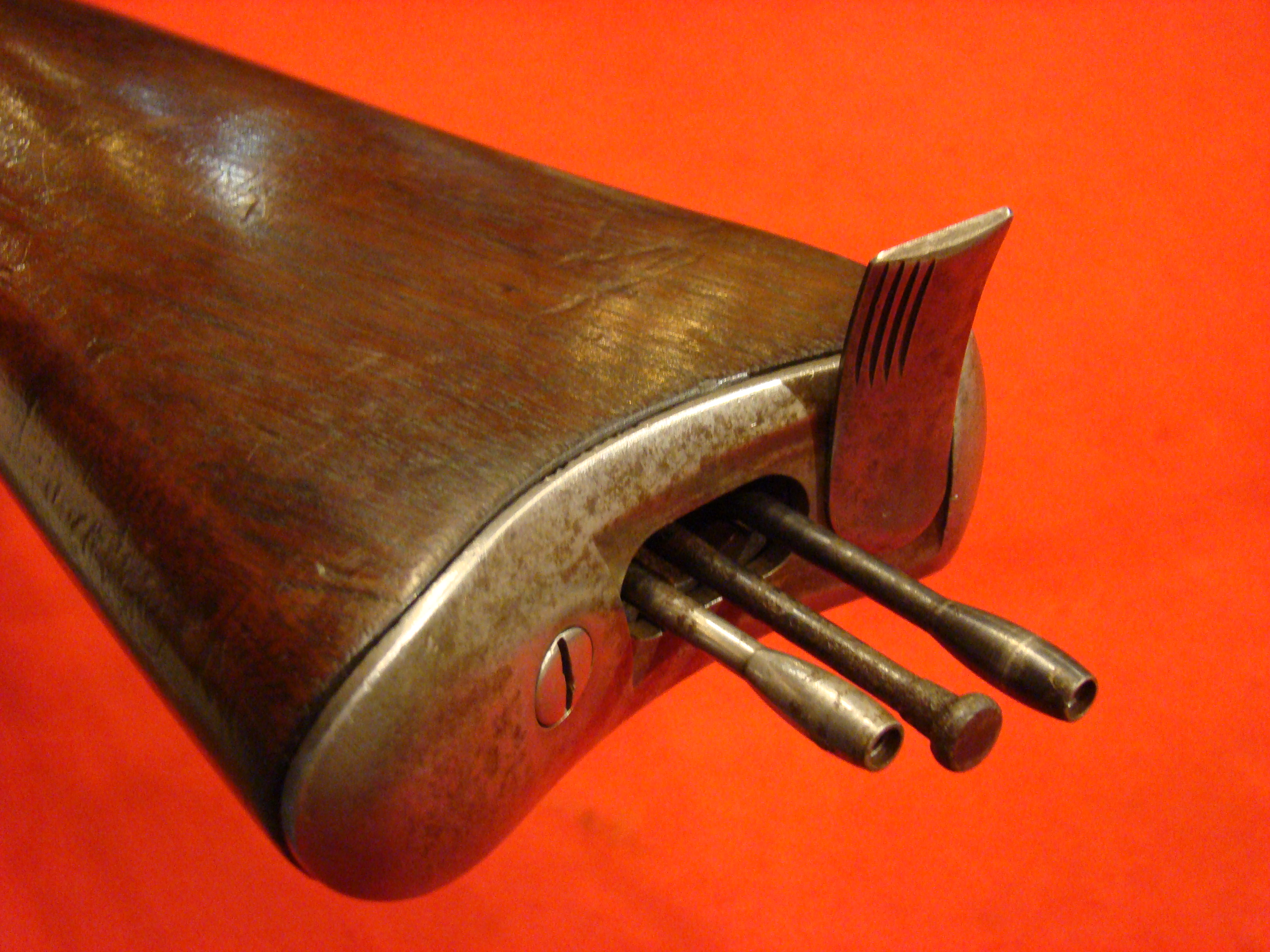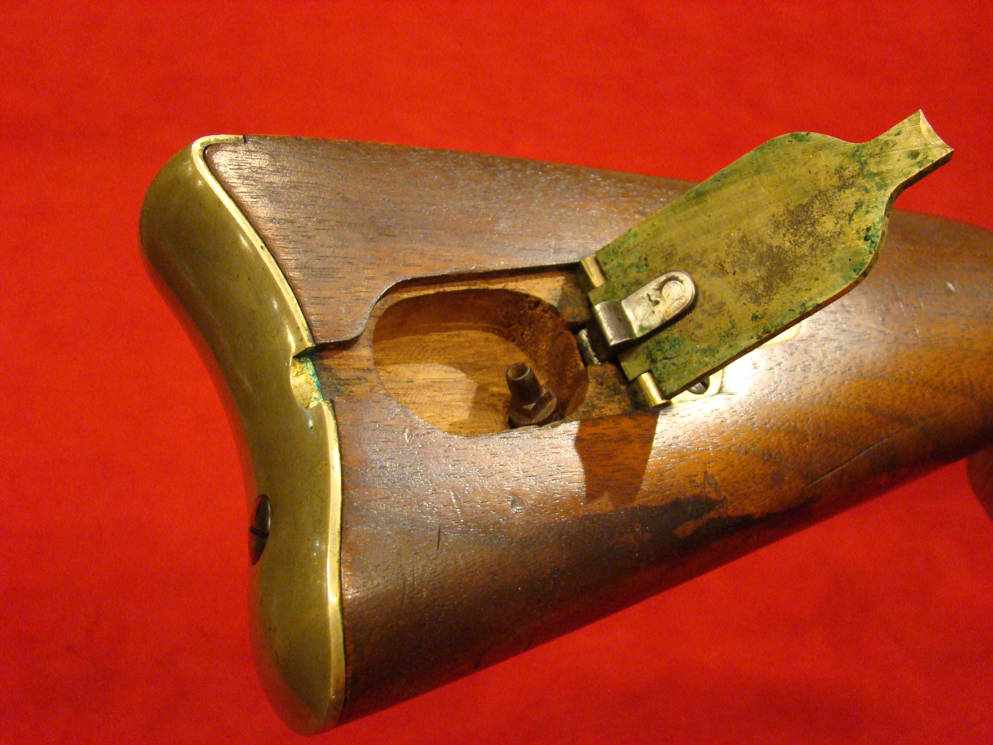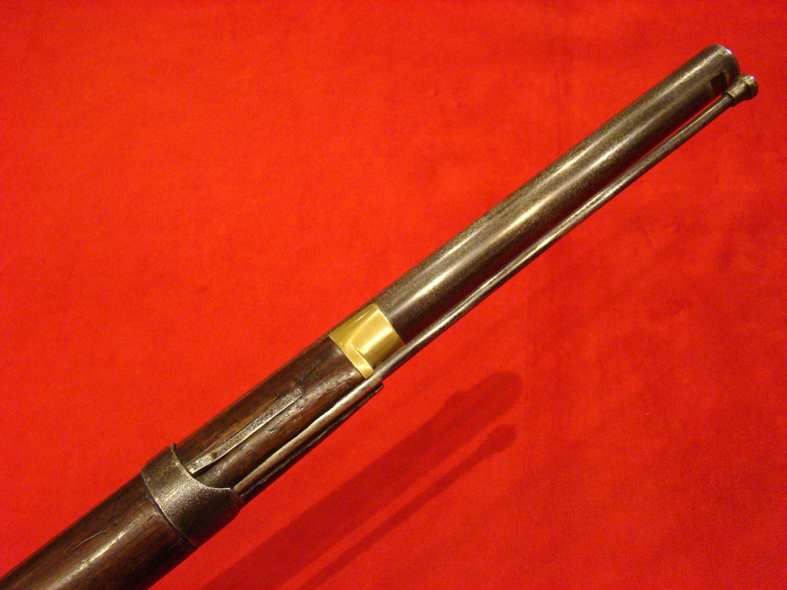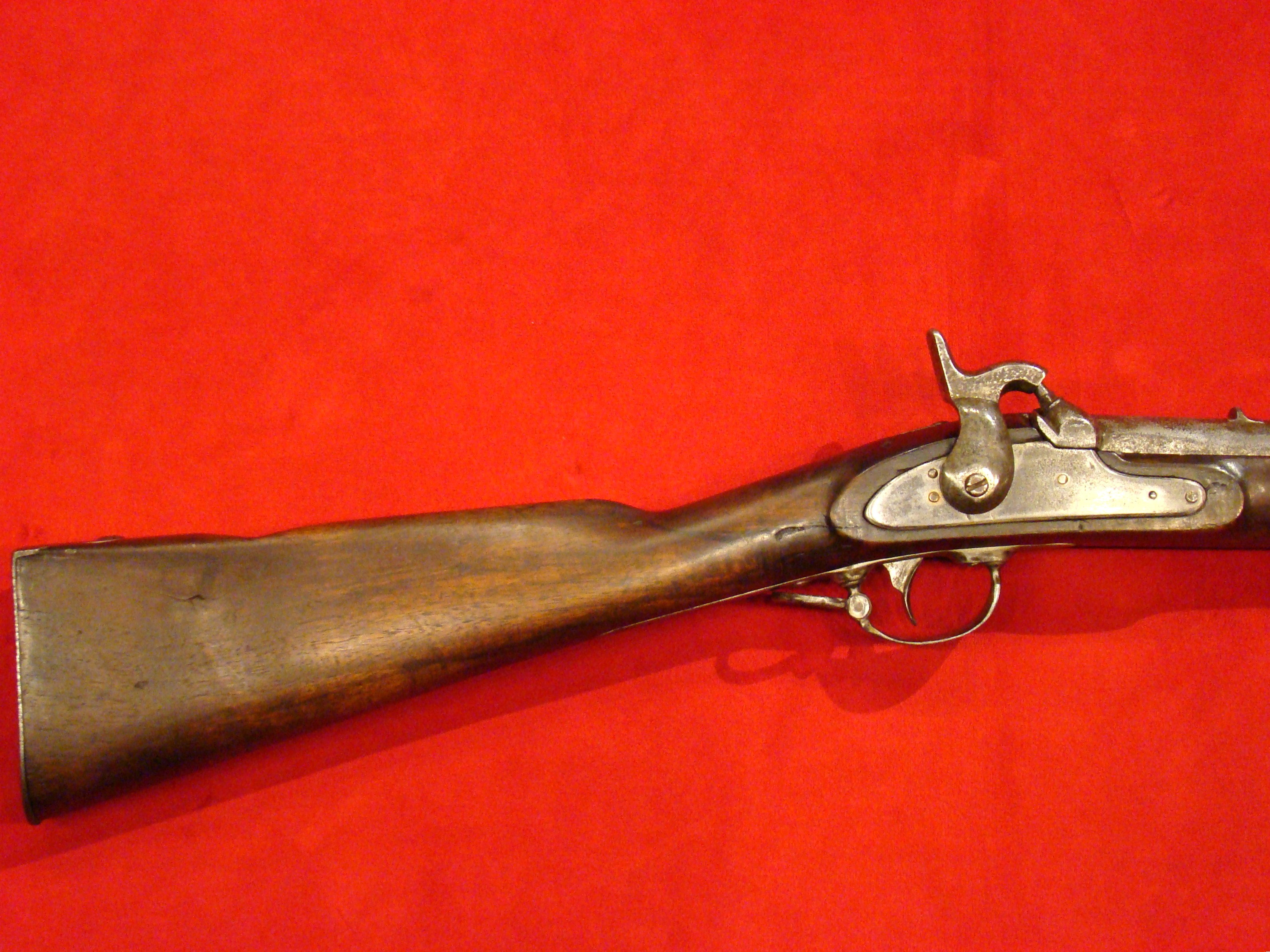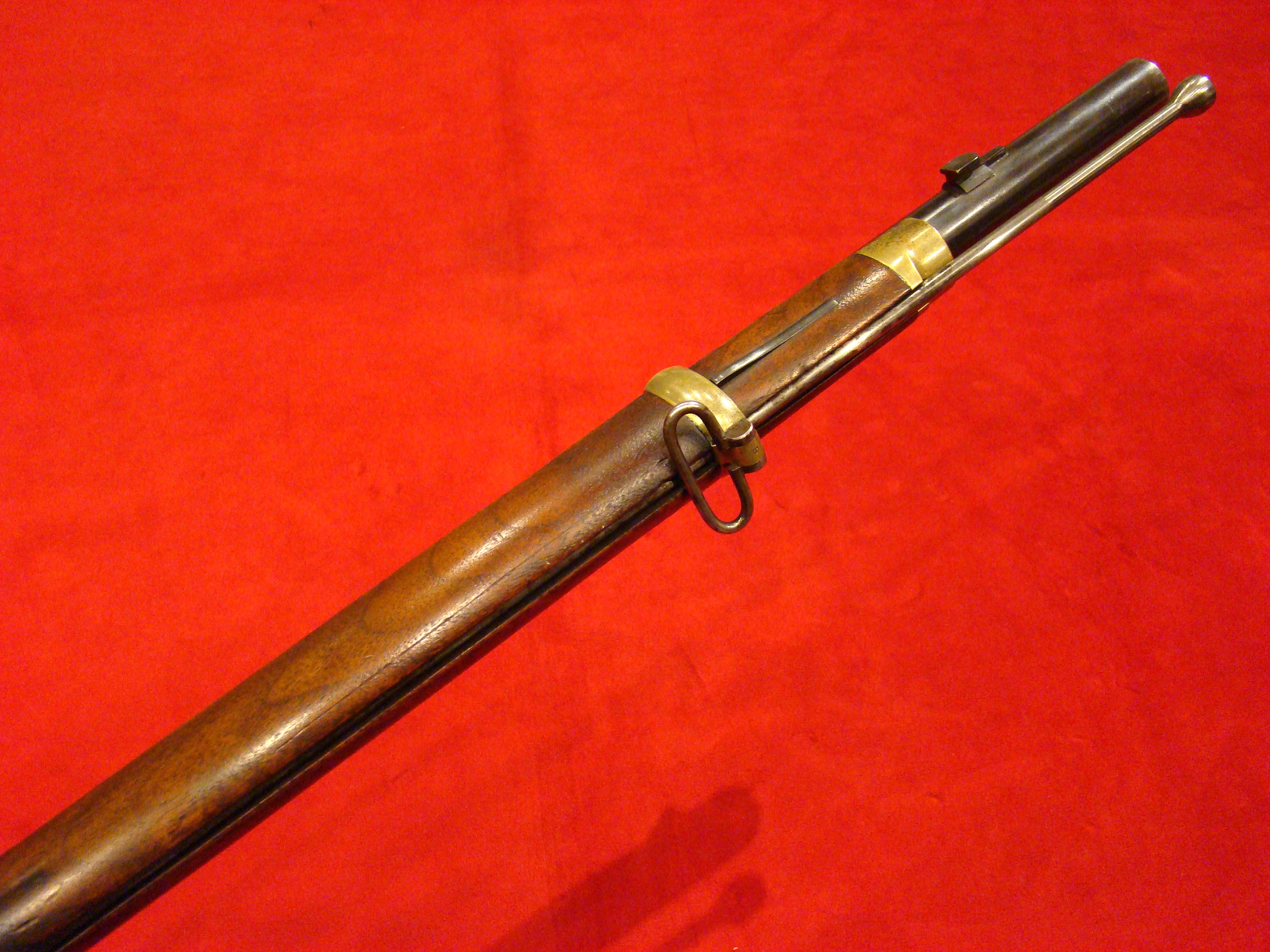 Very good condition. Also known as the “Kammer Karabiner”. These carbines were purchased by US and Confederate agents early in the war. The Confederacy produced large caliber ammunition for these guns, but mainly used buckshot. Untouched patina on all metal surfaces. Lock is marked with production date 852 (1852) and functions properly. Bore has 12 groove rifling and needs cleaning. Rear and front sights present. Stock is excellent with no cracks, repairs, or missing wood. There is a hole in the fore-stock to accommodate a ramrod.