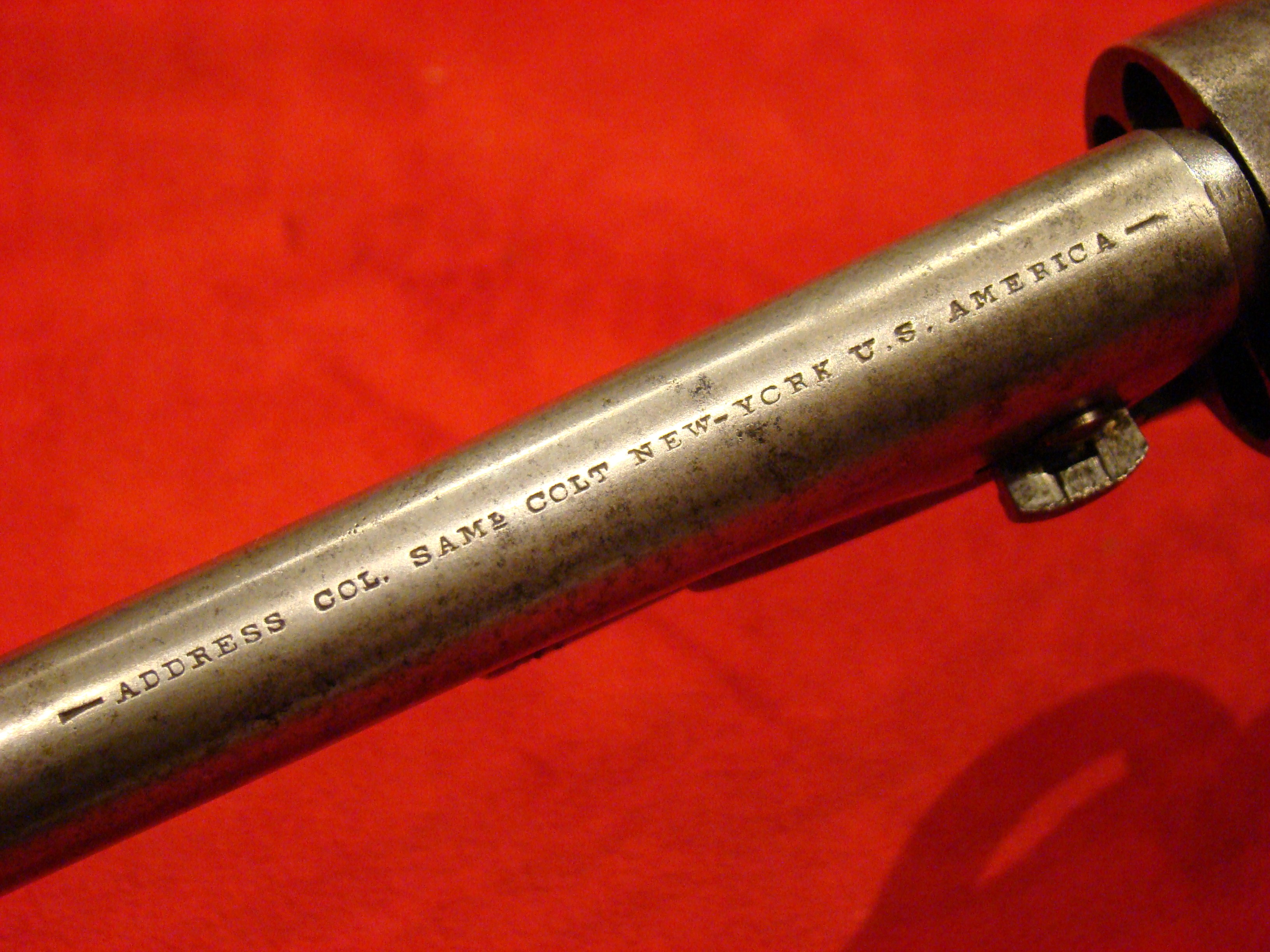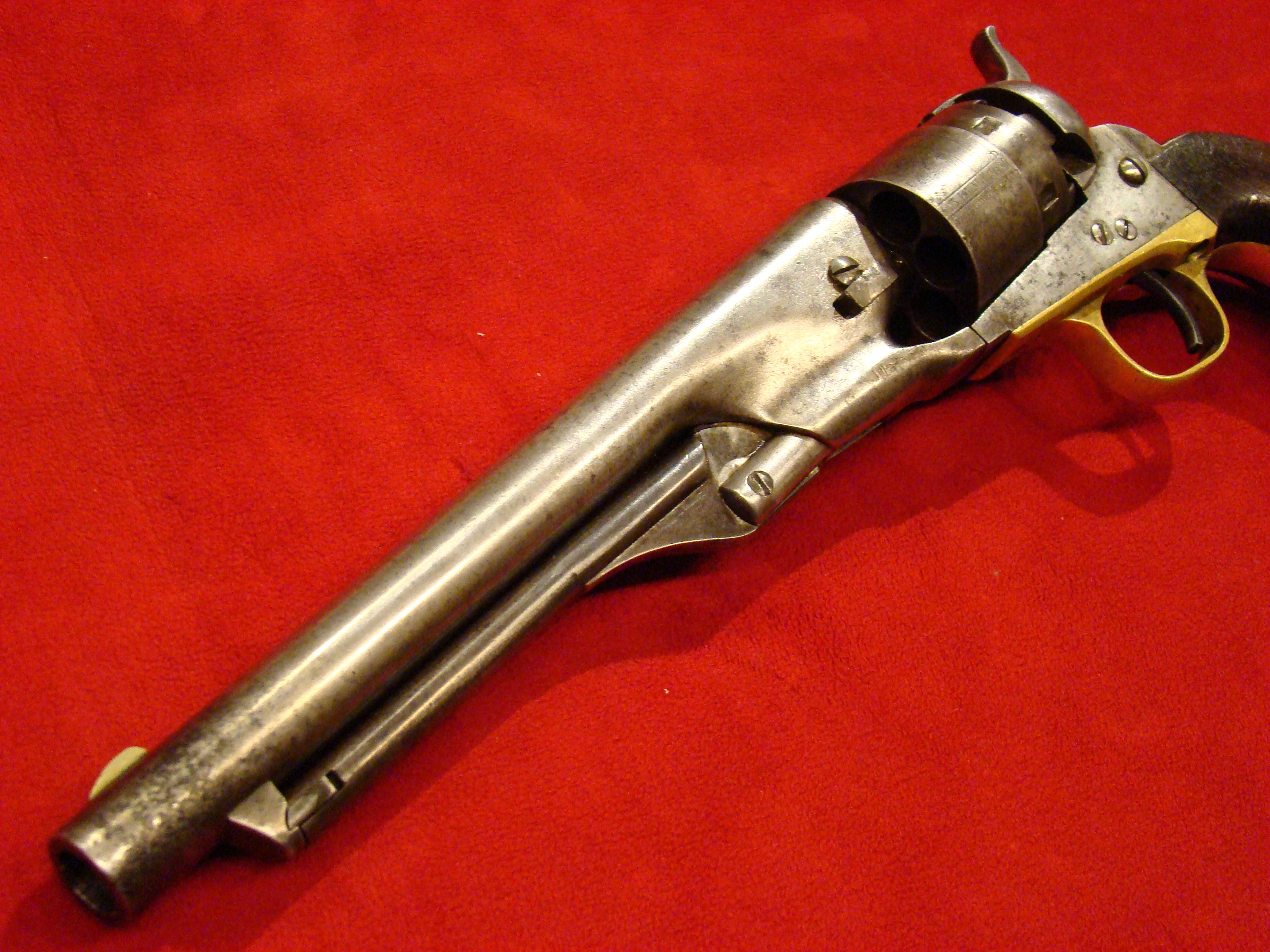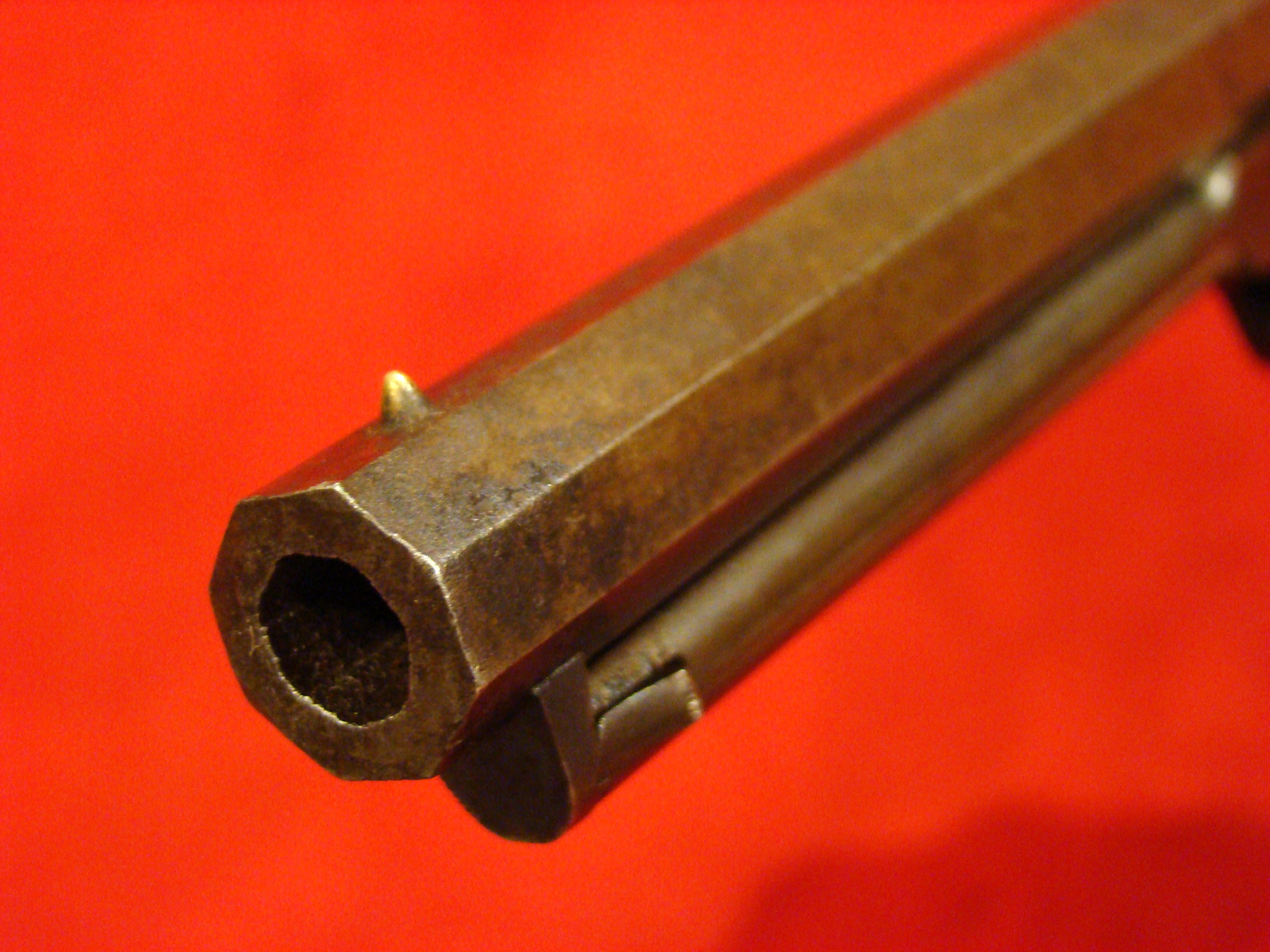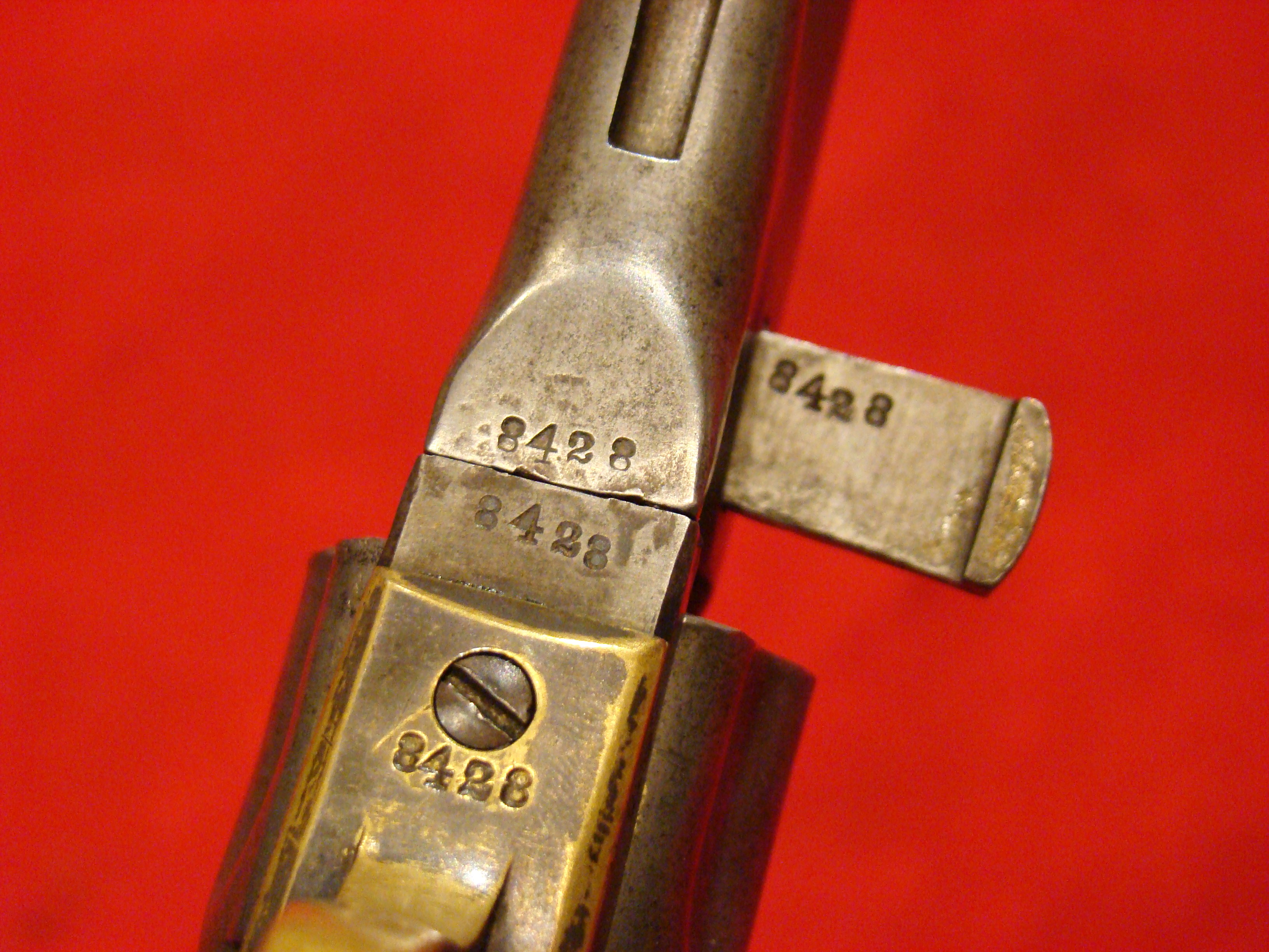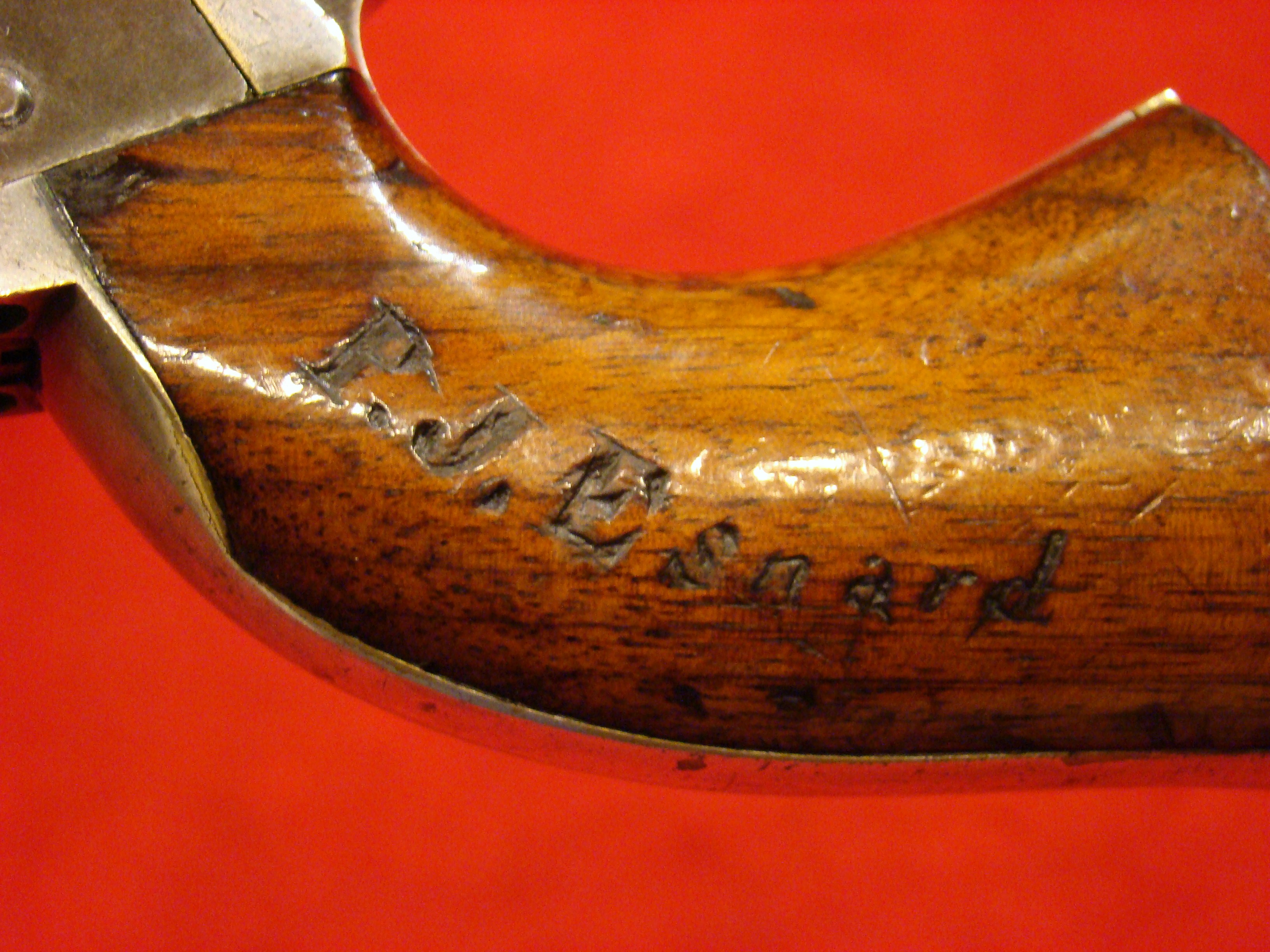 Relatively scarce handgun that enjoyed some popularity during the Civil War. 1858 production Serial# 902. A “Rocket Ball” self contained ammunition produced by Walter Hunt was used this pistol. The lever action mechanism was the pre-cursor to the Henry Rifle. All Volcanic Arms patents were purchased by Oliver Winchester, who subsequently started the New Haven Arms Co. Condition is very good with some factory blue finish on the barrel. “NEW HAVEN CONN. PAT. FEB. 14-1854” address present but a little weak. No oxidation or pitting. Lever action and trigger mechanism functions properly. Bore clean with strong rifling. Brass frame has a nice mustard colored patina with foliate scroll engraving throughout. The grips have a crack that runs along the grain. They retain the original factory varnish and are each serial numbered 902.