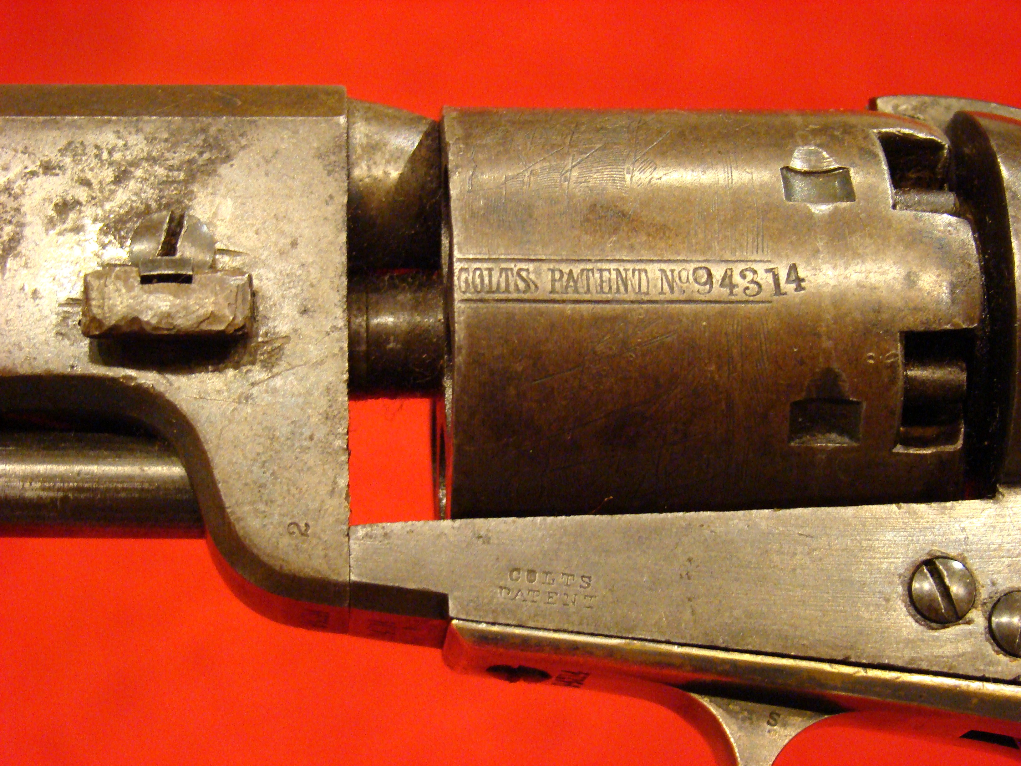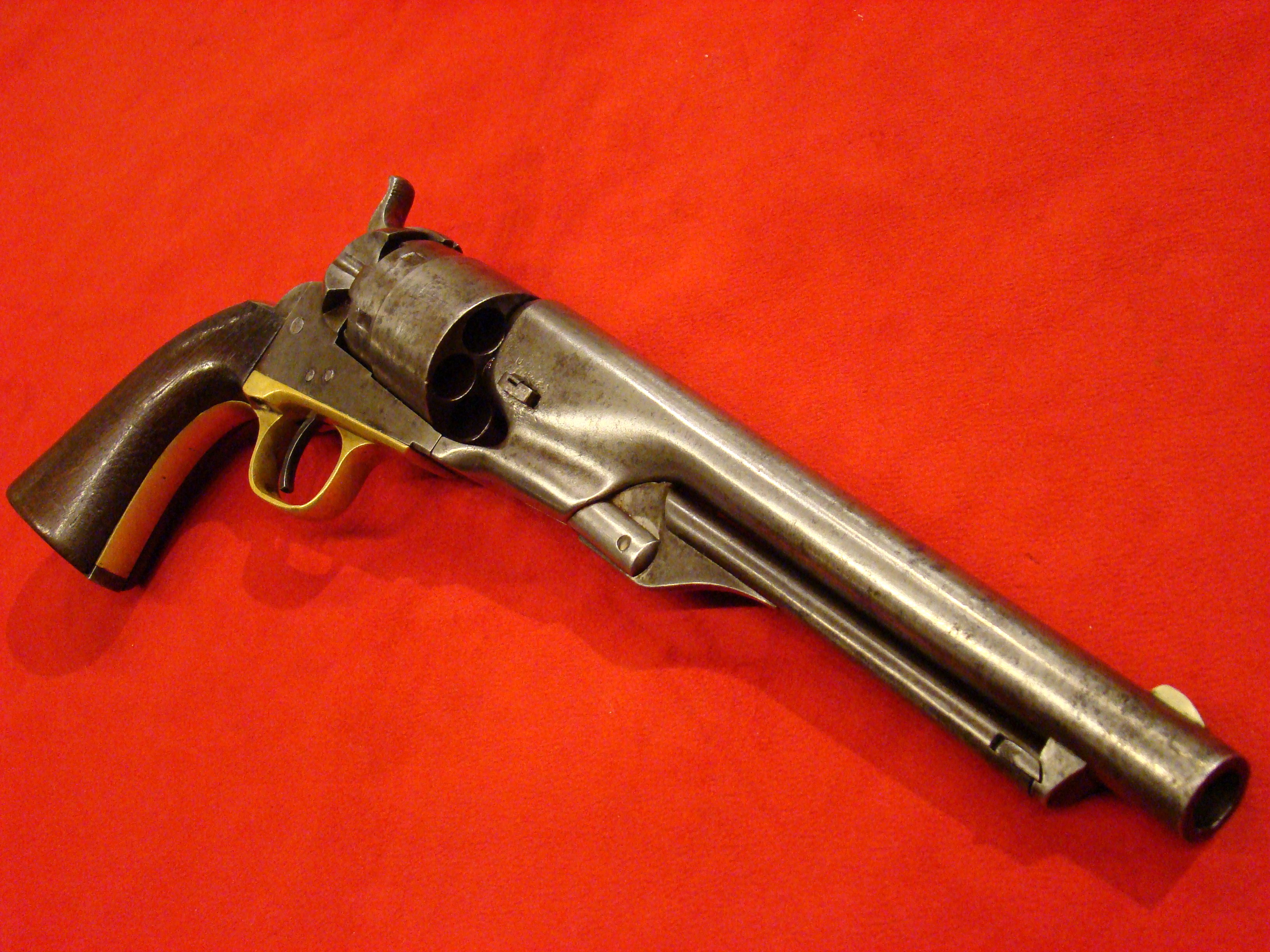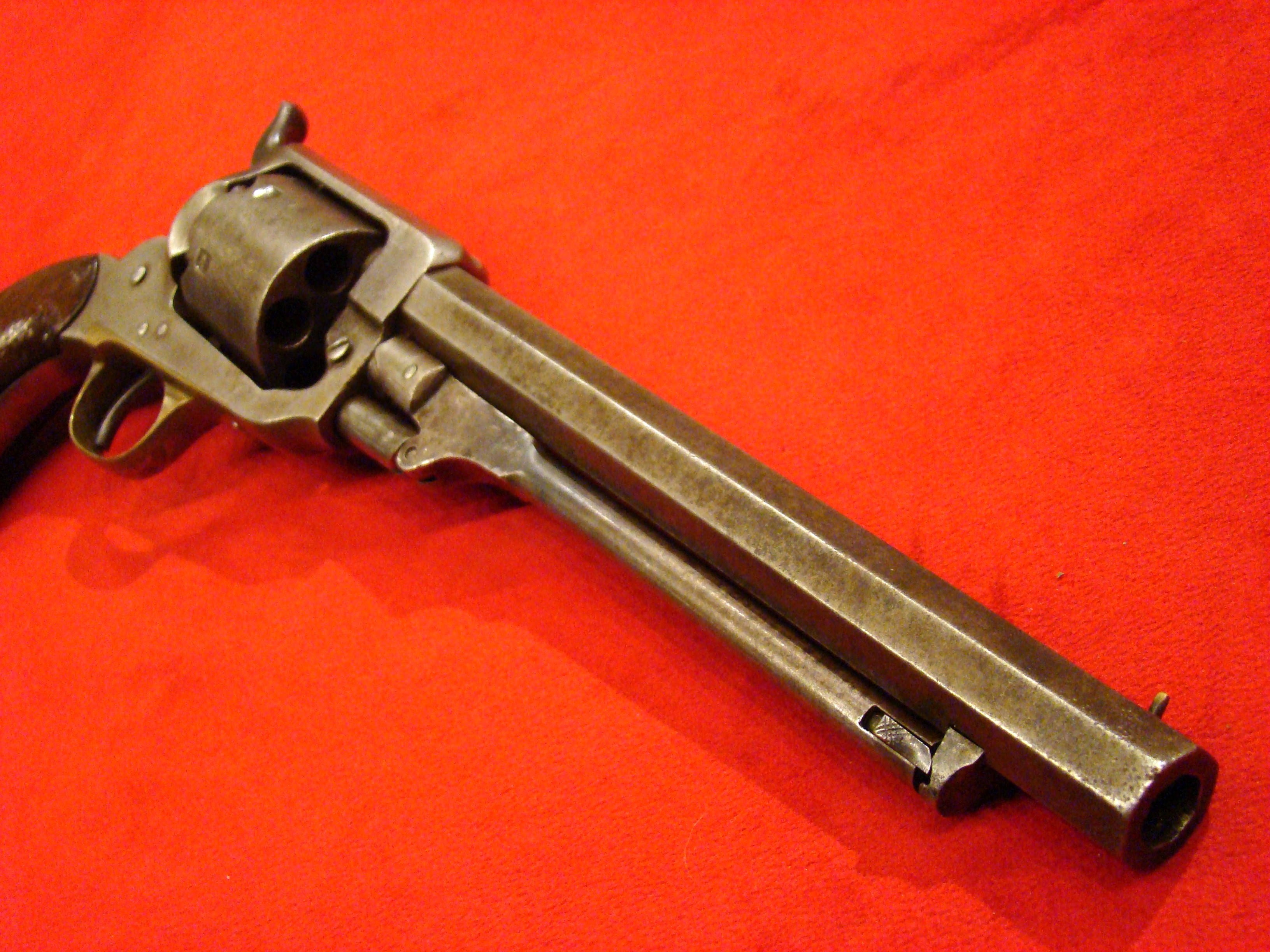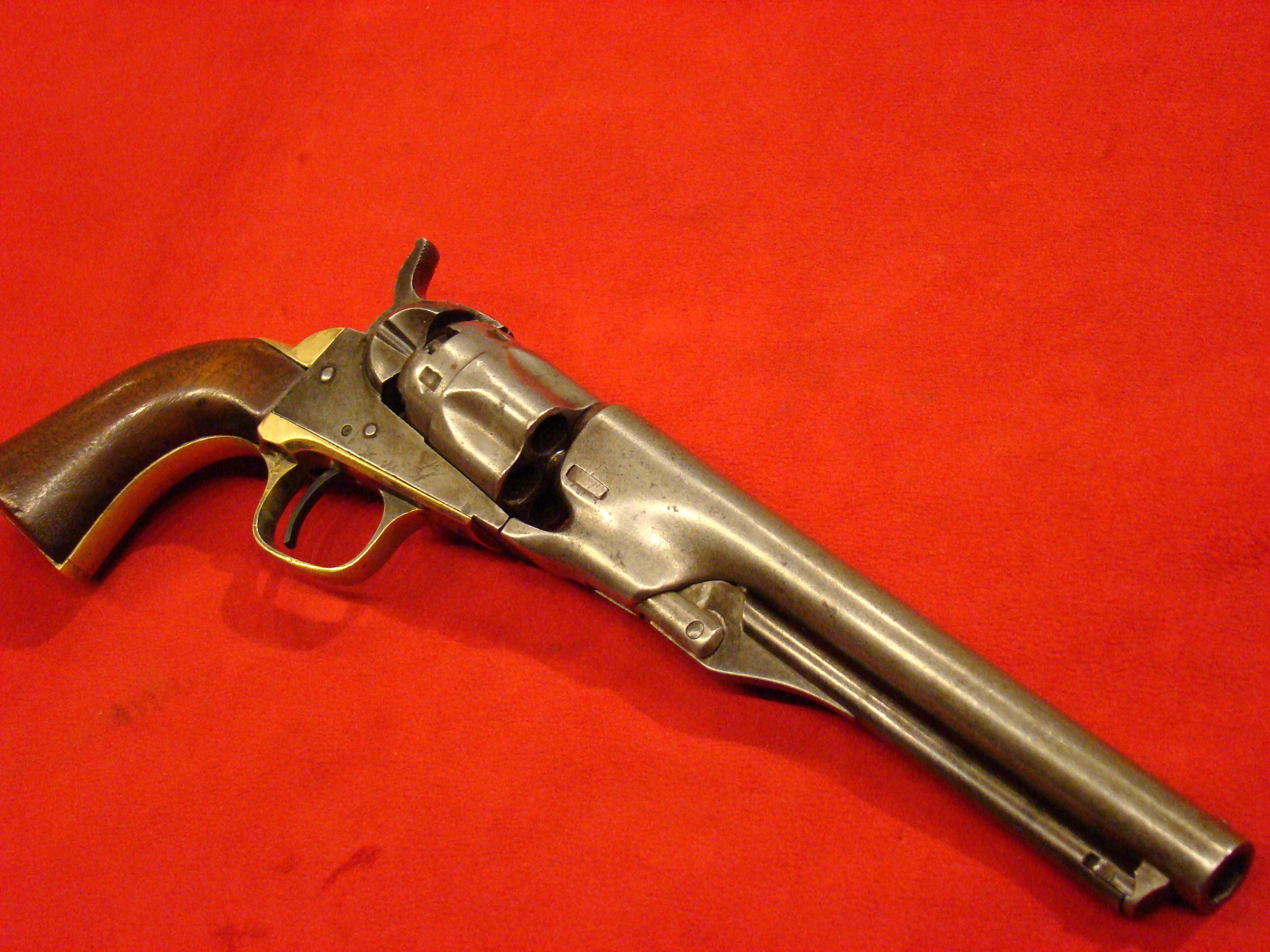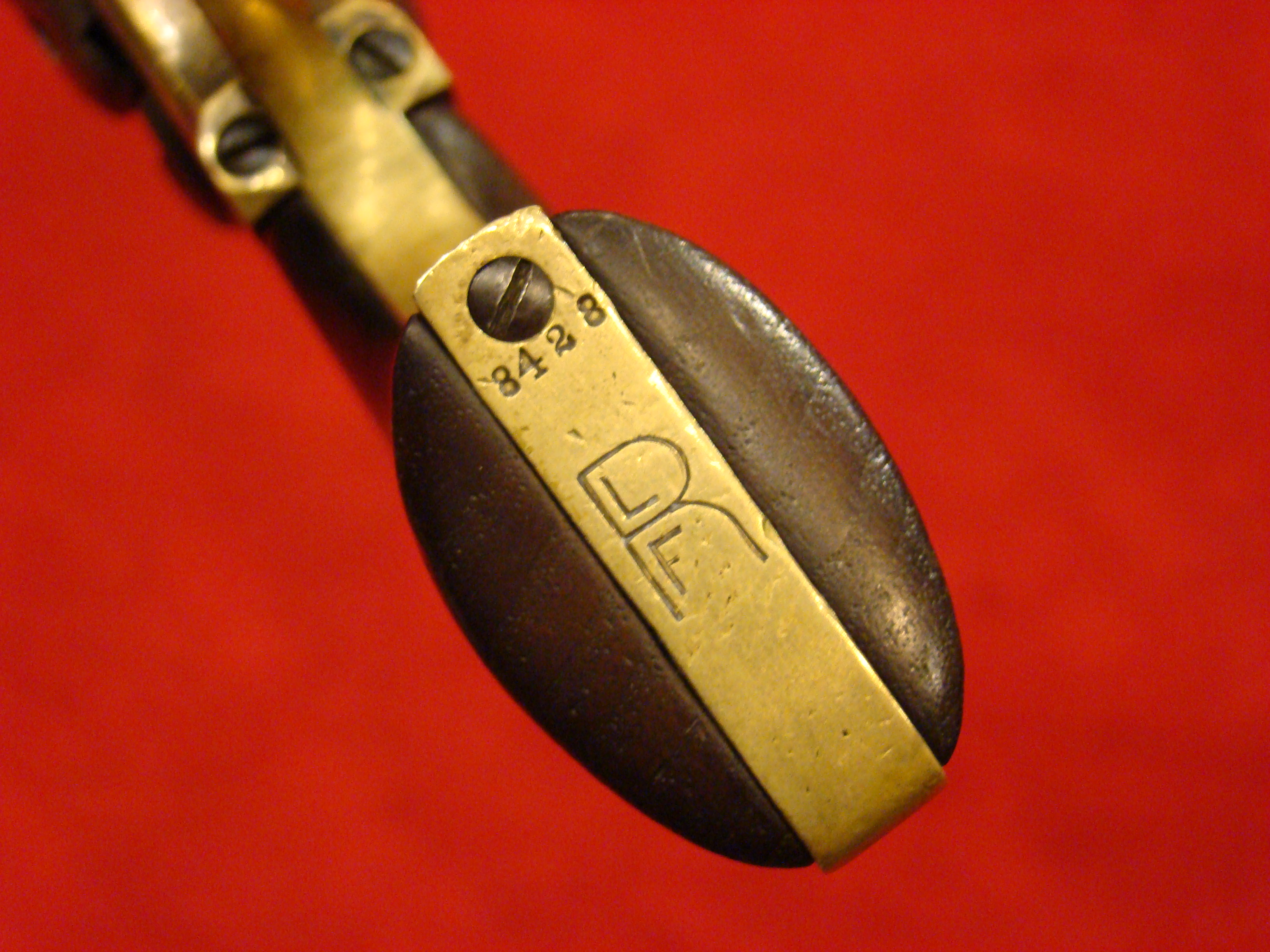 Relatively scarce handgun that enjoyed some popularity during the Civil War. 1858 production Serial# 902. A “Rocket Ball” self contained ammunition produced by Walter Hunt was used this pistol. The lever action mechanism was the pre-cursor to the Henry Rifle. All Volcanic Arms patents were purchased by Oliver Winchester, who subsequently started the New Haven Arms Co. Condition is very good with some factory blue finish on the barrel. “NEW HAVEN CONN. PAT. FEB. 14-1854” address present but a little weak. No oxidation or pitting. Lever action and trigger mechanism functions properly. Bore clean with strong rifling. Brass frame has a nice mustard colored patina with foliate scroll engraving throughout. The grips have a crack that runs along the grain. They retain the original factory varnish and are each serial numbered 902.