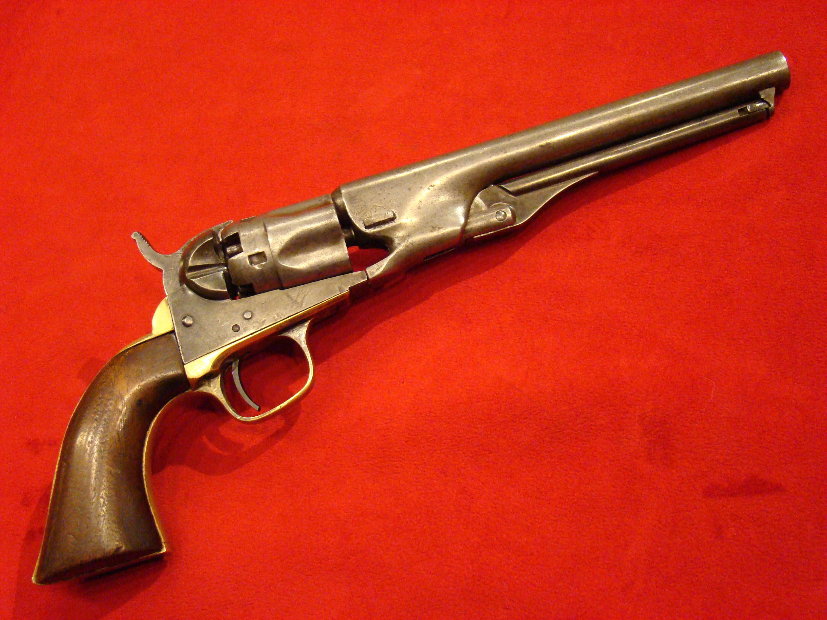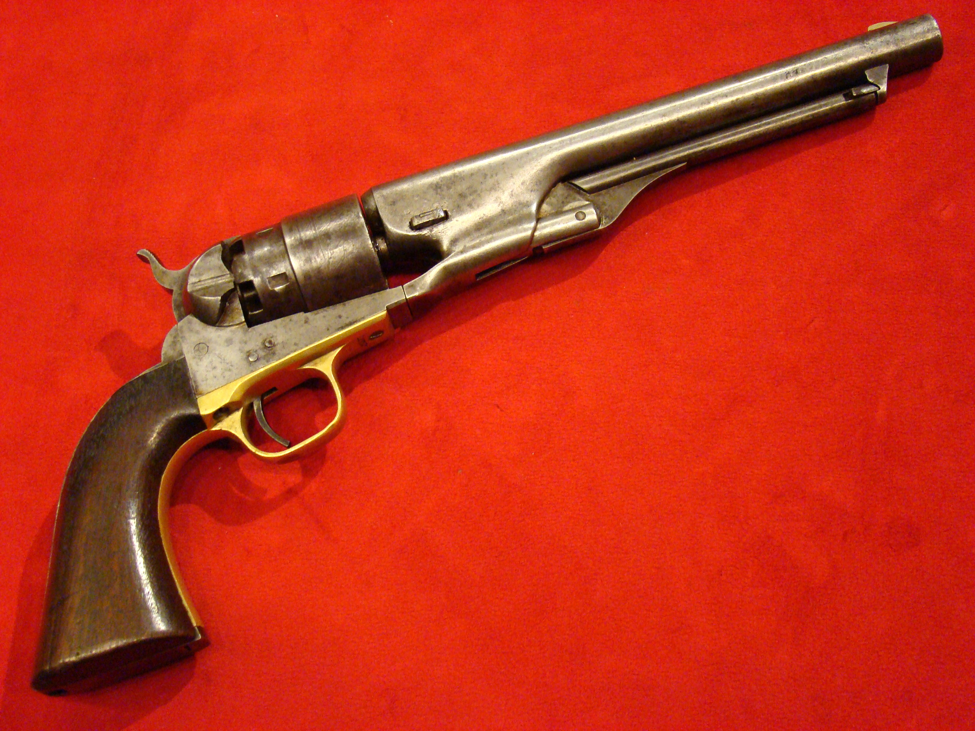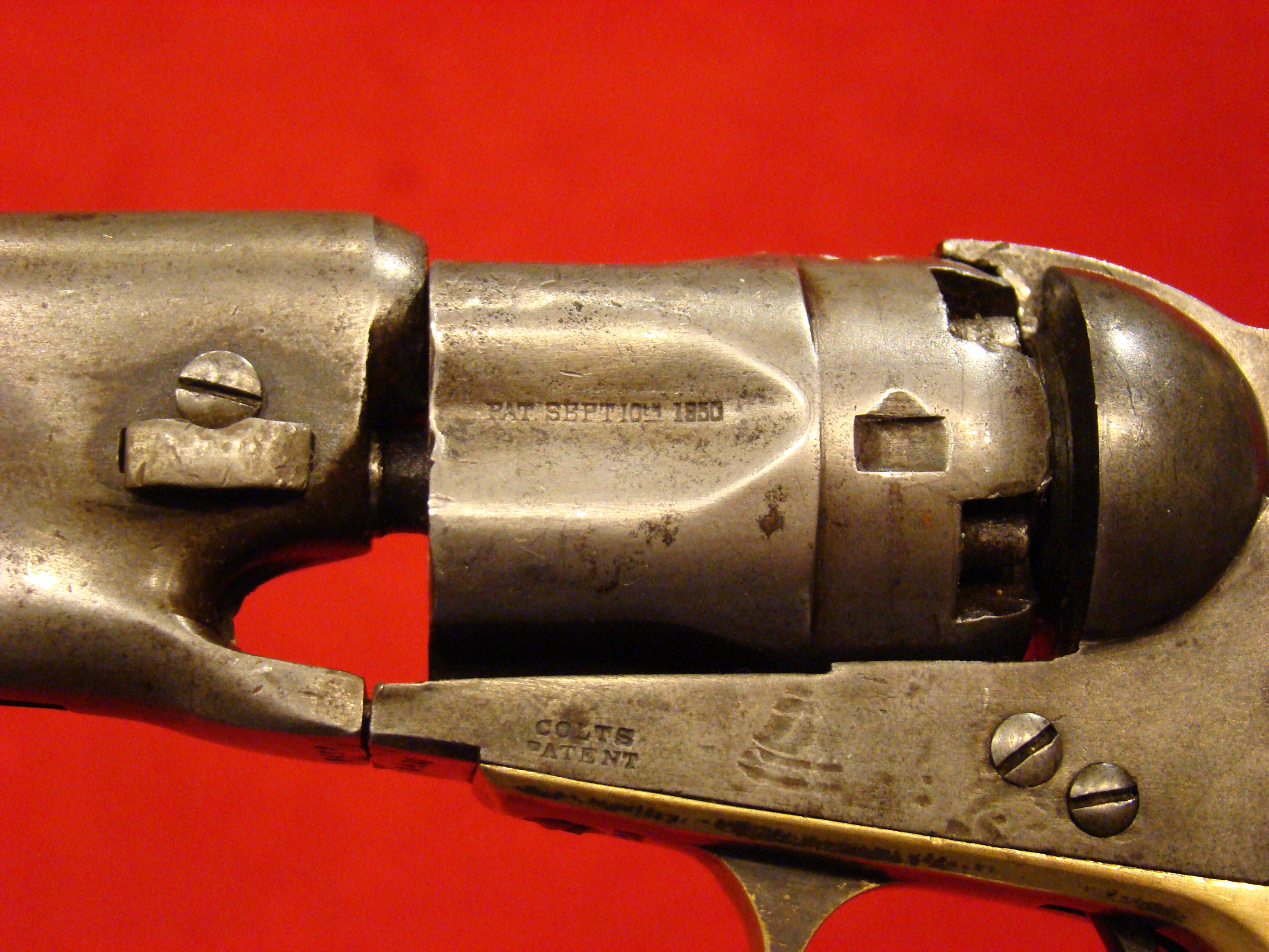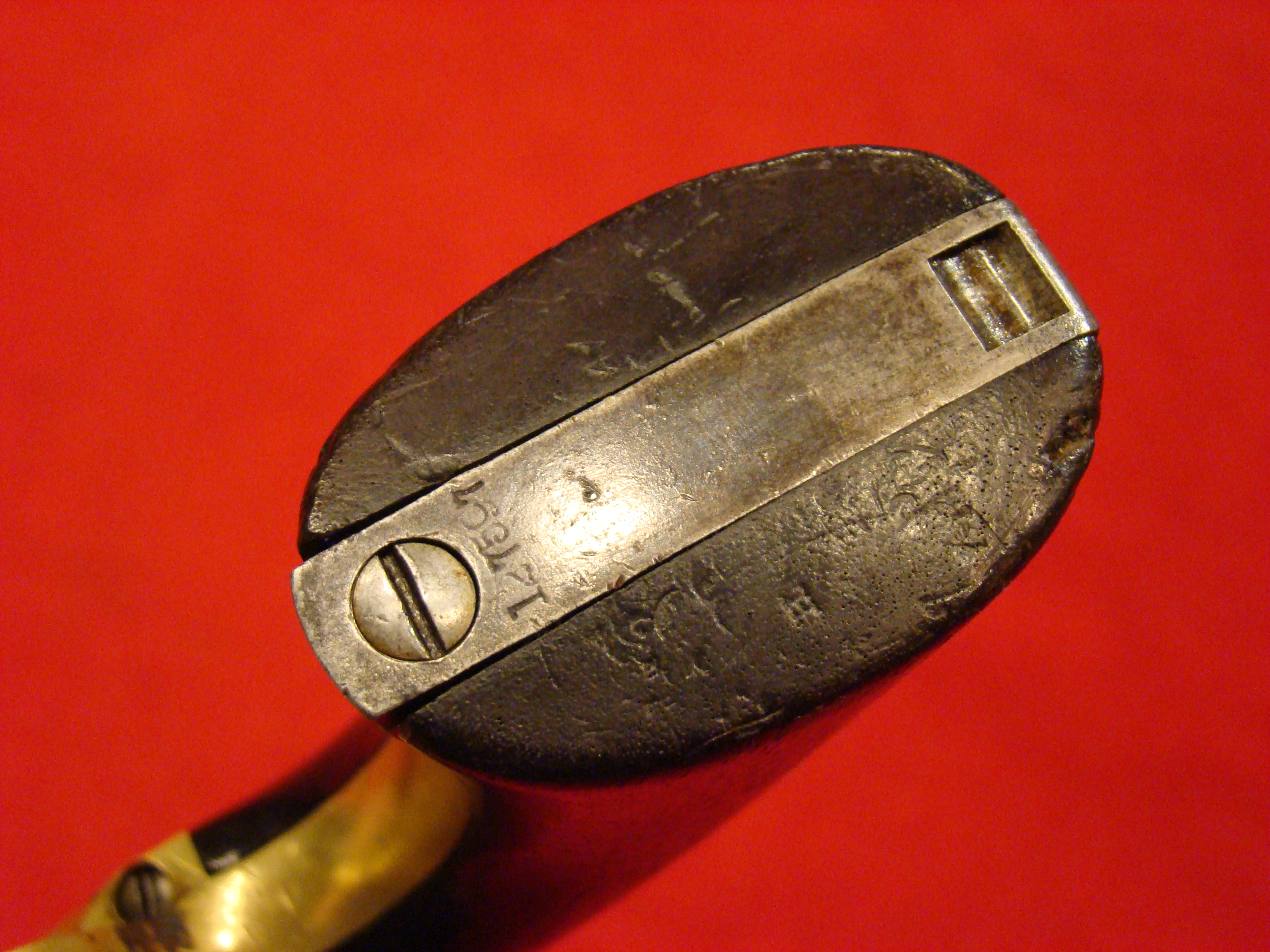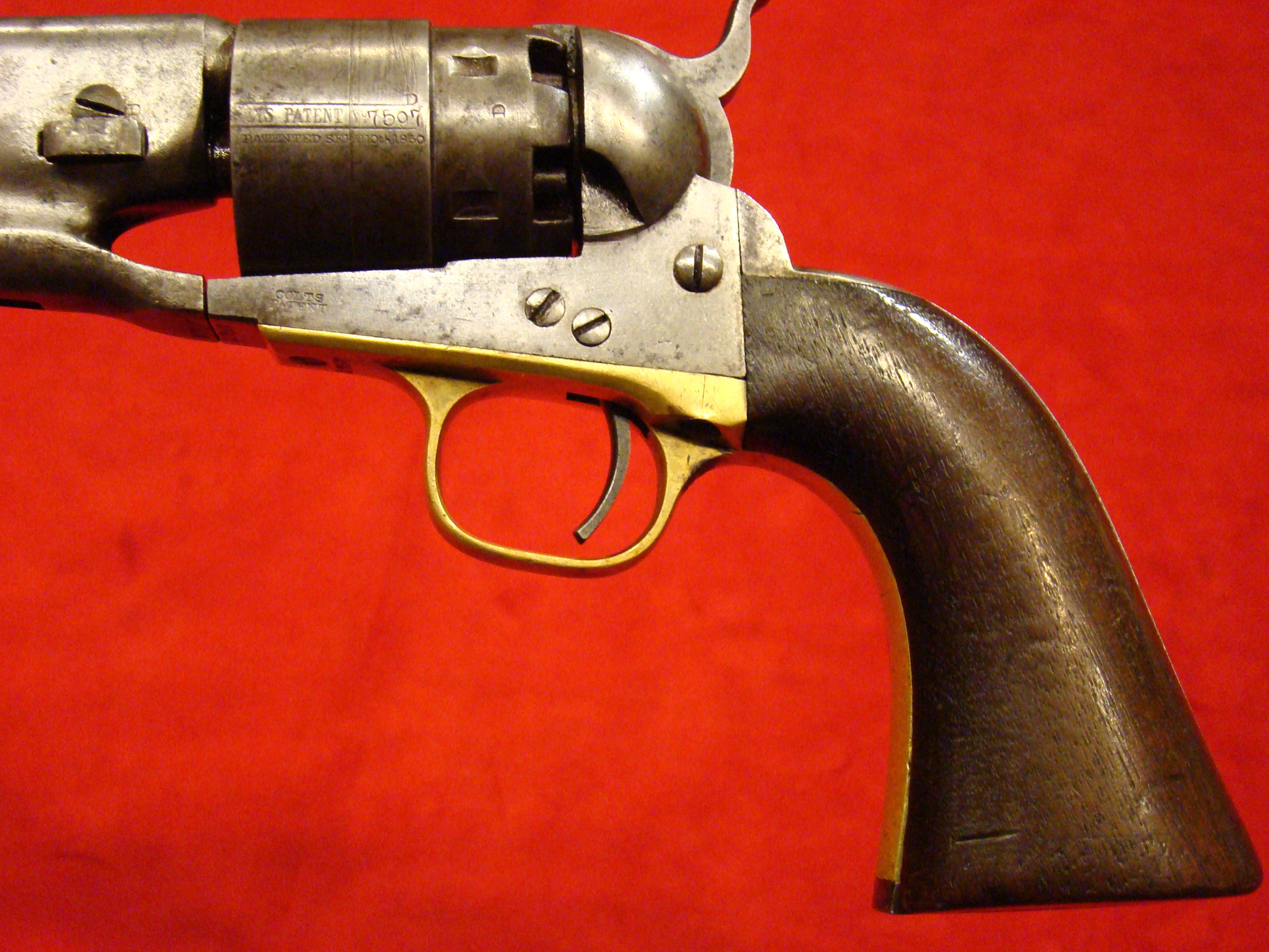 Relatively scarce handgun that enjoyed some popularity during the Civil War. 1858 production Serial# 902. A “Rocket Ball” self contained ammunition produced by Walter Hunt was used this pistol. The lever action mechanism was the pre-cursor to the Henry Rifle. All Volcanic Arms patents were purchased by Oliver Winchester, who subsequently started the New Haven Arms Co. Condition is very good with some factory blue finish on the barrel. “NEW HAVEN CONN. PAT. FEB. 14-1854” address present but a little weak. No oxidation or pitting. Lever action and trigger mechanism functions properly. Bore clean with strong rifling. Brass frame has a nice mustard colored patina with foliate scroll engraving throughout. The grips have a crack that runs along the grain. They retain the original factory varnish and are each serial numbered 902.