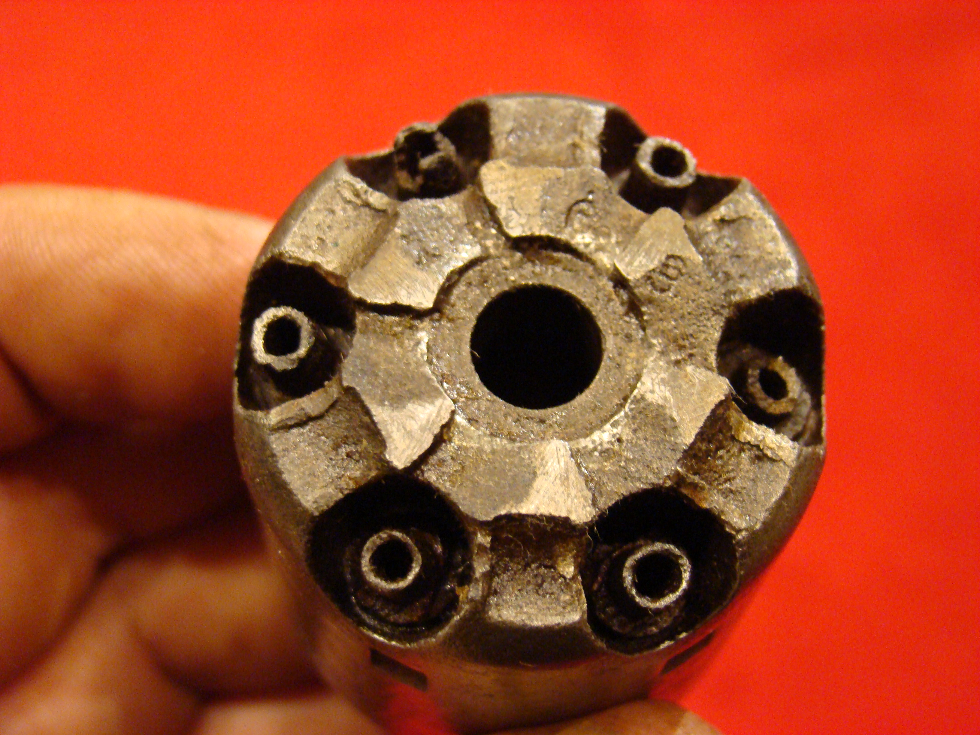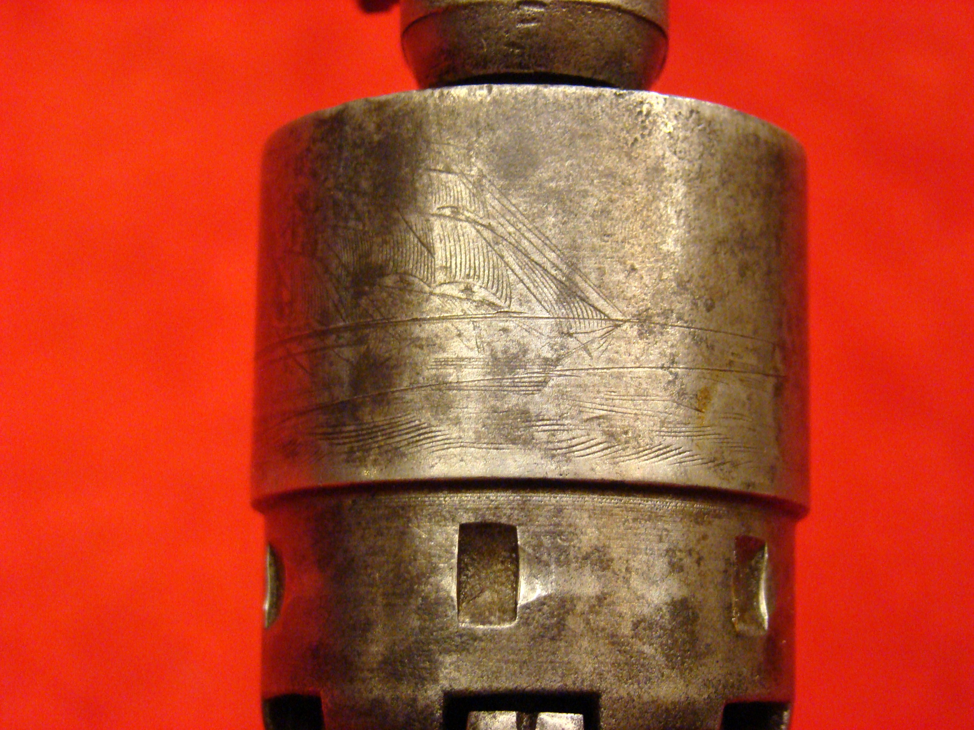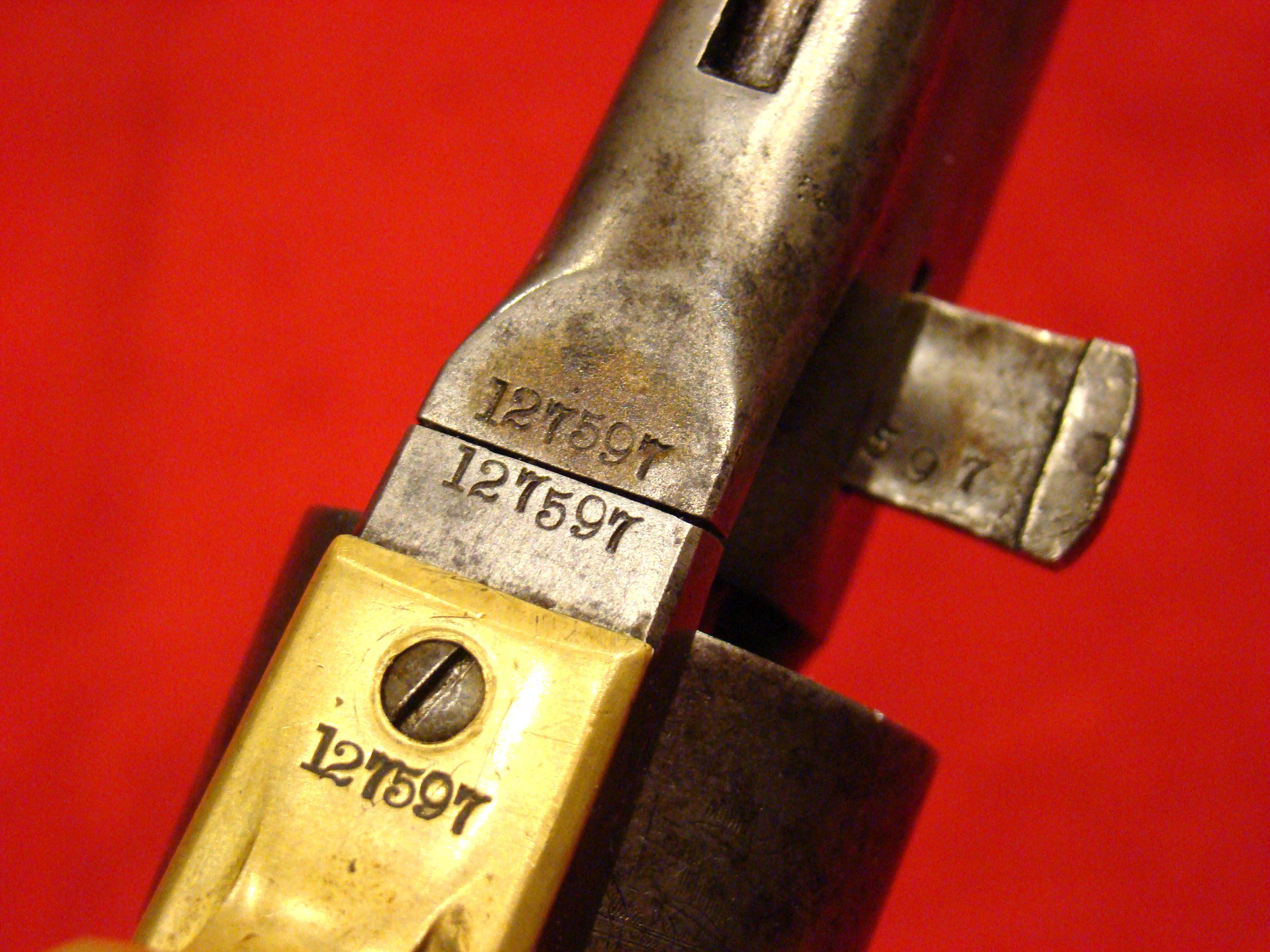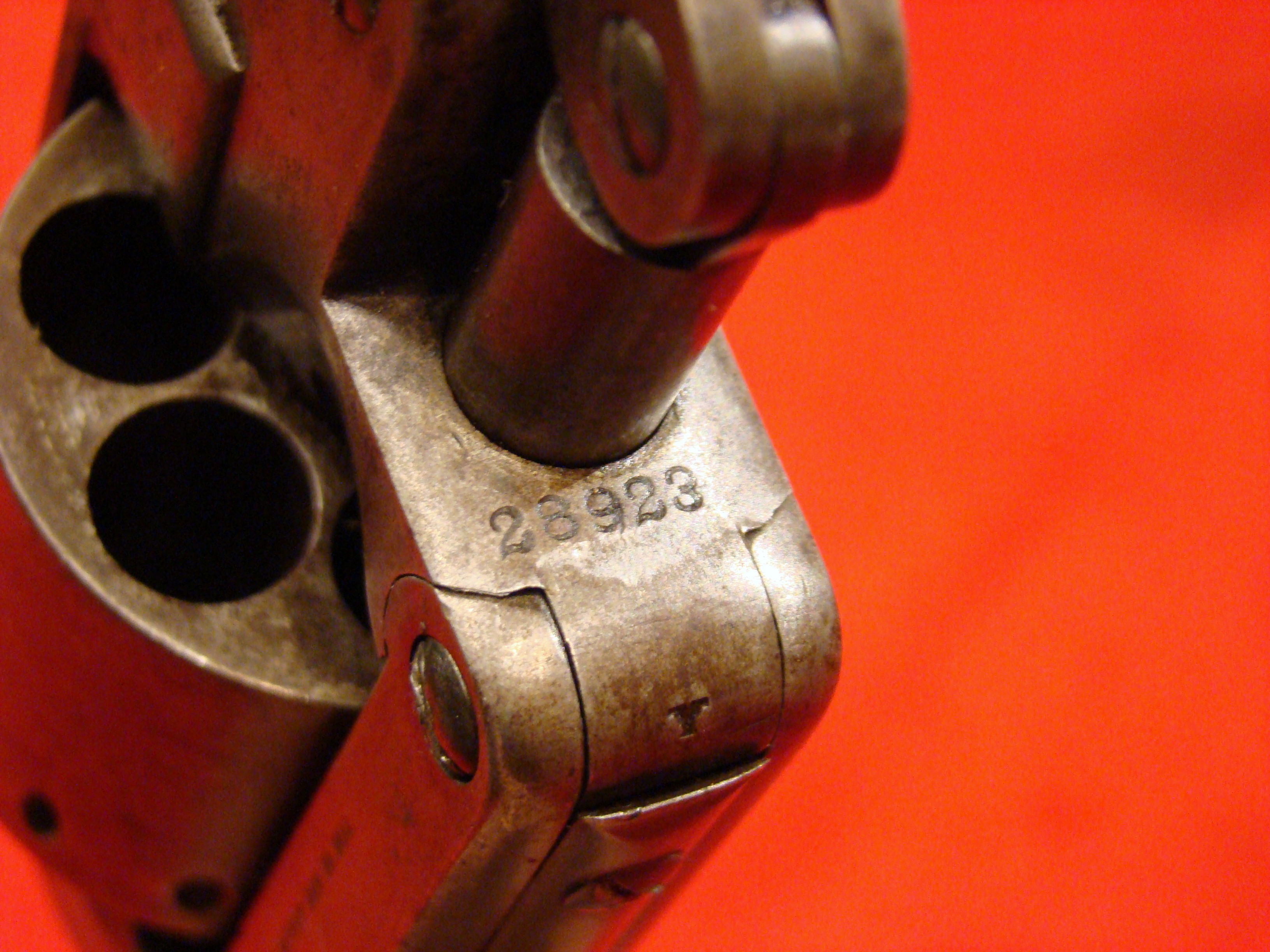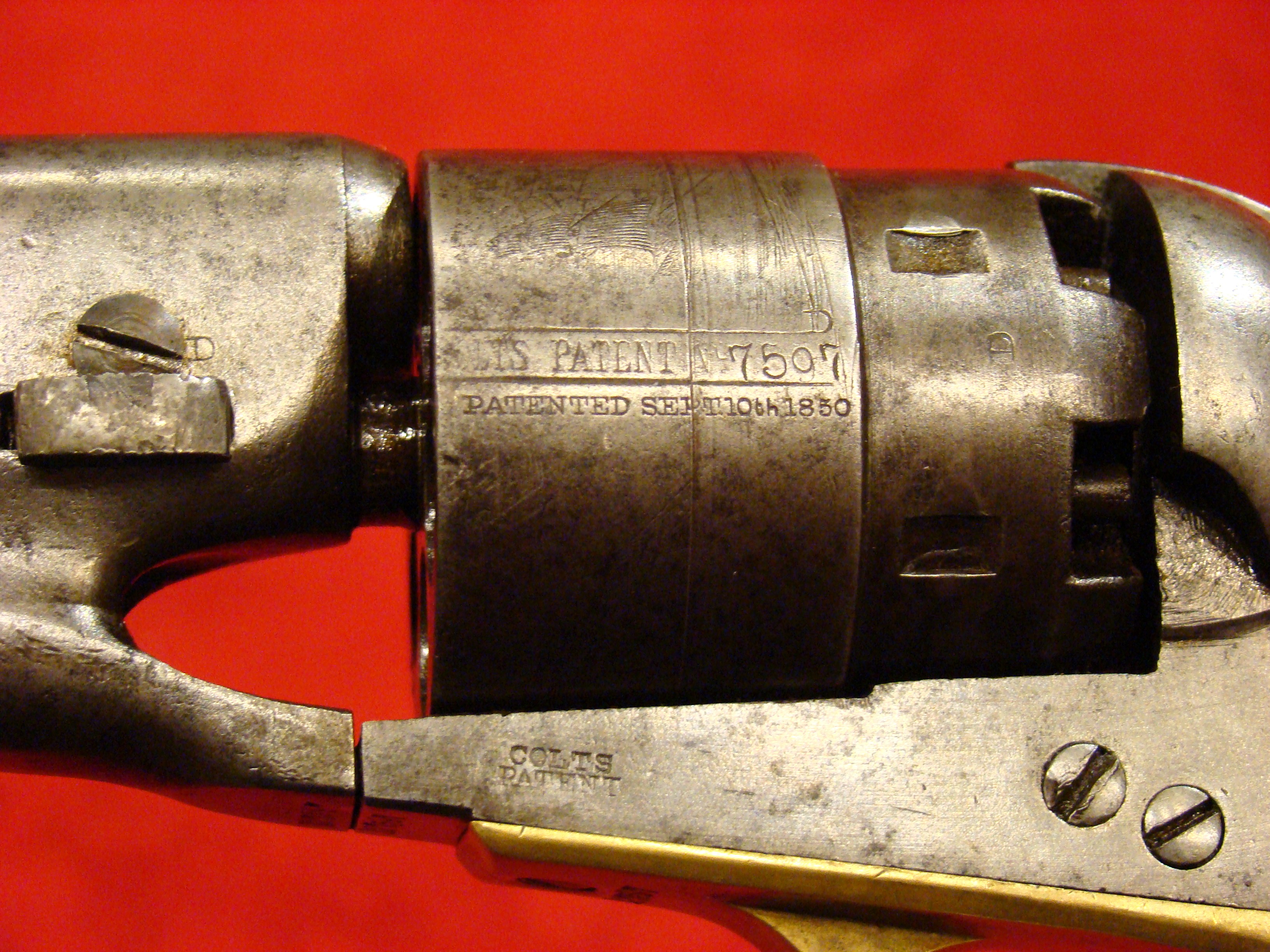 Relatively scarce handgun that enjoyed some popularity during the Civil War. 1858 production Serial# 902. A “Rocket Ball” self contained ammunition produced by Walter Hunt was used this pistol. The lever action mechanism was the pre-cursor to the Henry Rifle. All Volcanic Arms patents were purchased by Oliver Winchester, who subsequently started the New Haven Arms Co. Condition is very good with some factory blue finish on the barrel. “NEW HAVEN CONN. PAT. FEB. 14-1854” address present but a little weak. No oxidation or pitting. Lever action and trigger mechanism functions properly. Bore clean with strong rifling. Brass frame has a nice mustard colored patina with foliate scroll engraving throughout. The grips have a crack that runs along the grain. They retain the original factory varnish and are each serial numbered 902.
