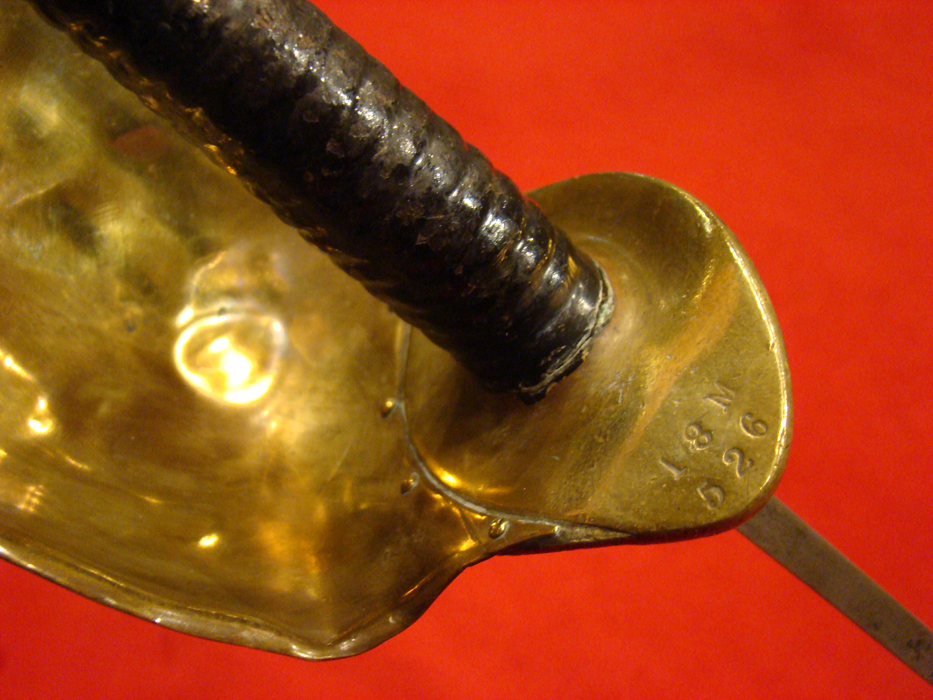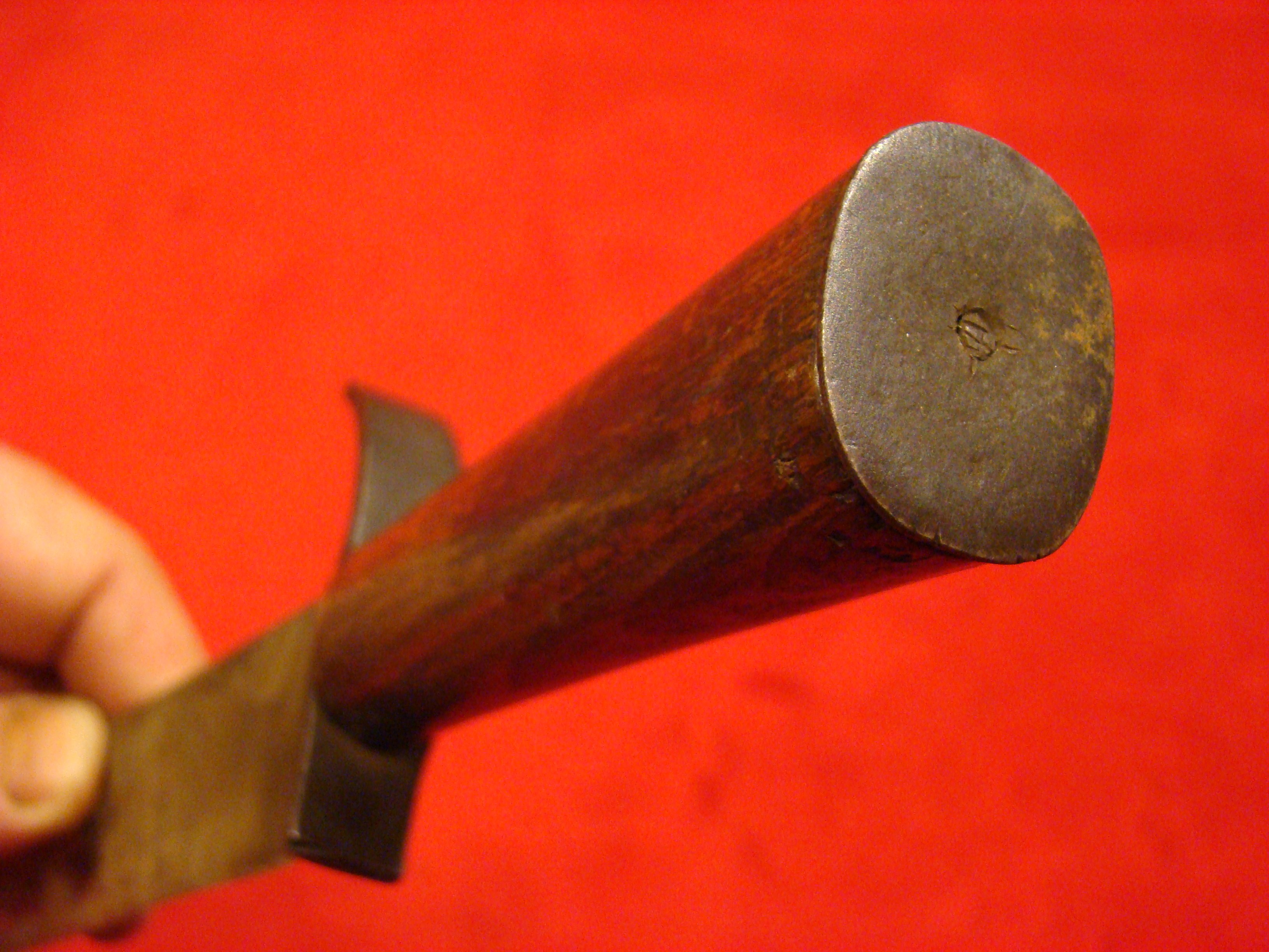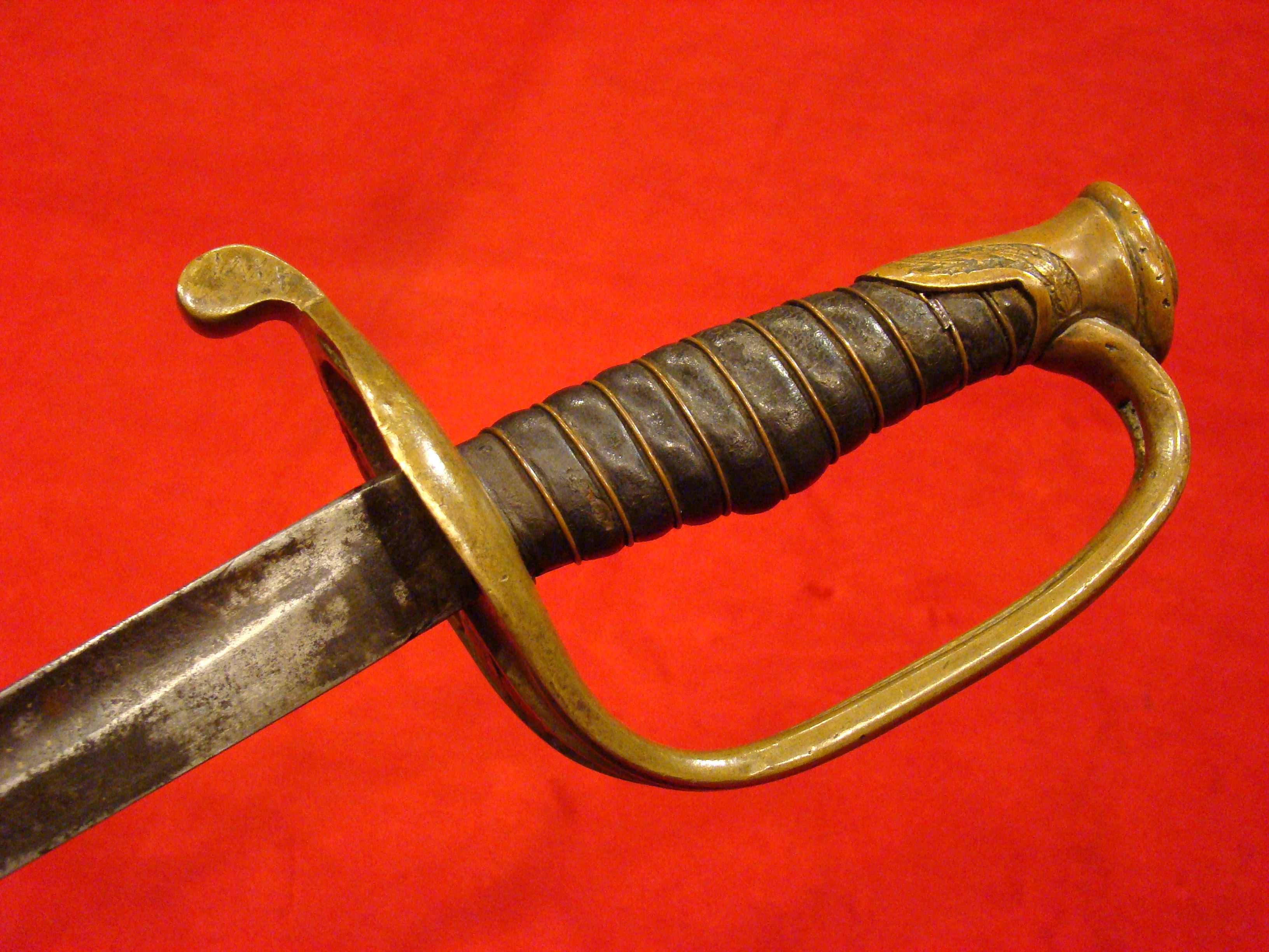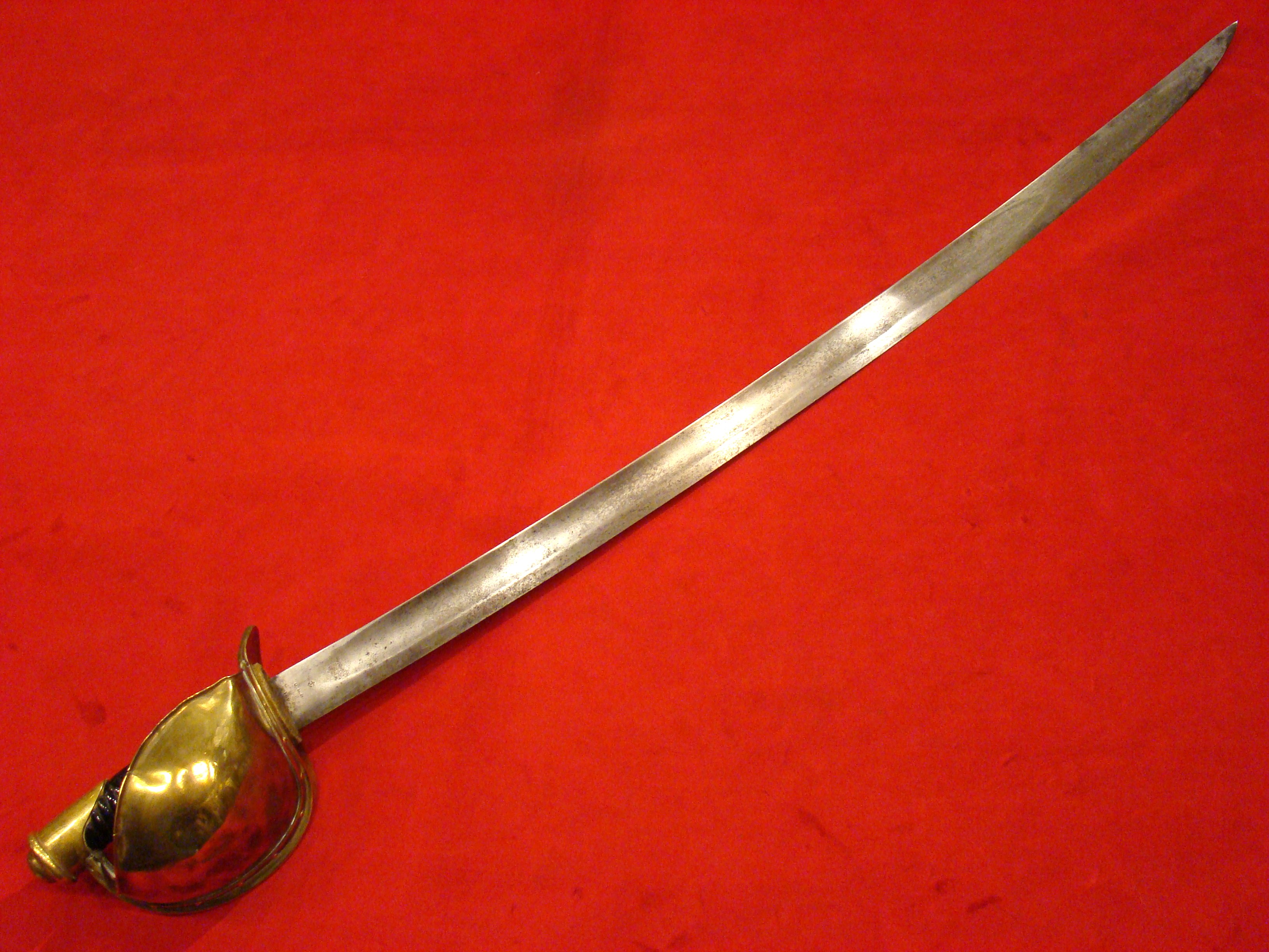 Here is the most attractive and interesting of the CS marked artillery short swords (my opinion). Condition is very good with no wobble in the hollow cast guard. The letters “C” and “S” are prominently cast into the quillons. Blade has no nicks or sharpening. Light surface oxidation gives it a splotchy patina with areas of bright finish coming through. No scabbard, but nonetheless, a fine looking and affordable CS marked sword. Ex. Paul Brill collection.