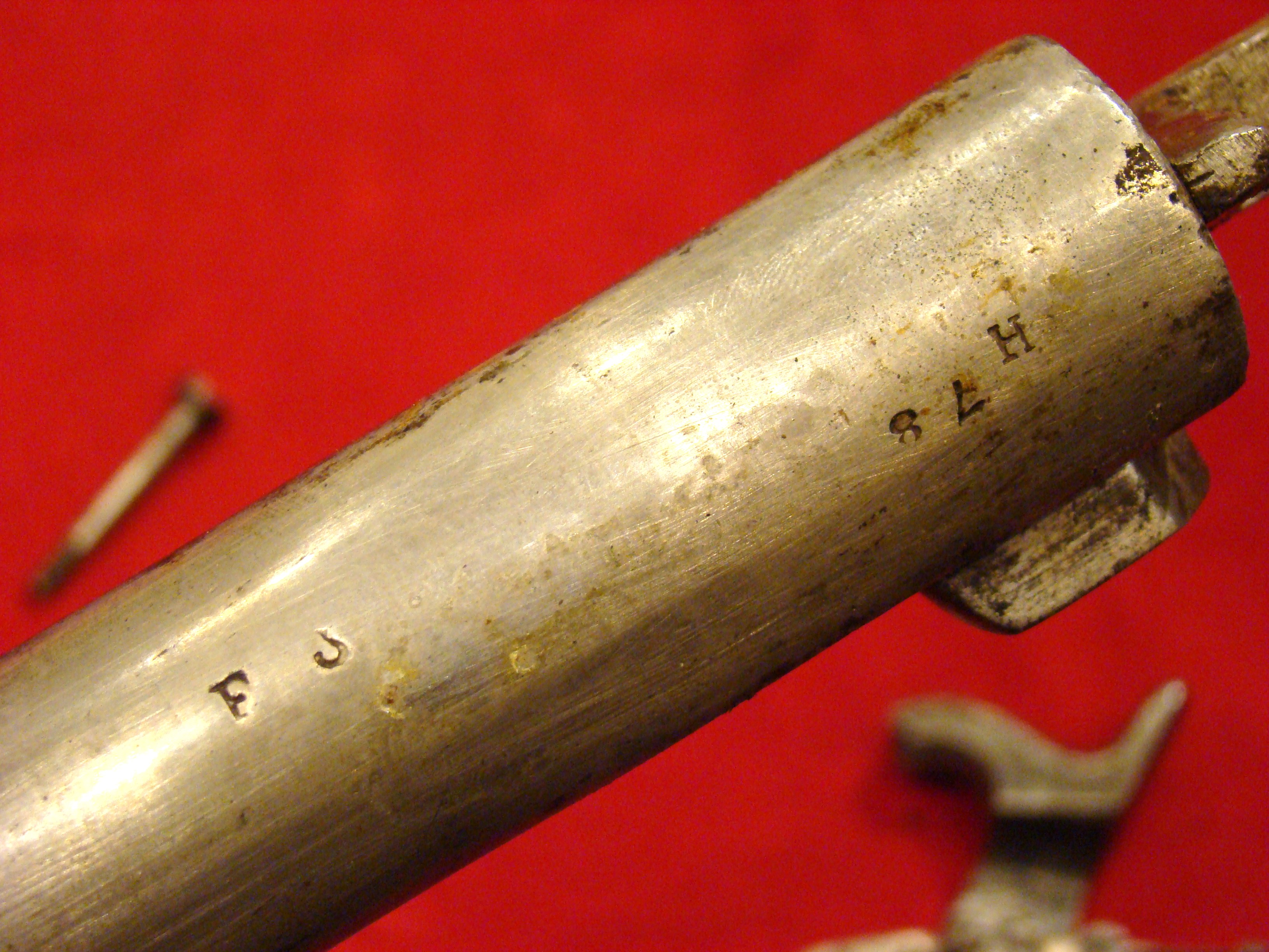 Here is a purely Confederate inspected, issued, and used long arm. Thousands of Enfield Rifle Muskets were smuggled by fast blockade runners into Confederate ports. This one is marked “BARNETT/LONDON” on the lock, and ‘TOWER” under a crown behind the hammer. Trigger and cocking mechanism works properly. Gunmetal surfaces have a deep brown patina. There is a “JS” over Anchor stamp adjacent to the butt-plate tang. This is the mark of John Southgate, a prominent viewer of arms sent to the Confederacy. See pages 113-115 of Russ Pritchard and Corky Huey’s fine reference book “The English Connection” for illustrations and more information. Bore has weak rifling due to heavy combat use. The stock is in very good condition with typical wear and dings. There is a small crack emanating from the nose cap. The ramrod and long range sight are present and original.