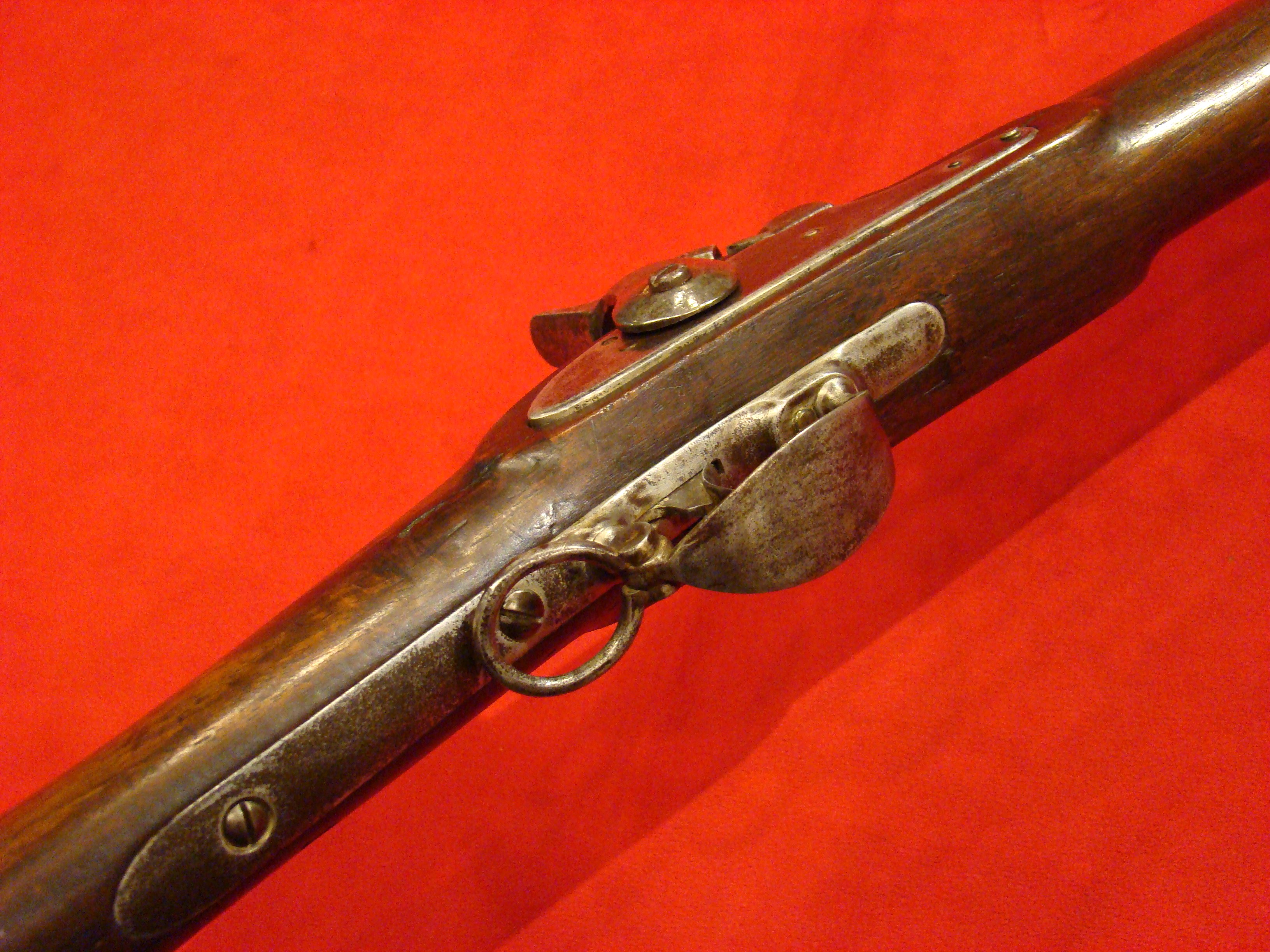 Lock is marked “U.S./R. JOHNSON/MIDDN./CONN./1840”. Converted from flintlock to percussion. Lock-hammer-trigger mechanism functions properly. Untouched attic patina on all metal surfaces. Original swivel type ramrod present. Stock in good shape with no cracks or repairs.