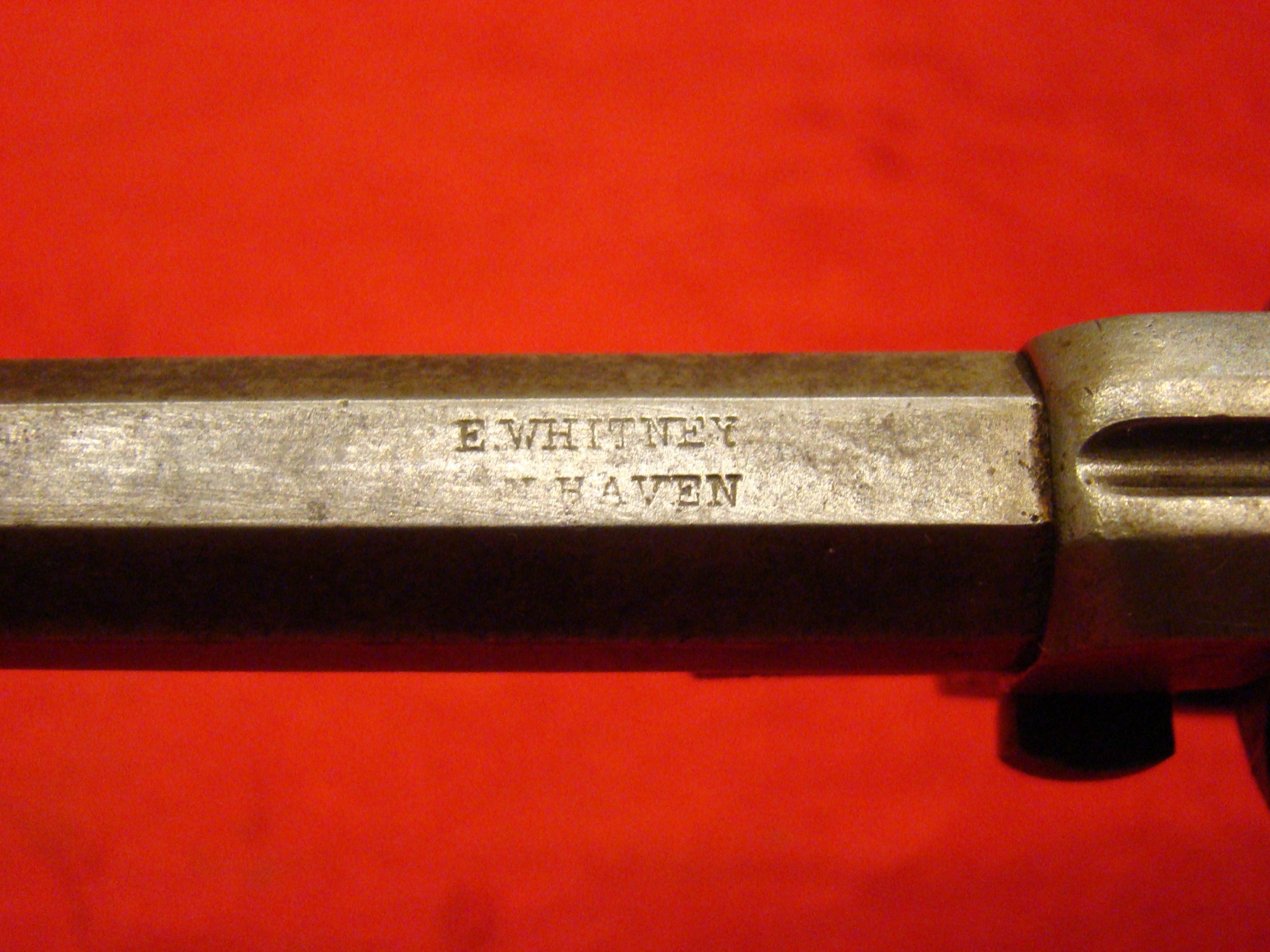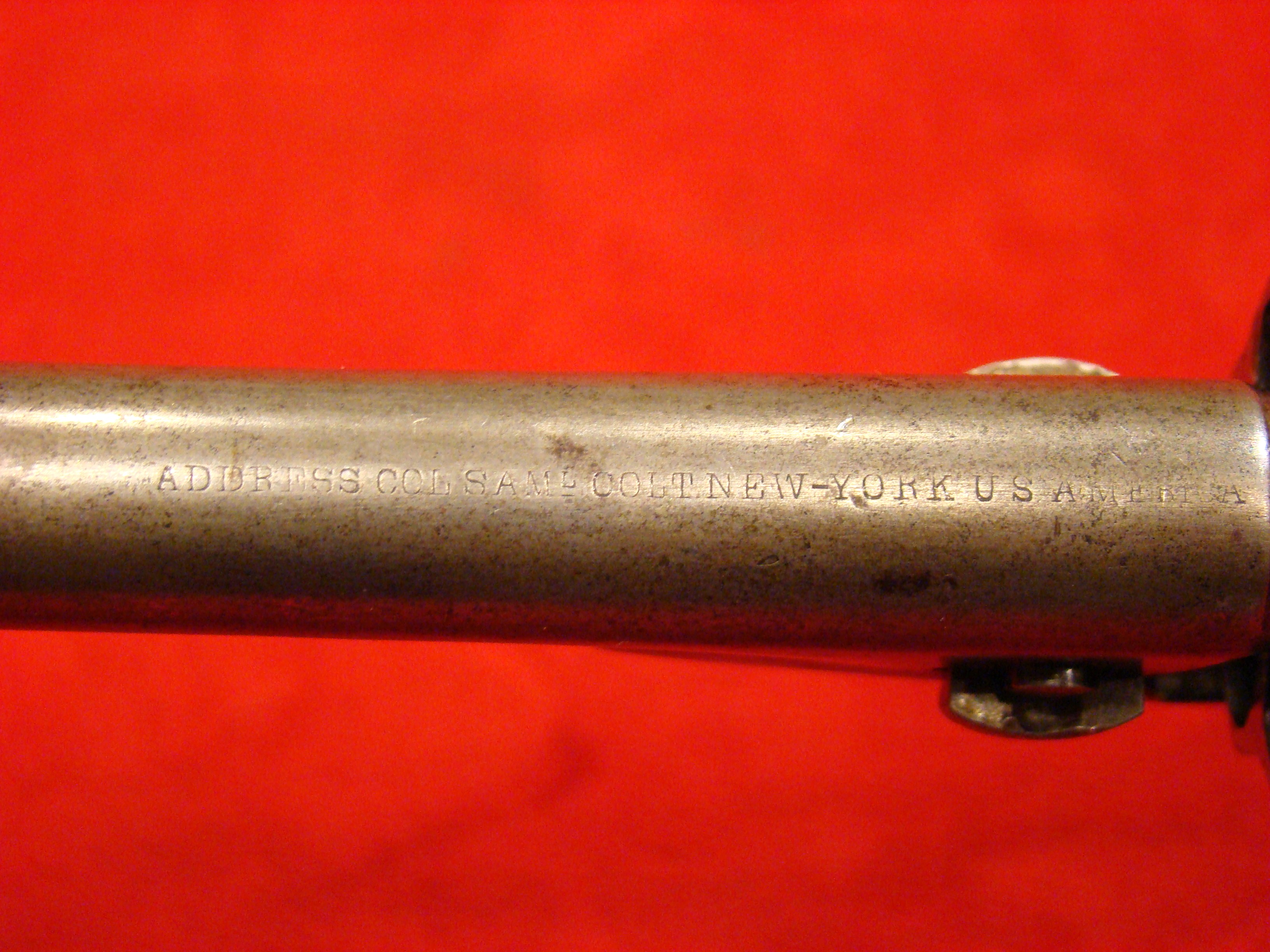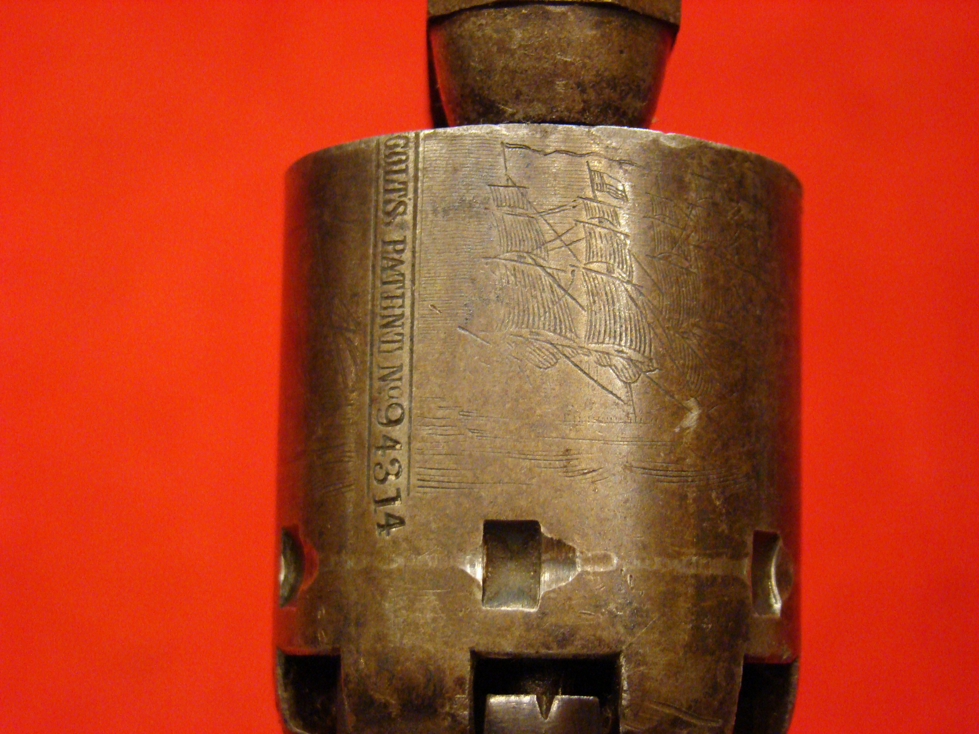 This is the classic American Civil War Colt Revolving Rifle. When an antique firearm’s condition is described as “In the black”, this is exactly what is meant. Absolutely untouched, and consistent black patina on the wood and metal surfaces. All matching serial # 3467. No pitting or oxidation on the metal. Colt Patent Address present on the frame, cylinder, and breech. Cylinder rotation/cocking mechanism works, but is a bit sloppy and could use some tweaking. Original long range sight present. Bore is clean with strong rifling. Cleaning rod is a very accurate replacement with a threaded tip. Barrel bands and sling loops are original. The stock is in remarkable, untouched condition. It has never been cleaned or sanded. A screw was neatly added to tighten the stock at the junction with the frame near the trigger guard. This was probably done during the period of use. It is slightly recessed and could easily be covered. No cracks, filler, or missing wood. Butt stock has sharp edges with initials “HL.” carved into it. The majority of all Colt Military Rifles were purchased by the US Government, but a significant number were purchased directly from Colt by various states, with large numbers going to North Carolina, Virginia, Connecticut, and Alabama. these guns would not have US Military inspector stamps and cartouches as observed in this example. According to Sam Watkins’ memoir, Col. Hume Feild of the 1st Tenn. Inf. CSA carried one of these Colt Revolving Rifles into battle (and used it).