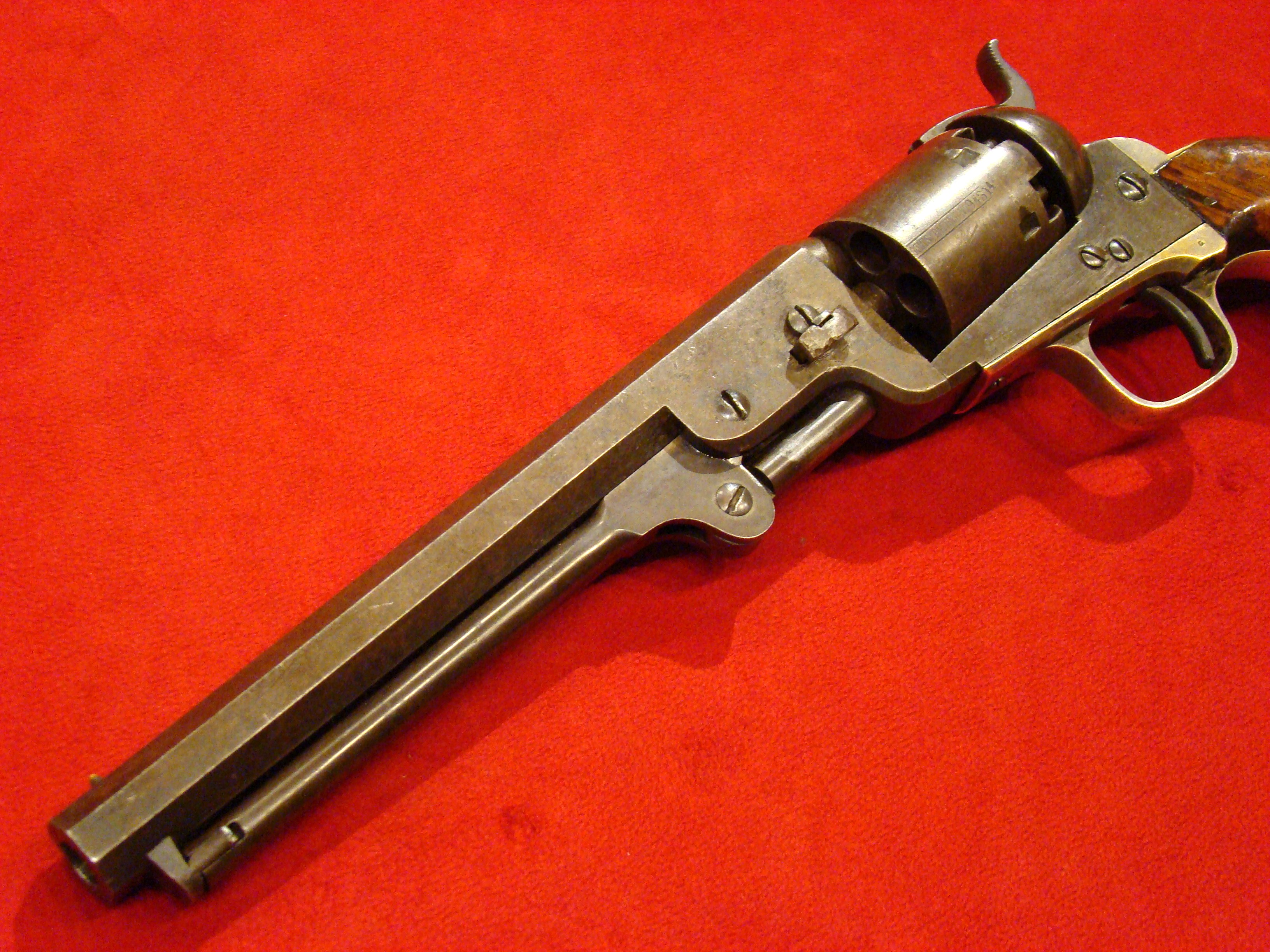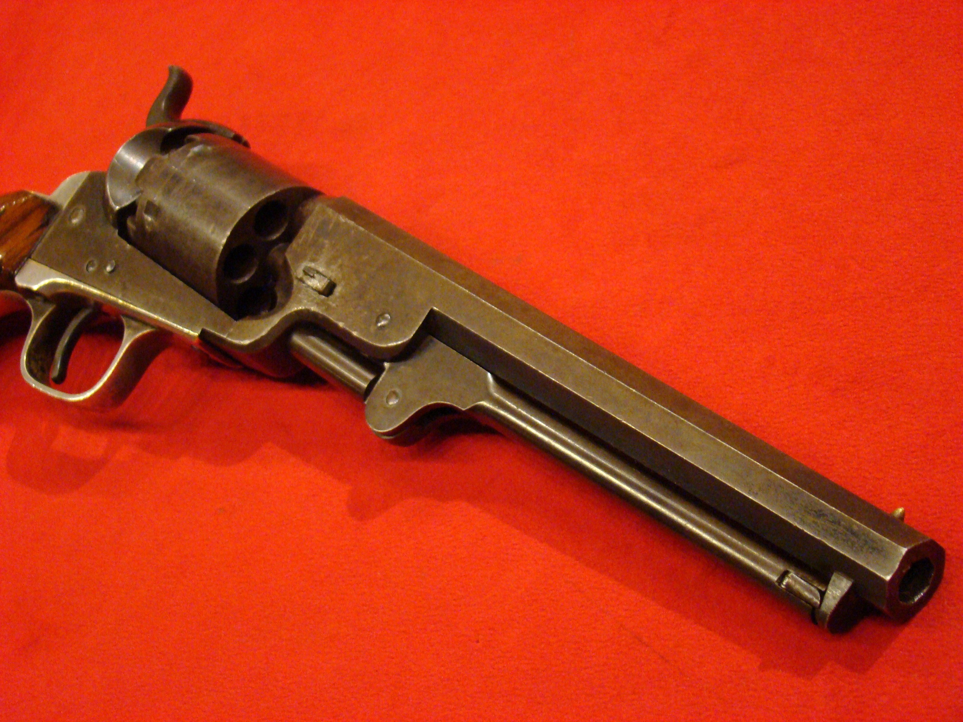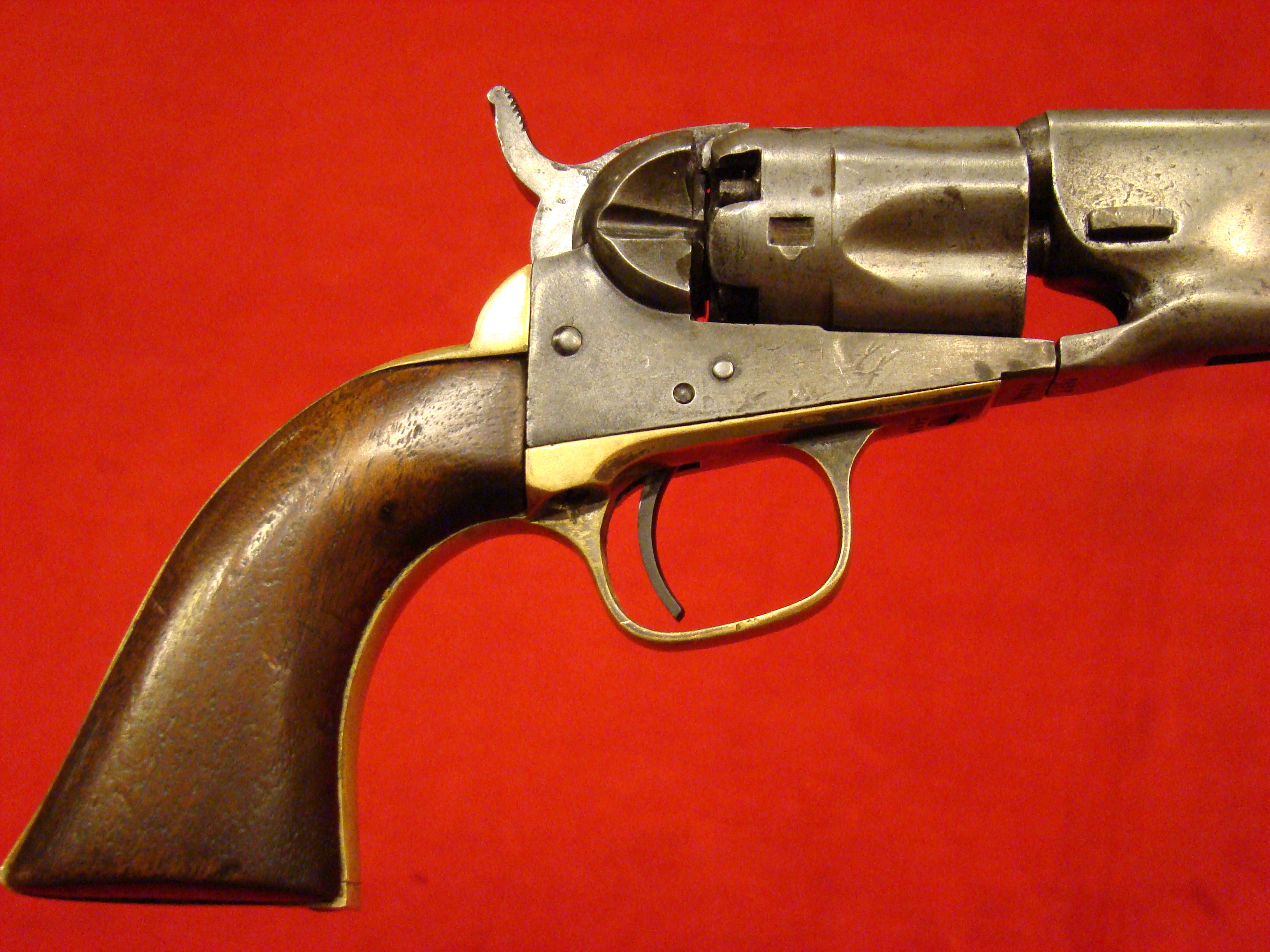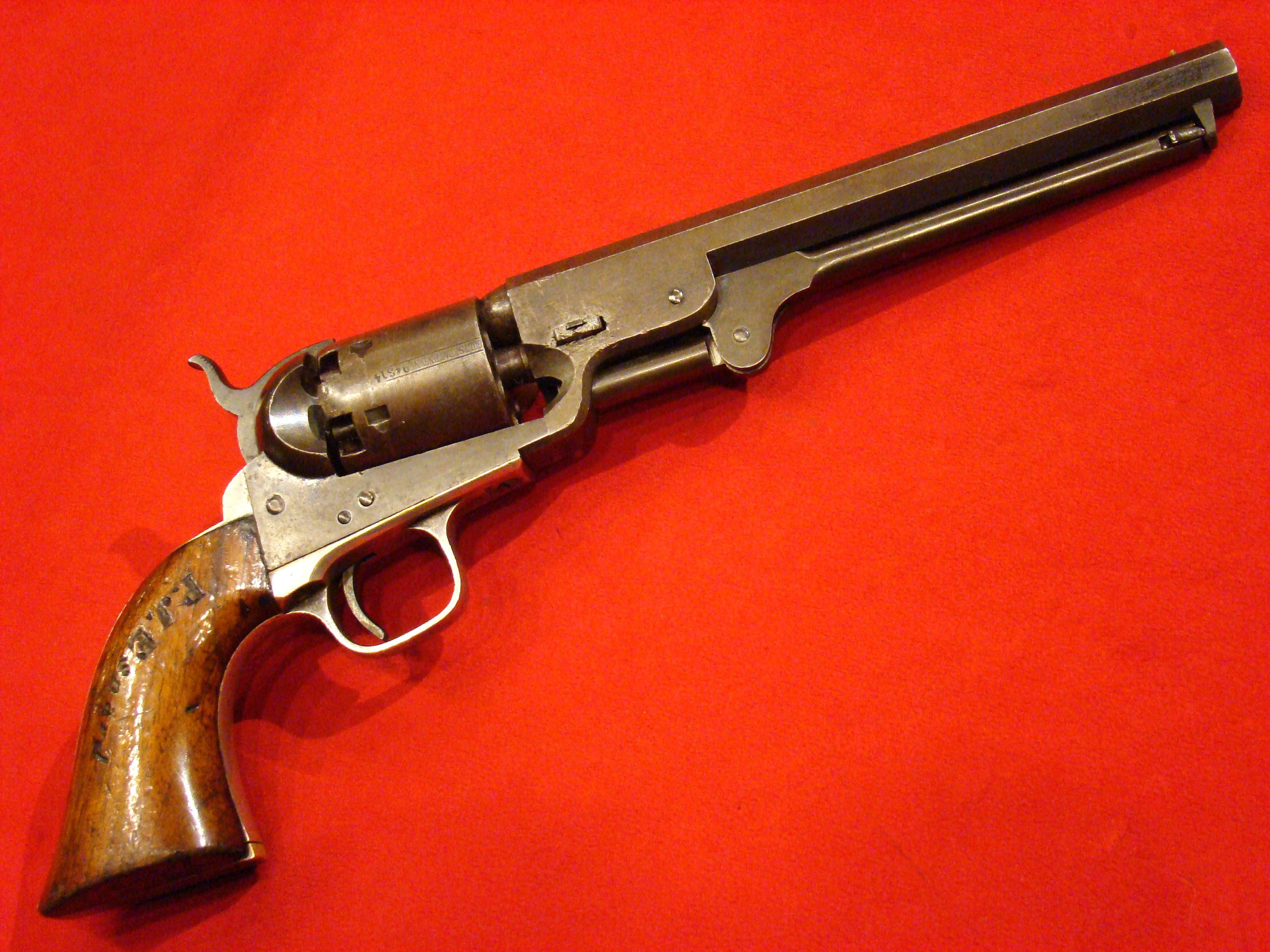 Fine early revolver. Serial # 889. Single action with spur trigger and bird’s head rosewood grips. Action works. Traces of factory blue finish in the recesses. $395.00