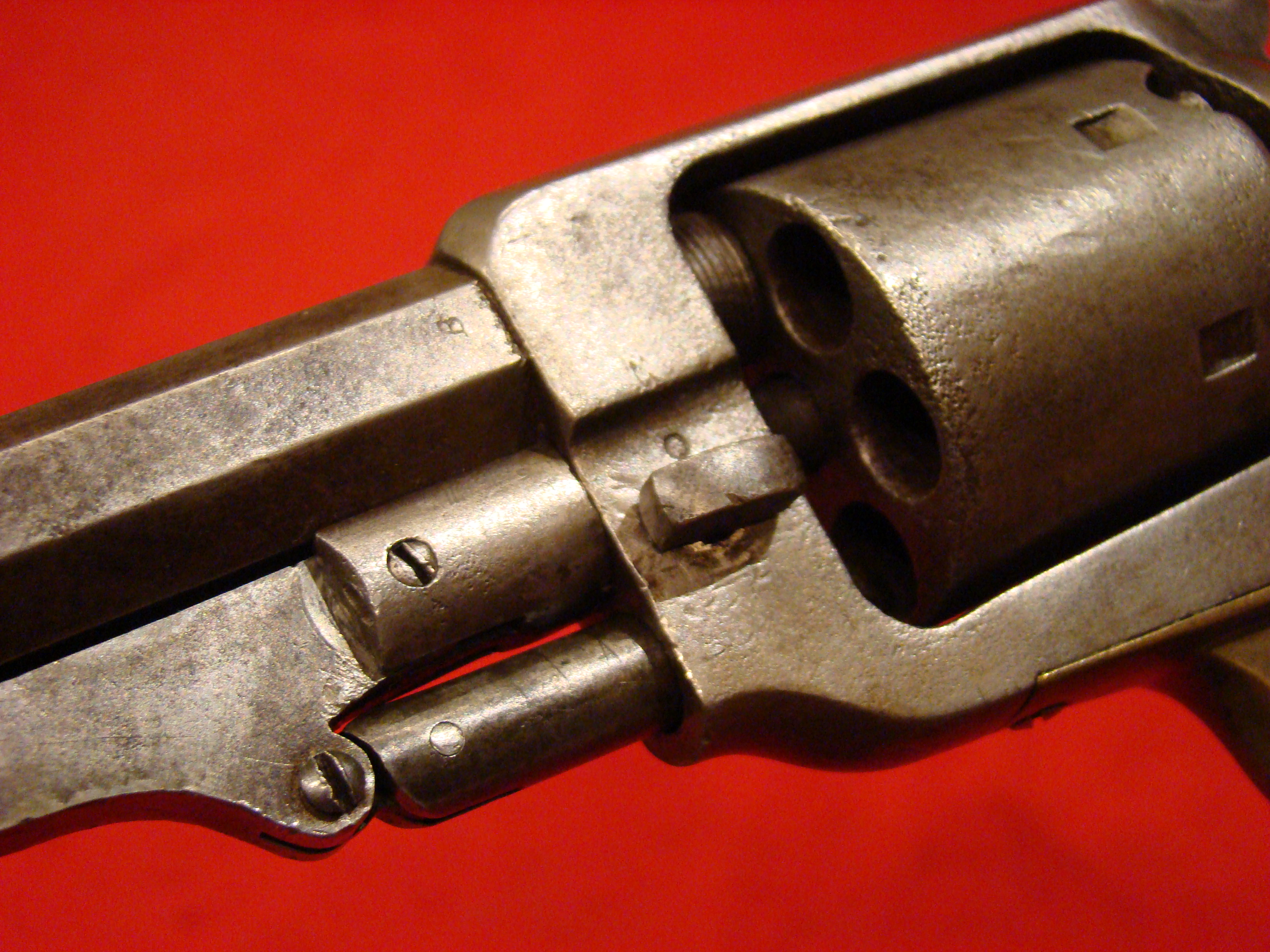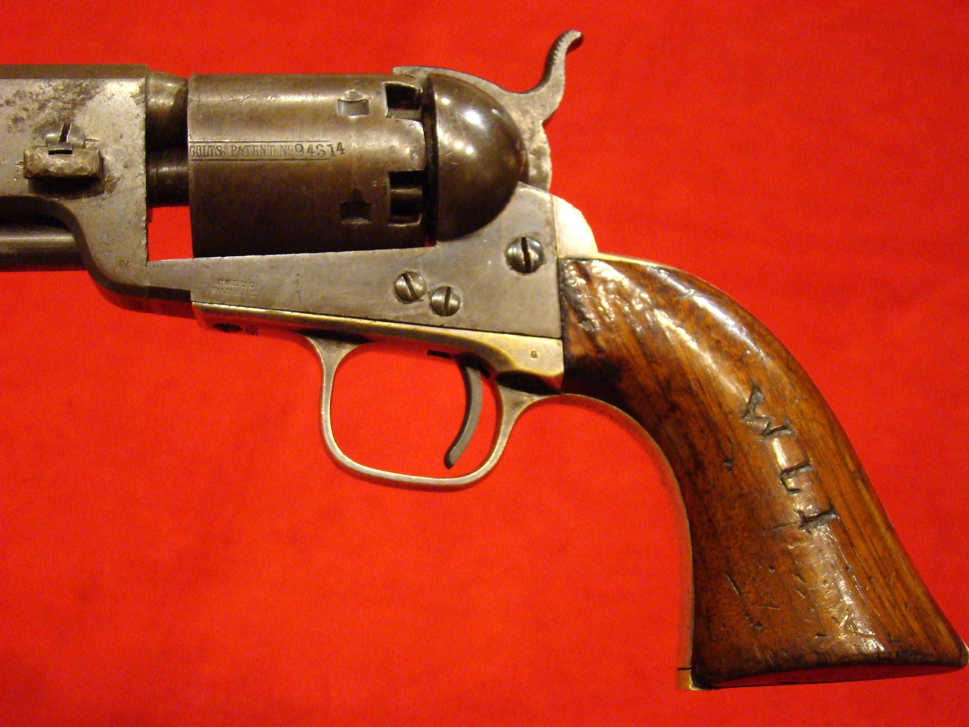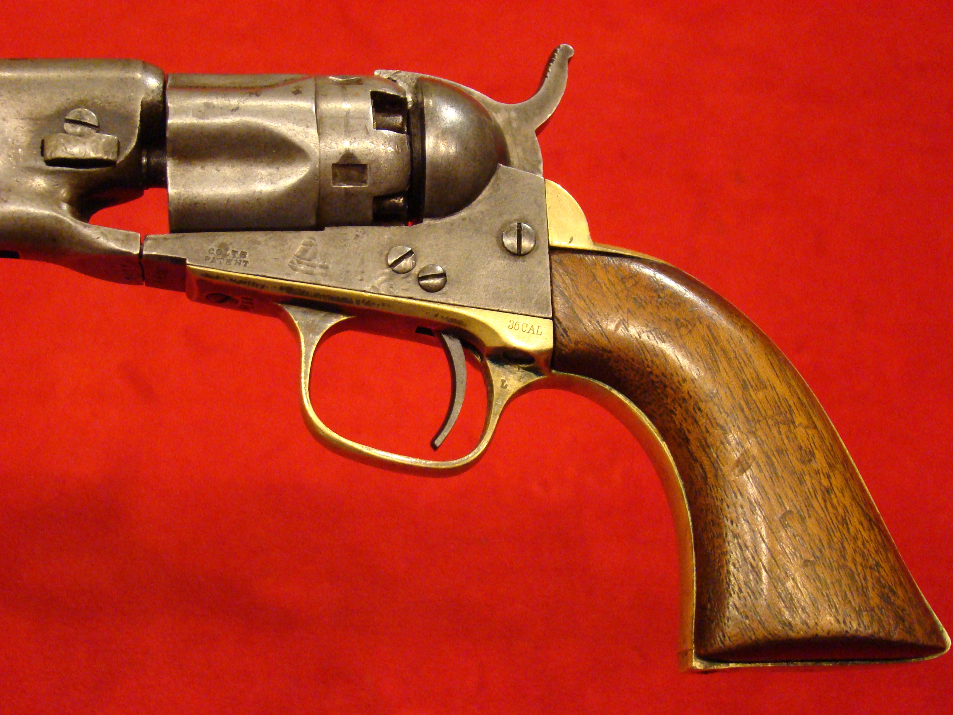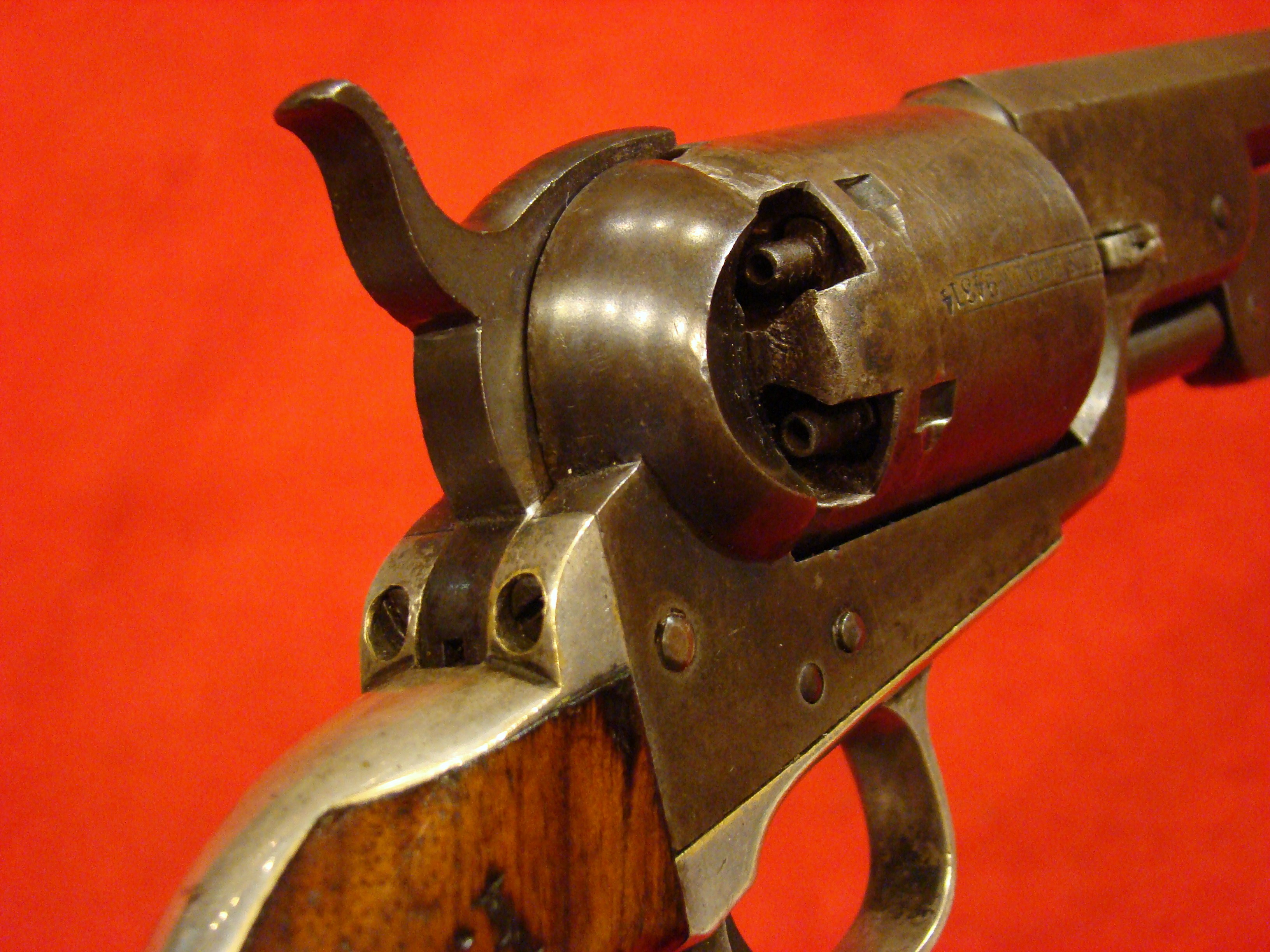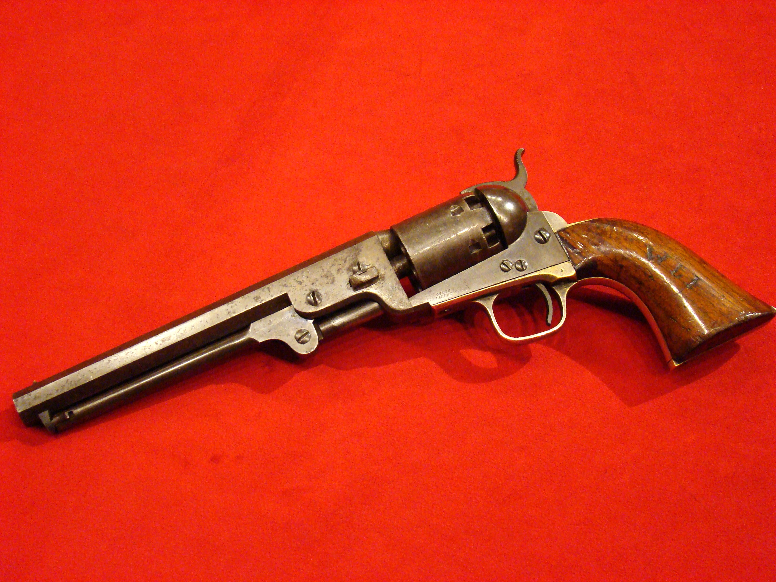 Fine early revolver. Serial # 889. Single action with spur trigger and bird’s head rosewood grips. Action works. Traces of factory blue finish in the recesses. $395.00