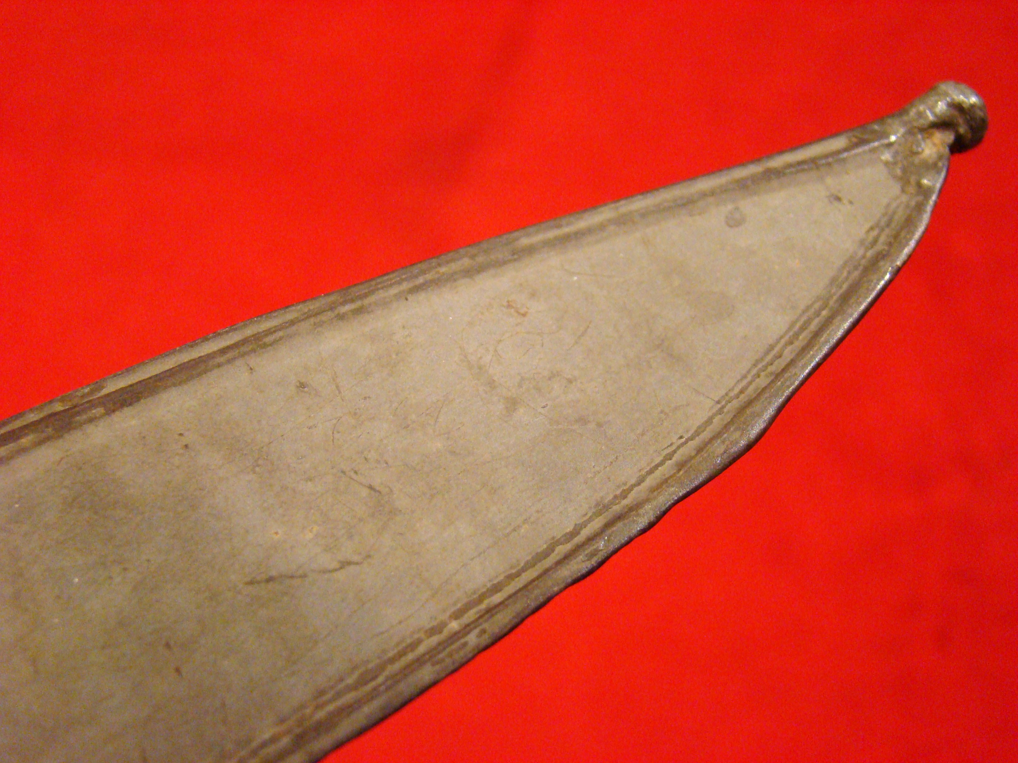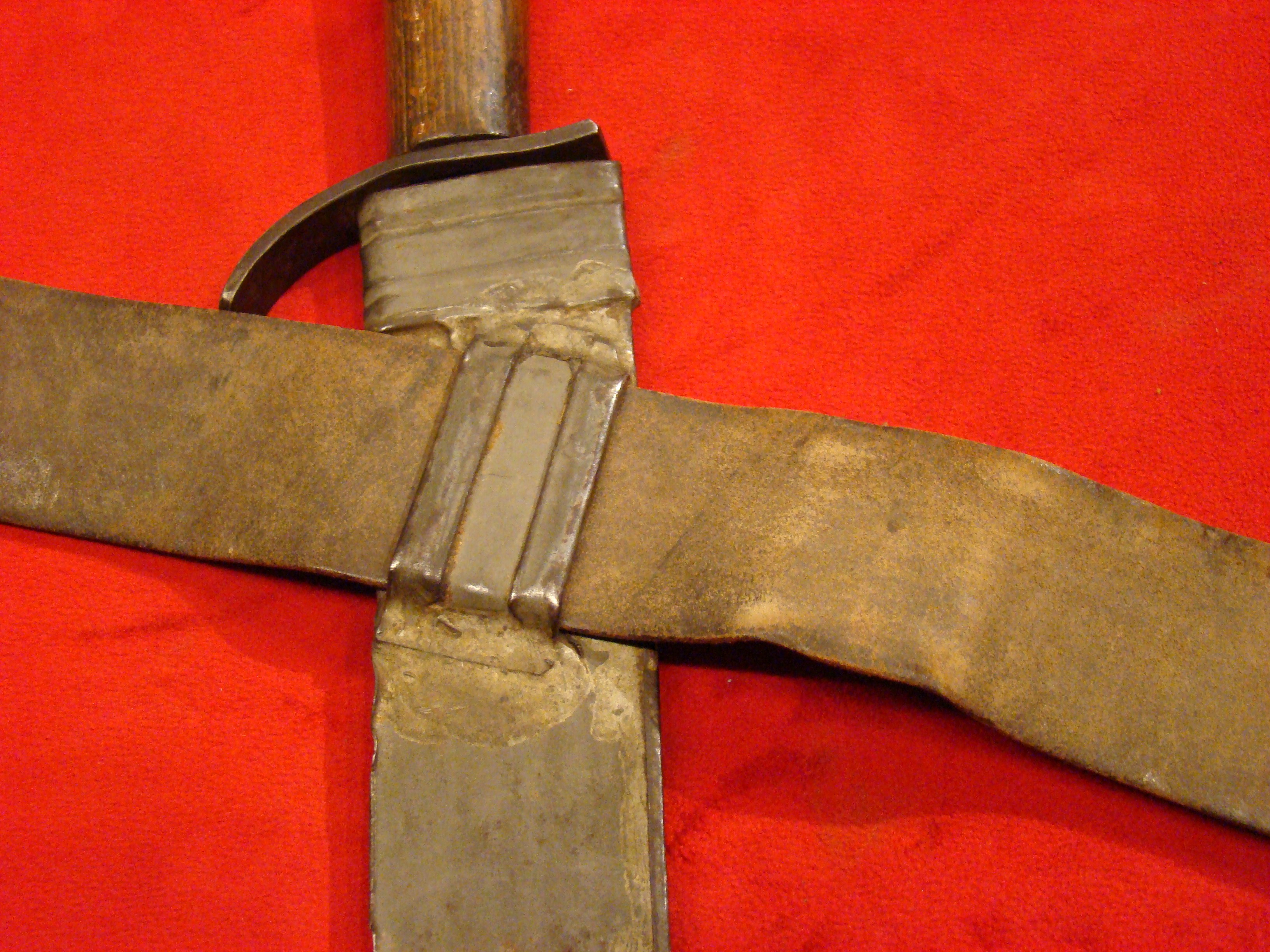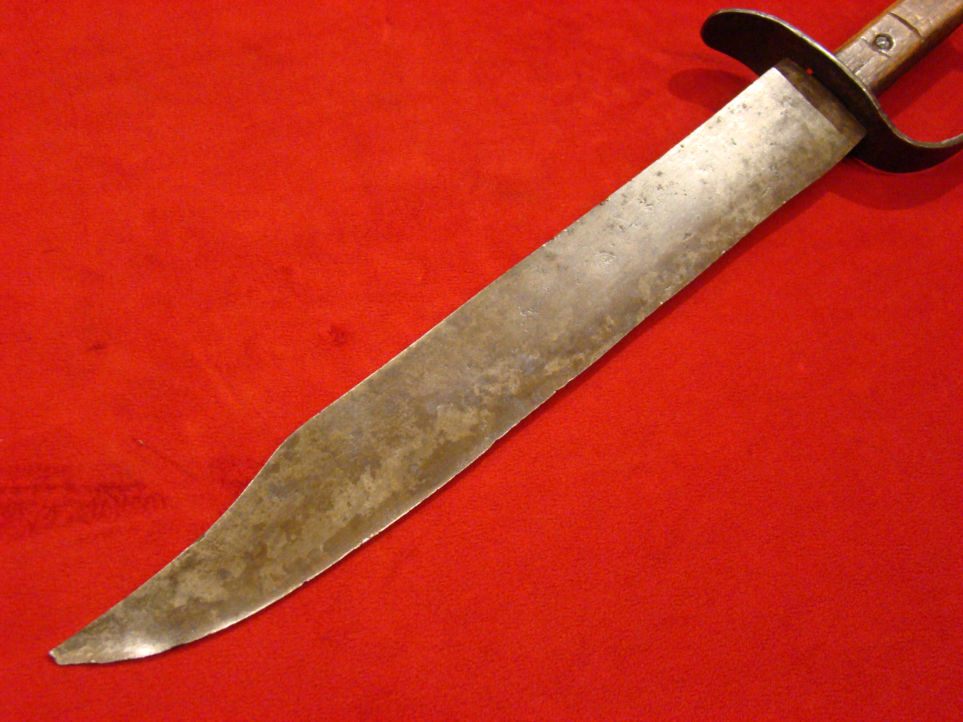 This massive knife came from a Montgomery TX. family estate and resembles Mexican knives of the period. Note elongated clip-tip. Blade shows age and was made by a skilled smith. Hardwood grip is in great condition and may be made of Mesquite. I prefer to call this knife “Texican”, or an “Espada Ancha”. These knives actually date to the Mexican War and are the direct ancestor of the iconic Confederate “D-Guard” Bowie. See page 245 of Norm Flayderman’s reference book “The Bowie Knife: Unsheathing an American Legend” for some detailed discussion on these knives. Total length is 27″.