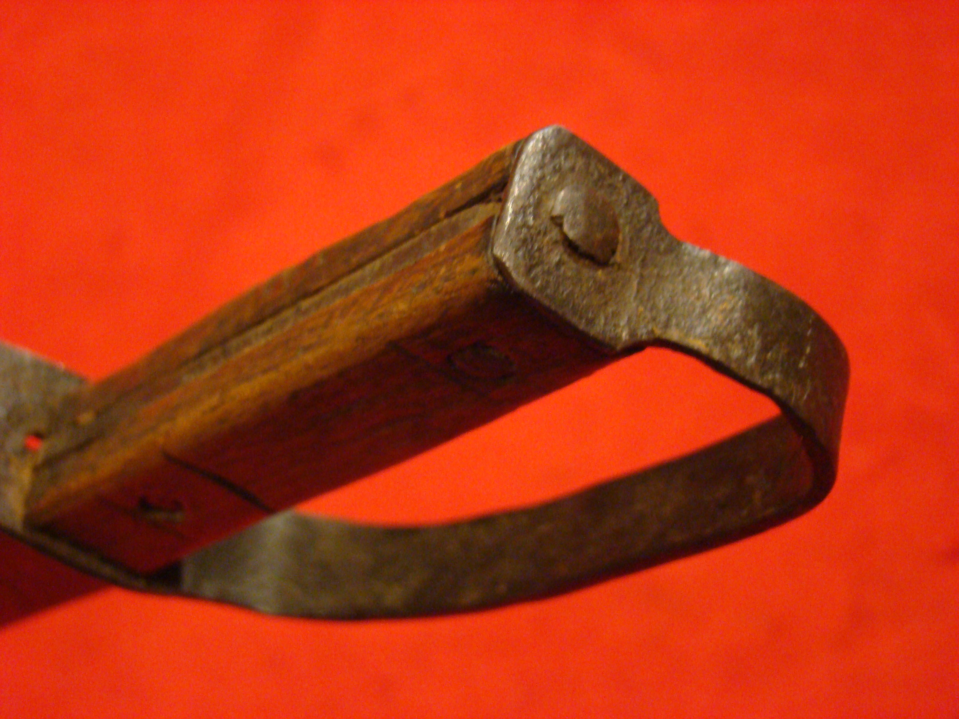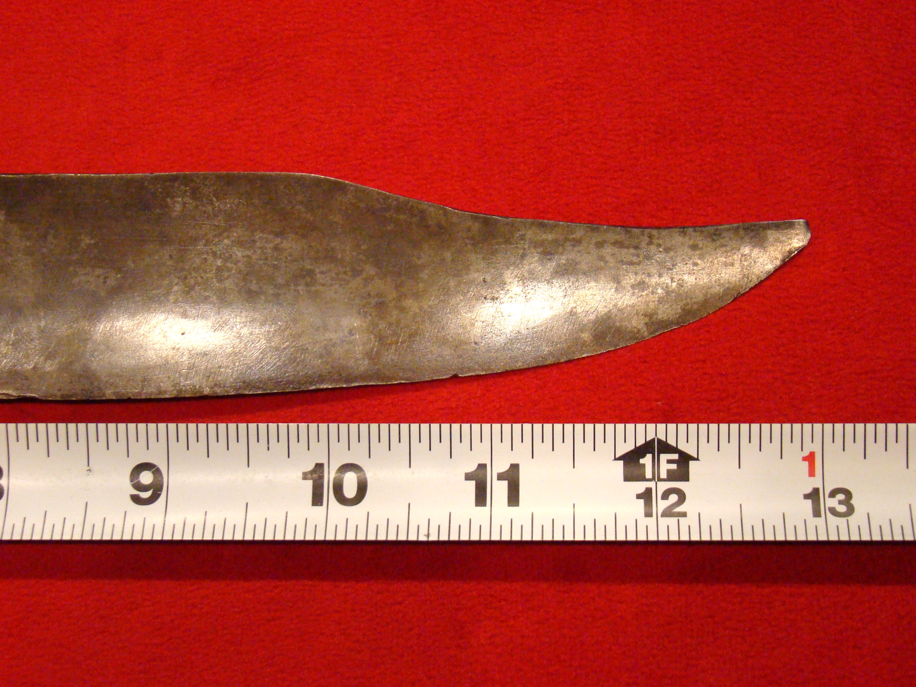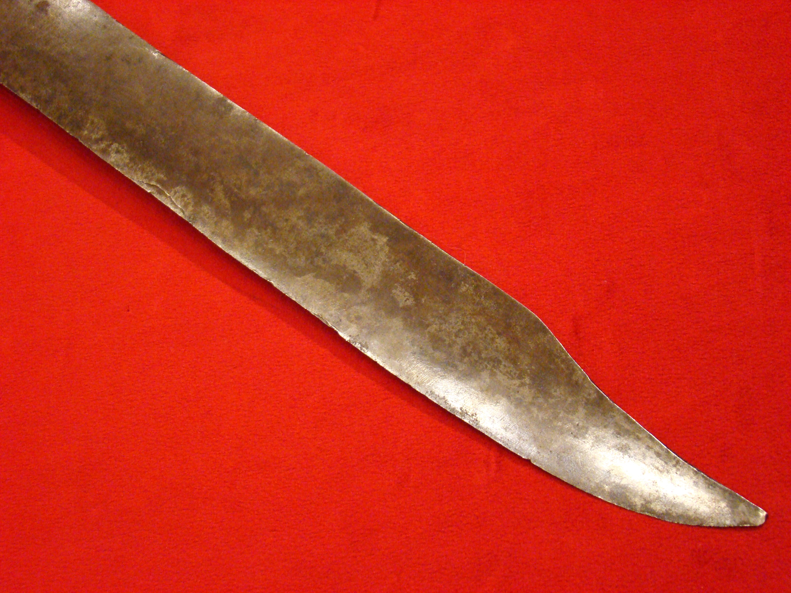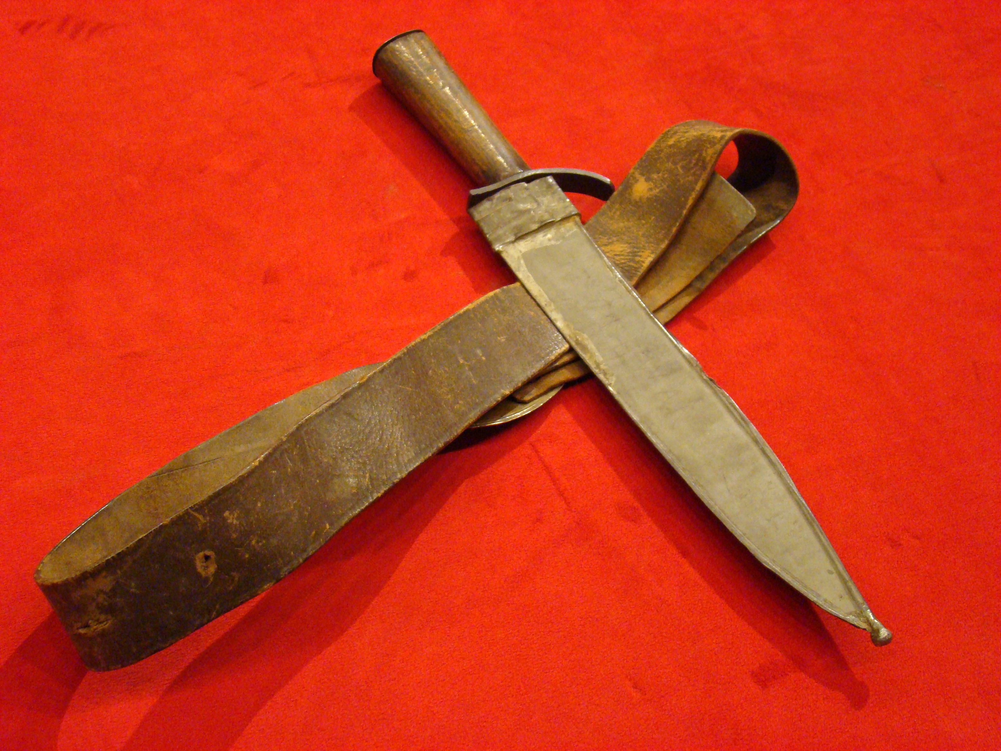This massive knife came from a Montgomery TX. family estate and resembles Mexican knives of the period. Note elongated clip-tip. Blade shows age and was made by a skilled smith. Hardwood grip is in great condition and may be made of Mesquite. I prefer to call this knife “Texican”, or an “Espada Ancha”. These knives actually date to the Mexican War and are the direct ancestor of the iconic Confederate “D-Guard” Bowie. See page 245 of Norm Flayderman’s reference book “The Bowie Knife: Unsheathing an American Legend” for some detailed discussion on these knives. Total length is 27″.