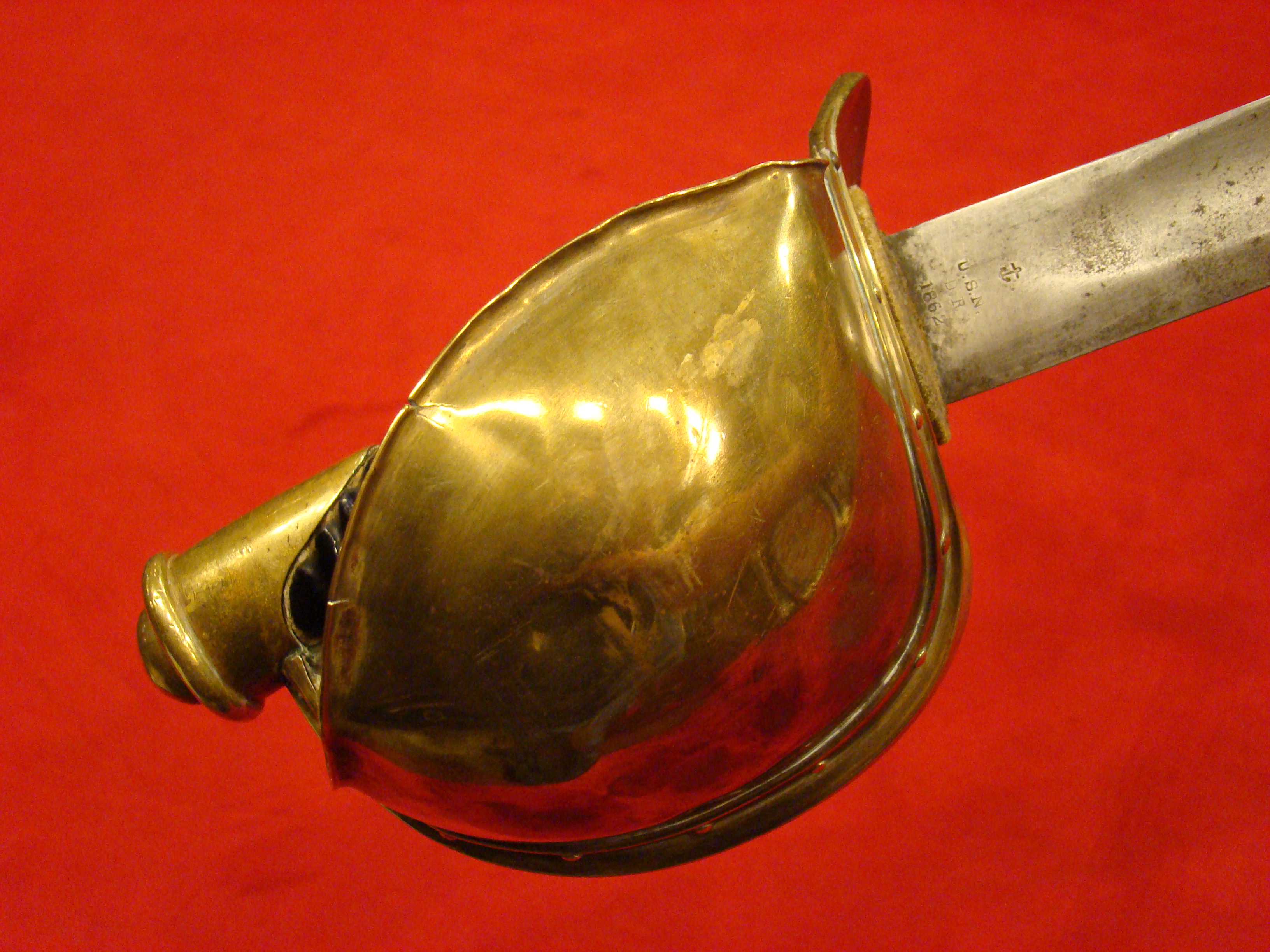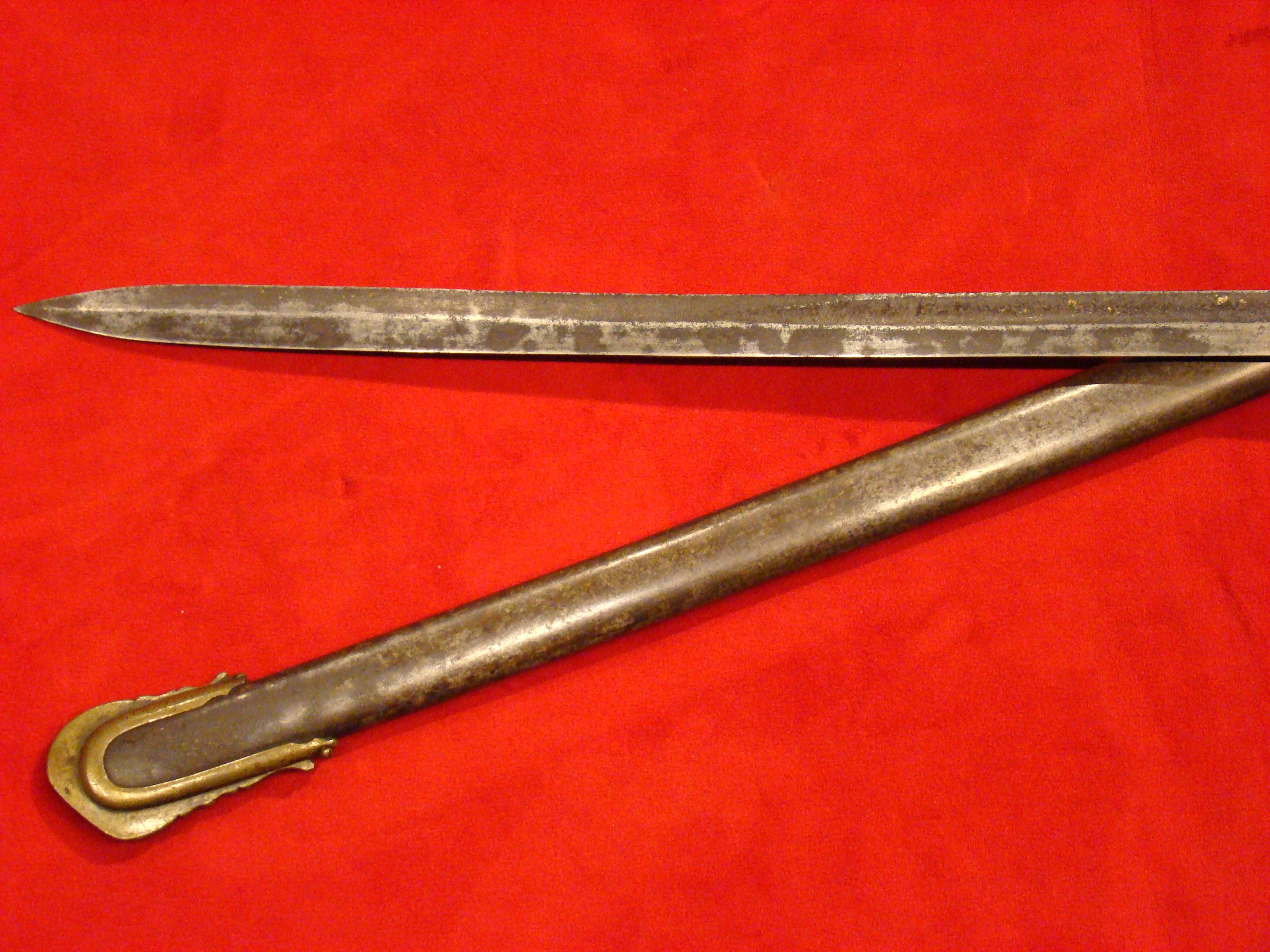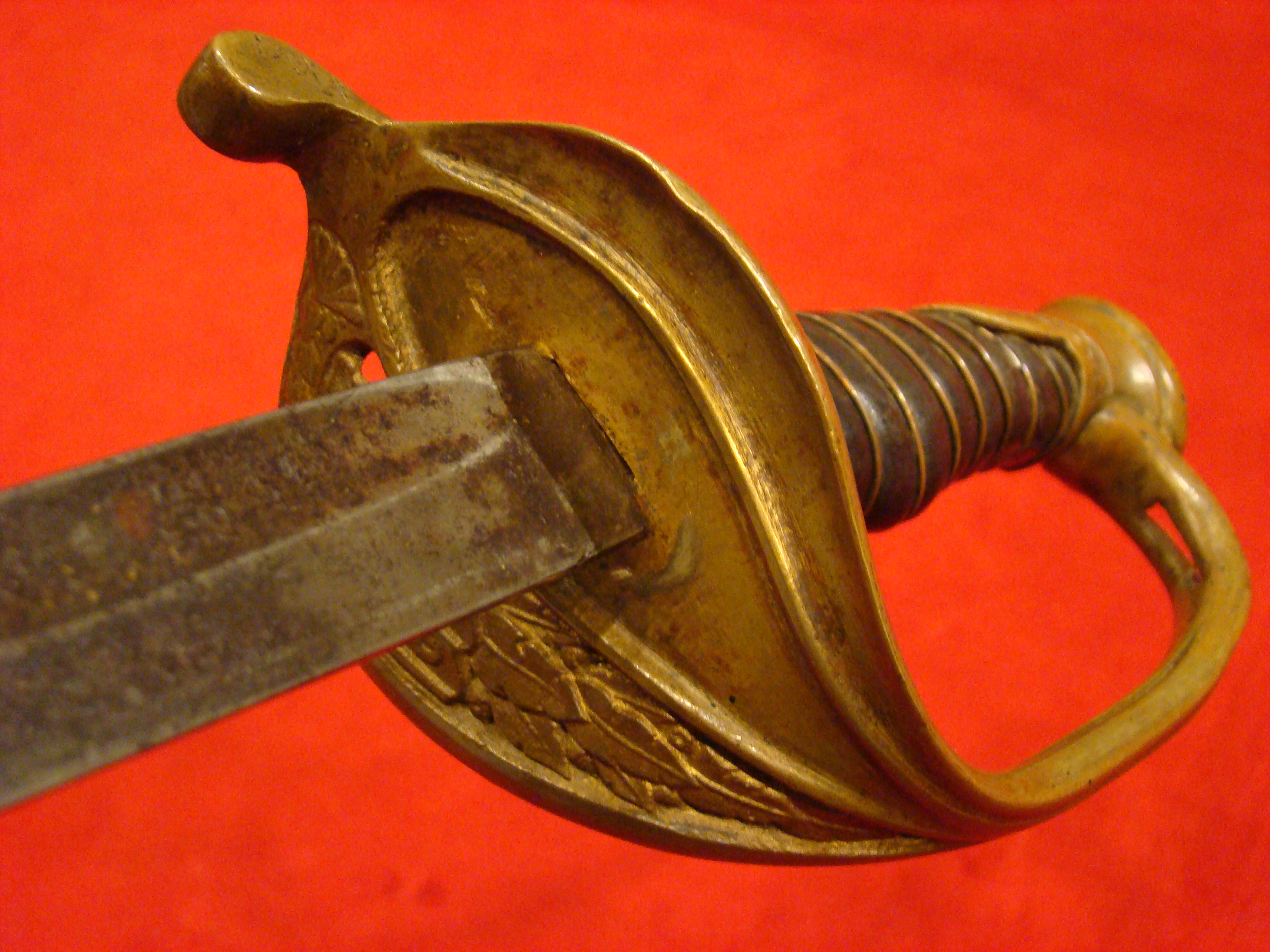 Totally untouched. Unusual design with small “US” letters in the highly decorated brass guard. Original patent leather grip and braided wire wrap is in excellent condition. Leather throat washer intact. German imported blade is lavishly etched with floral designs, “E PLURIBIUS UNUM” motto, and “US”. Semi-bright with areas of mild oxidation, particularly towards the tip. Fortunately, it has been left uncleaned. No nicks or sharpening. Leather scabbard is in very good condition. Brass mounts and drag have a deep mustard colored patina that matches the guard. Leather is smooth and supple.