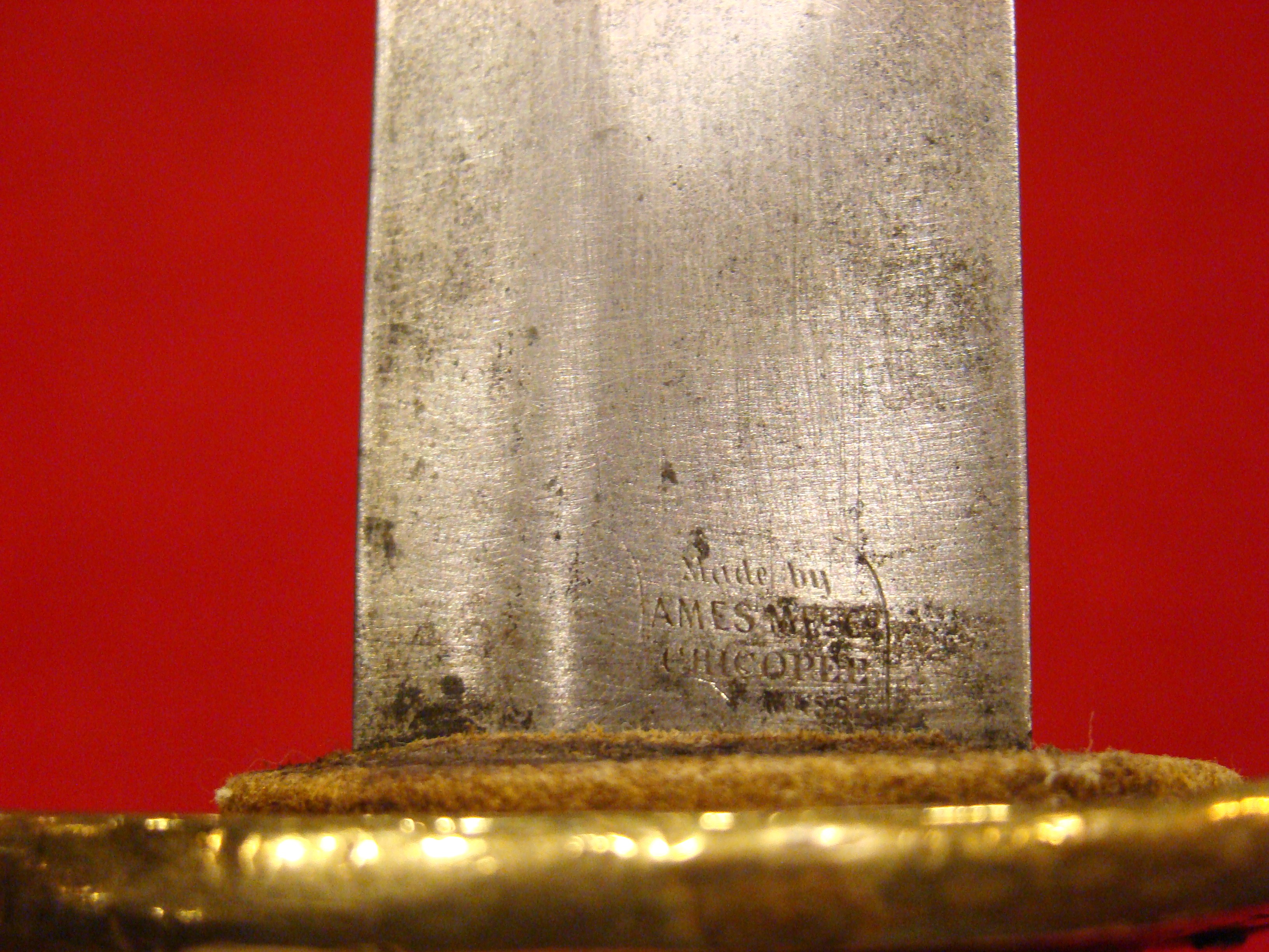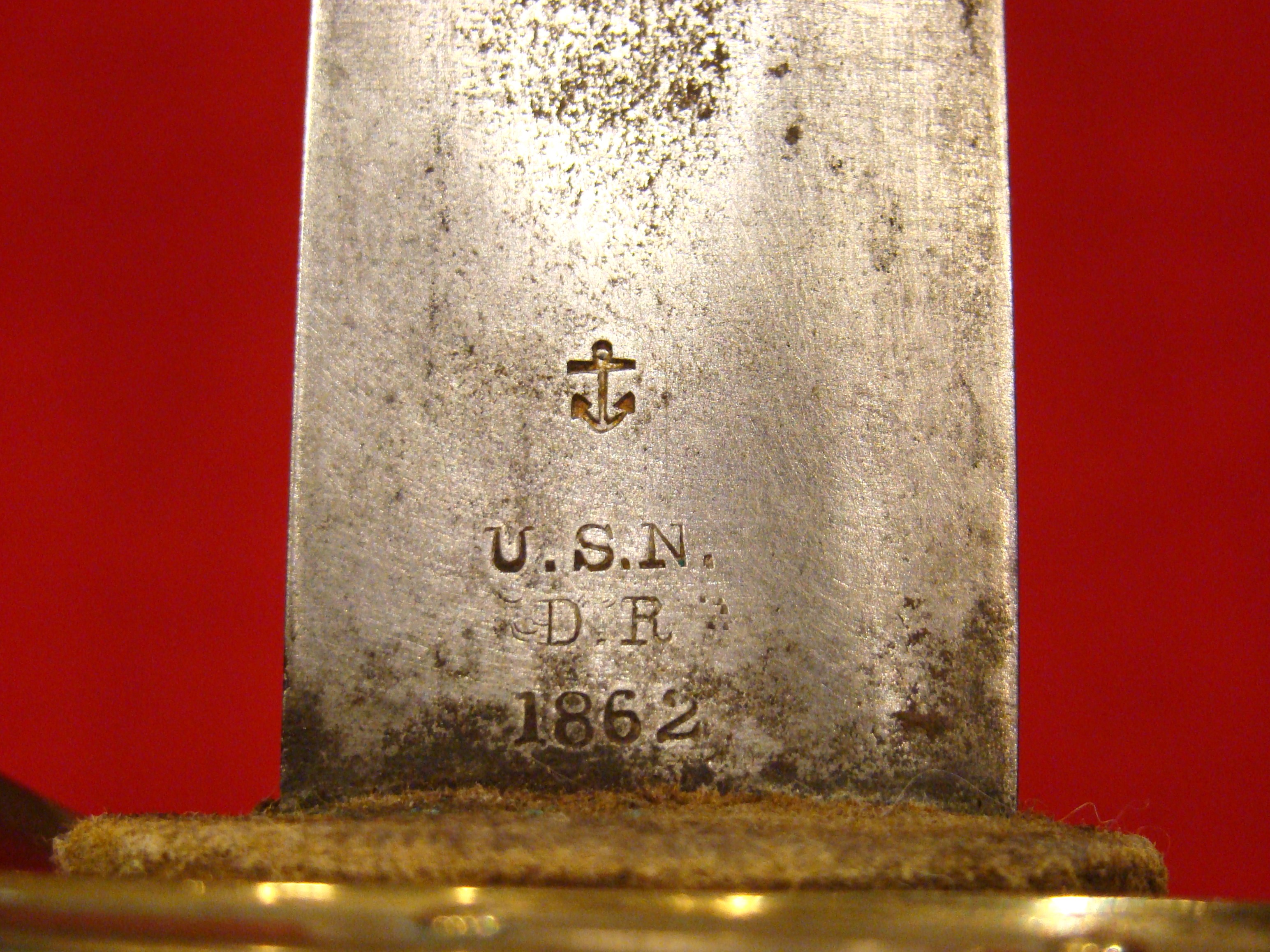 This is a really rare sword. Only 162 of these swords were purchased by the US Ordnance department in 1862. This one bears the inspector mark of Alfred D. King (A.D.K.) on one side of the ricasso, and is dated “1862” on the other. Condition is mint/unissued. Ornate guard is completely slathered in blazing gold plating and has “US” cut out in the design. Original sharkskin grip and braided wire wrap intact and superb. Blade is factory bright with frosting among the floral patterns, patriotic motifs and correct block “US”. No pitting or nicks. Scabbard condition matches the sword with bright gold plating on the mounts, throat and drag. Some of these Ames scabbards are marked with the Ames address, some are not. This one is not marked.
