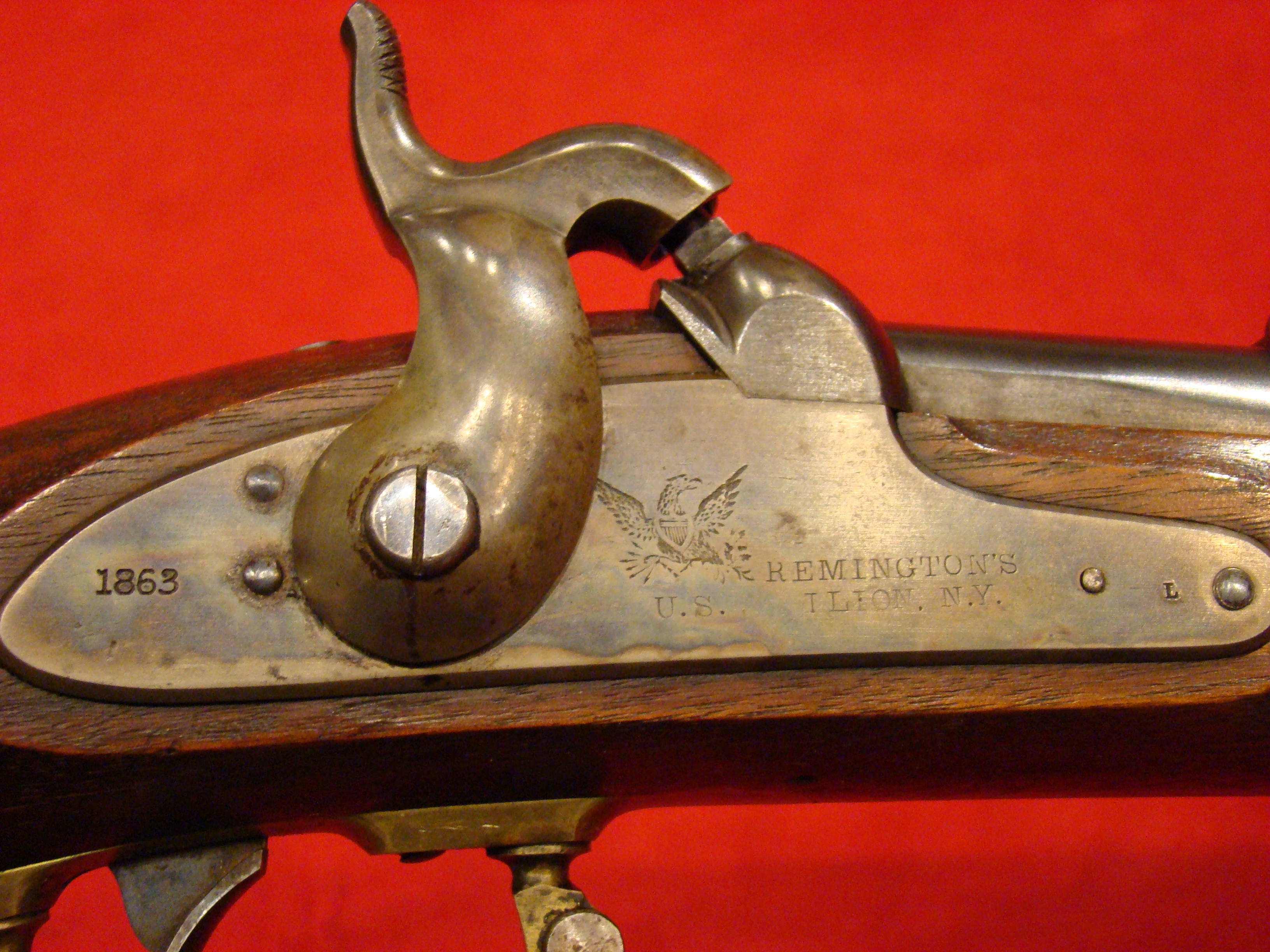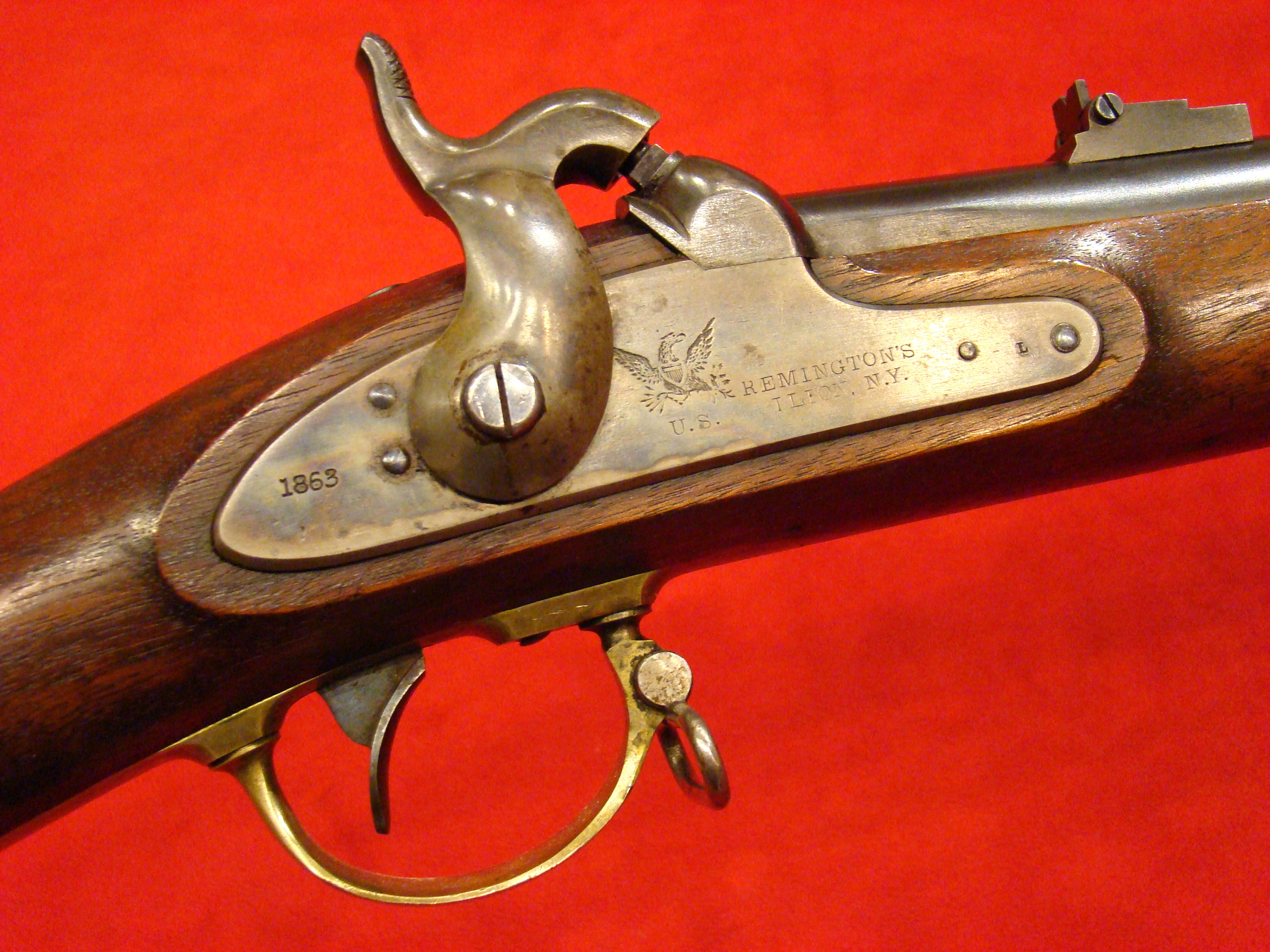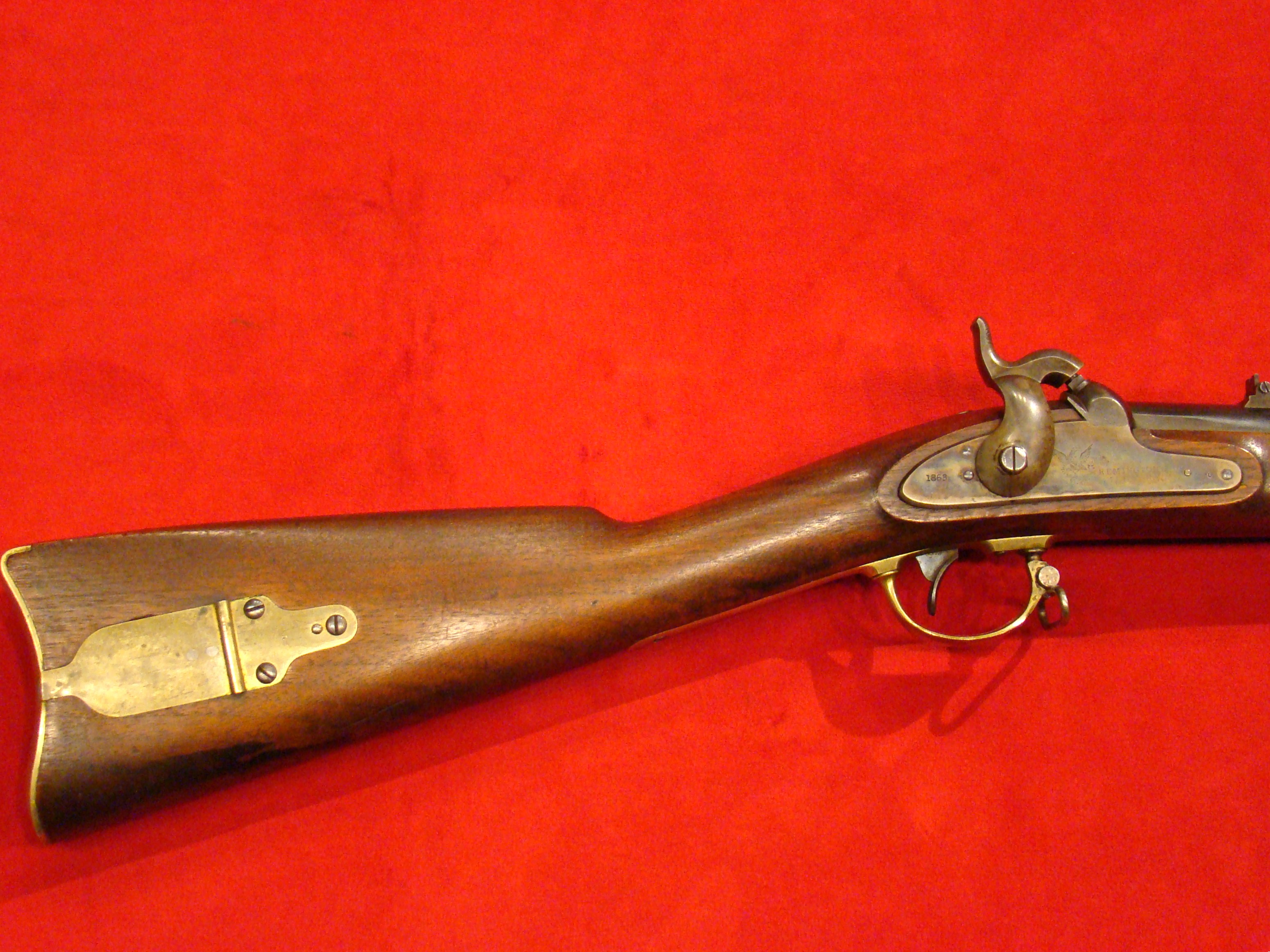 Scarce Civil War long arm. Only a few of these 1865 dated guns were inspected and delivered before the Confederate surrender in May of 1865. The remainder of the contract was not inspected by the US Ordnance Dept. but instead sold overseas. This gun is one of the few 1865 dated guns that was inspected, cartouched, and saw service at the tail end of the war. Condition is very good indeed with clean metal surfaces. No pitting. Patina turning mottled gray. Lock clearly marked with Remington Address and dated 1865. Original long range sight and ramrod present. US Eagle Head/VP proofs on breech. 1865 barrel date clearly visible. Stock also very good with only very minor cosmetic wear. No cracks, repairs or missing wood. Outlines of two US Military Inspector Cartouches present on the flat opposite the lock.