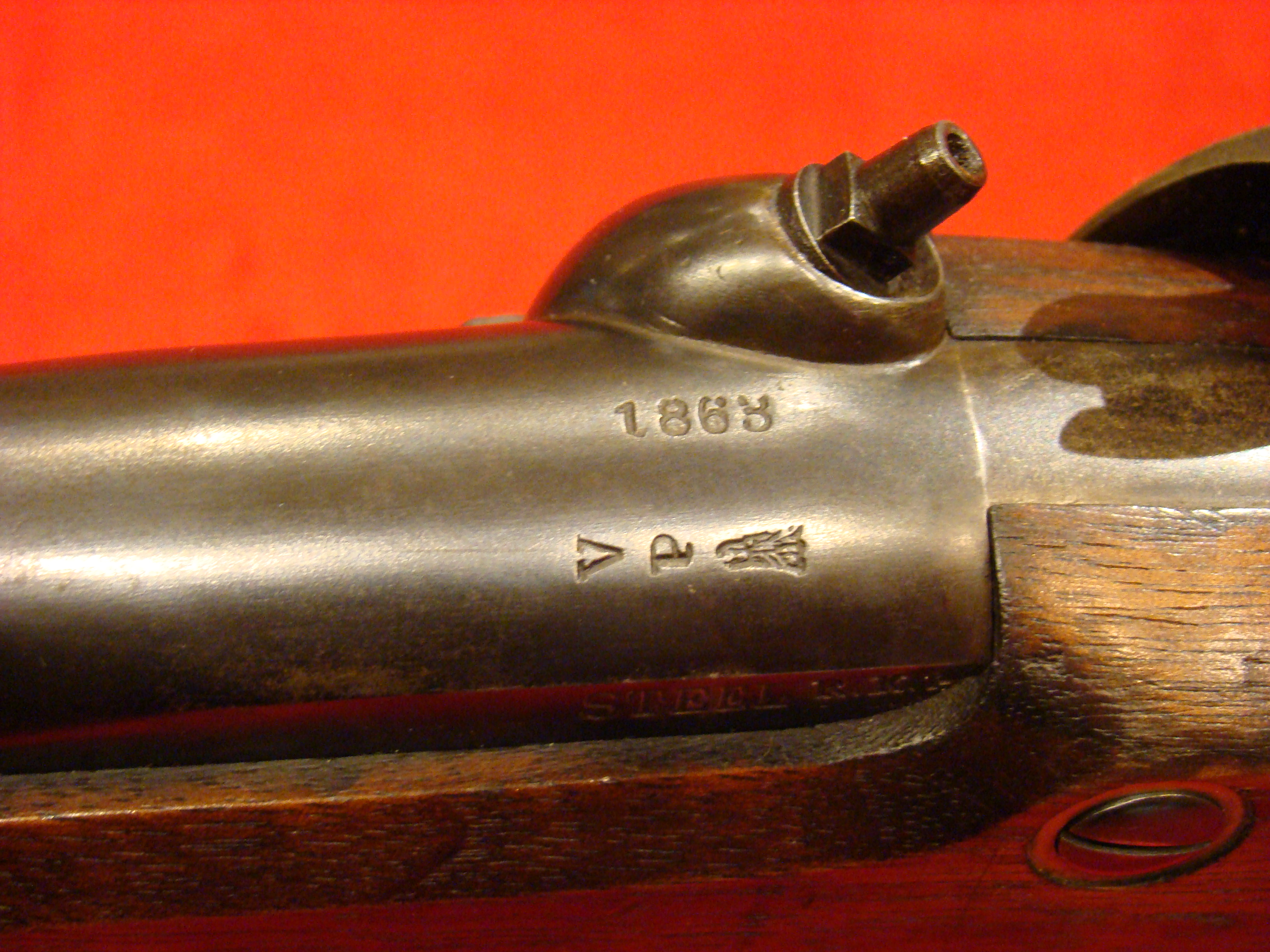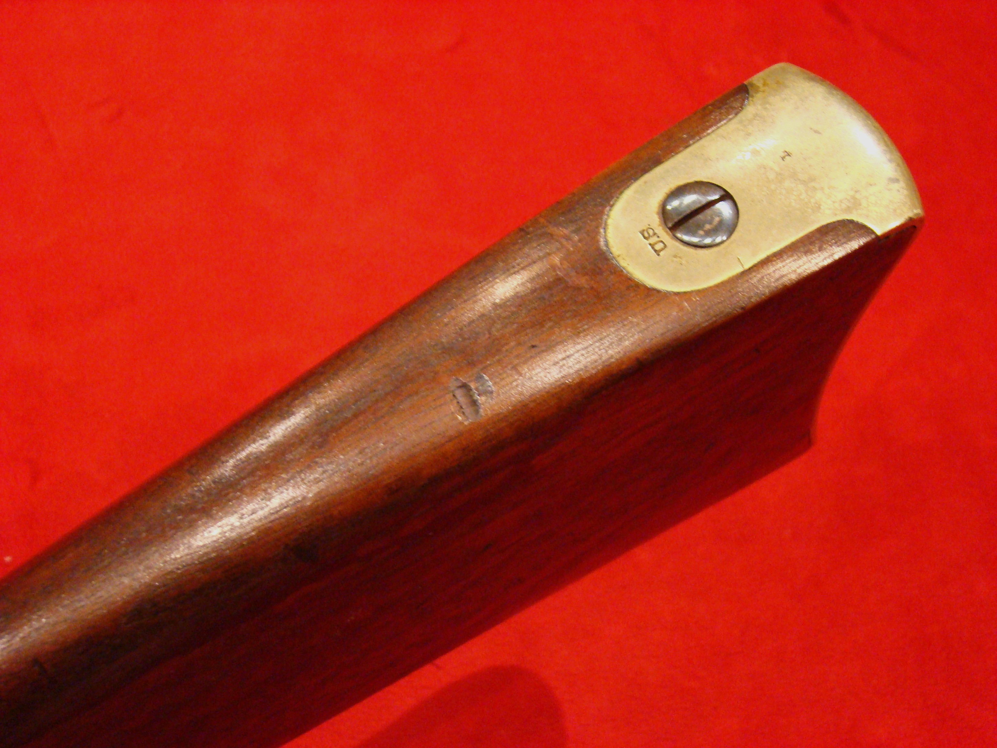 The classic US Infantryman’s weapon of The American Civil War. Very good condition. Lock is dated 1862. Trigger, mainspring, and hammer mechanism is crisp. Metal surfaces are smooth with evidence of old cleaning. Minor oxidation near the nipple and on the butt-plate. 1862 Barrel date partially visible. Clear “VP”/Eagle head inspection proofs on breech. Bore has strong rifling. Original long range leaf sight present, as is the original ramrod. Stock retains sharp edges and raised wood grain. There are some scattered scuffs and a dent adjacent to middle barrel band. Very faint outline of US Inspector’s Cartouche on flat opposite the lock. Original army issue leather sling is present and in good shape. At one time, this gun was on display in a museum. There is an old collection tag on the butt-stock that reads: “No. 25. U.S. Springfield Musket stamped 1862, was found by A.S. Archison? (possibly Archibald) in a cave beside a man’s bones in California.” You can only imagine the story behind this situation. Did the man die of thirst or hunger? A snake bite? Killed by Indians? We may never know.