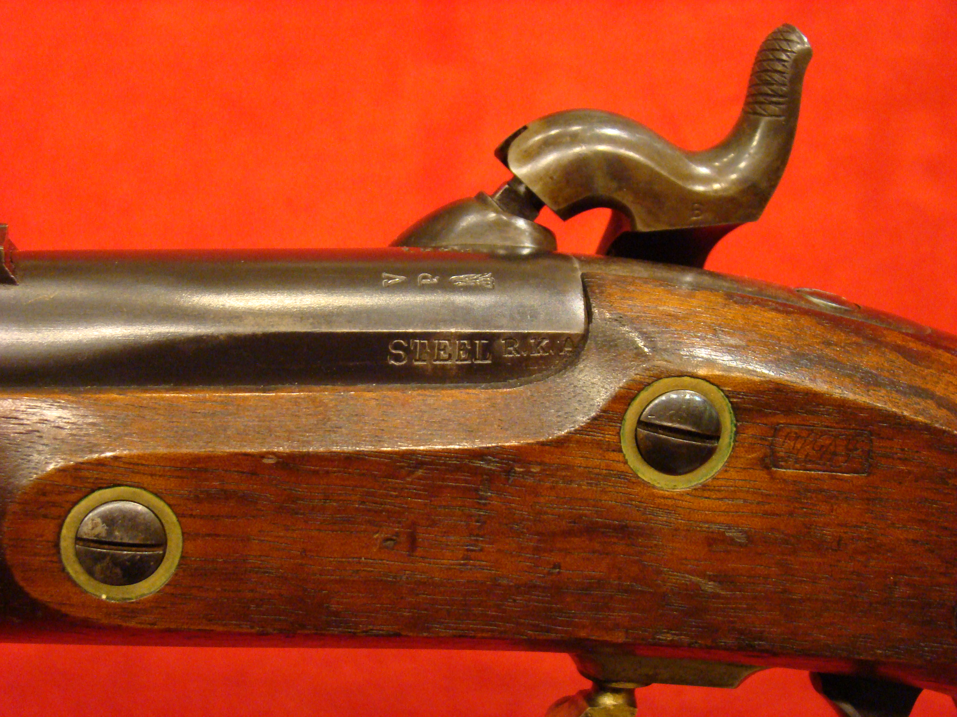 Quality example of the “Brown Bess” type produced by Ramsay Sutherland under contract to the New Brunswick (Canada) Militia ca. 1820. Lock is marked “RAMSAY SUTHERLAND” forward of the hammer and “LONDON” to the rear. Lock is mechanically sound. The hammer is original but from an earlier pattern Brown Bess. Threaded tip ramrod (possibly a replacement) present and kept in place by three brass ramrod sleeves. Both shoulder sling loops are original and intact. Bore is clean with no pitting. Stock has nice, unsanded edges with minimal service dings and blemishes. There is a minor sliver of replaced wood underneath the forward terminus of the lock. The finish on the stock has an ancient and attractive patina. Neatly carved into the but-stock is “WESTMORELAND M/No. V” and “E“. This represents Westmoreland County (New Brunswick) and probably 5th Regt. Company E. The classic Brown Bess socket bayonet is marked “J. SALTER” (The chosen sword maker of Admiral Lord Nelson) fits the barrel nicely and matches the patina of the barrel.