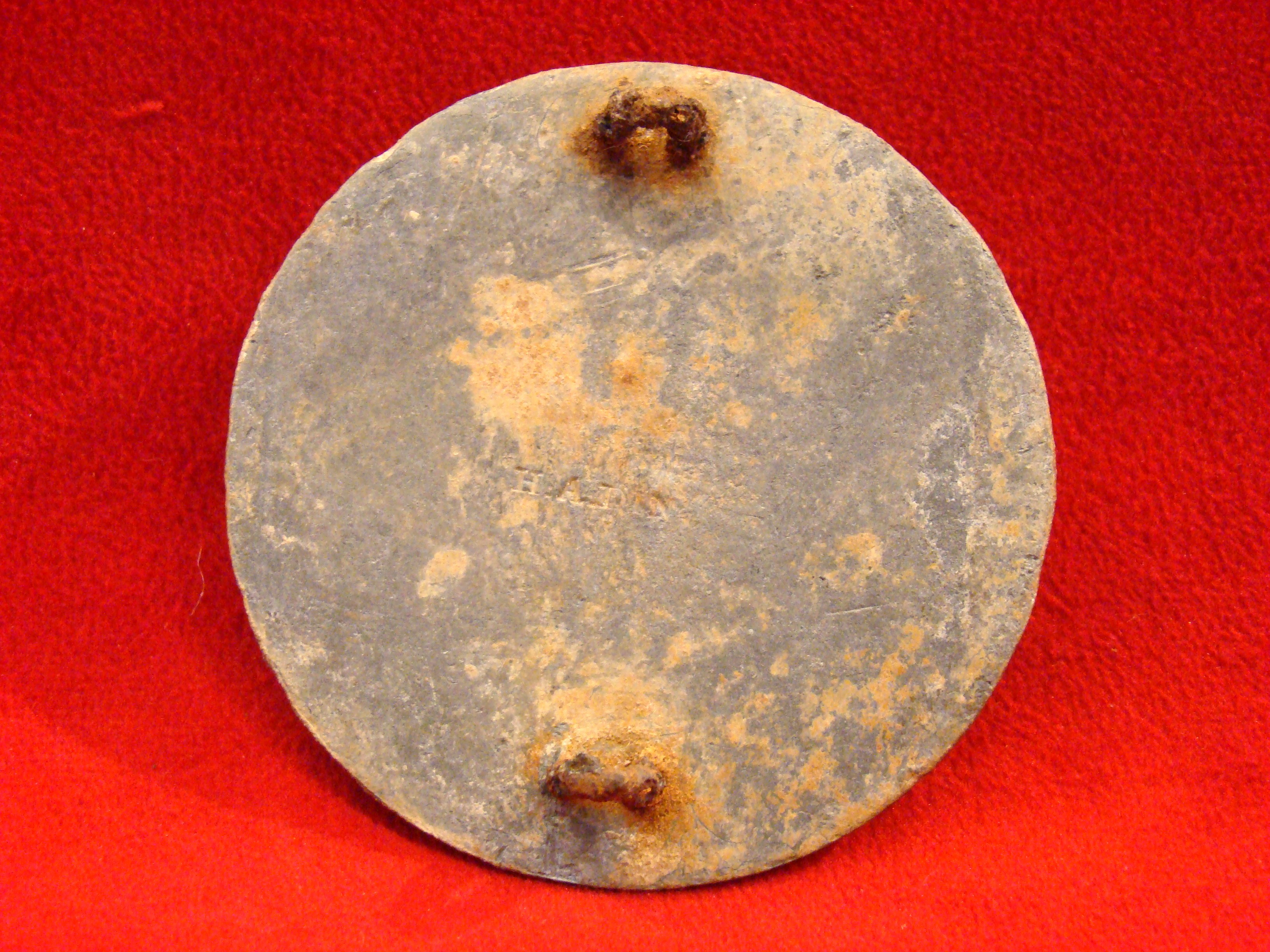 Fine looking plate with a smooth chocolate brown patina. One of the iron attachment loops has been broken or rusted away. These smaller size plates are relatively scarce and may have some association with Maine soldiers. Provenance of Northern VA.