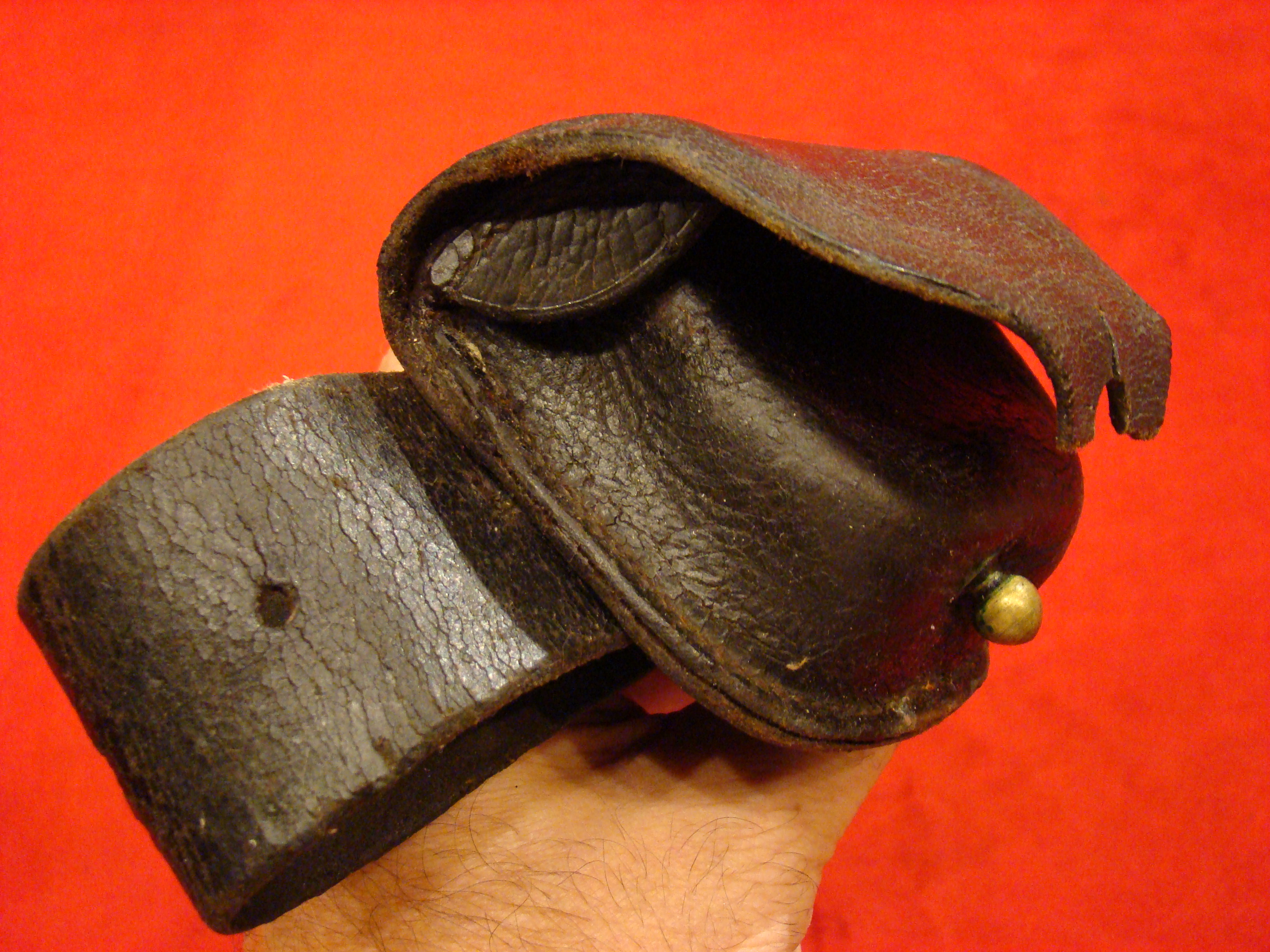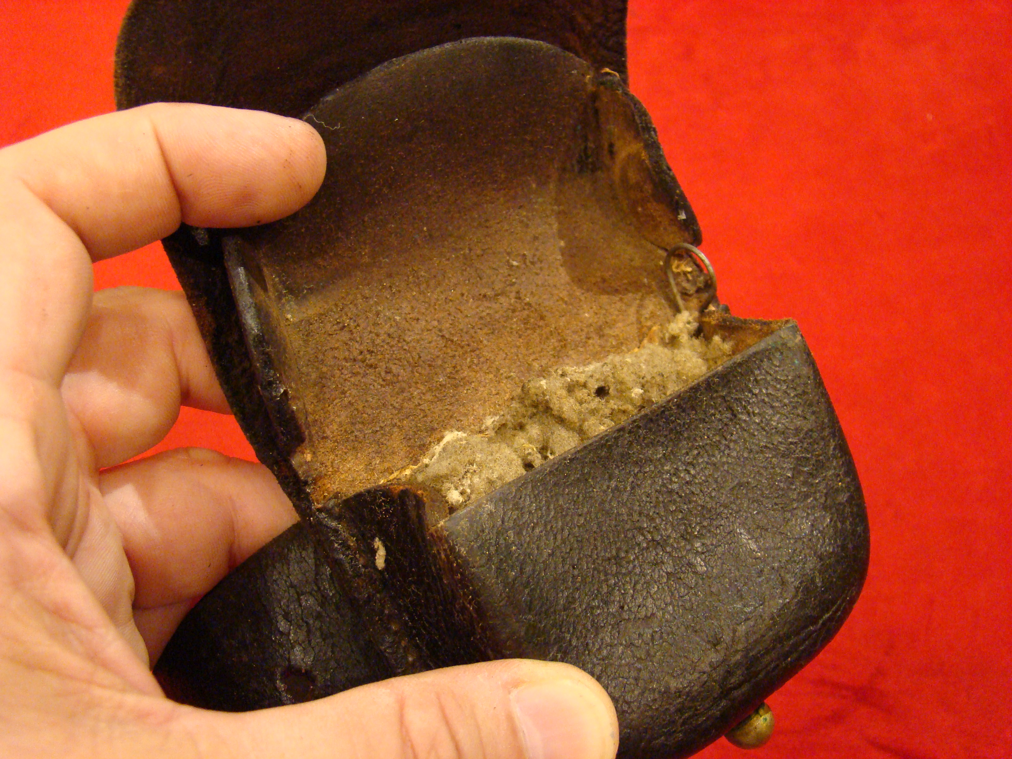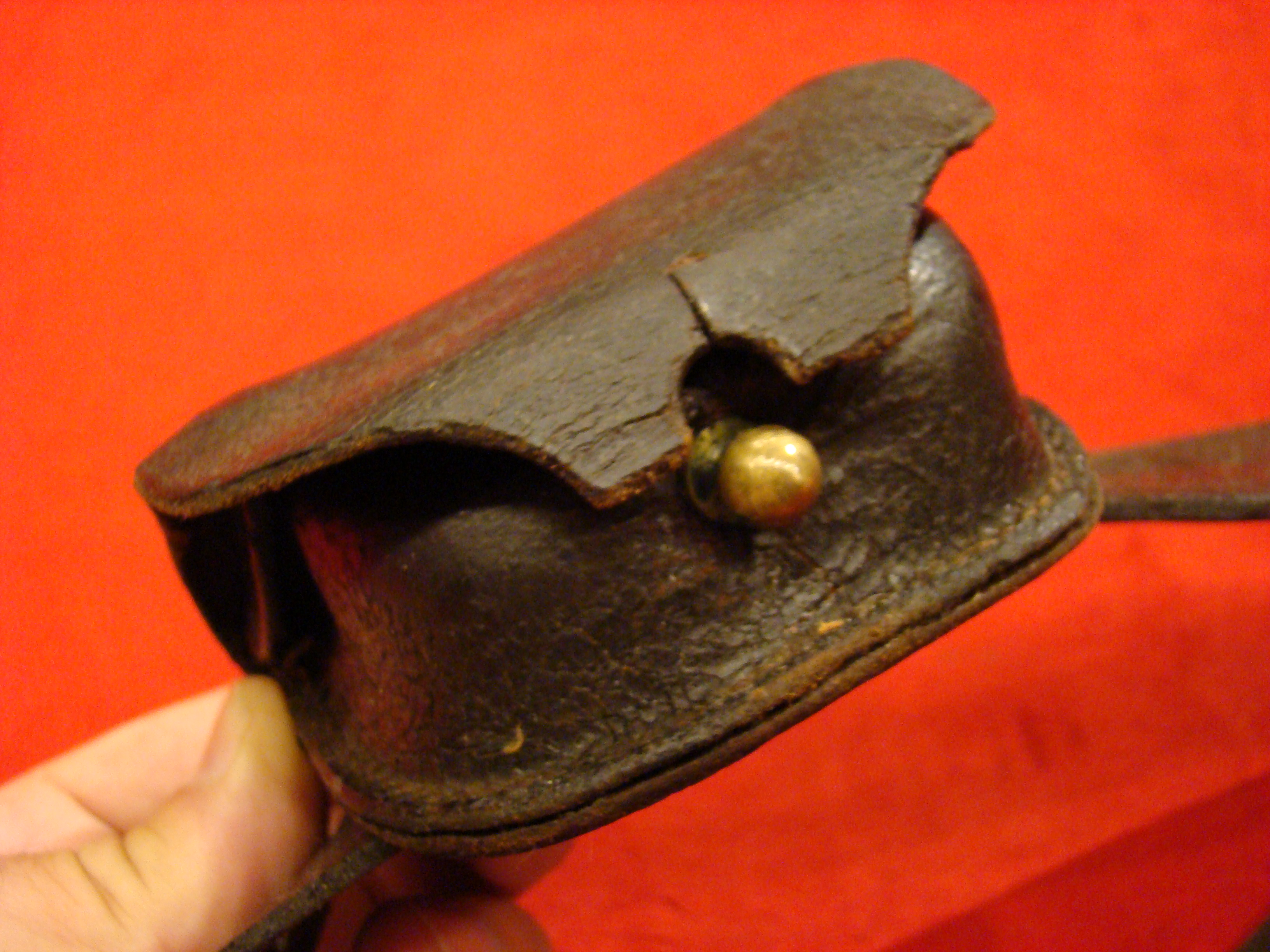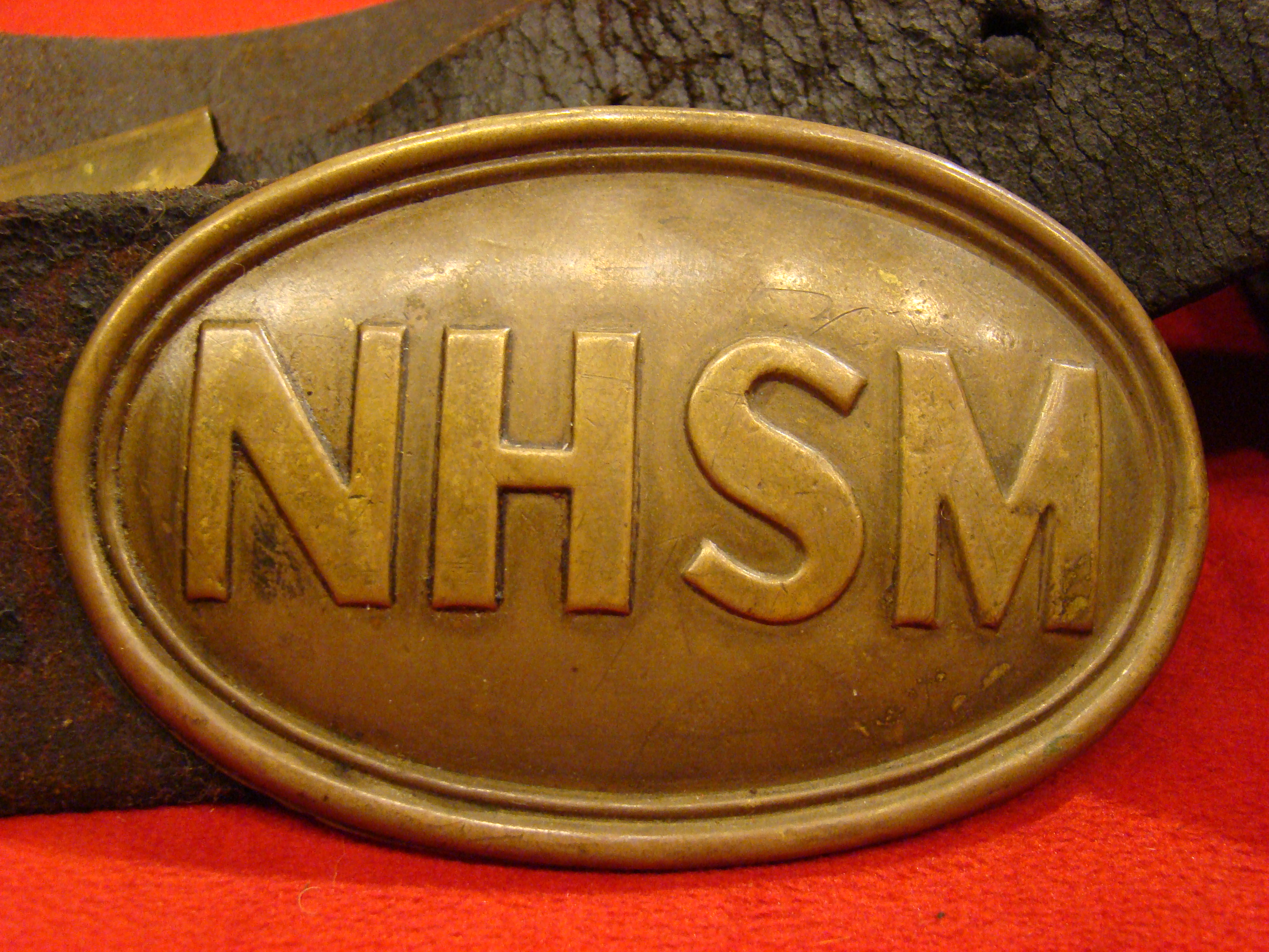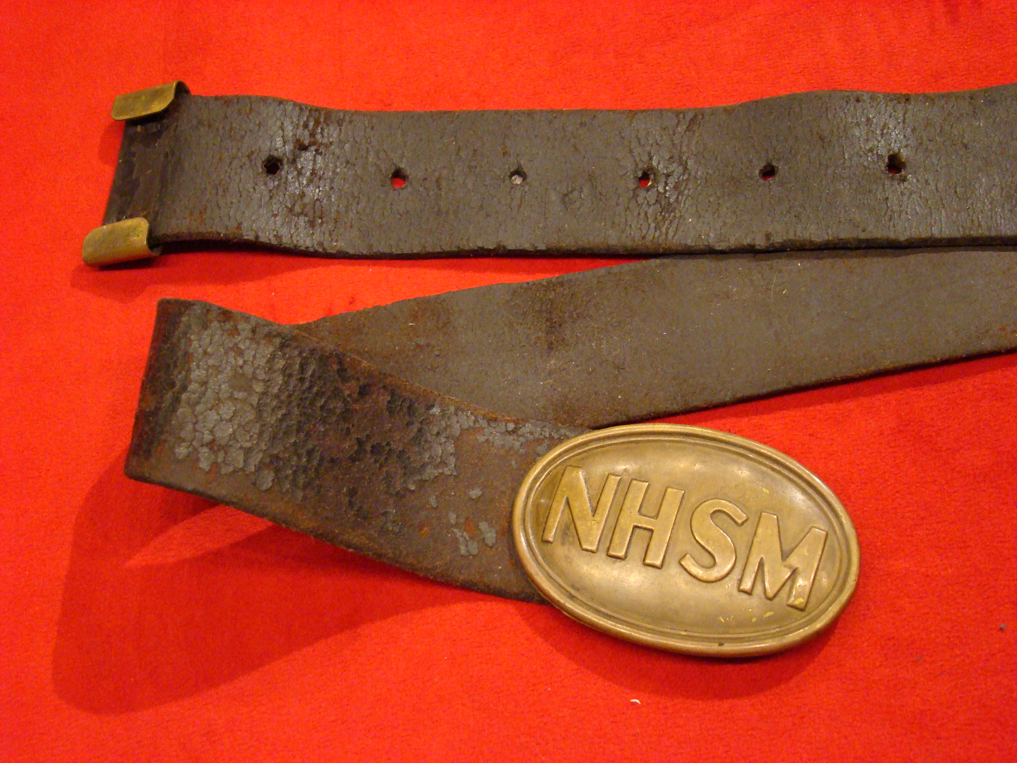 Very rare belt rig with original percussion cap box. Absolutely Civil War issue. The lead filled belt buckle is flawless and was produced the same contractor that made the large “US” shown on page 312, Fig. 504 of O’Donnell and Campbell’s reference book “American Military Belt Plates”. Most likely a Watertown NY. Arsenal product. I have seen one excavated example of the “NHSM” buckle. Condition is excellent overall. The cap box is a little salty with broken latch tab, but does retain wool lining and nipple pick. Some collectors believe that these accoutrements were issued at the end of the war or slightly after.