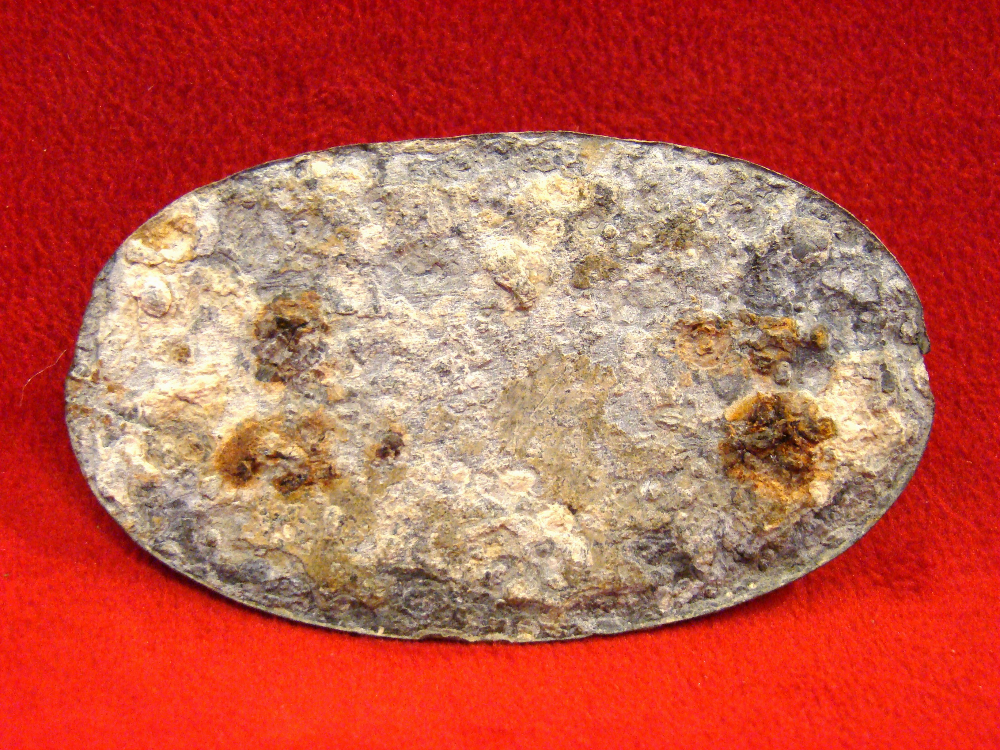 Great looking US oval with intact belt hooks and full lead. Maker marked “W.H. SMITH/BROOKLYN”. The classic American Civil War US buckle. Found many years ago by James Tubbesing near Winchester VA.