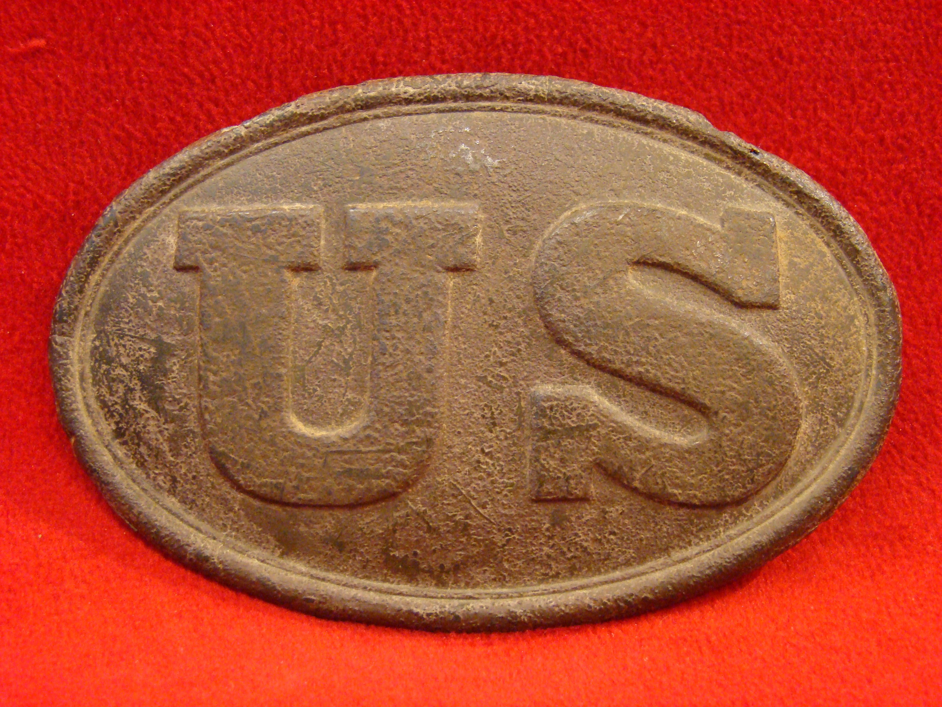 Watertown Arsenal Contract US belt buckle with arrow hooks. This variant is shown on page 312, Fig. 504 of O’Donnell and Campbell’s reference book “American Military Belt Plates”. These buckles have been recovered in early Civil War sites, particularly Shiloh. I have noted examples of the matching cartridge box plates on Watertown NY. Arsenal marked cartridge boxes. This buckle has an untouched patina and shows service wear.