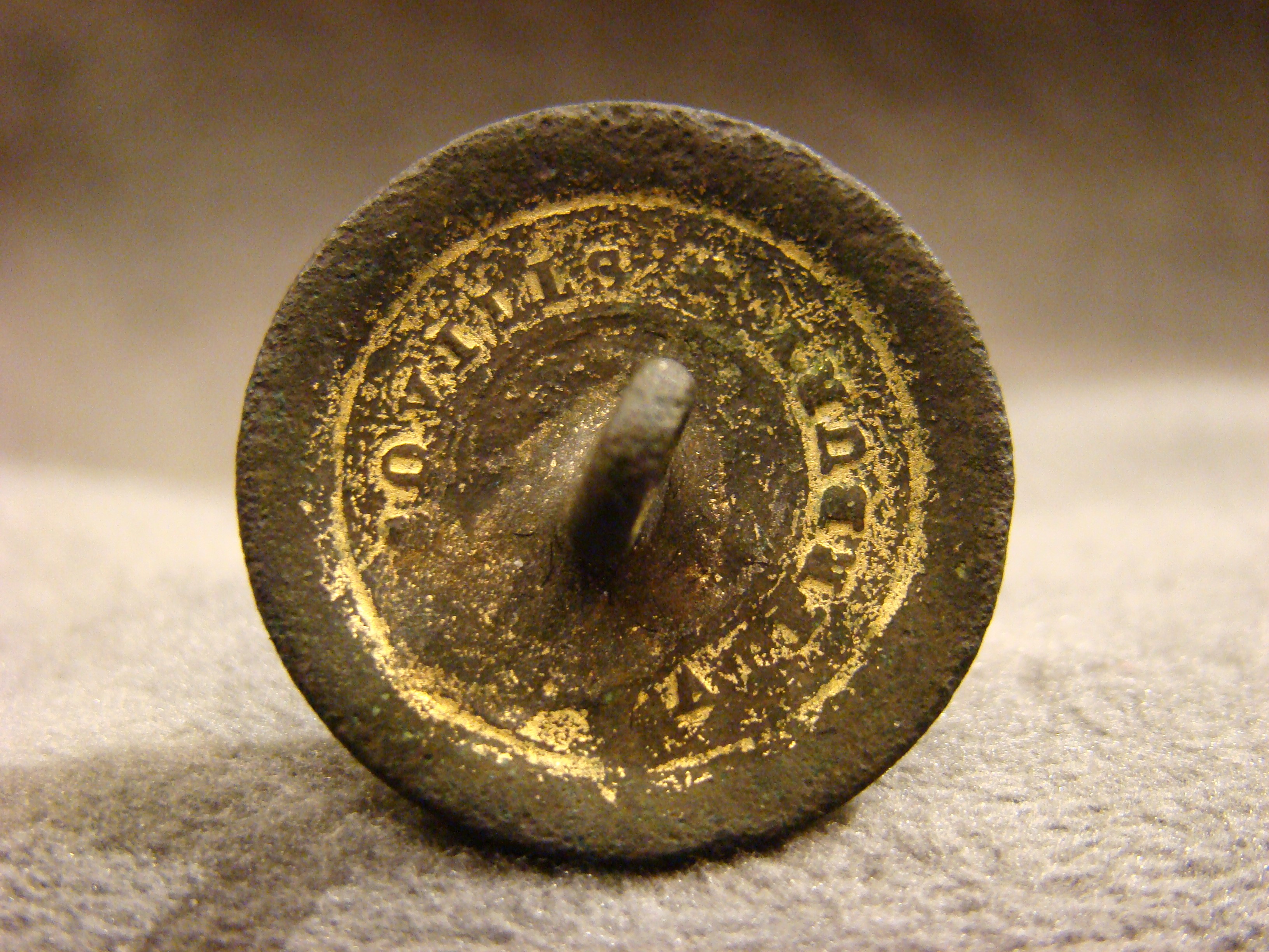 TE 3 (Alberts), 23 mm. Rarely seen excavated. Early one-piece button in great condition with a chocolate brown patina and gold plating in all the right places. Perfect shank. “SCOVILLS/WATERBURY” bm. Found near Fredericksburg VA.
