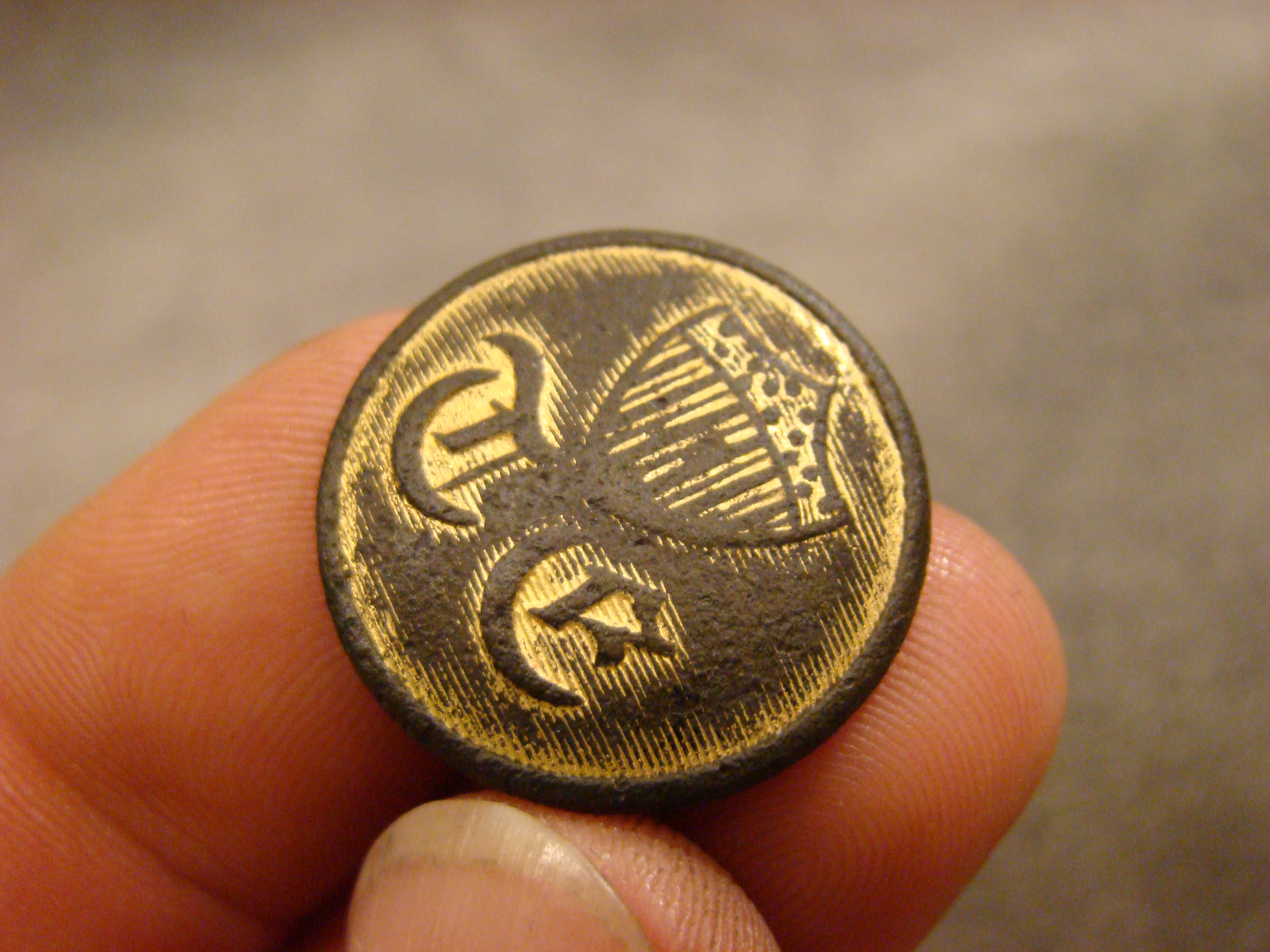 CV 1, 23 mm. Large size Eagle with “C” in the shield. Bright gold plating and sharp details. Looks much better in hand than in the pictures. “HORSTMANN & ALLIEN” bm. Found near Fredericksburg VA.