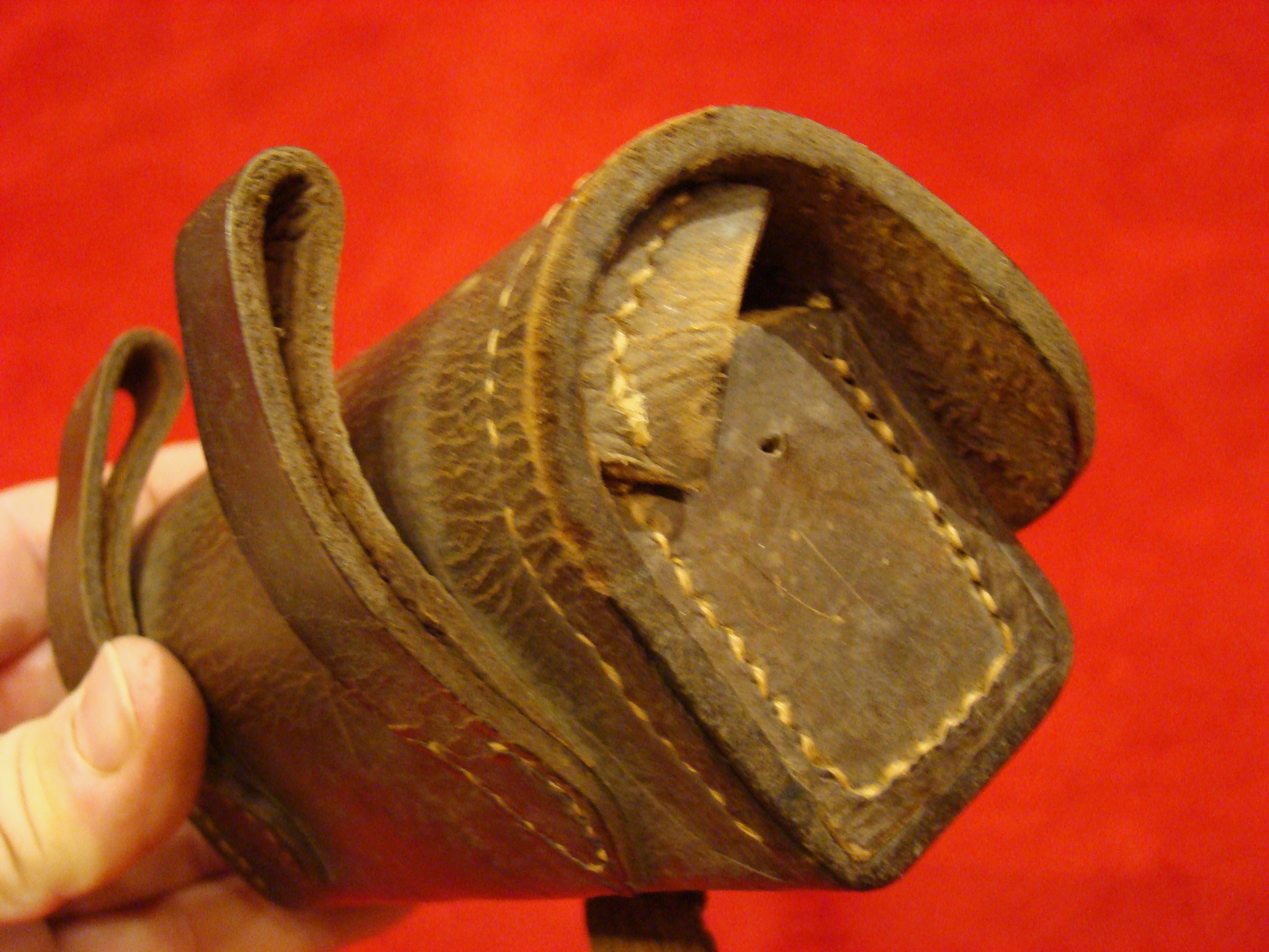Very good example with supple leather, intact belt loops, latch tab, wool lining, and nipple pick. Box is unmarked.