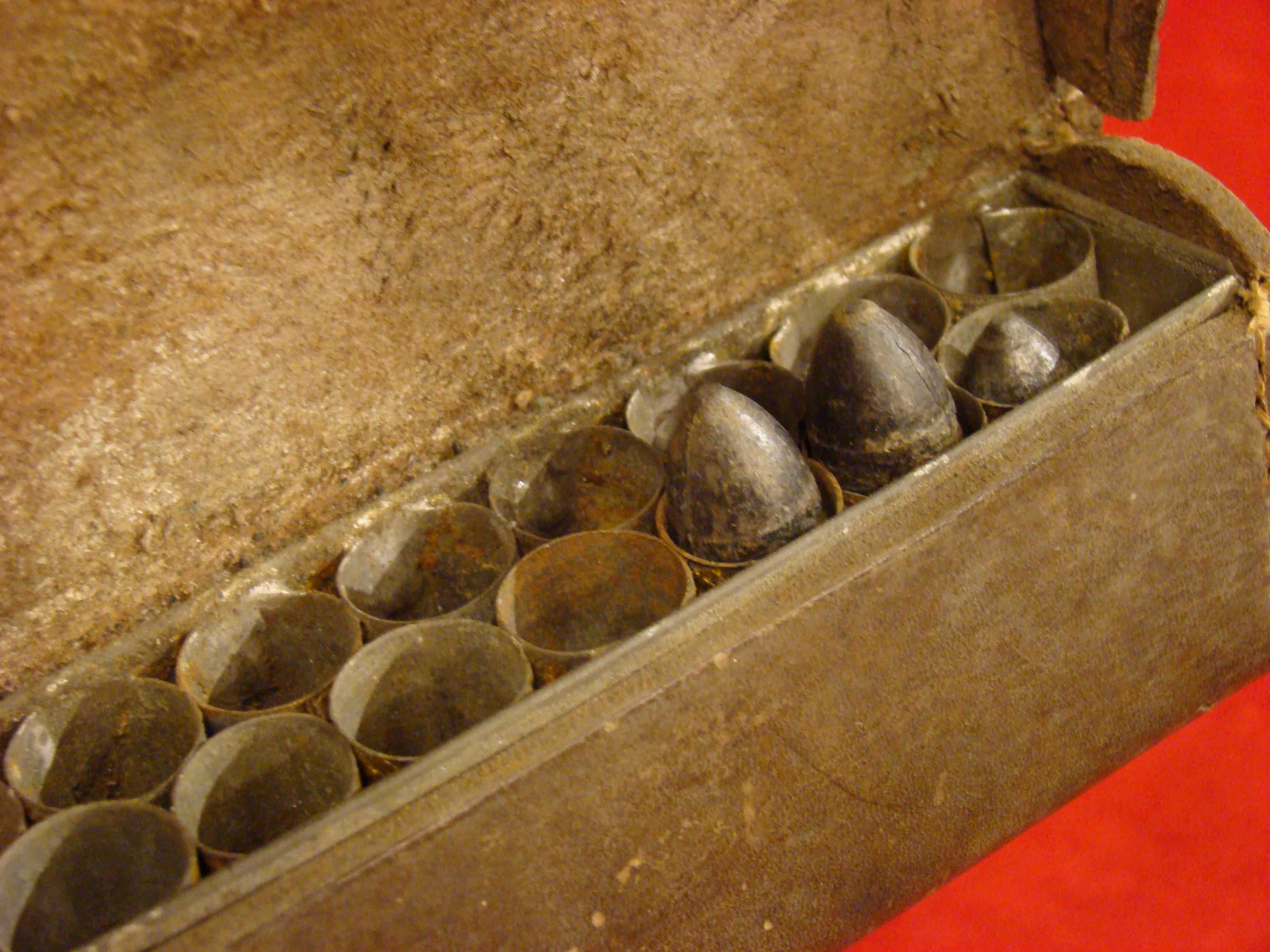 From the standpoint of rarity, condition, and appearance, this one has it all. Probably the finest known survivor. Confederate leather accoutrements are scarce, and when encountered, usually in rough, well worn condition. This cartridge box has very sturdy construction. The leather retains its original smooth polished surface. No flaking. All stitching intact and tight. Latch tab and belt loops intact. Note lead finial. Inside the flap is the original tin liner with individual tubes for the cartridges. Remnants of four Sharps cartridges are inside the box. They appear to be Federal cartridges and may have been added along the way for display. This piece is ideal for the Confederate Cavalry collector who has an S.C. Robinson or Richmond Sharps, Tarpley, Cook and Brother, Rising Breech, or any other Confederate Carbine. These don’t come along every day.