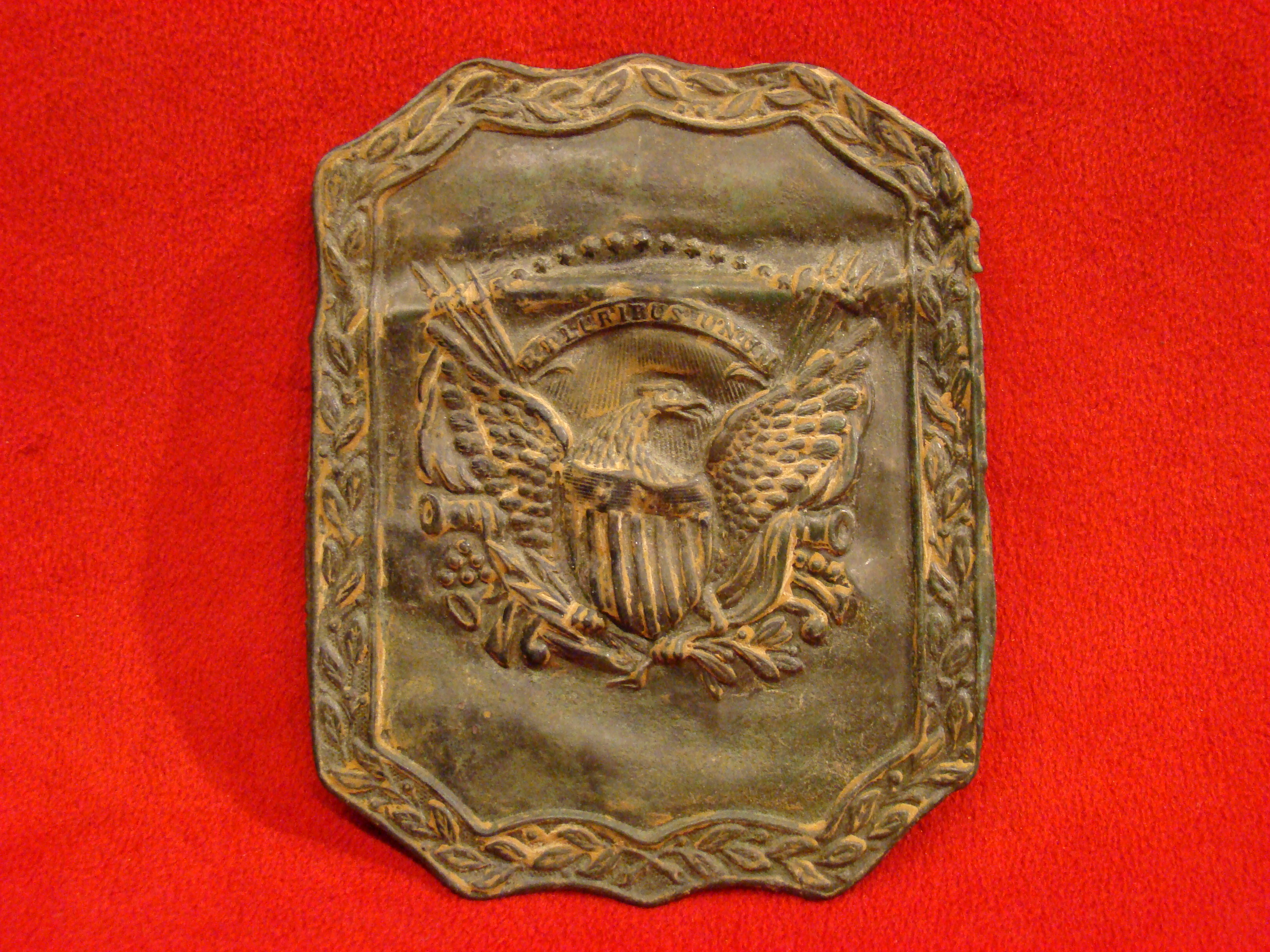 Scarce stamped brass hat plate in remarkable condition. No cracks or repairs, only some minor ripples. Provenance uncertain. This early variant is shown on page 276, Plate #631 of O’Donnell & Campbell’s reference book “American Military Headgear Insignia”.