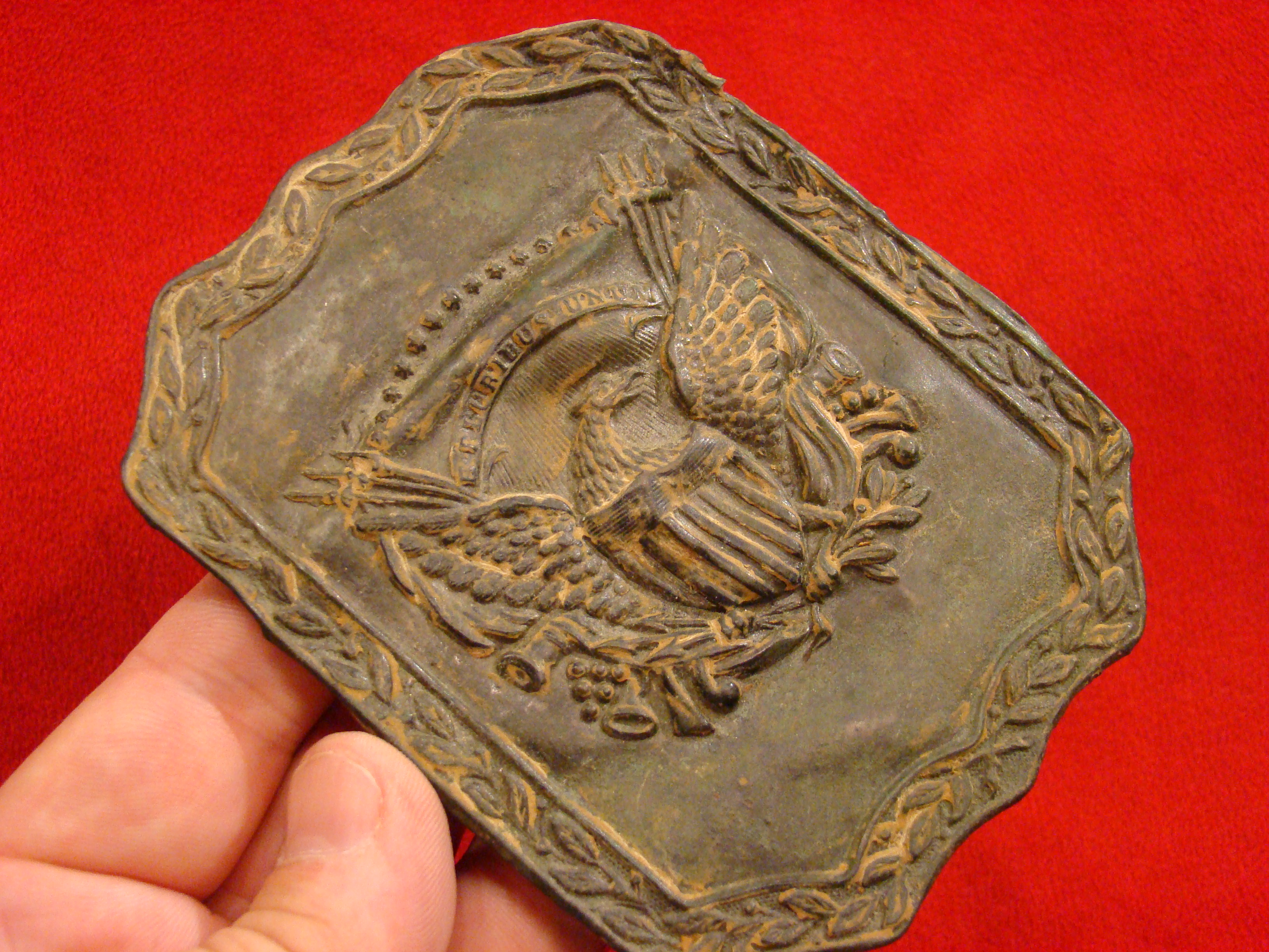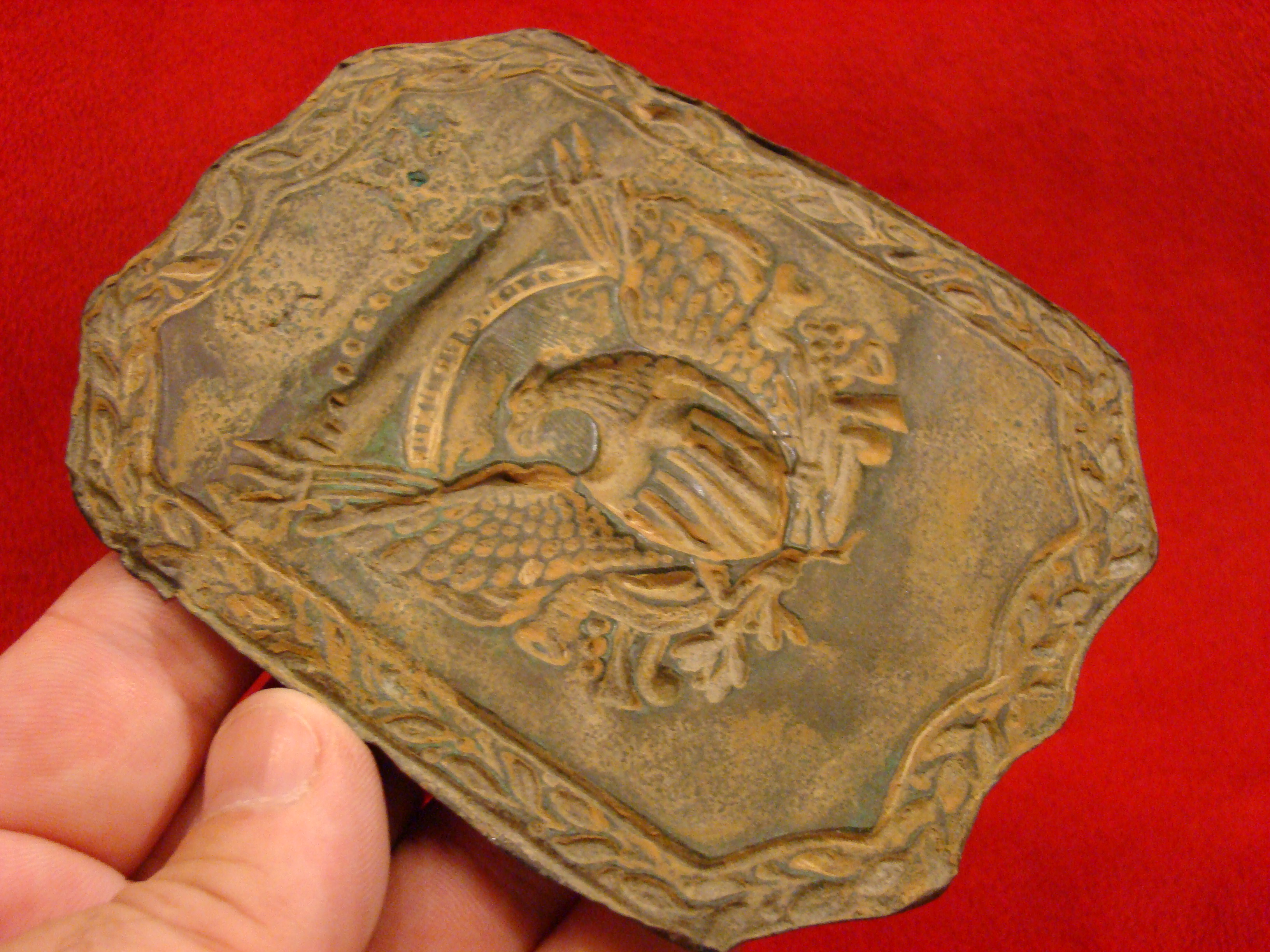 Large size variant of this star within a shield insignia that was originally mounted on the chest strap of a horseman’s harness. Made of lead filled stamped brass, and usually found in Confederate contexts. It may be A Texas or Mississippi cavalry insignia. Provenance pending.