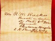 Shepherd enlisted in Co. A, of the 18th Louisiana Vol. Infantry on Oct. 5th, 1861 at Camp Moore LA. He served throughout the war, was promoted several times, and ultimately paroled at Nachitoches LA. on June 6th, 1865. More research should be done. Canteen itself is a very good example of the classic Confederate issued “Gardner Pattern”. The iron bands and sling bars exhibit attic type oxidation. Clearly incribed on one side are Shepherd’s initials “CMS”. Accompanied by an old typed tag with Shepherd’s service information. Ex. Bill Blackman collection.