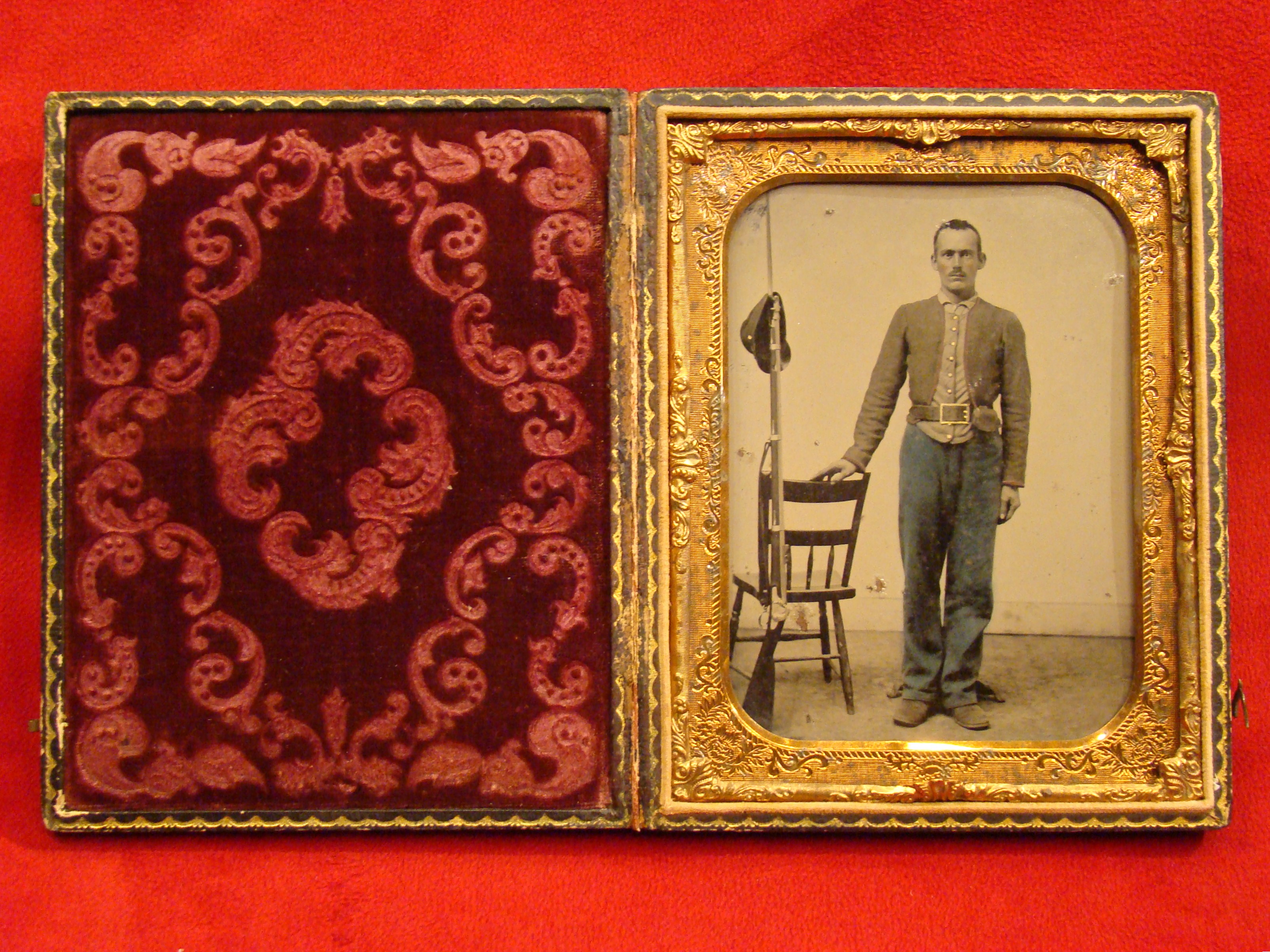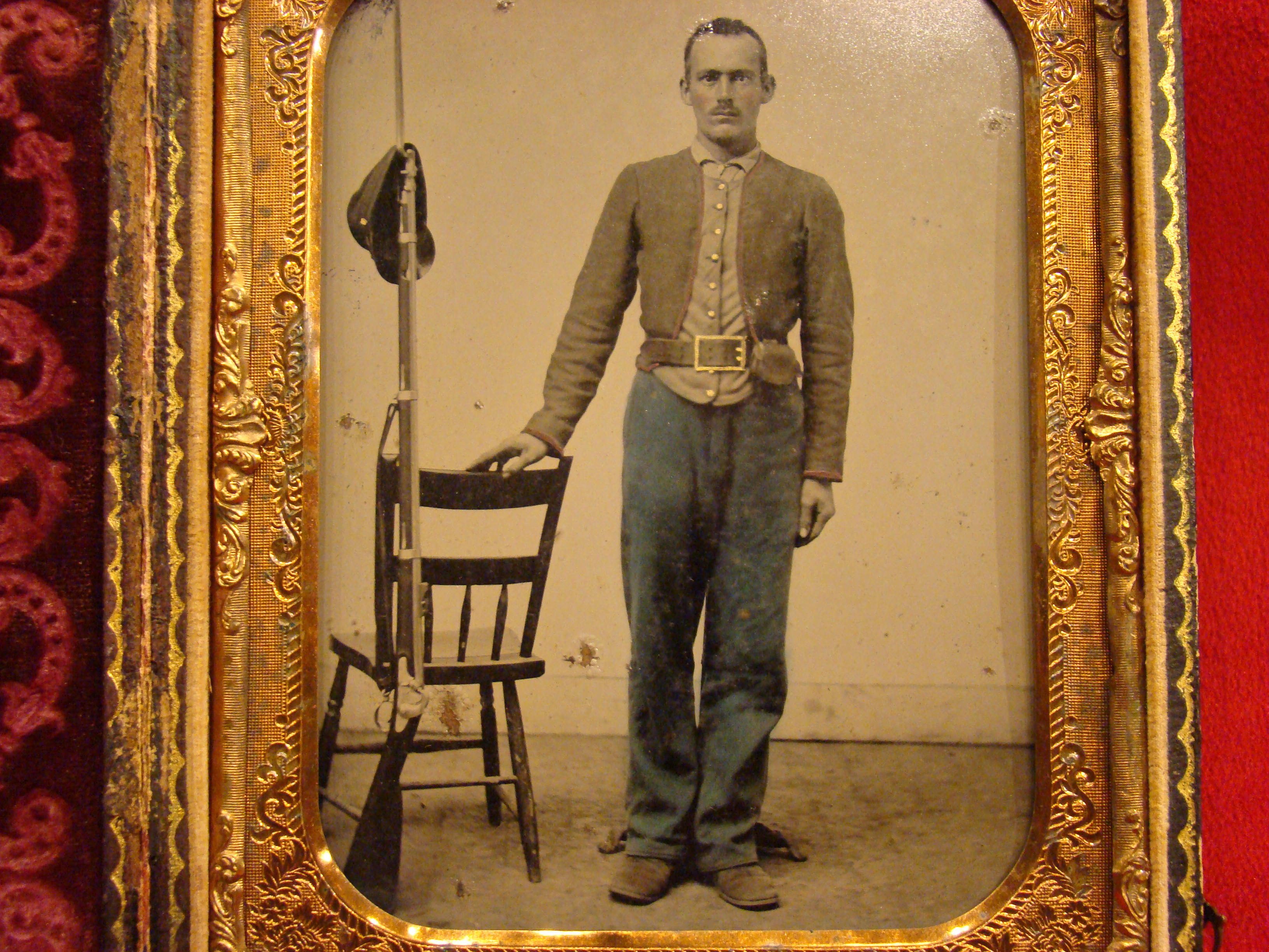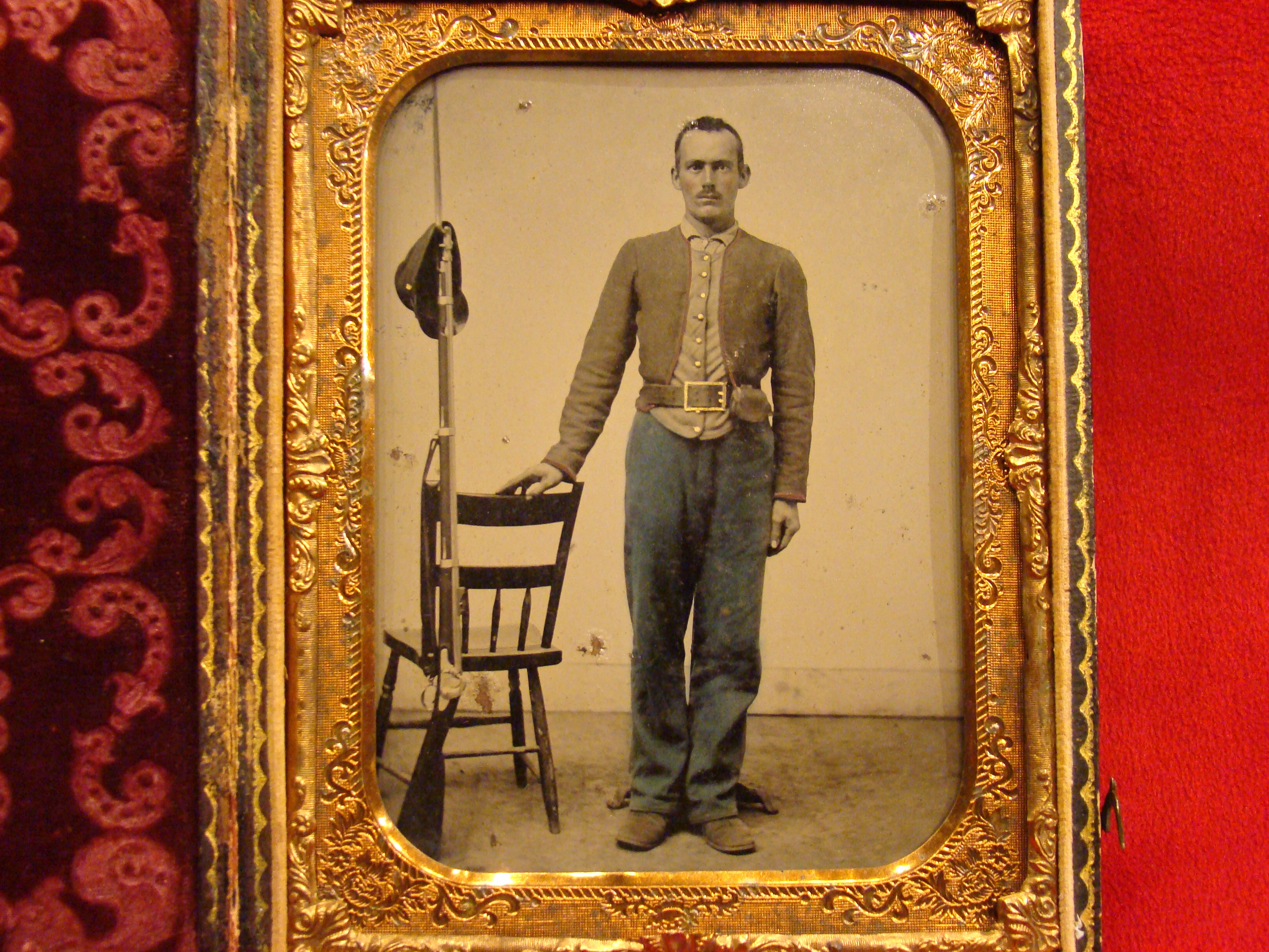 This fine, large photograph was taken very early in the war in St. Louis MO. An unidentified Confederate Volunteer is shown in a full standing pose. It is quite likely that he was a member of Col. John S. Bowen’s 1st Missouri Vol. Infantry Regt. There is a “MANSFIELD’S City Gallery, 4th St., Opposite Entrance Planter’s House. St. Louis.” label on the reverse. This studio did very good work. Note blue color tinting of the soldier’s trousers and the red piping on his gray shell jacket. The gold painting on the buttons and the CS “Wishbone” belt buckle is pinpoint precise. There is a M-1855 Springfield or Harper’s Ferry Rifle Musket standing against a studio chair with bayonet fixed. The image is so clear that you can see the eagle on the lock. The soldier’s forage cap rests upon the ramrod tip. There are a few very tiny blemishes on the surface, but they do not obscure the photo. Housed in a nice leatherette case. Half Plate Confederate Images are very scarce indeed.